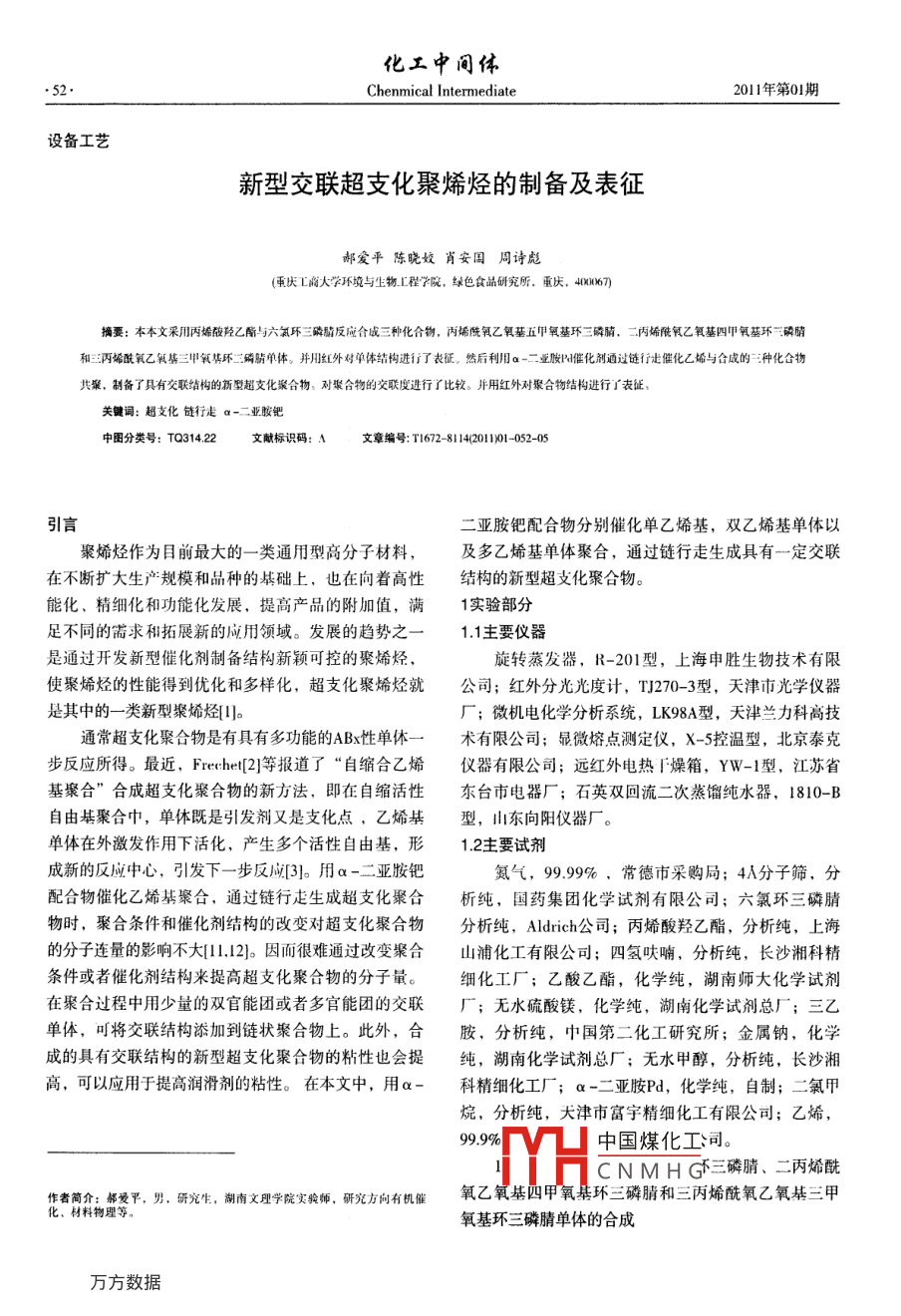化工中間體Chenmical Intermediate201 1年第01期設(shè)備工藝新型交聯(lián)超支化聚烯烴的制備及表征郝愛平陳曉姣肖安國(guó)周詩彪(重慶L商大學(xué)環(huán)境與生物工程”學(xué)院,綠色食品研究所,重慶,40)摘要:本本文采用丙婚酸羥乙嘴與六氯環(huán)三磷腦反應(yīng)合成三種化合物,丙烯院氯乙氧基五甲氧基環(huán)三磷腩,二丙烯陸氧乙氧基四甲氧基環(huán)=磷賾和三丙烯酰氧乙氧棟三甲氧些環(huán)二磷肺單體。并用紅外對(duì)單體結(jié)構(gòu)進(jìn)行了表征。然后利用a -二亞胺PI催化劑通過鏈行建催化乙烯與合成的:種化合物共案。制備了具有交聯(lián)結(jié)構(gòu)的新型超支化聚合物。對(duì)聚合物的交聯(lián)度進(jìn)行Y比較。并用紅外對(duì)聚合物結(jié)構(gòu)進(jìn)行了表征,關(guān)鍵詞:超支化鏈行走a-二亞胺鈀中圖分類號(hào): TQ314.22文獻(xiàn)標(biāo)識(shí)碼: A文章編號(hào): T1672.8141211)1-052-05引言二亞胺鈀配合物分別催化單乙烯基,雙乙烯基單體以聚烯烴作為目前最大的一-類通用型高分子材料,及多乙烯基單體聚合,通過鏈行走生成具有一定交聯(lián)在不斷擴(kuò)大生產(chǎn)規(guī)模和品種的基礎(chǔ)上,也在向著高性結(jié)構(gòu)的新型超支化聚合物。能化、精細(xì)化和功能化發(fā)展,提高產(chǎn)品的附加值,滿1實(shí)驗(yàn)部分足不同的需求和拓展新的應(yīng)用領(lǐng)城。發(fā)展的趨勢(shì)之一1.1主要儀器是通過開發(fā)新型催化劑制備結(jié)構(gòu)新穎可控的聚烯烴,旋轉(zhuǎn)蒸發(fā)器,R-201型,上海申勝生物技術(shù)有限使聚烯烴的性能得到優(yōu)化和多樣化,超支化聚烯烴就公司; 紅外分光光度計(jì), TJ270-3型,天津市光學(xué)儀器是其中的一類新型聚烯烴[1]。廠;微機(jī)電化學(xué)分析系統(tǒng), LK98A型, 天津蘭力科高技通常超支化聚合物是有具有多功能的ABx性單體一術(shù)有限公司; 顯微熔點(diǎn)測(cè)定儀,x -5控溫型,北京泰克步反應(yīng)所得。最近,F(xiàn)rechet[2]等報(bào)道了 “ 自縮合乙烯儀器有限公司;遠(yuǎn)紅外電熱F燥箱,YW-1型,江蘇省基聚合”合成超支化聚合物的新方法,即在自縮活性東臺(tái)市電器廠;石英雙回流二次蒸餾純水器,1810-B自由基聚合中,單體既是引發(fā)劑又是支化點(diǎn),乙烯基劃,山東向陽儀器廠。單體在外激發(fā)作用下活化,產(chǎn)生多個(gè)活性自由基,形1.2主要試劑成新的反應(yīng)中心,引發(fā)下一步反應(yīng)[3]。用a-二亞胺鈀氮?dú)? 99.99% .常德市采購局; 4人分子篩,分.配合物催化乙烯基聚合,通過鏈行走生成超支化聚合析純,國(guó)藥集團(tuán)化學(xué)試劑有限公司;六氯環(huán)三磷腈物時(shí),聚合條件和催化劑結(jié)構(gòu)的改變對(duì)超支化聚合物分析純,Aldrich公司; 丙烯酸羥乙酯,分析純,上海的分子連量的影響不大[11.12]。因而很難通過改變聚合山浦化工有限公司;四氫呋喃,分析純,長(zhǎng)沙湘科精條件或者催化劑結(jié)構(gòu)來提高超支化聚合物的分子量。細(xì)化工廠;乙酸乙酯,化學(xué)純,湖南師大化學(xué)試劑在聚合過程中用少量的雙官能團(tuán)或者多官能團(tuán)的交聯(lián)廠; 無水硫酸鎂,化學(xué)純,湖南化學(xué)試劑總廠;三乙單體,可將交聯(lián)結(jié)構(gòu)添加到鏈狀聚合物上。此外,合胺, 分析純,中國(guó)第二化工研究所;金屬鈉,化學(xué)成的具有交聯(lián)結(jié)構(gòu)的新型超支化聚合物的粘性也會(huì)提純,湖南化學(xué)試劑總廠;無水甲醇,分析純,長(zhǎng)沙湘高,可以應(yīng)用于提高潤(rùn)滑劑的粘性。在本文中,用a-科精細(xì)化工廠; a-二亞胺Pd, 化學(xué)純,自制;二氣甲烷,分析純,天津市富宇精細(xì)化工有限公司;乙烯,99.9%中國(guó)煤化工司。MHCNMHGF三磷腈、二丙烯酰作者簡(jiǎn)介:郁最甲。貝研究生.湖南文理學(xué)院實(shí)驗(yàn)師,研究方向有機(jī)催氧乙氧基四甲氧基環(huán)三磷腈和三丙烯酰氧乙氧基三甲化、材料物理等。氧基環(huán)三磷腈單體的合成第0I期碳納米管表面結(jié)構(gòu)的分析方法概述.53.1.4.2單體與乙烯聚合將100ml二I1瓶上接上乙烯氣體入11和抽真空人口并放入攪拌子。首先將干燥的三口燒瓶真空烘烤,冷卻后通人乙烯氣體,再抽真空,重復(fù)抽真空和通氣Cl PCH.CH -ori=cH,.CHO、ochch-ocHecn,操作三次。然后注射加人20ml的二氯甲烷溶液并開啟CH,0m攪拌。常壓下,當(dāng)乙烯氣體在為氯甲烷溶液中達(dá)到溶~UCH,解飽和后,再加入20mg的催化劑a-二亞胺Pd,攪拌圖1丙烯酰氧乙氧基五甲氧基環(huán)三磷腈的合成路線5min,最后按分別加入上面合成的三種單體,并開始計(jì)時(shí)室溫下攪拌24小時(shí)。反應(yīng)完畢后,停止通乙烯氣BN體,加入酸化乙醇終止反應(yīng)。利用a二亞胺Pd催化劑通過鏈行走催化乙烯與丙烯酰氧乙氧基五甲氧基環(huán)三磷腈聚合,生成了超支化0HO.r ocrH,c-ayei=o1,的乙烯接丙烯酰氧乙氧基五甲氧基環(huán)三磷腈聚合物。CHO,OCH,由于丙烯酰氧乙氧基五甲氧基環(huán)三磷腈是單乙烯基單1xco .cn.n"VHH= = cH,體,在聚合過程中并不會(huì)發(fā)生交聯(lián),粘性與超支化聚圖2二丙烯酰氧乙氧基四甲氧基環(huán)三磷腈的合成乙烯相差不大。其合成路線如下:以。尸ch,.a pCH.CH,"OpCIPCH,cI,0CH,,CH,CH,OH_ B+] CIn==CH.H.cOOCH,, /0CH.CH-0Y1I=CH,(CHBO 、0CH,CH,-0yc1i=CH,Chaln walking copoly merizalin Hypebranched polyethylenecop oly merocH,cH,V"