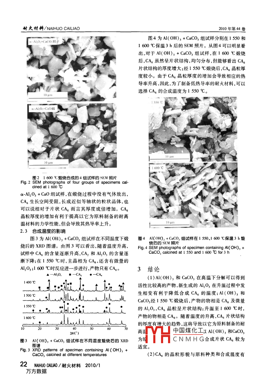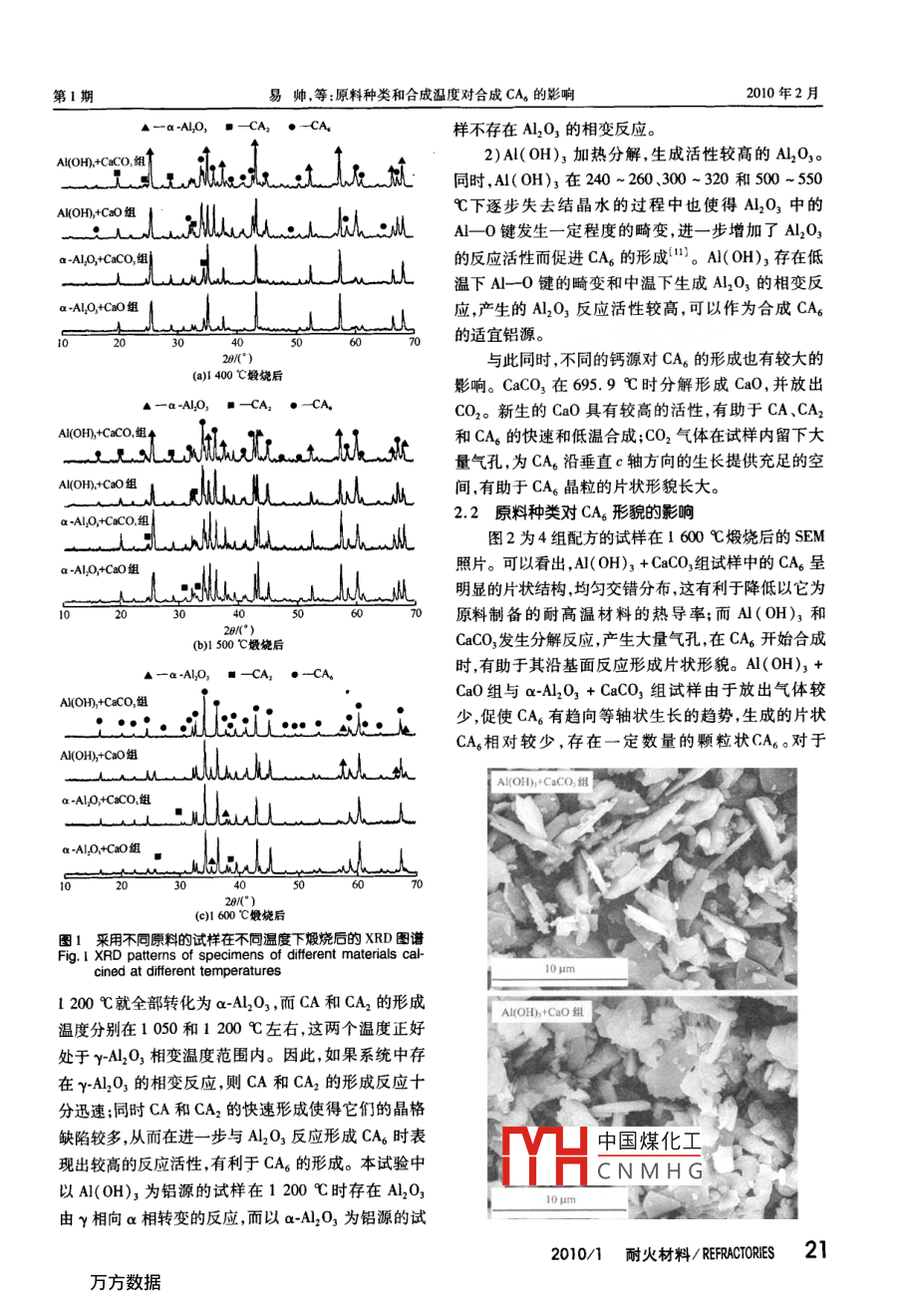 卅火材料2010年2月20 ~23第44卷第1期原料種類和合成溫度對(duì)合成CA。的影響易帥王.凡童玲欣沈潔胡建輝房明浩劉艷改黃朝暉中國(guó)地質(zhì)大學(xué)(北京)材料科學(xué)與工程學(xué)院北 京10083摘要分別采用工業(yè)AI(OH),和工業(yè)a-Al20,作為鋁源,CaO和輕質(zhì)CaCO3作為鈣源,按照理論配比通過(guò)高溫固相反應(yīng)合成了六鋁酸鈣。借助XRD和SEM等測(cè)試手段研究了不同鈣源、不同鋁源以及不同煅燒溫度對(duì)合成六鋁酸鈣的物相組成及顯微形貌的影響。結(jié)果表明:以Al(OH)3和CaCO,為原料,在I 550 C保溫3h合成的六鋁酸鈣晶粒發(fā)育呈片狀;以a-Al20,和CaO為原料在1 550 C保溫3h合成的六鋁酸鈣晶粒發(fā)育呈顆粒狀;Al(OH)3和CaCO,在高溫下的分解有利于片狀六鋁酸鈣的生長(zhǎng)發(fā)育。關(guān)鍵詞六鋁酸鈣,片狀,顆粒狀,合成六鋁酸鈣(其化學(xué)式為CaAl2O,或CaO●6Al2O3,+ CaO。按六鋁酸鈣( CAg)的化學(xué)計(jì)量比配料,以無(wú)簡(jiǎn)寫為CA6)是具有較強(qiáng)抗水化能力的鋁鈣系耐高溫水乙醇為球磨介質(zhì),在行星式球磨機(jī)中濕混3 h,經(jīng)干化合物,熔點(diǎn)為1875 C,是目前倍受關(guān)注的一種耐燥后,分別在1400、1 500、1 600 C下煅燒3 h。利用火材料。CA。屬六方晶系,垂直于c軸方向的02-的RegakuD/Max-RC型X射線衍射儀分析燒后試樣的擴(kuò)散速度比平行于c軸方向的擴(kuò)散速度快,具有優(yōu)先物相組成,采用JMS -6460 LV型掃描電子顯微鏡研究形成片狀或板狀晶體的特性。在剛玉-尖晶石、鋁酸燒后試樣的顯微形貌。鈣水泥結(jié)合剛玉、鋁鎂澆注料等Al203-Mg0-CaO系耐火材料中, CA。通常是高溫條件下的反應(yīng)產(chǎn)物,其2結(jié)果與分析片狀晶穿插于剛玉相或尖晶石相之間,能夠改善耐火2.1原料種類對(duì) CA6物相的影響材料的力學(xué)性能;同時(shí),在高溫還原性氣氛下有很好4組試樣分別在1 400、1 500和1 600 C下保溫的穩(wěn)定性,具有較好的抗堿和抗渣侵蝕能力-4。目3h煅燒后的XRD圖譜如圖1所示。前,對(duì)六鋁酸鈣的研究主要集中在原料粒度[5-61、合由圖1(a)可以看出:在1 400 C時(shí),4組試樣煅成方法(7-8)和制備工藝[9]對(duì)六鋁酸鈣結(jié)構(gòu)和性能的燒后的生成物相主要有CA2 和a-Al20,,其中,以影響等方面,在原料種類及形貌調(diào)控等方面的研究Al( 0H);為鋁源的2組配方中都有CA6的衍射峰出較少?,F(xiàn),而以a-AL2O,為鋁源的2組配方中都沒(méi)有出現(xiàn)在本工作中,采用不同鋁源和不同鈣源在不同溫CA6的衍射峰。隨著溫度的升高,試樣中CA6的含量度下合成六鋁酸鈣,其中,鋁源為工業(yè)a-Al2O3 和顯著增加;1 600 C煅燒時(shí),以Al( 0H)3為鋁源的2Al(0H),,鈣源為CaO和CaCO,,研究不同原料及煅組配方主晶相為CA6, 還有少量的a-Al2O3, 以燒溫度對(duì)合成六鋁酸鈣的物相及顯微形貌的影響,為a-Al2O,為鋁源的2組配方中除a-A1203外,還有少量研制具有片狀六鋁酸鈣形貌的低熱導(dǎo)率、耐高溫隔熱的CA2.見圖1(c)。分析原因主要有以下兩方面:材料和具有顆粒狀六鋁酸鈣形貌的高強(qiáng)度耐火材料1 )根據(jù)海德華定律,當(dāng)反應(yīng)物之一存在多晶轉(zhuǎn)變提供重要的理論依據(jù)。時(shí),則多晶轉(zhuǎn)變溫度也是反應(yīng)開始變得顯著的溫度,即反應(yīng)物之一存在相變反應(yīng)時(shí),將對(duì)系統(tǒng)的反應(yīng)1試驗(yàn)動(dòng)力學(xué)產(chǎn)生顯著影響。眾所周知, r-Al203加熱至選用工業(yè)Al( 0H)..工業(yè)a-Al203. CaO和輕質(zhì)中國(guó)煤化工_CaCO,為原料,組合得到4組合成六鋁酸鈣的配料方fHCNMHG資助。案:第1組為Al( 0H); + CaCO3;第2組為Al( 0H);E-mail :huang1 18@ cugb. edu. cn+ CaO;第3組為a-Al203 + CaCO3;第4組為a-Al2O3收稿日期:2009-08-07編輯:周麗紅20 NAIHUO CALAO /耐火材料2010/1第1期易帥,等:原料種類和合成溫度對(duì)合成CA。的影響2010年2月▲-a-AlO,■-CA, ●-CA.樣不存在Al203的相變反應(yīng)。2)Al( 0H),加熱分解,生成活性較高的Al203。AIOH,+CaC.M↑同時(shí),Al(OH)3在240~260、300~320和500~550C下逐步失去結(jié)晶水的過(guò)程中也使得Al2O3中的Al(OH),+CaO組Al- 0鍵發(fā)生一定程度的畸變,進(jìn)一步增加了 Al203a-A,QO+CaCO,組的反應(yīng)活性而促進(jìn)CA。的形成"。Al(OH); 存在低溫下Al-O鍵的畸變和中溫下生成Al203 的相變反a-Al,O,+CaO組應(yīng),產(chǎn)生的Al2O3反應(yīng)活性較高,可以作為合成CA6i02030405060 70的適宜鋁源。20/(° )與此同時(shí),不同的鈣源對(duì)CA6的形成也有較大的(a)1 400 C煅燒后影響。CaCO3在695.9C時(shí)分解形成CaO,并放出■-CA,●-CA.CO2。新生的CaO具有較高的活性,有助于CA、CA2AI(OH),+CaCO.組4和CA6的快速和低溫合成;CO2氣體在試樣內(nèi)留下大量氣孔,為CA。沿垂直c軸方向的生長(zhǎng)提供充足的空間,有助于CA。晶粒的片狀形貌長(zhǎng)大。2.2原料種類對(duì) CA6形貌的影響a-Al.O,+CaCO.組I圖2為4組配方的試樣在1 600 C煅燒后的SEM照片??梢钥闯?Al( 0H); + CaCO,組試樣中的CA6呈a-Al!O,+CaO組M明顯的片狀結(jié)構(gòu),均勻交錯(cuò)分布,這有利于降低以它為1020 30原料制備的耐高溫材料的熱導(dǎo)率;而Al(OH);和28/(*)(b)1 s00 C煅燒后CaCO,發(fā)生分解反應(yīng),產(chǎn)生大量氣孔,在CA6開始合成時(shí),有助于其沿基面反應(yīng)形成片狀形貌。Al(OH),+▲-a-AlO,■-CA, ●-CA。Ca0組與ax-Al2O,+CaCO,組試樣由于放出氣體較A(0OH)+CaCO,組: .... l:i.... s.. i少,促使CA。有趨向等軸狀生長(zhǎng)的