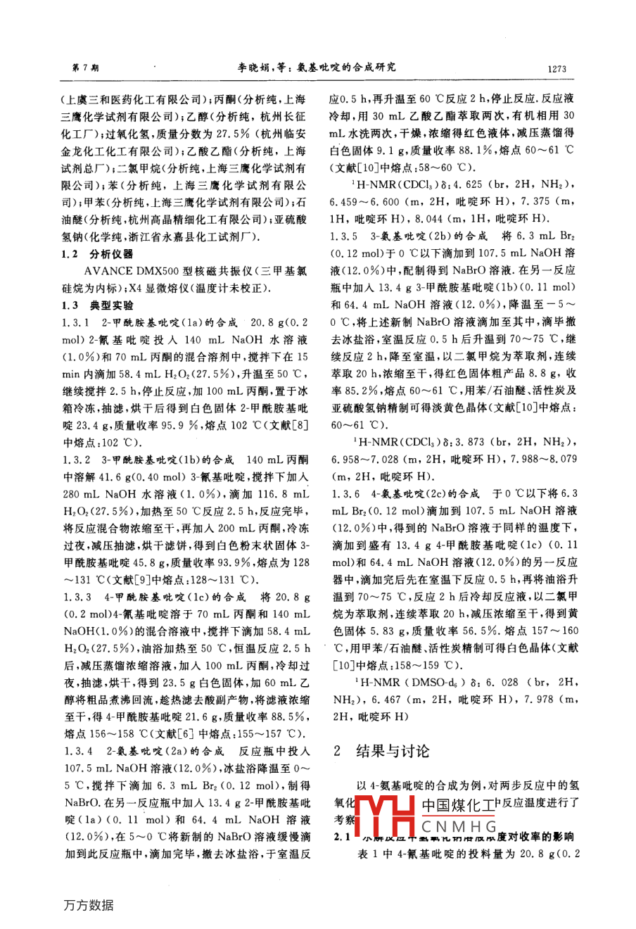 折江大學(xué)學(xué)報(bào)(工學(xué)版)第40卷第7期ul2006 '2006年7月Journal of Zhejiang University( Engineering Science)Ju. 2006氨基吡啶的合成研究李曉娟,戴立言,陳英奇(浙江大學(xué)材料與化學(xué)工程學(xué)院,浙江杭州310027)摘要:研究了重要的有機(jī)中間體氨基吡啶的合成工藝.分別以2- .3- 、4氰基吡啶為起始原料,以水和丙酮為混合溶劑,在稀賊(NaOH)溶液中,以過(guò)氧化氫為催化劑,水解得到相應(yīng)的甲酰胺基吡啶,然后用新制備的次溴酸鈉進(jìn)行霍夫曼降解反應(yīng),制得相應(yīng)的2-3-.4氨基吡啶.以4氨基毗啶的合成為例,對(duì)兩步反應(yīng)的反應(yīng)條件進(jìn)行了優(yōu)化,得出適宜的條件為:氰基水解反應(yīng)中,氫氧化鈉溶液最佳質(zhì)量分?jǐn)?shù)為1.0 % ;霍夫曼降解反應(yīng)中,氫氧化鈉溶液最佳質(zhì)量分?jǐn)?shù)為12.5 %.反應(yīng)適宜溫度為75 C.關(guān)鍵詞:氨基吡啶;2_氨基吡啶;3-氨基吡啶;4~氨基吡啶;合成中圖分類號(hào): TQ253.2文獻(xiàn)標(biāo)識(shí)碼: A文章編號(hào): 1008 - 973X(2006)07 - 1272 -04Study on synthesis of aminopyridineLI Xiao-juan, DAI Li-yan, CHEN Ying-qi(College of Materials and Chemical Engineering , Zhejiang University, Hangzhou 310027, China)Abstract: A general synthetic route of aminopyridines which are useful organic intermediates was investiga-ted. The target compounds were synthesized starting from corresponding cyanopyridines, via incompletehydrolysis in the presence of hydrogen peroxide using mixture of acetone water and dilute base as solvent,and Hoffman degradation reaction with freshly made NaBrO. The feasible conditions of the above syntheticprocess were discussed taking the preparation of 4-aminopyridine as example. The optimum concentration ofsodium hydroxide solution in the transformation of cyanopyridine to pyridinecarboxamide was 1.0 %. And theHoffman degradation would be eficiently carried out at 75 C in 12. 5 % sodium hydroxide solution.Key words: aminopyridine; 2-aminopyridine; 3-aminopyridine; 4-aminopyridine; synthesis氨基吡啶類化合物(2- .3-.4-氨基吡啶)是含氨備較繁雜,且僅用于4-氨基吡啶的制備.本文以方的具有雜環(huán)結(jié)構(gòu)的物質(zhì)([-2] ,其合成方法主要有:1)法4)為3種氨基吡啶制備的通用路線,并參考文獻(xiàn)吡啶與氨基鈉進(jìn)行氨化反應(yīng)[3] ,此反應(yīng)條件苛刻,反[1,7]對(duì)氰基水解步驟作出改進(jìn),以水和與水互溶的應(yīng)試劑難得,且副產(chǎn)物較多,收率不高;2)由鹵代吡有機(jī)介質(zhì)為混合溶劑,在堿性條件下加人過(guò)氧化氫啶在鈀炭[1]或銅鹽[2]等催化劑的作用下進(jìn)行氨解反催化氰基水解.整個(gè)合成路線操作簡(jiǎn)便,反應(yīng)條件溫應(yīng),此類方法或是催化劑成本高,或是鹵代吡啶不易和收率高.合成步驟如圖1所示..獲得,且設(shè)備要求嚴(yán)格,實(shí)際操作困難,不適于工業(yè)應(yīng)用;3)吡啶經(jīng)雙氧水氧化、發(fā)煙硝酸硝化成硝基氧1實(shí)驗(yàn)部分化吡啶,再進(jìn)行還原反應(yīng)得到氨基吡啶[56]此制備過(guò)程周期長(zhǎng)、污染重、成本高;4)以氰基吡啶為原料經(jīng)1.1 化學(xué)試劑過(guò)催化水解、霍夫曼降解得到氨基吡啶[6],此法原料氰基吡啶(上虞三和醫(yī)藥化工有限公司);氫氧廉價(jià)易得,收率較高,但原文獻(xiàn)中金屬鹽催化劑的制中國(guó)煤化工驗(yàn)化工廠);液溴收稿日期: 2005 -06 - 25.浙江大學(xué)學(xué)報(bào)(工學(xué)版)網(wǎng)址: www. joqYHCNMHG作者簡(jiǎn)介:李曉娟(1981-).女.浙江嘉興人,碩士生.主要從事藥物中間體有機(jī)合成的研究.通訊聯(lián)系人:戴立盲,男,副教授. E-maildailiyan@cnsce. zju. edu. cn第7期李曉娟,等:氨基吡啶的合成研究1273(上虞三和醫(yī)藥化工有限公司);丙酮(分析純,上海應(yīng)0.5 h,再升溫至60 C反應(yīng)2 h,停止反應(yīng).反應(yīng)液.三鷹化學(xué)試劑有限公司);乙醇(分析純,杭州長(zhǎng)征冷卻,用30 mL乙酸乙酯萃取兩次,有機(jī)相用30化工廠);過(guò)氧化氫,質(zhì)量分?jǐn)?shù)為27. 5% (杭州臨安.mL水洗兩次,干燥,濃縮得紅色液體,減壓蒸餾得金龍化工化工有限公司);乙酸乙酯(分析純,上海白色固體9.1 g,質(zhì)量收率88. 1%,熔點(diǎn)60~61 C試劑總廠);二氯甲烷(分析純,上海三鷹化學(xué)試劑有(文獻(xiàn)[10]中熔點(diǎn):58~60 C).限公司);苯(分析純,上海三鷹化學(xué)試劑有限公'H-NMR(CDCl)8:4.625 (br, 2H, NH2),司);甲苯(分析純,上海三鷹化學(xué)試劑有限公司);石6. 459~6.600 (m, 2H,吡啶環(huán)H), 7. 375 (m,油醚(分析純,杭州高晶精細(xì)化工有限公司);亞硫酸1H,吡啶環(huán)H),8.044 (m, 1H,吡啶環(huán)H).氫鈉(化學(xué)純,浙江省永嘉縣化工試劑廠).1.3.53~氨基吡啶(2b)的合成 將 6.3 mL Br21.2 分析儀器(0. 12 mol)于0 C以下滴加到107.5 mL NaOH溶AVANCE DMX500型核磁共振儀(三甲基氯液(12.0%)中,配制得到NaBrO溶液.在另一反應(yīng).硅烷為內(nèi)標(biāo));X4顯微熔儀(溫度計(jì)未校正). .瓶中加入13.4 g 3-甲酰胺基吡啶(1b)(0.11 mol)1.3 典型實(shí)驗(yàn)和64.4 mL NaOH溶液(12. 0%),降溫至- 5~1.3.1 2-甲酰胺 基吡啶(1a)的合成‘20.8 g(0. 20 "C,將上述新制NaBrO溶液滴加至其中,滴畢撤mol) 2-氰基吡啶投人140 mL NaOH水溶液去冰鹽浴,室溫反應(yīng)0.5 h后升溫到70~75 C,繼(1.0%)和70 mL丙酮的混合溶劑中,攪拌下在15續(xù)反應(yīng)2 h,降至室溫,以二氯甲烷為萃取劑,連續(xù)min內(nèi)滴加58.4 mL H2O2(27. 5%),升溫至50 C,萃取20 h,濃縮至干,得紅色固體粗產(chǎn)品8.8g,收繼續(xù)