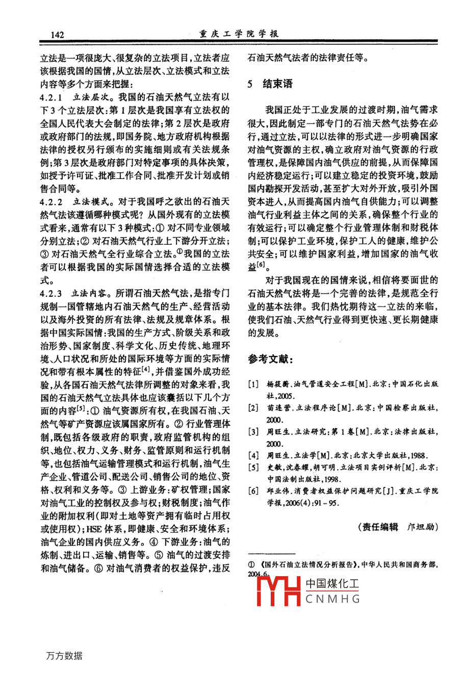 第21卷第2期重慶工學(xué)院學(xué)報2007年2月Vol 21 No. 2Journal of Chongging Institute of TechnologyFeb.2007【法學(xué)天地】試論中國石油天然氣之立法時良敏(四川大學(xué)法學(xué)院,成都61004摘要:由于石油天然氣資源的日益緊張,近期內(nèi)石油天然氣立法成為國家立法活動的重點和熱點。石油天然氣作為對全球的經(jīng)濟政治外交、安全起著巨大影響作用的戰(zhàn)略物資影響著當(dāng)今世界的局勢。目前中國在油氣行業(yè)規(guī)制方面存在許多缺陷,在對進口油氣資源依賴程度日益加深的中國,這無疑會對油氣資源的穩(wěn)定供應(yīng)、戰(zhàn)備儲備和經(jīng)濟安全上造成嚴(yán)重的威脅,而在此基礎(chǔ)之上,制定《石油天然氣法》將具有非常重大的現(xiàn)實意義關(guān)鍵詞:立法;石油;天然氣;法律體系中圖分類號:DF1文獻標(biāo)識碼:A文章編號:1671-0924(2007102-0139-柳除除On the legislation of oil and Natural GasSHI Liang-min(Law School, Sichuan University, Chengdu 610064,ChinaAbstract: The legislation of oil and natural gas are a focus lately in China as oil and gas resources are becoming insufficient. As the most important strategic material, oil and gas are exerting huge influence on theglobal economy, politics, diplomatism and security. There are many flaws in the present regulation condeming oil and natural gas in China. As China depends heavily on imported oil and gas these days, theseflaws will constitute a great threat to a secure supply, strategic storage and economic security of oil and natTherefore, the legislation of "Law of Oil and Natural Gas has great practical significanceKey words: legislation; oil; natural gas; legal system隨著世界石油天然氣行業(yè)的動蕩不安,作為高漲,石油天然氣立法漸行漸近,本文中筆者從我我國較為緊缺的能源,油氣生產(chǎn)與消耗越發(fā)不協(xié)國油氣行業(yè)的現(xiàn)狀、存在的問題、立法的必要性和調(diào)但迄今為止,還未成就油氣專項立法。由于能可行性及其展望幾個方面加以闡述。源消費的快速增長,油氣資源的對外依賴度不斷加大我國油氣工業(yè)的發(fā)展面臨著嚴(yán)峻的挑戰(zhàn)。1我國石油天然氣行業(yè)的現(xiàn)狀及存在的問題對石油天然氣加以立法,加強國家對油氣行業(yè)的監(jiān)管,為油氣工業(yè)的發(fā)展創(chuàng)造良好的環(huán)境正是應(yīng)1.1我國油氣資源短缺。我國一次性能源的基對這種挑戰(zhàn)的戰(zhàn)略性舉措。一直以來,石油天然本特點是“富煤、貧油、少氣”,而且為了生存與發(fā)氣立法只處于“只聽雷聲響不見雨點下”的局面,展,我中國煤化工采地下的各種油最近各界對于要求石油天然氣立法的呼聲越發(fā)氣資CNMHG候,無序開采讓收稿日期:2006-11-08作者簡介:時良敏(1981-),男,江西彭澤人,碩士研究生,主要從事法律研究。重慶工學(xué)院學(xué)報油氣資源雪上加霜而變得更加供不應(yīng)求了,油氣油田物資、破壞生產(chǎn)秩序等各類涉油案件。這些資源短缺問題日益成為中國能源安全的核心問題的出現(xiàn),加上遲遲得不到有效解決,反映了現(xiàn)1.2我國石油天然氣行業(yè)的海外投資措施不完行立法的不足,不能有效維護國家油氣資源所有善。隨著經(jīng)濟全球化、油氣資源需求的不斷增長權(quán)和礦業(yè)權(quán)人的合法權(quán)益。和能源的日益匱乏等幾大因素的推動下,我國三2.2石油天然氣立法是提高綜合利用效率之必大石油公司紛紛在海外開始了油氣資源的境外大要。我國一方面是經(jīng)濟高增長與能源供應(yīng)不足的舉開拓征程。但由于中國海外石油投資起步較矛盾突出,另一方面是能源利用效率的低下,經(jīng)濟晚、缺少經(jīng)驗,而且在資金、技術(shù)、人才管理等方的高增長是以能源的高消耗為代價的。能源利用面與西方跨國石油公司存在很大差距,中國企業(yè)效率的低下反過來又進一步加劇了資源緊缺的矛在海外遭遇過各種困境、挫折,也有過慘痛的經(jīng)驗盾。在我國個別地區(qū)能源的亂開濫采,嚴(yán)重妨礙教訓(xùn)⊙了國家對油氣資源的統(tǒng)一管理、合理規(guī)劃和科學(xué)13我國目前有關(guān)石油天然氣立法不完善。相開采,使寶貴的油氣資源得不到充分開發(fā)和合理比國內(nèi)外其它行業(yè),我國石油天然氣行業(yè)立法明利用造成資源的極大浪費。因此急需通過立法顯滯后。主要存在以下問題:一是資源法規(guī)雖相科學(xué)合理地配置油氣資源并開采,以提高其利用對健全,但市場法規(guī)相對缺乏,有的已與市場經(jīng)濟效率。發(fā)展不相適應(yīng);二是有關(guān)石油天然氣立法的基本2.3石油天然氣立法是強化國家監(jiān)管之必要。原則制度,分散規(guī)定在憲法礦產(chǎn)資源法及其他石油天然氣的勘探和開采,直到利用,為人類帶來條例規(guī)章或政策性文件中,沒有形成完整的法律了巨大的益處,但由于管理不善在油氣生產(chǎn)和運體系。③三是沒有石油天然氣的專門法律,立法上輸過程中都給環(huán)境造成了嚴(yán)重的油氣污染和危的不足,往往需大量的政策性文件彌補,缺乏透明害。保護公眾健康、安全,保護環(huán)境是我國的基本度,穩(wěn)定性也不夠容易形成部門之間職能交叉和國策,有系列的法律法規(guī)對安全生產(chǎn)提出要求進出現(xiàn)“國家利益部門化,部門利益法規(guī)化”的情況。行監(jiān)督,才能以法制為基礎(chǔ),貫徹執(