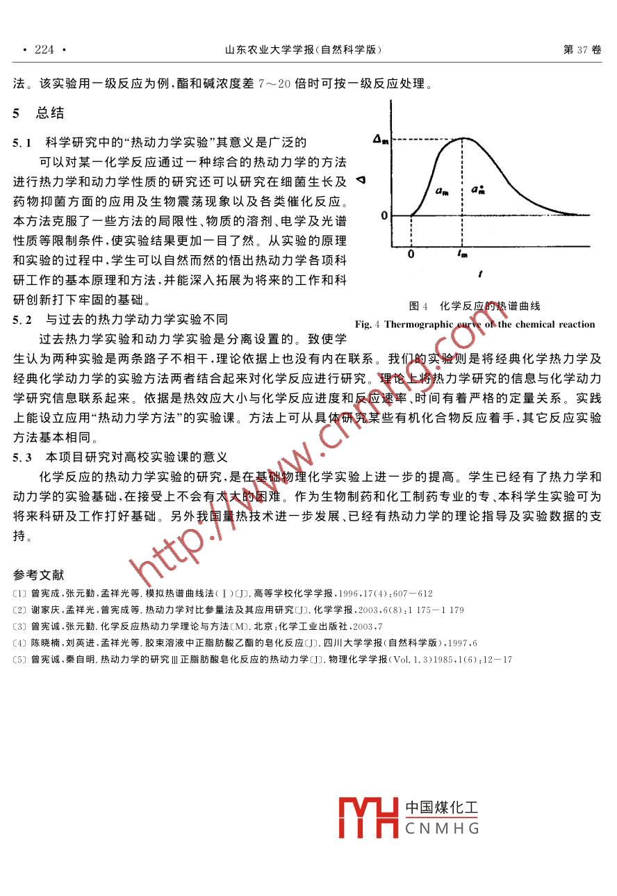 山東農(nóng)業(yè)大學學報(自然科學版),2006,37(2):220~224Journal of Shandong Agricultural University (Natural Science)化學反應(yīng)熱動力學實驗研究康戈莉,于乃臣,吳翠榮,耿殿國,張淑新(淄博職業(yè)學院化學工程系,山東淄博255013)摘要:熱導(dǎo)式自動量熱計是一種新型的量熱儀,它在原理和結(jié)構(gòu)上完全不同于恒溫外套式和絕熱式熱量計。這種量熱法不涉及熱容和熱量的計量,它由自動記錄的峰面積計算反應(yīng)的熱效應(yīng),由熱穩(wěn)態(tài)過程的峰髙或峰面積計算反應(yīng)過程的放熱(吸熱)速率常數(shù)。因此可以在同一個化學反應(yīng)的量熱體系中,通過自動量熱計監(jiān)測和記錄化學反應(yīng)的熱譜曲線。同時得到動力學和熱力學的信息關(guān)鍵詞:熱動力學實驗;熱導(dǎo)式量熱計;熱譜曲中圖分類號:O643文獻標識碼:B文章編號:1000-2324(2006)02-0220—04THE THERMOKINETIC EXPERIMENT STUDY OF CHEMICAL REACTIONKANG Ge-li, YU Nai-chen, WU Cui-rong, GENG Dian-guo, ZHANG Shu-xinDepartment of Chemical Engineering, Zibo Vocational College, Zibo 255013, China)Abstract: The Heat conduction types heat measure is a new type estmate. It deffrent with isotherm andheat insulation type. This Thermokintic methods is recorded Heatscore-curve atmeticly and calculatereactions heat efficiency,, not involves the calculate of heat capacity and quantity of heat. It calculate re-actions heat efficiency by atmetic recorded summit area and calculate reactions heat and The rate constants by summit high or hump's area of heat stabal prossens's. So in the same chemistry system ,reac-tions Heat-score-curve will be recorded by atmetic. heat measure Equipment. we can get Thermo andkinetic information in the same timeKey words: Thermokinetic experiment, Heat conduction type's heat measure. Heatscore-curve, The rateconstants對一個化學反應(yīng),在等溫等壓下,其焓變大小正比于反應(yīng)進度即正比于反應(yīng)速率。因此我們可以在同個化學反應(yīng)的量熱體系中,通過自動量熱計監(jiān)測和記錄化學反應(yīng)的熱譜曲線。同時得到動力學和熱力學的信息—稱為化學反應(yīng)的熱動力學實驗化學反應(yīng)的熱動力學研究已經(jīng)取得了很大進展,在反應(yīng)機理、膠束催化、生物生長過程的新陳代謝規(guī)律、藥物科學等方面得到了廣泛應(yīng)用。目前高校物理化學實驗課設(shè)有熱力學實驗和動力學實驗,為了使物理化學實驗更進一步的與生產(chǎn)和科研貼近、提高化工及制藥專業(yè)大學生基本實驗技能、動手能力和科研能力的目標,化學反應(yīng)熱動力學實驗顯得比以往更有必要實驗原理通過測定化學反應(yīng)過程中放岀的熱量繪出熱譜曲線、解析熱譜曲線的信息來確定反應(yīng)焓的變化及化學反應(yīng)速率和動力學參數(shù)。本實驗用RD-3型熱導(dǎo)式自中國煤化工應(yīng)的熱效應(yīng)和反應(yīng)的速率。這類熱導(dǎo)式自動量熱計在原理和結(jié)構(gòu)上完全不同于CNMH(量計。這種量熱法不涉及熱容和熱量的計量,它由自動記錄峰面積計算反應(yīng)的熱效.出熱穩(wěn)心過程的眸咼計算反應(yīng)過程的放熱收稿日期:2005-05-25基金項目:2004年山東省教育廳高等學校實驗技術(shù)研究立項資助項目(339號)作者要兩(195),,教授,主要從事理化學教學,實驗以及化學反應(yīng)熱動力學方面的研究工作第2期康戈莉等:化學反應(yīng)熱動力學實驗研究221(吸熱)速率常數(shù)設(shè)在量熱計中有一個熱效應(yīng)發(fā)生,其熱功率W=dQdt,W的一部分以熱流量o的形式通過導(dǎo)熱片流向恒溫導(dǎo)管(熱阱),熱流量θ與量熱單元內(nèi)外溫差θ-θ。成正比,P為量熱單元的熱導(dǎo)系數(shù),0=P(01-0。)=P0W的一部分是量熱容器及其反應(yīng)物的溫度升高為dθ1,因為θ保持恒定,所以d1=de。設(shè)量熱容器及其中物質(zhì)的有效熱容為Ⅰ,則:w=dQ/dt= P0+ude/dt(2)因為記錄儀曲線上的峰高△和溫度差e成正比,故式中g(shù)為與系統(tǒng)靈敏度、熱電堆的性質(zhì)和熱電信號轉(zhuǎn)換為與輸岀記錄等系統(tǒng)有關(guān)旳常數(shù).因此Pd△在時間t1至t2的范圍內(nèi)積分,得:Q=-A+(△2-△1)(5)始終A為時間t1至t2內(nèi)記錄曲線下的峰面積,△1和△2分別為記錄曲線在t、t2時的高度。4式和5式稱為Tian’s方程當量熱計內(nèi)有一個熱效應(yīng)發(fā)生時,記錄筆從基線出發(fā)到開始出峰,過一個最高點后回到基線,在這種情況下,△1=△2=0由式5得Q/A=P/g=K式中K稱為熱量計的熱量常數(shù),它的大小由量熱元件的熱導(dǎo)系數(shù)和常數(shù)g決定,通過準確的電能標定,求得儀器熱量常數(shù)K后,即可由相應(yīng)的峰面積A按下式Q=KA(7)計算任意過程的未知熱效應(yīng)Q。由此可見,熱導(dǎo)式自動量熱計進行量熱工作時,由記錄曲線下的峰面積表示熱量,在這種表示法中熱量計的熱量常數(shù)K是單位的熱量,它等于單位面積(lmm)所表示的熱量,這就是熱導(dǎo)式自動熱量計測定熱量的基本原理設(shè)另一工作情況下,量熱器內(nèi)有一個熱源以恒定的功率W放岀熱量,到一定時間后,量熱單元內(nèi)外的溫度保持恒定,此時△不再隨時間改變,d△/dt=0這種情況下由(4)可得W/△°=P/g=K(8)式中△°為記錄曲線在穩(wěn)定態(tài)的峰高因此,由恒定的熱功率W和相應(yīng)的穩(wěn)定態(tài)的峰高之比,也可以求得熱量計的熱量常數(shù)K。求得k以后.可根據(jù)相應(yīng)的記錄曲線在穩(wěn)定態(tài)的峰高△。按下式