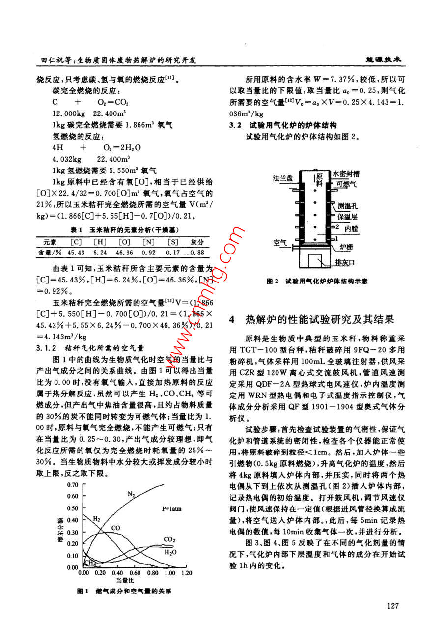 緣色科技2010年5月第5期Joumal of Green Science and Technology生物質(zhì)固體廢物熱解爐的研究開發(fā)田仁祝,薛勇,秦楊,陳科仲(西南科技大學(xué)固體廢物處理與資源化省部共建教育部重點實驗室,四川綿陽621010)摘要:生物質(zhì)能的開發(fā)和利用可緩解當(dāng)今常規(guī)能源短缺和環(huán)境污染所帶來的壓力,熱解氣化技術(shù)可以大大提高生物質(zhì)能的利用效率。在目前,一般生產(chǎn)可燃氣的民用型生物質(zhì)熱解爐主要存在下述問題:產(chǎn)氣率低、熱值低、焦油含量高、可靠性低、運行參數(shù)待優(yōu)化、燃氣安全性低、環(huán)境污染等。為克服這些問題,通過熱解爐模型試驗研究,優(yōu)化現(xiàn)有生物質(zhì)熱解裝置工藝的結(jié)構(gòu)及非結(jié)構(gòu)參數(shù),以提高其熱解產(chǎn)品的產(chǎn)量和質(zhì)量,降低生產(chǎn)成本。關(guān)鍵詞:生物質(zhì);熱解爐;產(chǎn)氣率;熱值中圈分類號:7Q545文獻標(biāo)識碼:A文章編號:1005-569X(2010)05-0126-031引言能源與環(huán)境是當(dāng)今社會發(fā)展的兩大主題。經(jīng)濟2熱解爐的工作原理社會的發(fā)展以能源為重要動力,在可持續(xù)發(fā)展觀點熱解爐內(nèi)燃料層自上而下可以分為3層:干燥不斷深人人心的時代背景下,可再生能源逐步受到層、熱解層和氣化層(包括氧化層和還原層),運行穩(wěn)人們的高度關(guān)注,而生物質(zhì)能作為可再生能源家族定時,一定粒度的生物質(zhì)原料進人氣化裝置后首先中的一員,因其存儲量大、可再生.利用方式多元化在干燥層被干燥,隨著料層的下落,伴隨溫度的升等可持續(xù)發(fā)展特性在當(dāng)今社會能源領(lǐng)域占據(jù)了重要高,析出揮發(fā)分,并在高溫下裂解(熱解) 6.]。裂解的地位中。從20世紀80年代初開始,經(jīng)過近20后的氣體和炭在氧化層與供人的氣化介質(zhì)(空氣)發(fā)年的努力,我國生物質(zhì)氣化技術(shù)已逐步發(fā)展起來。生氧化反應(yīng)并燃燒,燃燒放出的熱量用于維持干燥、我國自行研制的集中供氣和戶用氣化爐產(chǎn)品已進入熱解和還原反應(yīng)。氧化后的氣體含有一些不可燃氣實用化試驗及示范階段,形成了多個系列的爐型,體,如:CO2、H2O等,經(jīng)還原反應(yīng)減少其含量。最可滿足多種物料的氣化要求,在生產(chǎn)、生活用能、發(fā)終生成了含有一定量的CO.H2、CH,及部分不飽和電、干燥、供暖等領(lǐng)域得到利用。但與國外先進水平烴C.H。的混合氣體,凈化后即可燃用8。干燥的相比,仍有較大差距[2]。目前,我國生物質(zhì)熱解氣化燃料在熱解過程中產(chǎn)生CO.CO2、H2,焦油蒸氣及技術(shù)存在的主要問題有:①燃氣熱值偏低。- -般約少量的CH, .C_H。等氣體以及固體焦[0]。隨后,固為4500~5000kJ/m2 ;②焦油含量偏高。一般均超體焦發(fā)生如下的氧化,還原反應(yīng)([0]。過國家有關(guān)標(biāo)準(zhǔn)的數(shù)倍之多,影響居民正常使用;③氧化階段:C+O2 = CO2 + 408.84kJ燃氣中含氧量較高,安全隱患大。有的熱解氣含氧2C+O2 = 2C0+246.44kJ量高達近3. 5~4.0%,非常接近發(fā)生爐煤氣的爆炸還原階段:C+CO2 =2CO- 162. 41kJH2O+C=C0+ H2-118.82kJ下限;④污水排放引起環(huán)境污染。目前的熱解氣凈化多采用水洗,這不僅會溶解可燃氣造成浪費,吸附2H2O+C=CO2 +2H2-75.24kJ的焦油還會造成水體污染;⑤缺乏對氣化、凈化設(shè)備H2O+CO= CO2 + H2- 43.58kJ技術(shù)性能參數(shù)的系統(tǒng)測試等(~5]。3.上吸式生物質(zhì)固體廢物熱解爐的設(shè)計總之,我國的生物質(zhì)氣化技術(shù)水平仍處于初級階段,其氣化產(chǎn)品的產(chǎn)量和質(zhì)量、氣化設(shè)備的性能和3.1熱解氣化爐氣化劑需要f 的計算可靠性、運行參數(shù)的合理確定、燃氣的安全使用、環(huán)3.1.1秸稈完全燃燒所需的空 氣量境污染問題等,均是影響該技術(shù)推廣使用的問題,亟秸稈含有碳、氫、氧、氮、硫等元素,由于氮和硫待進行研究解決。的含量非常低,所以,研究中不考慮氮.硫與氧的燃收稿日期:2010-05-04作者簡介:田仁祝(1986-).女,主要從事環(huán)境工程專業(yè)研究。126田仁祝等:生物質(zhì)固體廢物熱解爐的研究開發(fā)能源技術(shù)饒反應(yīng),只考慮碳、氫與氧的燃燒反應(yīng)[1]。所用原料的含水率W=7. 37%,較低,所以可碳完全燃燒的反應(yīng):以取當(dāng)量比的下限值,取當(dāng)量比ao=0.25,則氣化.C+Oz = COr所需要的空氣量[12]V。=aoXV=0.25X4.143=1.12. 000kg 22. 400m036m*/kg1kg碳完全燃燒需要1. 866m2氧氣3.2試驗用氣化爐 的爐體結(jié)構(gòu)氫燃燒的反應(yīng):試驗用氣化爐的爐體結(jié)構(gòu)如圖2.4HO2=2H2O4. 032kg 22. 400m21kg氫燃燒需要5. 550m2氧氣法蘭盤”愿門本密封槽1kg原料中已經(jīng)含有氧[O],相當(dāng)于已經(jīng)供給[O]X 22. 4/32=0.700[0]m'氧氣,氧氣占空氣的21% ,所以玉米秸稈完全燃燒所需的空氣量V(m2/民測溫孔kg) =(1.866[C]+5. 55[H]-0.7[0])/0. 21.”保溫層表1玉米秸稈的元素分析(干燥基)2內(nèi)膛元素[C] [H] [O] [N] [S] 灰分空氣, 爐柵含量/% 45.43 6.24 46.36 0.92 0.17 ..0.88排灰口由表1可知,玉米秸稈所含主要元素的含量為[C]= 45.43% ,[H]= 6.24% ,[0]= 46.36%,[N]園2試驗用氣化爐爐體結(jié)構(gòu)示意=0.92%。玉米秸稈完全燃燒所需的空氣量[12]V=(1. 866[C]+ 5.550[H]-0.700[0])/0. 21=(1.866X4熱解爐的性能試驗研究及其結(jié)果45. 43%+5.55X6.24%-0.700X 46. 36%)/0. 21=4.143m'/kg原料是生物質(zhì)中典型的玉