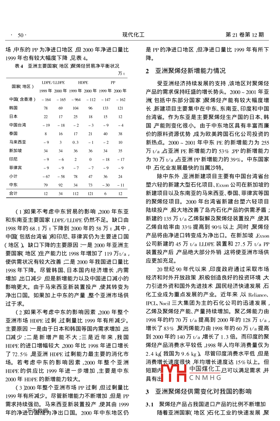 Dee.2001現(xiàn)代化工第21卷第12期48.Moderm Chemical Industry2001年12月市場研究亞洲聚烯烴供需形勢及對我國的影響宋磊(中國石油化工股份有限公司化工事業(yè)部北京100013)摘要闡述了近年來亞洲聚烯烴(包括聚乙烯和聚丙烯市場供需、貿(mào)易平衡、新增能力變化情況及未來發(fā)展趨勢分析了亞洲聚烯烴供需形勢對我國市場的影響。指出我國是世界上最大的聚烯烴進口國未來幾年東南亞和中東各國(地區(qū)聚烯烴產(chǎn)品占我國進口產(chǎn)品的比例將不斷增加而日本和韓國的市場份額逐年下降我國是世界聚烯烴產(chǎn)能增長最快的國家同時需求仍保持旺盛的增長勢頭未來市場競爭將更加激烈。關(guān)鍵詞聚烯烴聚乙烯聚丙烯供需貿(mào)易平衡市場預(yù)測中圖分類號:TQ325.1文獻標(biāo)識碼:ASupply and demand situations of Asia polyolefine and their infuence on ChinaSONG Lei( Chemical Department SINOPEC Bejjing 100013 , China )Abstract : Supply and demand ,trade balance ,newly built capacities of Asia polyolefine( including polyethylene andpolypropylene ) and future development trend are introduced . The influence of supply and demand situations of Asia polyolefineon China is analysed. It is pointed China is the largest polyolefine import county in the world. The proportion of the import prod-ucts from Southeast Asia and the Middle East will increase continuously ,but the proportion of the import products from Japanand Korea will decline year after year. China is the country whose polyolefine capacity increases rapidly in the world mean-while .demand still remain good increase trend. It is prognosticated that market competition will be more challenging.Key words : polyolefine ; polyethylene ipolypropylene isupply and demand ; trade balance ; market prognostication隨著亞洲金融危機對該地區(qū)經(jīng)濟影響的減弱,省、泰國和馬來西亞產(chǎn)能則有較大幅度增加。預(yù)計,亞洲經(jīng)濟呈現(xiàn)較為強勁的增長勢頭。經(jīng)濟的增長為由于新建項目投產(chǎn),2001年亞洲產(chǎn)能會進一步增石化業(yè)的發(fā)展提供了良好的環(huán)境,各國加大對大型加產(chǎn)量也相應(yīng)提高。從需求來看,2000年除中國石化項目的投入使得該地區(qū)產(chǎn)能迅速提高新增能臺灣省需求增長幅度較大外其他國家基本保持穩(wěn)力極大地影響著亞洲聚烯烴市場的供需狀況、貿(mào)易定。因此能力增長較快的東南亞和中東國家產(chǎn)品關(guān)系、價格走勢和未來發(fā)展趨勢。我國國民經(jīng)濟持的出口量大幅增加其中2000年泰國的出口量比上續(xù)高速發(fā)展帶動聚烯烴產(chǎn)品消費穩(wěn)步增加。我國年增加8.1萬t ,馬來西亞出口量增加10萬t ,2001是世界.上最大的聚烯烴產(chǎn)品進口國,對 本地區(qū)聚烯年出口量會進-步增加,而日本、韓國的出口量則有烴市場的穩(wěn)定起到舉足輕重的作用。所減少。2000年我國LDPE/LLDPE 產(chǎn)量比上年增長1亞洲聚烯烴供需及貿(mào)易平衡情況3.8%進口量同比增長6.7%表觀需求量同比增長1.1供需 變化情況5.2%。可見產(chǎn)量的增長速度低于需求的增長速( 1 )低密度/線型低密度聚乙烯度。2(YH中國煤化工長的同時需求量也2000年日本、韓國低密度/線型低密度聚乙烯保持一CNMH G4.9%。2000~ 2005( LDPE/LLDPE )產(chǎn)能與1999年基本持平,中國臺灣年亞洲主要國家(地區(qū))LDPE/LLDPE供需狀況,如收稿日期201.0.00作者簡介保磊勇7968年生大學(xué)工程師從事石化產(chǎn)品銷售管理工作。2001年12月宋磊:亞洲聚烯烴供需形勢及對我國的影響49 .表1所示。進口量同比增長26.0% ,表觀需求量同比增長表1亞洲主要國家( 地區(qū))LDPE/LLDPE供需變化情況16.6%。由于高強度薄膜、中空容器和管材等主要萬t低壓聚乙烯制品發(fā)展很快增加了對HDPE的需求。年份中國日本韓國中國臺灣新加坡泰國馬來西亞估計2001年需求仍然保持良好的增長勢頭。20002000產(chǎn)能174248 169503961 32~ 2005年亞洲主要國家(地區(qū))HDPE供需狀況如表產(chǎn)量191 209 1552837 45 272所示。進口量751359(3驟丙烯出口量2000年亞洲聚丙烯(PP)新增能力主要是來自需求量366 189 8244222中東沙特Yanpet公司25萬t/a的新建裝置和中國2001產(chǎn)能183 248 1707284 6141臺灣省臺塑六輕項目的30萬/a新裝置。2001年200 208 1585266 52 34亞洲新增產(chǎn)能主要是Exxon公司在新加坡新建的27184 15 4萬t/a裝置。同1999年相比2000年亞洲大部分國30 752661 2719家需求保持穩(wěn)定,出口也基本持平。2001 年由于韓.384 194 914553123國國內(nèi)需求增加,出口量會有所下降,比2000年減2005產(chǎn)量一223 1555537少約8萬t。2000 年中國臺灣省和新加坡因產(chǎn)量增53728加較快出口量有較大幅度增加,臺灣省增加出口供需平衡13 4170 1816萬t新加坡增加出口8萬t左右。2000年我國PP產(chǎn)量同比增長11.3% ,進口量同比增長11.6%表觀需求量同比增長11.4%。估(2高密度聚乙烯2000年亞洲高密度聚乙烯(HDPE)新增能力主計2001年表觀需求量為485萬t左右同比增長約要是來自中東沙特的Yanpet公司(約53萬/a)預(yù)5.7%。2000~2005年亞洲主要國家(地區(qū))PP供需計2001年亞洲新增產(chǎn)能仍主要來自中東約63萬狀況如表3所示。表3亞洲主要國家( 地區(qū)PP供需變化情況萬1t/a其中伊朗15萬t/a,卡塔爾45萬t/a ,土耳其3萬t/ao與1999年相比,2000年亞洲大部分國家需307 296 2527137 98 41求基本保持穩(wěn)定,日本和韓國出口下降,而泰國、馬295 263 2335837 89 37來西亞出口增加。164 23246表2亞洲主要 國