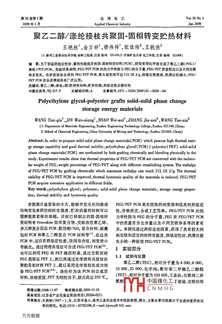 第38卷第1期應用化工Vol. 38 No. 12009年1月Applied Chemical IndustryJan. 2009聚乙二醇/滌綸接枝共聚固-固相轉(zhuǎn)變貯熱材料.王艷秋' ,金萬祥' ,繆偉偉' ,張佳偉2 ,王桃俠”(1.徐州工業(yè)職業(yè)技術(shù)學院材料工程系,江蘇徐州21140;2. 中國礦業(yè)大學化工學院,江蘇徐州221008)摘要:為了制 備熱穩(wěn)定性好蓄熱性能優(yōu)異的固-固相轉(zhuǎn)變材料(PCM) ,研究采用化學法合成了聚乙二醇( PEC)/諜綸( PET)PCM。實驗結(jié)果表明,PEC/PET PCM的熱力學性能與PEG的分子量、PEG/PET質(zhì)量配比以及不同交聯(lián)體系有關(guān)?;瘜W接枝法合成的PEG/PET PCM,最大相變焓可達112. 02 J/g,熱穩(wěn)定性提高,熱滯后性減小, PEC/PET PCM在眾多領(lǐng)城具有廣泛應用。關(guān)鍵詞:聚乙二醇;滌綸;固-固相變材料;貯熱性能;熱穩(wěn)定性及滯后性中圖分類號:TQ 317.5文獻標識碼:A文章編號:1671 -3206(2009)01 -0028 -04Polyethylene glycol-polyester grafts solid-solid phase changestorage energy materialsWANG Yan -qiu' ,JIN Wanxiang' ,MIAO Wei wei' ,ZHANG Jia wei2 , WANG Tao xia2(1. Department of Materials Engineering,Xuzhou Engineering Technology College, Xuzhou 221 140 ,Chine;2. School of Chemical Engineering,China University of Mining and Technology . Xuzhou 221008 ,China)Abstract :In order to prepare solid-solid phase change materials( PCM) which process high thernal ener-gy stornge capability and good thermal slability , polyethylene glycol( PCM) ) -polyester( PET) solid-solidphase change materials( PCM) are synthesized by both grafting chemically and blending physically in thestudy. Experiments results show that thermal properties of PEG/PET PCM are concerned with the molecu-lar weight of PEG , weight percentage of PEG/PET along with different crosslinking system. The enthalpyof PEG/PET PCM by grafting chemically which maximum enthalpy can reach 112. 02 J/g. The themalstability of PEG/PET PCM is improved , themal hysteresis quality of the materials is reduced. PEG/PETPCM acquire extensive application in different fields.Key words: polyethylene glycol; polyester; solid solid phase change materials; storage energy proper~ties; thermal stability and hysteresis quality在能源日益緊張的今天,能夠開發(fā)出利用微觀PEC/PET PCM具有較高的相變焓和優(yōu)良的熱穩(wěn)定結(jié)構(gòu)變化來調(diào)控相轉(zhuǎn)變溫度、貯存熱量的材料可以性,價格便宜,合成工藝簡單。PEG/PET PCM的熱緩解能源緊張的難題。目前已研制出的固-固相轉(zhuǎn)力學性能與PEG的分子量、PEG在PEG/PET PCM變材料有Perovskite層狀復合物、交聯(lián)改性聚乙烯、中的質(zhì)量百 分比含量以及不同交聯(lián)體系等因素有多元醇復合固態(tài)PCM脂肪酸/SiO2復合材料、微囊關(guān)。本研究通過調(diào)控這些因紫,獲得了具有較大的包封PCM和聚乙二醇復合PCM材料等' ,在這些相變焓和適宜的相轉(zhuǎn)變溫度,熱穩(wěn)定性好,熱滯后損PCM中,還存在熱穩(wěn)定性差,使用壽命短,相變焓小失小的一種新型PEG/PET PCM。等缺點。通過物理共混法可合成PEG/PET PCM[*],1實驗部分也可以利用PEC和PET端部羥基,通過交聯(lián)劑將1.1試劑與儀器PEG偶聯(lián)在PET.上, 然后再通過化學鍵將其接枝在聚酯骨架材料PET上,最后采用化學接枝法成功制聚乙二醇(PEG) ,相對分子量為4000 ,6 000,備PEG/PET PCM[3s]。滌綸作為該PCM的合成原10 000,20 000,化學純;聚對苯二甲酸乙二醇酯.材料,價格便宜,PET為剛性分子,熔點高達250 C。(PET) ,相對分子量為150 000,工業(yè)品;交聯(lián)劑二異氰酸中國煤化工丁基錫、交聯(lián)劑鄰收稿日期:2008-1107修改稿日期:2008-11-18YHCNMHG基金項目:江蘇省產(chǎn)業(yè)化基金資助項目(JH204-023)作者簡介:王艷秋(1967 -) ,女,江蘇豐縣人,徐州工業(yè)職業(yè)技術(shù)學院副教授,博士,主要從事功能高分子合成和重質(zhì)油化學的研究。電話;0516 - 85782298,E - mail:kjcwyq@ 163. com第1期王艷秋等:聚乙二醇/滌綸接枝共聚固固相轉(zhuǎn)變貯熱材料29苯二甲酸酐、催化劑濃硫酸、交聯(lián)劑乙二醇、催化劑接枝物的相變過程是固-固相變。三氧化二銻均為化學純;二甲基亞砜(DMSO)為分析純。DSC-2C型差示掃描量熱儀;MAGMA-IRS60 FT-R儀;DHC-9053A磁力加熱攪拌器;DZSFEF-3真空.干燥箱;SHZ-D( M)真空抽濾器。1.2樣品制備原料干燥溶解- +PET 溶液+交聯(lián)劑+催化劑→回流一→回流溶液+PEC溶液→交聯(lián)反應- +冷卻洗絳+抽濾干燥-→PCM→性能測試。首先將PEG、PET和不同交聯(lián)劑干燥,處理后的圖1化學接枝法制備的 PEC/PET PCM的可逆相轉(zhuǎn)變過程Fg1 Reversible phae change proess of PEC/PET PCMPEG與純凈水、PET與二甲基亞砜分別以1/3和prepard by grafting chermically1/20的質(zhì)量比配成溶液。向PEC溶液中加入-定量2.2 影響PEG/PET PCM貯熱性能的因素的鄰苯二甲酸酐(其用量保證整個制備過程中它所2.2.1 PEC的百分含量與蓄熱性能的關(guān)系 化學含的發(fā)酸根的量是PEC和PET中經(jīng)基的量的1. I合成PEG/PET共聚物分子鏈具有軟、硬鏈段相間的倍)和少盤的催化劑濃硫酸(其用量為鄰苯二甲酸結(jié)構(gòu)特點,PEG/PET共聚物分子鏈兩端是由硬鏈段酐的0. 1%),混合液在攪拌回流條件下預反應.封端的,軟鏈段含量同共聚時所加入的PEG的量是30 min ,最后加入一定質(zhì)量配比的PET溶液,在磁力基本相同的。攪拌下混合均勻后在100心保持2.5 h,讓其充分反對不同PEC質(zhì)量百分含量所得到的PEC/PET應。反應完全后混合物成凝膠狀,洗滌抽濾3-4次共聚物進行DSC分析,結(jié)果見表1。PET在240-后,將乳白色凝