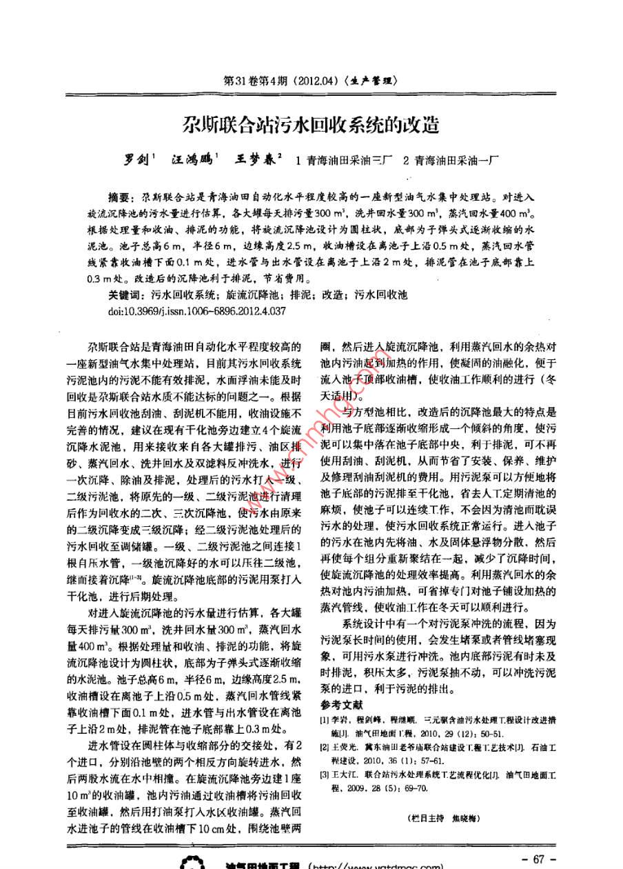 第31卷第4期(201204)〈生產(chǎn)譽(yù)理)尕斯聯(lián)合站污水回收系統(tǒng)的改造羅劊'汪鴻鷓'王夢(mèng)春21青海油田采油三廠2青海油田采油一廠摘要:尕斯聯(lián)合站是青海油田自動(dòng)化水平程度較高的一座新型油氣水集中處理站。對(duì)進(jìn)流沉降池的污水量進(jìn)行估算,各大罐每天排污量300m',洗井回水量300m3,蒸汽回水量400m。根據(jù)處理量和收油、排泥的功能,將旋流沉降池設(shè)計(jì)為圓柱狀,底郵為子彈頭式逐漸收縮的水泥池。池子總高6m,半徑6m,邊緣高度2.5m,收油槽設(shè)在離池子上沿0.5m處,蒸汽回水管線緊靠收油槽下面0.1m處,進(jìn)水管與出水管設(shè)在離池于上沿2m處,排泥管在池子底部靠上0.3m處。改造后的沉降池利于排泥,節(jié)省費(fèi)用。關(guān)鍵詞:污水回收系統(tǒng);旋流沉降池;排泥;改造;污水回收池doi:10.3969/isn.1006-689620124.03尕斯聯(lián)合站是青海油田自動(dòng)化水平程度較高的圈,然后進(jìn)入旋流沉降池,利用蒸汽回水的余熱對(duì)座新型油氣水集中處理站,目前其污水同收系統(tǒng)池內(nèi)污油起到加熱的作用,使凝固的油融化,便于污泥池內(nèi)的污泥不能有效排泥,水面浮油未能及時(shí)流入池子頂部收油槽,使收油工作順利的進(jìn)行(冬回收是尕斯聯(lián)合站水質(zhì)不能達(dá)標(biāo)的問題之一。根據(jù)天適用)。目前污水回收池刮油、刮泥機(jī)不能用,收油設(shè)施不與方型池相比,改造后的沉降池最大的特點(diǎn)是完善的情況,建議在現(xiàn)有干化池旁邊建立4個(gè)旋流利用池子底部逐漸收縮形成一個(gè)傾斜的角度,使污沉降水泥池,用來接收來自各大罐排污、油區(qū)排泥可以集中落在池子底部中央,利于排泥,可不再砂、蒸汽回水、洗井回水及雙濾料反沖洗水,進(jìn)行使用刮油、刮泥機(jī),從而節(jié)省了安裝、保養(yǎng)、維護(hù)一次沉降、除油及排泥,處理后的污水打入一級(jí)、及修理刮油刮泥機(jī)的費(fèi)用。用污泥泵可以方便地將二級(jí)污泥池,將原先的一級(jí)、二級(jí)污泥池進(jìn)行清理池子底部的污泥排至干化池,省去人T定期清池的后作為回收水的二次、三次沉降池,使污水由原來麻煩,使池子可以連續(xù)T作,不會(huì)因?yàn)榍宄囟⒄`的二級(jí)沉降變成三級(jí)沉降;經(jīng)二級(jí)污泥池處理后的污水的處理,使污水回收系統(tǒng)正常運(yùn)行。進(jìn)入池子污水回收至調(diào)儲(chǔ)罐。一級(jí)、二級(jí)污泥池之間連接1的污水在池內(nèi)先將油、水及固體懸浮物分散,然后根白壓水管,一級(jí)池沉降好的水可以壓往二級(jí)池,再使每個(gè)組分重新聚結(jié)在一起,減少了沉降時(shí)間,繼而接著沉降。旋流沉降池底部的污泥用泵打入使旋流沉降池的處理效率提高。利用蒸汽回水的余干化池,進(jìn)行后期處理。熱對(duì)池內(nèi)污油加熱,可省掉專門對(duì)池子鋪設(shè)加熱的對(duì)進(jìn)入旋流沉降池的污水量進(jìn)行估算,各大罐蒸汽管線,使收油工作在冬天可以順利進(jìn)行。每天排污量300m,洗井回水量300m3,蒸汽回水系統(tǒng)設(shè)計(jì)中有一個(gè)對(duì)污泥泵沖洗的流程,因?yàn)榱?0m。根據(jù)處理量和收油、排泥的功能,將旋污5泥泵長時(shí)間的使用,會(huì)發(fā)生堵泵或者管線堵塞現(xiàn)流沉降池設(shè)計(jì)為圓柱狀,底部為子彈頭式逐漸收縮象,可用污水泵進(jìn)行沖洗。池內(nèi)底部污泥有時(shí)末及的水泥池。池子總高6m,半徑6m,邊緣高度25m,收油槽設(shè)在離池子上沿05m處,蒸汽回水管線緊泵的進(jìn)口,利于污泥的排出??渴沼筒巯旅?1m處,進(jìn)水管與出水管設(shè)在離池參考文獻(xiàn)李巖,程劍峰,程繼順三元驅(qū)含油污水處理T程設(shè)計(jì)改進(jìn)措子上沿2m處,排泥管在池子底部靠上0.3m處。觸油氣田地面程,2010,29(12):5051進(jìn)水管設(shè)在圓柱體與收縮部分的交接處,有212王熒光。冀東油田老爺廟聯(lián)合站建設(shè)工韁工藝技術(shù)石油工個(gè)進(jìn)口,分別沿池壁的兩個(gè)相反方向旋轉(zhuǎn)進(jìn)水,然程述設(shè),2010,36(1):57-61.后兩股水流在水中相撞。在旋流沉降池旁邊建1座3]王大江,聯(lián)合站污水處理系統(tǒng)T藝流程優(yōu)化油氣田地面工10m的收油罐,池內(nèi)污油通過收油槽將污油回收程,2009,28(5):6970至收油罐,然后用打油泵打入水區(qū)收油罐。蒸汽回(欄日主持焦曉梅水進(jìn)池子的管線在收油槽下10cm處,圍繞池壁兩