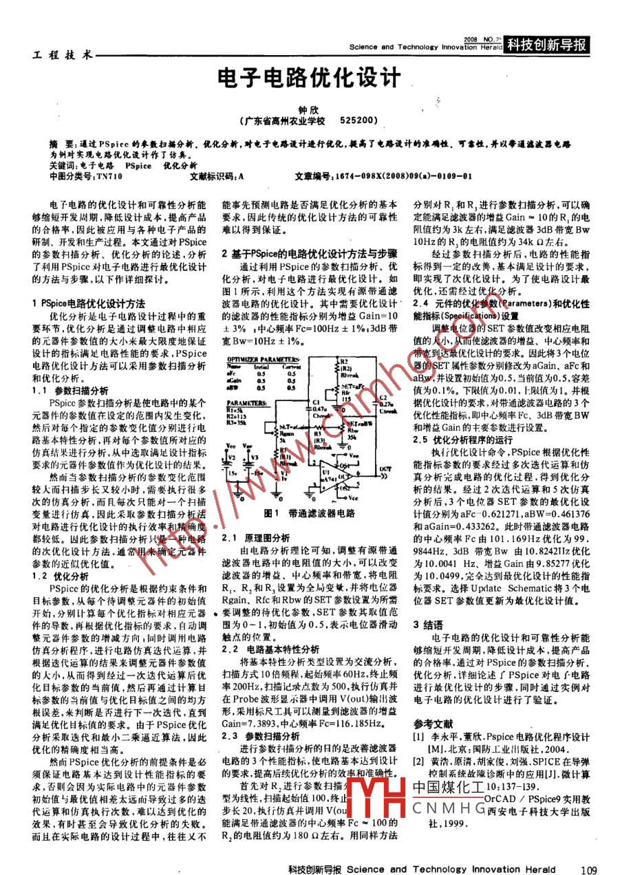 sclince ond Tchnoloy Imoveon Hriar科技創(chuàng)新導(dǎo)報(bào)I工程技術(shù).電子電路優(yōu)化設(shè)計(jì)(廣東省高州農(nóng)業(yè)學(xué)校525200)摘要:通過PSpice 的參數(shù)掃描分析。優(yōu)化分析,對(duì)電子電路設(shè)計(jì)進(jìn)行優(yōu)化,提離了電路設(shè)計(jì)的準(zhǔn)確性、可靠性,并以帶通濾波器電路為創(chuàng)對(duì)實(shí)現(xiàn)電路優(yōu)化設(shè)計(jì)作了仿真。關(guān)鍵詞:電子電路PSpice 優(yōu)化分析中圖分類號(hào):TN710文獻(xiàn)標(biāo)識(shí)碼:A文章編號(hào): 1674-098X(2008)09(a)> -0109-01電子電路的優(yōu)化設(shè)計(jì)和可靠性分析能能事先預(yù)測(cè)電路是否滿足優(yōu)化分析的基本分別對(duì)R,和R,進(jìn)行參敷掃描分析,可以確夠縮短開發(fā)周期,降低設(shè)計(jì)成本,提高產(chǎn)品要求, 因此傳統(tǒng)的優(yōu)化設(shè)計(jì)方法的可靠性定能滿足濾波器的增益Gain = 10的R,的電的合格率,因此被應(yīng)用與齊種電子產(chǎn)品的難以得到保證.阻值約為3k左右,滿足濾波器3dB帶寬Bw研制、開發(fā)和生產(chǎn)過程。本文通過對(duì)PSpice10Hz的R,的電阻值約為34k Q左右。的參數(shù)打描分析、優(yōu)化分析的論述,分析2 基于PSpice的電路優(yōu)化設(shè)計(jì)方法與步驟經(jīng)過參數(shù)掃描分析后,電路的性能指了利用PSpice對(duì)電子電路進(jìn)行最優(yōu)化設(shè)計(jì)通過利用PSpice的參數(shù)掃描分析,優(yōu)標(biāo)得到一 定的改 養(yǎng),基本滿足設(shè)計(jì)的要求,的方法與步驟,以下作詳細(xì)探討?;治?,對(duì)電子電路進(jìn)行最優(yōu)化設(shè)計(jì)。如即實(shí)現(xiàn)了 次優(yōu)化設(shè)計(jì)。為了使電路設(shè)計(jì)最圖1所示,利用這個(gè)方法實(shí)現(xiàn)有源帶通濾優(yōu)化,還需經(jīng)過優(yōu)化分析。1 PSpice電路優(yōu)化設(shè)計(jì)方法波器電路的優(yōu)化設(shè)計(jì)。其中需要優(yōu)化設(shè)計(jì)2.4元件的優(yōu)化參數(shù)(Parameters)和優(yōu)化性優(yōu)化分析是電子電路設(shè)計(jì)過程中的重的濾波 器的性能指標(biāo)分別為增益Gain= 10能指標(biāo)(Specifications)設(shè)置要環(huán)節(jié),優(yōu)化分析尼通過調(diào)整電路中相應(yīng)土 3% ;中心頻率Fc= 100Hz土1%;3dB帶調(diào)整電位器的SET參數(shù)值改變相應(yīng)電阻的元器件參數(shù)值的大小米最大限度地保證寬Bw= 10Hz土1%.值的人小,從而使濾波器的增益、中心頻率和設(shè)計(jì)的指標(biāo)滿足電路性能的要求,PSpice帶寬到達(dá)最優(yōu)化設(shè)計(jì)的要求。因此將3個(gè)電位電路優(yōu)化設(shè)i計(jì)方法可以采用參數(shù)掃描分析器的SET屬性參數(shù)分別修改為aGain, aFc和和優(yōu)化分析。aBw ,并設(shè)置初始值為0.5,當(dāng)前值為0.5,容差TT1.1 參數(shù)掃描分析值為0.1%。下限值為0.01,上:限值為1。并根PSpicc參數(shù)幻描分析是使電路中的某個(gè)據(jù)優(yōu)化設(shè)計(jì)的要求,對(duì)帶通濾波器電路的3個(gè)元器件的參數(shù)值在設(shè)定的范圍內(nèi)發(fā)生變化,優(yōu)化性能指標(biāo),即中心頻率Fc.3dB 帶寬BW然后對(duì)每個(gè)指定的參數(shù)變化值分別進(jìn)行電和增益Gain的主要參數(shù)進(jìn)行設(shè)置。路基本特性分析,再對(duì)每個(gè)參數(shù)值所對(duì)應(yīng)的2.5優(yōu)化分析程序的運(yùn)行仿真結(jié)果進(jìn)行分析,從中選取滿足設(shè)計(jì)指標(biāo)執(zhí)行優(yōu)化設(shè)計(jì)命令,PSpice根據(jù)優(yōu)化性要求的元器件參數(shù)值作為優(yōu)化設(shè)計(jì)的結(jié)果。能指標(biāo)參數(shù)的要求經(jīng)過多次迭代運(yùn)算和仿然而當(dāng)參數(shù)掃描分析的參數(shù)變化范圍真分析完成電路的優(yōu)化過程,得到優(yōu)化分較大而掃描步長(zhǎng)又較小時(shí),需要執(zhí)行很多析的結(jié)果。經(jīng)過2次迭代運(yùn)算和5次仿真次的仿真分析,而月每次只能對(duì)一個(gè)掃描分析后,3個(gè)電位器SET參數(shù)的最優(yōu)化設(shè)變量進(jìn)行仿真,因此采取參數(shù)扣描分析法圍1 帶通濾波器電路計(jì)值分別為aFc -0.621271, aBW=0.461376對(duì)電路進(jìn)行優(yōu)化設(shè)計(jì)的執(zhí)行效率和精確度和aGain=0.433262。此時(shí)帶通濾波器電路都較低。因此參數(shù)掃描分析只是一種電路2.1 原理圖分析的中心頻率Fc由101. 169Hz優(yōu)化為99.的次優(yōu)化設(shè)計(jì)方法,通常用來確定元器件由電路分析理論可知,調(diào)整有源帶通9844Hz. 3dB 帶寬Bw由10.824211z2優(yōu)化參數(shù)的近似優(yōu)化值。濾波器電路中的電阻值的大小,可以改變?yōu)?0.0041 Hz、 增益Gain由9. 85277優(yōu)化1.2優(yōu)化分析濾波器的增益、中心頻率和帶寬,將電阻為10.0499.完會(huì)達(dá)到最優(yōu)化設(shè)計(jì)的性能指PSpice的優(yōu)化分析是根據(jù)約束條件和R. R, 和R,設(shè)置為全局變域,并將電位器標(biāo)要求。 選擇Update Schematic 將3個(gè)電目標(biāo)參數(shù),從每個(gè)待調(diào)整元器件的初始值Rgain. Rfc 和Rbw的SET參數(shù)設(shè)置為所需位器SET參數(shù)值更新為最優(yōu)化設(shè)計(jì)值.開始,分別計(jì)算每個(gè)優(yōu)化指標(biāo)對(duì)相應(yīng)元器●要調(diào)整的待優(yōu)化谷數(shù),SET參數(shù)其取值范件的導(dǎo)數(shù).再根據(jù)優(yōu)化指標(biāo)的要求,自動(dòng)調