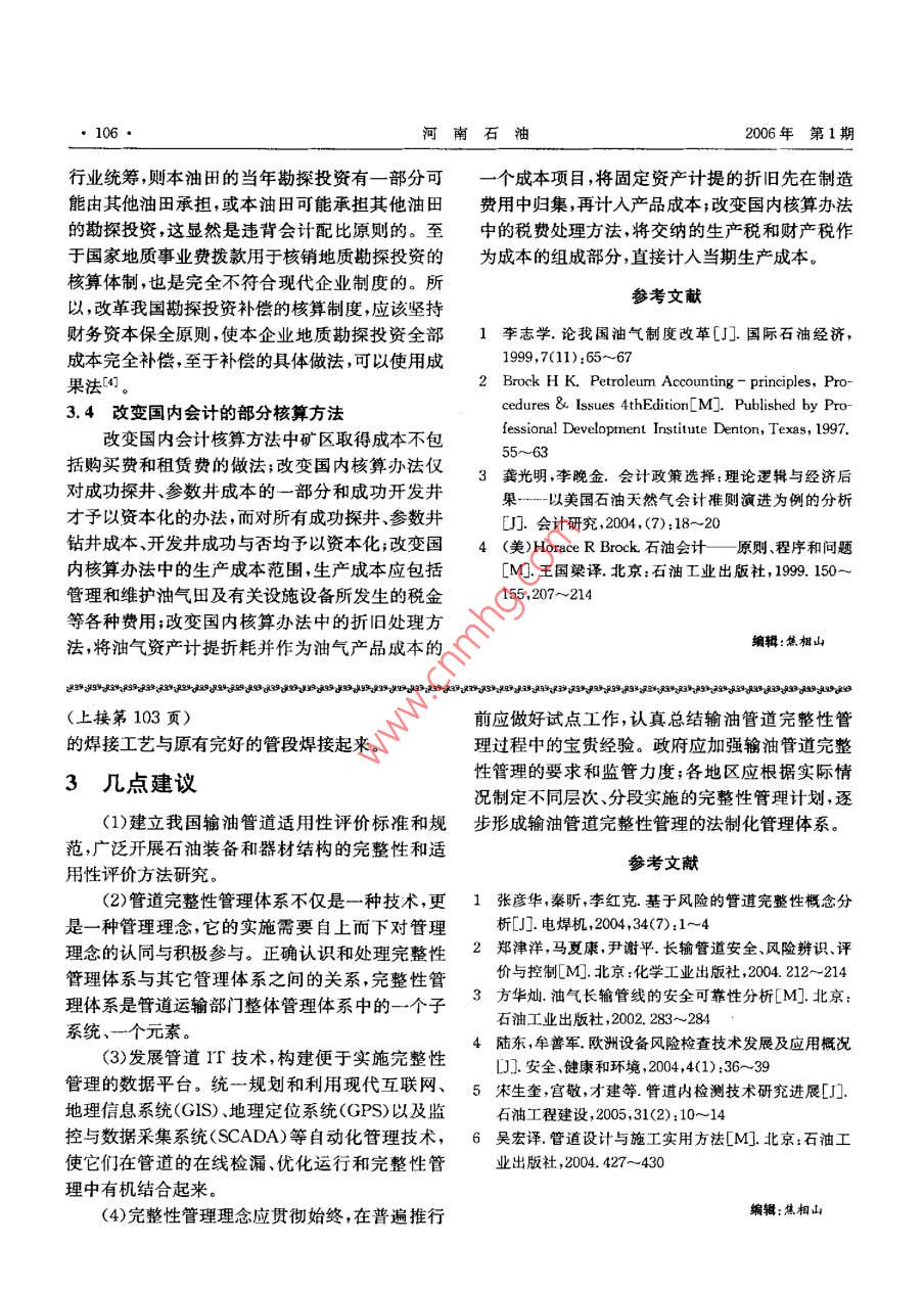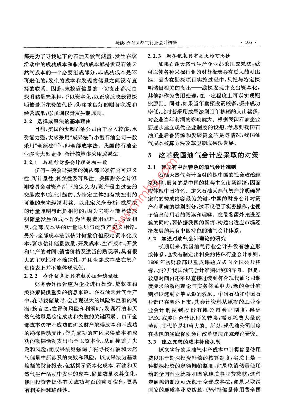 河南石油2006年1月Henan Petroleum第20卷第1期文章編號(hào):1006-4095(200601-0104-03石油天然氣行業(yè)會(huì)計(jì)初探馬穎(中國(guó)石油大學(xué)經(jīng)濟(jì)管理學(xué)院,山東東營(yíng)257061)摘要:對(duì)中國(guó)石油天然氣行業(yè)會(huì)計(jì)的特征及存在的問(wèn)題進(jìn)行了分析,并對(duì)石油天然氣行業(yè)會(huì)計(jì)中約兩種會(huì)計(jì)方法進(jìn)行了對(duì)比選擇,探討和提出了石油天然氣會(huì)計(jì)的改革思路與建議,關(guān)鍵詞:石油天然氣行業(yè);會(huì)計(jì)準(zhǔn)則;成罘法;完全成本法;探討中圖分類(lèi)號(hào):TE-2;TE-9文獻(xiàn)標(biāo)識(shí)碼:A石油天然氣(簡(jiǎn)稱(chēng)油氣)行業(yè)是一個(gè)特殊的行整性。業(yè),其特殊性表現(xiàn)在高風(fēng)險(xiǎn)高投資、產(chǎn)量遞減、下1.4油氣會(huì)計(jì)準(zhǔn)則難以統(tǒng)游高附加值。這些特性決定了石油天然氣行業(yè)會(huì)中石油、中石化、中海油三大油氣公司所采用計(jì)制度中涉及一些具有行業(yè)特征的特殊規(guī)則。的會(huì)計(jì)制度并不相同,與美國(guó)會(huì)計(jì)實(shí)踐相比,至少1我國(guó)油氣會(huì)計(jì)的特征及存在問(wèn)題在油氣資產(chǎn)的折舊或?yàn)╀N(xiāo)油氣資產(chǎn)棄置成本的1.1以普通制造行業(yè)會(huì)計(jì)制度為其核算依據(jù)在較大差距,從而影響了會(huì)計(jì)信息的可比性1993年以前,我國(guó)會(huì)計(jì)制度基本上是“三段式”,即會(huì)計(jì)科目介紹會(huì)計(jì)報(bào)表格式,會(huì)計(jì)科目應(yīng)2兩種基本會(huì)計(jì)方法的選擇用舉例。也就是說(shuō),會(huì)計(jì)所要履行的是簡(jiǎn)單的核2.1概念算職能,且不能顧及行業(yè)特色。其中的成本核算成果法,亦譯作成功努力法,是石油天然氣行是按照機(jī)械加工行業(yè)的制造成本法計(jì)算原油成本業(yè)廣為采用的一種以歷史成本計(jì)量石油天然氣資的,與石油的開(kāi)發(fā)生產(chǎn)具有初期產(chǎn)量高隨后產(chǎn)量產(chǎn)的會(huì)計(jì)方法2。它的基本特點(diǎn)是,與探明儲(chǔ)量迅速遞減并趨于平緩的特點(diǎn)不相適應(yīng)。因此不相關(guān)的成本才予以資本化,再按一定的標(biāo)準(zhǔn)以折能完整體現(xiàn)權(quán)責(zé)發(fā)生制、重要性等基本會(huì)計(jì)原則。舊、折耗和攤銷(xiāo)的方式計(jì)入開(kāi)采出來(lái)的石油天然l2缺乏對(duì)油、氣地質(zhì)儲(chǔ)量等有關(guān)資料的披露氣產(chǎn)品成本之中。如果發(fā)生的成本不能直接導(dǎo)致石油、天然氣儲(chǔ)量是石油和天然氣生產(chǎn)企業(yè)探明儲(chǔ)量,這些成本就要作為當(dāng)期費(fèi)用處理生產(chǎn)經(jīng)營(yíng)的基礎(chǔ),石油和天然氣生產(chǎn)企業(yè)的目的全部成本法,在20世紀(jì)50年代中期美國(guó)石就是把石油和天然氣從地下開(kāi)采出來(lái),如果沒(méi)有油天然氣會(huì)計(jì)實(shí)務(wù)中開(kāi)始出現(xiàn),50年代末至60油氣儲(chǔ)量,石油和天然氣生產(chǎn)企業(yè)的經(jīng)營(yíng)活動(dòng)就年代初得到較大范圍的應(yīng)用,現(xiàn)今已成為美國(guó)石要停止。因此,油氣儲(chǔ)量也是評(píng)價(jià)石油和天然氣油天然氣會(huì)計(jì)實(shí)務(wù)中與成果法并駕齊驅(qū)的兩種方生產(chǎn)企業(yè)發(fā)展?jié)摿Φ闹匾笜?biāo)之一,一個(gè)石油和法之其主要特點(diǎn)是:①以國(guó)家或政治地理天然氣生產(chǎn)企業(yè)每年新發(fā)現(xiàn)的油氣探明儲(chǔ)量和每區(qū)域?yàn)槌杀局行?②把一個(gè)成本中心的勘探、取得年采出的油氣在數(shù)量上應(yīng)保持一定比例,企業(yè)才和開(kāi)發(fā)成本全部資本化,無(wú)論這些活動(dòng)的結(jié)果成能保持穩(wěn)定發(fā)展功與否;③石油天然氣公司的一切勘探開(kāi)發(fā)活動(dòng)L.3成本核算內(nèi)容不完整油氣會(huì)計(jì)核算以不體現(xiàn)油氣行業(yè)生產(chǎn)經(jīng)營(yíng)特收稿日期:2005-09-19改回日期:2005-10-18色的統(tǒng)一會(huì)計(jì)制度為依據(jù),其成本計(jì)算方法亦采作者簡(jiǎn)介:馬鞭,1980年生,2003年畢業(yè)于石油大學(xué),獲管用一般制造業(yè)成本核算方法,如品種法、訂單法、理和英語(yǔ)雙學(xué)士學(xué)位,現(xiàn)為T(mén)商管理學(xué)院管理科學(xué)與工程專(zhuān)業(yè)碩」研究生,研究方向:系統(tǒng)科學(xué)理論與應(yīng)用。電話(huà):0546分步法等,所以導(dǎo)致了石油開(kāi)發(fā)成本核算的不完8390721馬穎.石油天然氣行業(yè)會(huì)計(jì)初探都是為了尋找地下的石油天然氣儲(chǔ)量,發(fā)生在該2.2.3財(cái)務(wù)報(bào)表具有更大的可比性活動(dòng)中的成功成本和非成功成本都是發(fā)現(xiàn)石油天如果石油天然氣生產(chǎn)企業(yè)都采用成果法,就然氣成本的一個(gè)必要組成部分,非成功成本是不可以使各種采掘行業(yè)的財(cái)務(wù)報(bào)表具有更大的可比可避免的,發(fā)生的成本和發(fā)現(xiàn)的儲(chǔ)量之間沒(méi)有直性。因?yàn)樵诳碧巾?xiàng)目實(shí)施過(guò)程中,只把與特定探接的聯(lián)系。因此,末找到儲(chǔ)量的一切支出都應(yīng)由明儲(chǔ)量相關(guān)的支出—勘探發(fā)現(xiàn)井支出資本化,探明儲(chǔ)量來(lái)承擔(dān),予以資本化,以正確反映獲得探其他都作為費(fèi)用處理,在一定程度上