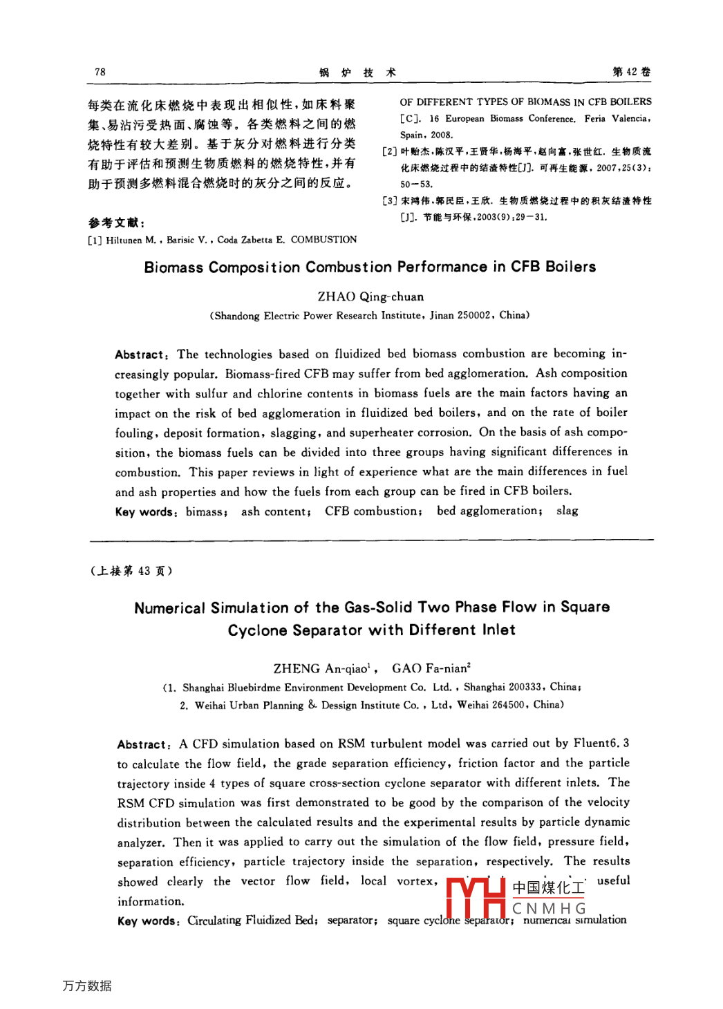 第42卷第5期鍋爐技術(shù)Vol 42. No 52011年9月BOILER TECHNOLOGYSep., 2011文章編號(hào):CN31-1508(2011)09-0075-04生物質(zhì)燃料成份對(duì)生物質(zhì)流化床燃燒的影響趙晴川(山東電力研究院,山東濟(jì)南250002)要:基于流化床的生物質(zhì)燃燒技術(shù)應(yīng)用日益廣泛。生物質(zhì)燃料流化床的缺點(diǎn)是容易產(chǎn)生床體結(jié)焦?;业慕M分和生物質(zhì)燃料中的硫、氯是影響流化床鍋爐燒結(jié)傾向、鍋爐污染速率、灰沉積過(guò)程、結(jié)焦和過(guò)熱器腐蝕的主要因素。以灰成分為基礎(chǔ)劃分生物質(zhì)燃料,可分為具有顯著的不同燃燒特性的3類。在實(shí)踐的基礎(chǔ)上,闡述了各類生物質(zhì)燃料及其灰分特性以及在流化床燃燒中的特點(diǎn)關(guān)鍵詞:生物質(zhì);灰分;流化床燃燒;床體聚集;結(jié)渣中圖分類號(hào):X705文獻(xiàn)標(biāo)識(shí)碼:B0前言度、凈發(fā)熱量、氮和氯含量等。該標(biāo)準(zhǔn)還列出了表征生物質(zhì)燃料化學(xué)特性的一些典型參數(shù)及其近年來(lái)對(duì)生物質(zhì)燃料的需求在不斷增長(zhǎng)。數(shù)值包括灰成分、高位和低位發(fā)熱量、主要可燃與傳統(tǒng)燃料相比,生物質(zhì)燃料燃燒更加困難。燃物質(zhì)(C,H,O,N,S)、鹵素(CL和F)等。該標(biāo)準(zhǔn)料隨季節(jié)和所在地區(qū)而不同,水分可能很高。燃中給出了大量固體生物質(zhì)燃料的具體特性,包括料的預(yù)處理和給料系統(tǒng)較復(fù)雜。燃燒生物質(zhì)鍋針葉樹木及落葉樹木的樹干和樹皮、伐木屑、灌爐普遍存在沾污、灰沉積、結(jié)焦和過(guò)熱器腐蝕等木、秸稈和谷物、雜草、果殼等。盡管CEN/Ts問(wèn)題。14961以標(biāo)準(zhǔn)形式提供了不同固體生物質(zhì)燃料的固體生物質(zhì)燃料常用的工業(yè)燃燒技術(shù)是鼓重要信息和數(shù)據(jù),但從燃燒學(xué)方面來(lái)看,這些分泡流化床(BFB)、循環(huán)流化床(CFB)和層燃鍋爐。類并不足以完全描述不同生物質(zhì)的燃料特性其中基于流化床(BFB和CFB)的技術(shù)應(yīng)用日益廣泛。生物質(zhì)流化床鍋爐的燃燒與灰成分密切2生物質(zhì)燃料的灰分相關(guān)?;页练e物和生物質(zhì)中的硫、氯是影響流化從燃燒觀點(diǎn)看,生物質(zhì)燃料以灰分可劃分為床鍋爐結(jié)焦傾向、鍋爐污染速率、灰沉積過(guò)程、結(jié)3類:焦、和過(guò)熱器腐蝕的主要因素。以灰成分為基礎(chǔ)(1)灰中富CaK貧Si生物質(zhì);可將生物質(zhì)燃料劃分為具有不同燃燒特性的三(2)灰中富Si貧Ca、K生物質(zhì);大類。每類生物質(zhì)燃料特性和灰特性各不相同,(3)灰中富Ca、KNa生物質(zhì)。決定了其在在流化床燃燒中的特性大多數(shù)木質(zhì)燃料屬第一類。稻殼、甘蔗渣、1生物質(zhì)燃料或春季成熟的草本植物是典型第二類生物質(zhì),葵花籽殼和菜籽餅是第三類燃料。歐洲標(biāo)準(zhǔn)委員會(huì)固體生物質(zhì)燃料分類標(biāo)準(zhǔn)CEN/TS14961把生物質(zhì)分成三大類:木質(zhì)生物3灰分中富鈣和鉀、貧硅的生物質(zhì)質(zhì)、草本生物質(zhì)以及果實(shí)類生物質(zhì)。三大類之下木質(zhì)生物質(zhì)與其他化石燃料相比,含低氮包含一些子類,以及自然混合物和人工混合物。(重量百分比0.3%~0.7%),低硫(0.03%~此標(biāo)準(zhǔn)提供了包括木炭、木屑鋸末、原木、0.05%),以及低灰分(0.1%~6%)。水分通常橄欖樹種子、草磚等眾多木質(zhì)顆粒狀生物質(zhì)燃料很高達(dá)到50中國(guó)煤化工低位發(fā)的特性和規(guī)格,如燃料尺寸、水分、灰分、堆積密熱量。CNMHG收稿日期:2010-07-22作者簡(jiǎn)介:趙晴川(1972-),男,副教授、高級(jí)工程師,從事電站鍋爐燃燒優(yōu)化、性能分析、節(jié)能改造等工作76鍋爐技術(shù)第42卷木質(zhì)生物質(zhì)的灰分通常富含Ca和K,見(jiàn)表處于700℃~900℃正常運(yùn)行溫度的床料中的石1。CaO在樹干和樹皮灰分中占30%~50%,英(SiO2)反應(yīng),在床料顆粒上形成一層硅酸鉀、K2O濃度達(dá)到15%,甚至更高。MgO也是木質(zhì)硅酸鈣外殼。此外殼隨時(shí)間增厚,顆粒尺寸增灰中主要成分之一,占4%~10%。鈉含量通常大。此殼層具有粘性,床體顆粒會(huì)聚集導(dǎo)致尺寸比較低。Na2O通常在木質(zhì)生物質(zhì)灰中低于3%。更大。當(dāng)遇到在鍋爐運(yùn)行波動(dòng),或偶然的床溫偏如果Na2O灰分很高,通常是由于污染,或植物生高,會(huì)造成整個(gè)床體會(huì)結(jié)渣。通過(guò)定期排渣和加長(zhǎng)在鹽地土壤造成的。入新沙粒以保持床體堿含量足夠低可以控制床表1不同物質(zhì)的灰成分wv/%料聚集。燃料灰分與床料的化學(xué)反應(yīng)是復(fù)雜的,通常減少床料的石英含量能減輕床體的聚集。波蘭煤煤泥針葉林樹皮森林沉積物木質(zhì)燃料的灰熔點(diǎn)變化很大,并與灰成分變SO274.7324.811.62.8化很大有關(guān)。通常如果燃料的堿和氯含量越高,Fe: O9.5結(jié)渣和初始變形溫度就越低。Cao3.8燃燒過(guò)程中木質(zhì)燃料灰分在900℃~1000℃開(kāi)始聚集和結(jié)渣,而煤和煤泥通常在此溫度K,O2.41.49.2范圍是安全的。木質(zhì)生物質(zhì)燃料鍋爐常與煤和Na,o1.10.50.9煤泥混燒。木質(zhì)生物質(zhì)燃料的灰分比化石燃料P,O3.74.2灰分更具活性。煤和煤泥的灰分主要由石英及其他8.4各種硅酸鹽礦物質(zhì)組成,它們不像在生物質(zhì)中注:煤和煤泥在815