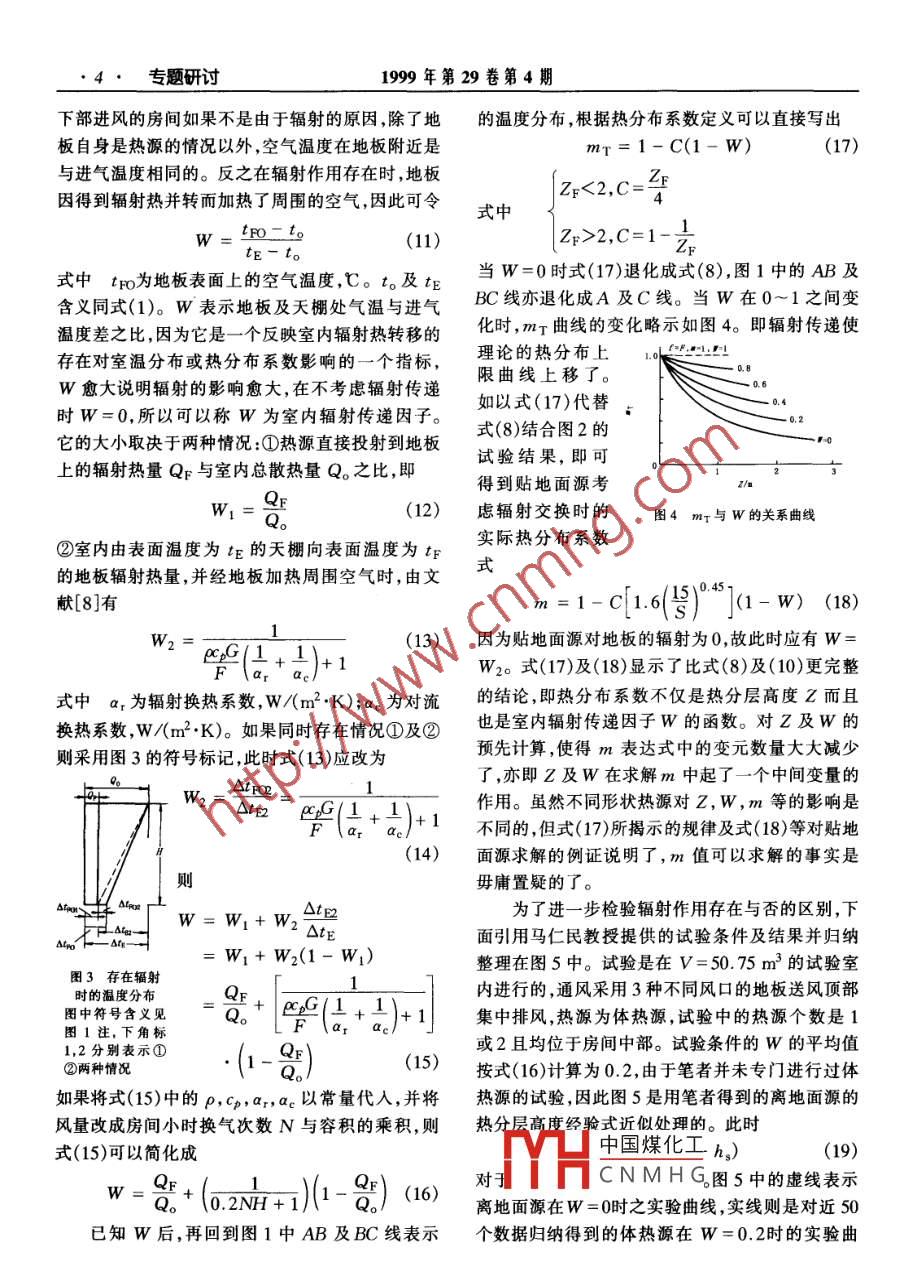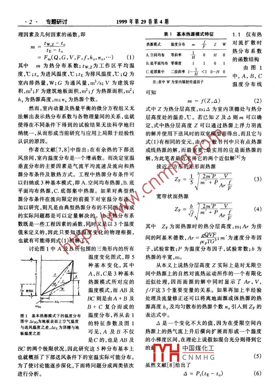 暖通空調(diào)HV&AC計(jì)熱分布系數(shù)結(jié)構(gòu)分析西安建筑科技大學(xué)趙鴻佐☆趙蕾西北電力設(shè)計(jì)院王修川提要熱分布系數(shù)作為評(píng)價(jià)通風(fēng)系統(tǒng)效率的重要指標(biāo)之一,迄今除試驗(yàn)外尚無(wú)其他定值方法。應(yīng)用作者的溫度預(yù)測(cè)方法,證實(shí)了熱分布系數(shù)是熱分層高度及房間輻射傳遞因子的函數(shù)。得出的熱分布系數(shù)數(shù)學(xué)表達(dá)式與試驗(yàn)結(jié)果吻合良好關(guān)鍵詞熱分布系數(shù)熱分層高度房間輻射傳遞因子Analysis of the structure of the heat distribution factorBy Zhao Hongzuo*, Zhao Lei and Wang XiuchuanAbstract Until recently there was no means but experiment to determinethe heat distribution factor, an important indicator of ventllationeffectiveness. Using the method of room temperature prediction by the authorsproves that the heat distribution factor(m)is a functlon of the thermalstratification height and the room radiation transfer factor and themathematical representation obtained of m agrees well with experiment results.Keywords heat distribution factor, thermal stratification height, roomradiation transfer factorXi an Uhiversity of Architecture Technology熱分布系數(shù)以及它的倒數(shù)溫度效率或通風(fēng)系近年E.O. shilkrot'6提出室內(nèi)氣流紊流擴(kuò)散傳輸統(tǒng)能量利用效率是評(píng)價(jià)通風(fēng)效率的重要指標(biāo)之一。的熱量在數(shù)值上相當(dāng)有限,因此建議采用分區(qū)熱平雖然對(duì)它的研究可以迫溯到近半個(gè)世紀(jì)以前,但迄衡近似計(jì)算熱分布系數(shù)的方法。由此可見(jiàn)認(rèn)識(shí)正今為止除試驗(yàn)之外尚無(wú)其他有效的定值方法。自在不斷提高、充實(shí)和發(fā)展,因而最終的預(yù)測(cè)熱分布從1953年B.B.巴圖林指出了熱分布系數(shù)與熱源系數(shù)的目標(biāo)是可以預(yù)期的及建筑面積比之間具有某種定量關(guān)系1之后,1熱分布系數(shù)的函數(shù)結(jié)構(gòu)H.A.弗努赫特2繼續(xù)在此基礎(chǔ)上做過(guò)一些工作,由于熱分布系數(shù)本質(zhì)上說(shuō)是一個(gè)受限空間內(nèi)并對(duì)BB巴圖林的認(rèn)識(shí)有所補(bǔ)充與修正;隨后Ⅱ.的熱對(duì)流擴(kuò)散問(wèn)題,因此它與一切建筑、熱源和通H安德烈夫認(rèn)為熱分布研究應(yīng)以里查遜數(shù)R風(fēng)條件有關(guān)擇甚要者它首先是以下多個(gè)工程物(或阿基米德數(shù)Ar)作為非等溫流動(dòng)分析的特征參中國(guó)煤化工數(shù);實(shí)踐中∏A.阿伊皮多夫4及馬仁民5先后應(yīng)CNMH☆用Ar來(lái)統(tǒng)一歸納不同送風(fēng)方式效果的試驗(yàn)數(shù)據(jù);10055西安建筑科技大學(xué)環(huán)境工程系029)5524305收稿日期:1998-05國(guó)家自然科學(xué)基金資助項(xiàng)目(編號(hào)59608003)犒件修回日期:1999-06-182·專(zhuān)題研討1999年第29卷第4期理因素及幾何因素的函數(shù),即表1基本熱源模式特征1.1僅有熱t(yī)w.zo熱源模式溫度分布F對(duì)流擴(kuò)散時(shí)Fm(Q,G,V,F,h,n,…)(1)A空均布等斜率0H0熱分布系數(shù)的函數(shù)結(jié)構(gòu)其中m為熱分布系數(shù);tw,z為工作區(qū)平均溫B.底平面均布零梯度由圖1度,℃;to為進(jìn)風(fēng)溫度,℃;tr為排風(fēng)溫度,℃;Q為C.底部集中二段斜率10~H0中,A,B,C室內(nèi)排熱量,W;G為通風(fēng)量,m3/s;V為建筑容注:表中W為室內(nèi)輻射傳遞因子溫度分布線積m3;F為建筑地板面積,m2;f為熱源面積,m2;可知h為熱源高度,m;ns為熱源個(gè)數(shù)。m=f(Z,△)然而,室內(nèi)動(dòng)量及熱量平衡的微分方程組又無(wú)式中Z為熱分層高度,m;△為室內(nèi)頂棚處與熱分法解出表示熱分布系數(shù)與各物理量間的關(guān)系,也就層高度處的溫差,℃。若已知Z及△則m可以確使得在不同條件下得到的試驗(yàn)結(jié)果無(wú)法科學(xué)地歸定,式中熱分層高度Z可以通過(guò)熱源上浮力羽流納統(tǒng)一,從而形成當(dāng)前研究與應(yīng)用上局限于經(jīng)驗(yàn)性的解并使用下送風(fēng)時(shí)的雙室模型而得出,而且它與認(rèn)識(shí)的原因。式(1)有相同的變?cè)?由于一般書(shū)刊中只有點(diǎn)熱源作者在文獻(xiàn)7,8]中指出:在有余熱的下部送或線熱源的解,而最重要、最實(shí)用的應(yīng)是面熱源的風(fēng)房間,室內(nèi)溫度分布是一個(gè)增函數(shù)。而決定室溫解,為此筆者最近求得它的兩個(gè)近似解9為垂直分布的主要因素是氣流平均流速及流向和熱接近正方形的矩形面熱源源分布條件及散熱方式。工程中熱源分布條件可zn=1/2m1以歸納成3種基本模式,即A.空間均布熱源,B.底(3)平面均布熱源,C.底部集中熱源。如果對(duì)典型熱源分布條件在流向限定的前提下對(duì)室溫分布逐寬帶狀面熱源加以研究,則凡是由典型熱源分布的不同組合構(gòu)成6 2mP的實(shí)際問(wèn)題都是可以定量解決的。由于熱分布系數(shù)既是一些工程因素的函數(shù)同時(shí)又是以3個(gè)溫度其中zF為面熱源時(shí)的熱分層高度,m;Ar為房值來(lái)定義的,因此只要知道溫度變化的物理根據(jù),也就有可能得到式(1)的解了。間的阿基米德數(shù),A=EQV5;m為速度分布因討論圖1中A及B所包圍的三角形內(nèi)的所有子,試驗(yàn)常數(shù);P為溫度分布因子,試驗(yàn)常數(shù);b為溫度變化圖式,即5熱源的半寬,m。種基本變化,其中從本義上說(shuō)熱分層高度Z實(shí)際上是對(d