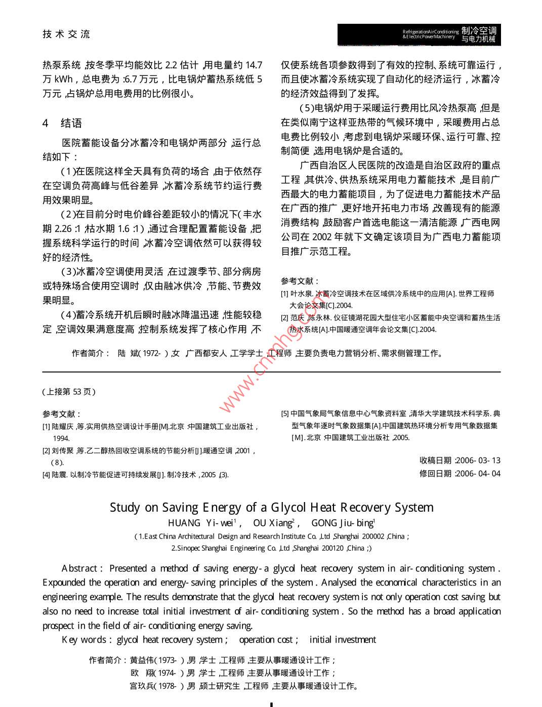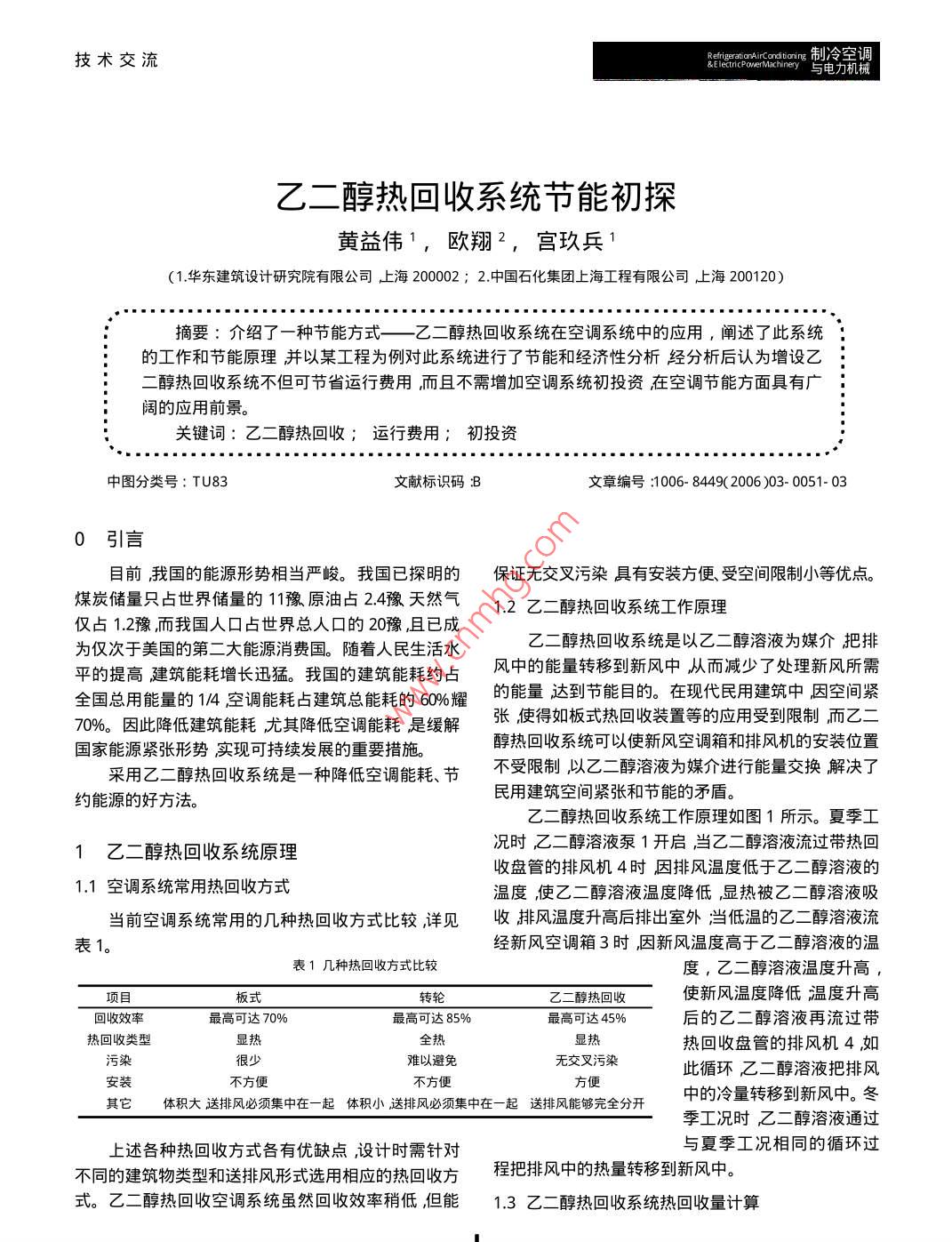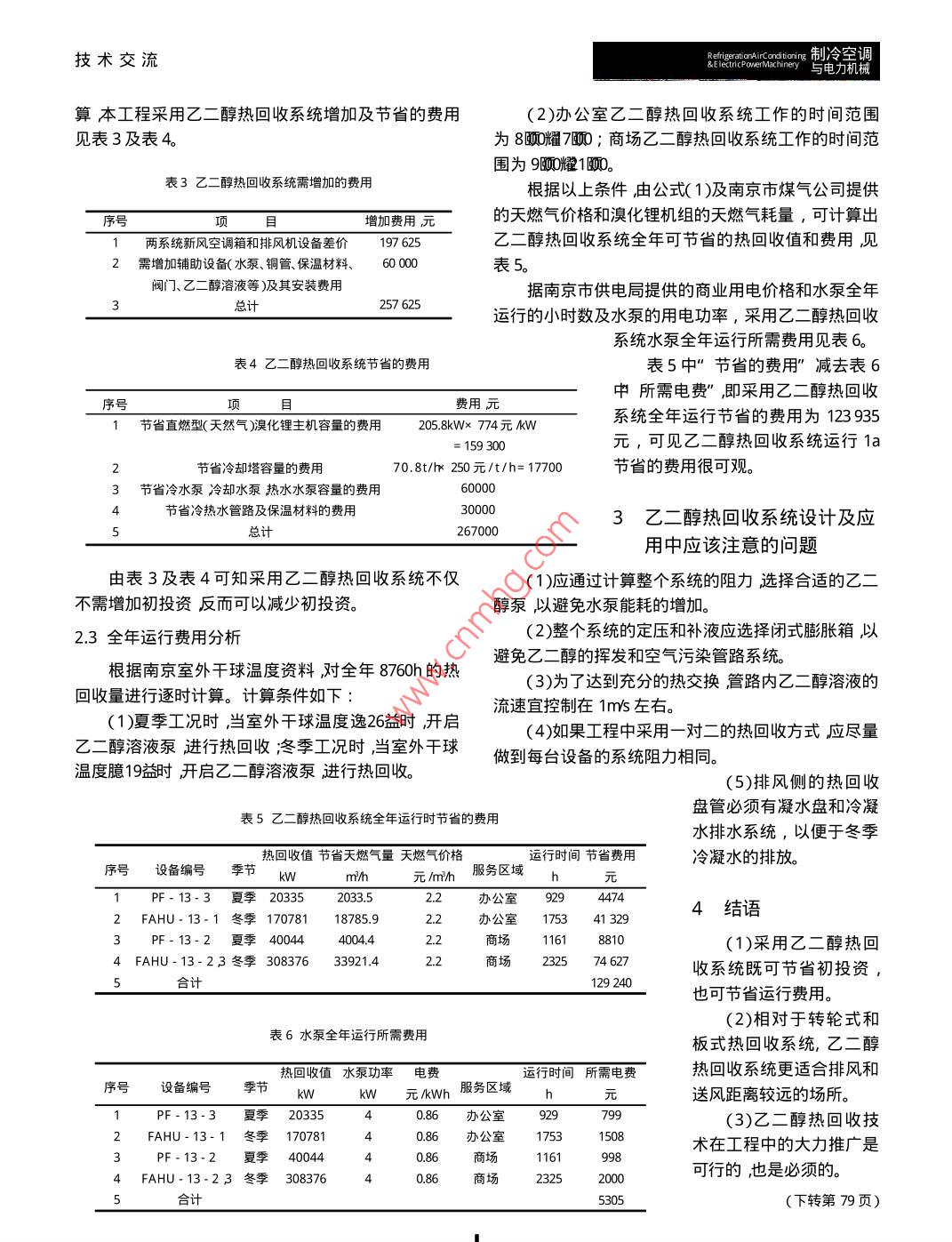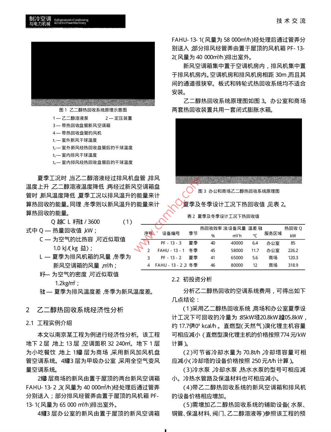 技術(shù)交流 tioring制冷空調(diào) &Elecnney與電力機(jī)械乙二醇熱回收系統(tǒng)節(jié)能初探黃益?zhèn)?,歐翔2,宮玖兵1(1.華東建筑設(shè)計(jì)研究院有限公司上海20000;2中國(guó)石化集團(tuán)上海工程有限公司上海200120摘要:介紹了一種節(jié)能方式——乙二醇熱回收系統(tǒng)在空調(diào)系統(tǒng)中的應(yīng)用,闡述了此系統(tǒng)的工作和節(jié)能原理并以某工程為例對(duì)此系統(tǒng)進(jìn)行了節(jié)能和經(jīng)濟(jì)性分析經(jīng)分析后認(rèn)為增設(shè)乙二醇熱回收系統(tǒng)不但可節(jié)省運(yùn)行費(fèi)用而且不需增加空調(diào)系統(tǒng)初投資在空調(diào)節(jié)能方面具有廣闊的應(yīng)用前景。關(guān)鍵詞:乙二醇熱回收;運(yùn)行費(fèi)用;初投資中圖分類號(hào):TU83文獻(xiàn)標(biāo)識(shí)碼B文章編號(hào):1006-8449(2006)03-0051-030引言目前我國(guó)的能源形勢(shì)相當(dāng)嚴(yán)峻。我國(guó)已探明的保證無交叉污染具有安裝方便受空間限制小等優(yōu)點(diǎn)。煤炭?jī)?chǔ)量只占世界儲(chǔ)量的11豫原油占2.4豫天然氣1.2乙二醇熱回收系統(tǒng)工作原理僅占1.2豫而我國(guó)人口占世界總?cè)丝诘?0豫,且已成為僅次于美國(guó)的第二大能源消費(fèi)國(guó)。隨著人民生活水乙二醇熱回收系統(tǒng)是以乙二醇溶液為媒介把排平的提高建筑能耗增長(zhǎng)迅猛。我國(guó)的建筑能耗約占風(fēng)中的能量轉(zhuǎn)移到新風(fēng)中從而減少了處理新風(fēng)所需全國(guó)總用能量的1/4空調(diào)能耗占建筑總能耗的60%耀的能量達(dá)到節(jié)能目的。在現(xiàn)代民用建筑中因空間緊7%因此降低建筑能耗尤其降低空調(diào)能耗是緩解張使得如板式熱回收裝置等的應(yīng)用受到限制而乙二國(guó)家能源緊張形勢(shì)實(shí)現(xiàn)可持續(xù)發(fā)展的重要措施。醇熱回收系統(tǒng)可以使新風(fēng)空調(diào)箱和排風(fēng)機(jī)的安裝位置采用乙二醇熱回收系統(tǒng)是一種降低空調(diào)能耗、節(jié)不受限制以乙二醇溶液為媒介進(jìn)行能量交換解決了約能源的好方法。民用建筑空間緊張和節(jié)能的矛盾。乙二醇熱回收系統(tǒng)工作原理如圖1所示。夏季工1乙二醇熱回收系統(tǒng)原理況時(shí)乙二醇溶液泵1開啟當(dāng)乙二醇溶液流過帶熱回收盤管的排風(fēng)機(jī)4時(shí)因排風(fēng)溫度低于乙二醇溶液的1.1空調(diào)系統(tǒng)常用熱回收方式溫度使乙二醇溶液溫度降低,顯熱被乙二醇溶液吸當(dāng)前空調(diào)系統(tǒng)常用的幾種熱回收方式比較,詳見收排風(fēng)溫度升高后排出室外當(dāng)?shù)蜏氐囊叶既芤毫鞅?經(jīng)新風(fēng)空調(diào)箱3時(shí)因新風(fēng)溫度高于乙二醇溶液的溫表1幾種熱回收方式比較度,乙二醇溶液溫度升高,項(xiàng)目板式轉(zhuǎn)輪乙二醇熱回收使新風(fēng)溫度降低溫度升高回收效率最高可達(dá)70%最高可達(dá)85%最高可達(dá)45%后的乙二醇溶液再流過帶熱回收類型顯熱全熱顯熱熱回收盤管的排風(fēng)機(jī)4如污染很少難以避免無交叉污染此循環(huán)乙二醇溶液把排風(fēng)安裝不方便不方便方便其它體積大送排風(fēng)必須集中在一起體積小送排風(fēng)必須集中在一起送排風(fēng)能夠完全分開中的冷量轉(zhuǎn)移到新風(fēng)中。冬季工況時(shí)乙二醇溶液通過上述各種熱回收方式各有優(yōu)缺點(diǎn)設(shè)計(jì)時(shí)需針對(duì)與夏季工況相同的循環(huán)過不同的建筑物類型和送排風(fēng)形式選用相應(yīng)的熱回收方程把排風(fēng)中的熱量轉(zhuǎn)移到新風(fēng)中式。乙二醇熱回收空調(diào)系統(tǒng)雖然回收效率稍低,但能1.3乙二醇熱回收系統(tǒng)熱回收量計(jì)算制冷空調(diào)R與電力機(jī)械& ng技術(shù)交流Fahu-13-1(風(fēng)量為58000m/h)經(jīng)處理后通過管弄分別送入部分排風(fēng)經(jīng)管弄由置于屋頂?shù)娘L(fēng)機(jī)箱PF-132(風(fēng)量為40000m/h)排出室外。新風(fēng)空調(diào)箱集中置于空調(diào)機(jī)房?jī)?nèi),排風(fēng)機(jī)集中置于排風(fēng)機(jī)房?jī)?nèi)??照{(diào)機(jī)房和排風(fēng)機(jī)房相距30m而且其間的通道很狹窄。板式和轉(zhuǎn)輪式熱回收系統(tǒng)均不適合安裝。乙二醇熱回收系統(tǒng)原理圖如圖3辦公室和商場(chǎng)圖1乙二醇熱回收系統(tǒng)原理示意圖兩套熱回收裝置共用一套閉式膨脹水箱。1-乙二醇溶液泵2一定壓裝置3帶熱回收盤管新風(fēng)空調(diào)箱4—帶熱回收盤管的風(fēng)機(jī)t一室外新風(fēng)干球溫度室外新風(fēng)經(jīng)熱回收盤管后的干球溫度t一室內(nèi)排風(fēng)干球溫度t一室內(nèi)排風(fēng)經(jīng)熱回收盤管后的干球溫度夏季工況時(shí)當(dāng)乙二醇溶液經(jīng)過排風(fēng)機(jī)盤管排風(fēng)溫度上升乙二醇溶液溫度降低再經(jīng)過新風(fēng)空調(diào)箱盤圖3辦公和商場(chǎng)乙二醇熱回收系統(tǒng)原理圖管時(shí)新風(fēng)溫度降低夏季工況以排風(fēng)溫升的能量來計(jì)算熱回收的能量。同理冬季則以新風(fēng)溫升的能量來計(jì)夏季及冬季設(shè)計(jì)工況下熱回收值見表2算熱回收的能量。表2夏季及冬季設(shè)計(jì)工況下熱回收值Q越C/3600(1)式中一熱量回收值kW;熱回收效率濁設(shè)備風(fēng)量溫差駐熱回收Q序號(hào)設(shè)備編號(hào)季節(jié)C一為空氣的比熱容,可