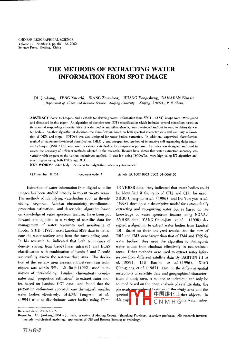 CHINESE GEOCRAPHICAL SCIENCEVolume 12. Nunber 1. pp. 68 - 72. 2002Srience Press. Beiing. ChinaTHE METHODS OF EXTRACTING WATERINFORMATION FROM SPOT IMAGEDU Jin-kang, FE.NG Xue-zhi,WANC Zhou-long,HUANG Yong-sheng, RAMADAN EInazir( Department of Uirban and Resoure Science, Nanjing Unirersity. Nanjing 210093, P. R China)ABSTRACT: Some lechniques and methods for deriving water information from SPOT - 4(XI) image were investigaltedand discused in this paper. An algorithm of deision-lree (DT) casication which includes several casifers based onthe spetral responding characteristics of water bodies and other a山j(luò)ects。was develuped and put forward to delineate WH-ter bodies. Another algorithm of decision-lree casfication based on both spectral etion of DEM and slope (DTDS) was also designed for water bodies extraction. In addition, supervised lasificationmethod of naximum-likelyhoud cassification (MLC), und unsuperised method of interactive sll-organizing dada analy-ais techniqpue (ISODATA ) were used lo extract walerbodies for cormnparison purpose. An indexs was designed and used toa5s15s the aceuracy of differenl methods adopted in the rcsearch. Results have shown that water extraction accuracy wasvuriable with respect to the various lechniques applicd. It was low using ISODATA, very high using DT algorithm andmueh higher using loth DTI)S and MLC.KEY WORDS: water lordy; decision tree algorithm; acuracy assesementCLC number: TP751. I .Document eode: A .Article ID: 1002-0063(2002)01-0068-05Extraction of water information from digital salelliteIB VHRSR dala, they indicated that waler bodies couldimages has been studied broadly in recent twenty years. be identified if the ratio of CH2 and CHI be used.The methods of identifying waterbodies such as thresh-ZHOU Cheng-hu et al. (1996) and Du Yun-yan et al.olding, segrent, I andsat chromaticity coordinates,(1998) developed a descriptive model for automaticallyproportion estimation. and descriptive algorihm based extracting and recugmizing water bodies based on theon knowledge of water spectrum feature, have been putknowledge of water spectrum feature using NOAA/forward and applied to a variety of satelite data for AVHRR data. YANC Chun-jian et al. (1998) de-managenent of water resources and monitoring of signed a algorithm to extract waler bodies from Landsatfloouls. SHIH (1985) used Landsat MSS data to delin~ TM. Based on their analyzed results that the sum ofeate the water surface area from the surounding land.TM2 and TM3 were larger than that of TM4 and TM5 forIn his research he indicated that both techniques ofwater bodies, they used the algorithm to distinguishdensity slicing from band7(near infrared) and ELAS waler bodies from shadows eelctively in mountainousclassification with combination of bands 5 and 7 could areas. Other methods were used to extract water infor-successfully assess the waler-surface area. The devia~ mation frum different salellite data By BARTON IJ eltion of the surface area assessment belween two tech-al. (1989),LIU Jian-bo et al. (1996),XIAOniques was within 3%. LU Jia-ju(1992) used tech- Qian-guang et al. (1987). Due to the different spatialniques of thresholding, Landsat chromaticity coordi-resolutions of satellite data and geographical character-nales and" proportion estimation" to extract water bod-isties of study area, a method or lechnique can only bees based on Landsat CCT data, and found that the adopled based on the deep analysis of salite data, theproportion estimation approach can distinguish smallerphysical-reosranhical fpatures of the study area and thewater bodies efectively. SHENG Yong-wei et al. spectral中國(guó)煤化工ther objects. In(1994) tried tw discriminate waler bodies using FY一this papHCNMHGingwalerinfrRerceived dale: 2001-11-15Biography: DU Jin-kang(1964-),male. a native of Muping County, Shandong Province, associate professor. His research interestsinclude hydrological modeling, application of GIS und Remote Sensing l0 bhydrology.The Methods of Extracting Wauter lnformation From Spot Images9mation from SPOT-4 data were investigated. An al- bodies effectively frorm image in mounlainous area, bothgorithm of decision-tree (DT) lasification with several information from infrared and visible bands could beclassifers based on spectral responding values was de- used lo identify the difference between waler bodies andsigned to derive waler infurmation. Another algorithm of shadows.decision-tree classification algorithm based on bothIn SPOT image of the study area. five typical landspectral responding values and auxiliary information of cover classes were determined and training samplingDEM and slope (DTDS) was developed. Supervised were taken to calculate means and standard deviations ofclassfication method of maximum- likelyood lasifica- their spectral responding values (Sld. Dev.) (Tabletion (MLC) and unsupervised classification method of 1), which are re-sampled DN values. The coincidentinteractive self-organizing dada analysis technique spectral plot (mean plus and minus two standard devi-(ISODATA) were also used to extract water informa- ations for the five types in each band) was drawn intion in the same area. The results and accuracy of the Fig. I. In this figure it was clear that the ranges ofmethods were compared and evaluated.spectral values of water and other objects were over-lapped in B1 and B2. In B3 the range of waler spectralI THE SPECTRAL RESPONDING CHARACTERIS-values also overlapped with that of shadows, but theyTICS OF WATER BODIES .were lower than that of other three classes and shadowshave litle overlapped area with plants. There was aThe Jiangning County of Jiangsu Province was se- clear distinction between the group of waler, shadowlected as study area and the SPOT-4 image( XI,and the remaining three classes in SWIR, but there is1999.1 ) with four bands of B1(0. 59-0.59μm),B2 still a big overlapping area between water and shadow.(0. 61 - 0. 68μm),B3(0. 78 -0.89μm),an