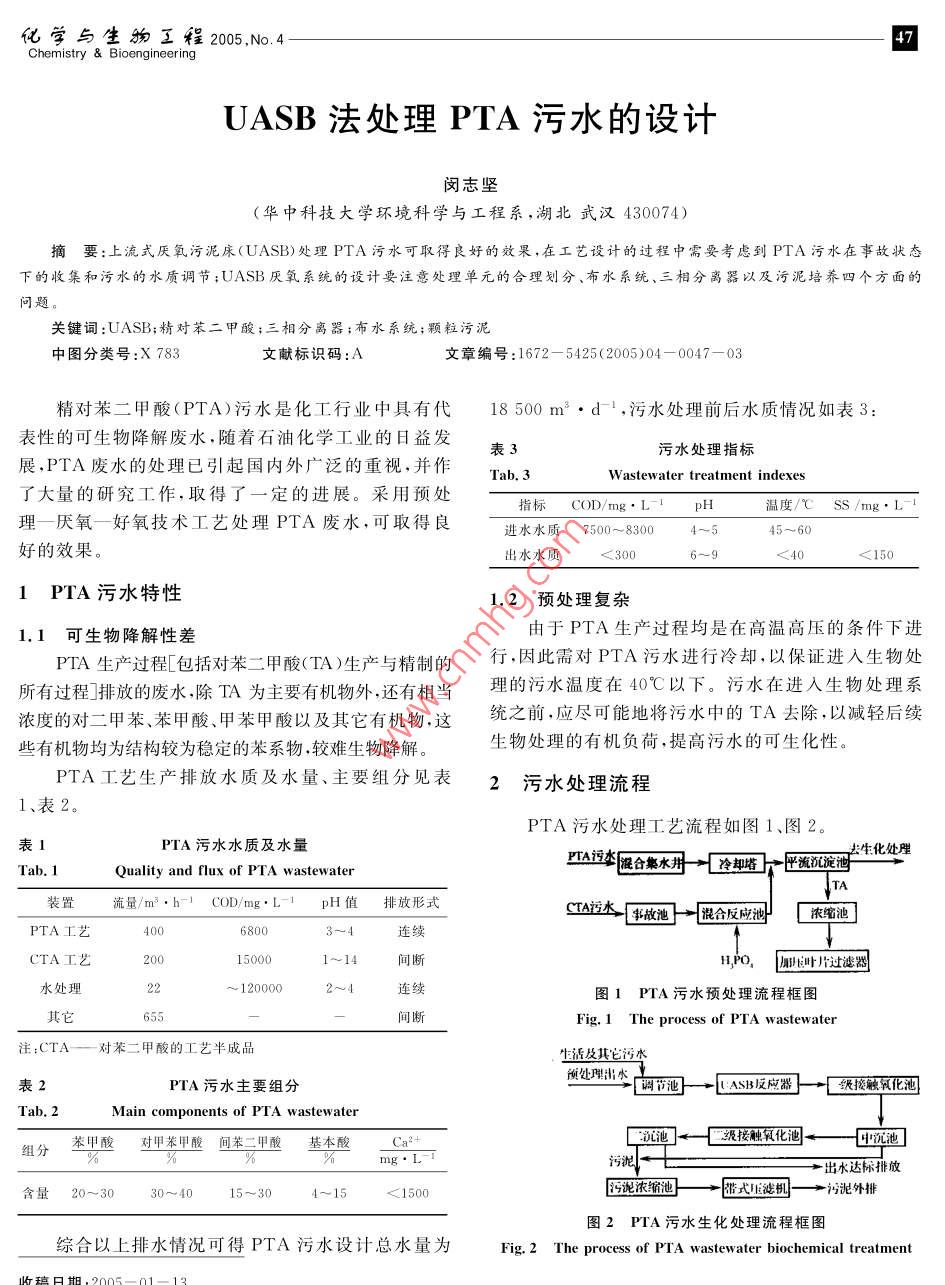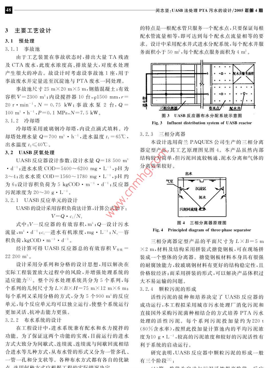 化學(xué)與生物工程2005,N。.4Chemistry BioengineeringUASB法處理PTA污水的設(shè)計閔志堅華中科技大學(xué)環(huán)境科學(xué)與工程系,湖北武漢430074)摘要:上流式厭氧污泥床(UASB)處理PTA污水可取得良好的效果,在工藝設(shè)計的過程中需要考慮到PTA污水在事故下的收集和污水的水質(zhì)調(diào)節(jié);UASB厭氧系統(tǒng)的設(shè)計要注意處理單元的合理劃分、布水系統(tǒng)、三相分離器以及污泥培養(yǎng)四個方面的問題。關(guān)鍵詞:UASB;精對苯二甲酸;三相分離器;布水系統(tǒng);顆粒污泥中圖分類號:X783文獻標識碼:A文章編號:1672-5425(2005)04-0047-03精對苯二甲酸(PTA)污水是化工行業(yè)中具有代18500m3·d,污水處理前后水質(zhì)情況如表3:表性的可生物降解廢水,隨著石油化學(xué)工業(yè)的日益發(fā)表3污水處理指標展,PTA廢水的處理已引起國內(nèi)外廣泛的重視,并作rab.3Wastewater treatment indexes了大量的研究工作,取得了一定的進展。采用預(yù)處指標COD/mg:L1pH溫度/℃Ss/mg:L理一厭氧一好氧技術(shù)工藝處理PTA廢水,可取得良進水水質(zhì)7500~83004-545-60好的效果出水水質(zhì)<300<40<150PTA污水特性1.2預(yù)處理復(fù)雜1.1可生物降解性差由于PTA生產(chǎn)過程均是在高溫高壓的條件下進PTA生產(chǎn)過程[包括對苯二甲酸(TA)生產(chǎn)與精制的行,因此需對PTA污水進行冷卻,以保證進入生物處所有過程排放的廢水除TA為主要有機物外,還有相當理的污水溫度在40℃以下。污水在進入生物處理系濃度的對二甲苯、苯甲酸、甲苯甲酸以及其它有機物,這統(tǒng)之前,應(yīng)盡可能地將污水中的TA去除,以減輕后續(xù)些有機物均為結(jié)構(gòu)較為穩(wěn)定的苯系物,較難生物降解生物處理的有機負荷,提高污水的可生化性。1,表2。下藝生產(chǎn)排放水質(zhì)及水量、主要組分見表2污水處理流程PTA污水處理工藝流程如圖1、圖2。表1PTA污水水質(zhì)及水量生化處理Tab. 1Quality and flux of PTA wastewater四合熟水一[冷卻]匣沉母裝置流量/m3·h-1COD/mg·L-1pH值排放形式cTA[故池一[合反應(yīng)[濃縮池PTA工藝連續(xù)CTA工藝2001~Hpo.[時片過濾圈水處理~120000圖1PTA污水預(yù)處理流程框圖其它Fig. 1 The process of Pta wastewater注CTA—對苯二甲酸的工藝半成品預(yù)處理出水表2PTA污水主要組分[一區(qū)AH反應(yīng)器一[疑化涸Tab. 2Main components of PTA wastewater組分苯甲酸對甲苯甲酸間苯二甲酸基本酸Ca'迆]←匚授融觸氧化迴沉池]出水達標排放含量20~3030~4015~304~15<1500匹泥濃縮池帶式濾機與泥外排圖2rTA污水生化處理流程框圖綜合以上排水情況可得PTA污水設(shè)計總水量為Fig. 2 The process of PTA wastewater biochemical treatment閔志堅:UASB法處理PTA污水的設(shè)計/2005正第4期3主要工藝設(shè)計的特點是一根配水管只服務(wù)一個配水點,只要保證每根配水管流量相等,即可達到每個配水點流量相等的要3.1預(yù)處理求。設(shè)計中采用配水井式進水分配系統(tǒng),每個配水井服3.1.1事故池務(wù)面積小于50m2,每個配水點服務(wù)面積為4m2。由于工藝裝置在事故狀態(tài)時,排出大量TA殘渣及CTA廢水,此廢水濃度高、排放量大,對廢水處理產(chǎn)生很大的沖擊。故設(shè)計時考慮設(shè)事故池1座,用于··配水并服務(wù)面事故廢水并定量送至沉淀池與PTA廢水一同處理事故池尺寸25m×20m×5m,鋼筋混凝土;有效容積V=2300m3;內(nèi)設(shè)攪拌器10臺,g1500mm,r=20r·min1,N=0.75kW;事故水泵2臺,Q=三相分離器100m3·h1,P=0.1MPa,N=7.5kW圖3UASB反應(yīng)器布水分配系統(tǒng)示意圖3.1.2冷卻塔Fig 3 Influent distribution system of UASB reactor冷卻塔采用玻璃鋼冷卻塔,內(nèi)設(shè)點滴式填料。冷卻塔處理水量Q=700m3·h,進水溫度t1=65℃3.2.3三相分離器出水溫度t2≤40℃。本設(shè)計選用荷蘭 PAQUES公司生產(chǎn)的三相分離3.2UASB厭氧處理器定型產(chǎn)品,其工藝原理圖見圖4。本產(chǎn)品雖然內(nèi)部UASB反應(yīng)器設(shè)計參數(shù):設(shè)計水量Q=18500結(jié)構(gòu)較為簡單,但污泥回流較暢通、泥水分離和氣體的d;進水水質(zhì)COD=5400~6200mg·1-1,pH為分離效果較好。3~4;出水水質(zhì)COD=1560~1780ng·L,pH約出水為6;設(shè)計容積負荷為5 kgCOD·m-3:d;反應(yīng)器氣室污泥濃度為20~30g·L-1。3.2.1UASB反應(yīng)單元的設(shè)計UASB的設(shè)計采用容積負荷法計算,計算公式如下:污泥網(wǎng)流縫V=Q·c;/N式中:V一反應(yīng)器的有效容積,m3;Q設(shè)計污水圖4三相分離器原理圖流量,m3·d1;c;一進水有機濃度,mg·L1;N,容incipled diagram of three-phase separator積負荷, kcAl·m-3·d三相分離器定型產(chǎn)品的平面尺寸為LXB=5m經(jīng)計算可得UASB反應(yīng)器總的有效容積V效×2m,材料及結(jié)構(gòu)采用拼裝式搪瓷鋼板,可在現(xiàn)場拼22200m3。裝成一個整體的分離器。搪瓷鋼板材料本身具有很強設(shè)計采用分系列和分格的設(shè)計思想,用以解決在的耐腐蝕能力,較玻璃鋼材料有更好的結(jié)構(gòu)穩(wěn)定性,且實際工程裝置放大過程中的風(fēng)險,并增強處理系統(tǒng)的價格較經(jīng)濟;而采用拼裝的形式,可以解決產(chǎn)品體積過適應(yīng)能力。整個污水處理系統(tǒng)共分為5個系列,每大不易運輸?shù)膯栴}。個系列的幾何尺寸為L×B×H=75m×12m×6m;3.2.4顆粒污泥的形成每個系列又采用分格的方式,分為5個900m3的反應(yīng)活性污泥的接種和培養(yǎng)決定了UASB反應(yīng)器的單元,每個反應(yīng)