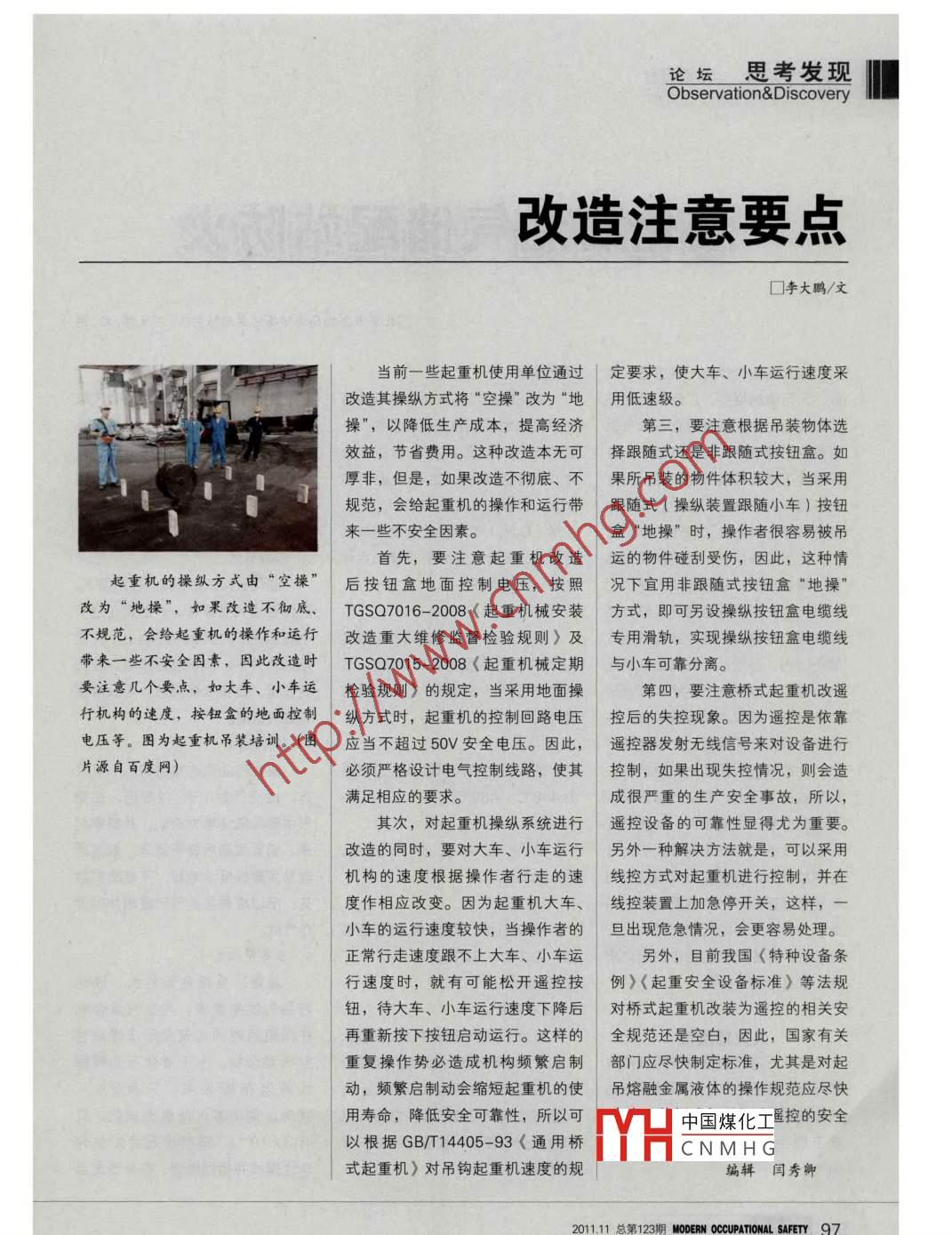 論壇思考發(fā)現(xiàn)Observation Discover改造注意要點(diǎn)□李大鵬/文當(dāng)前一些起重機(jī)使用單位通過(guò)定要求,使大車、小車運(yùn)行速度采改造其操縱方式將“空操”改為“地用低速級(jí)。操”,以降低生產(chǎn)成本,提高經(jīng)濟(jì)第三,要注意根據(jù)吊裝物體選效益,節(jié)省費(fèi)用。這種改造本無(wú)可擇跟隨式還是非跟隨式按鈕盒。如厚非,但是,如果改造不徹底、不果所吊裝的物件體積較大,當(dāng)采用規(guī)范,會(huì)給起重機(jī)的操作和運(yùn)行帶跟隨式(操縱裝置跟隨小車)按鈕來(lái)一些不安全因素。盒“地操”時(shí),操作者很容易被吊首先,要注意起重機(jī)改造運(yùn)的物件碰刮受傷,因此,這種情起重機(jī)的操縱方式由“空操”后按鈕盒地面控制電壓,按照況下宜用非跟隨式按鈕盒“地操”改為“地操”,如果改造不徹底、TGsQ7016-2008〈起重機(jī)械安裝方式,即可另設(shè)操縱按鈕盒電纜線不規(guī)范,會(huì)給起重機(jī)的操作和運(yùn)行改造重大維修監(jiān)督檢驗(yàn)規(guī)則》及專用滑軌,實(shí)現(xiàn)操縱按鈕盒電纜線帶來(lái)一些不安全因素,因此改造時(shí)TGs7015-2008(起重機(jī)械定期與小車可靠分離。要注意幾個(gè)要點(diǎn),如大車、小車運(yùn)檢驗(yàn)規(guī)則)的規(guī)定,當(dāng)采用地面操第四,要注意橋式起重機(jī)改遙行機(jī)構(gòu)的速度,按鈕盒的地面拉制縱方式時(shí),起重機(jī)的控制回路電壓控后的失控現(xiàn)象。因?yàn)檫b控是依靠電壓等。圖為起重機(jī)吊裝培訓(xùn)。(圖應(yīng)當(dāng)不超過(guò)50V安全電壓。因此,遙控器發(fā)射無(wú)線信號(hào)來(lái)對(duì)設(shè)備進(jìn)行片源自百度網(wǎng))必須嚴(yán)格設(shè)計(jì)電氣控制線路,使其控制,如果出現(xiàn)失控情況,則會(huì)造滿足相應(yīng)的要求。成很嚴(yán)重的生產(chǎn)安全事故,所以其次,對(duì)起重機(jī)操縱系統(tǒng)進(jìn)行遙控設(shè)備的可靠性顯得尤為重要。改造的同時(shí),要對(duì)大車、小車運(yùn)行另外一種解決方法就是,可以采用機(jī)構(gòu)的速度根據(jù)操作者行走的速線控方式對(duì)起重機(jī)進(jìn)行控制,并在度作相應(yīng)改變。因?yàn)槠鹬貦C(jī)大車、線控裝置上加急停開關(guān),這樣,一小車的運(yùn)行速度較快,當(dāng)操作者的旦出現(xiàn)危急情況,會(huì)更容易處理。正常行走速度跟不上大車、小車運(yùn)另外,目前我國(guó)《特種設(shè)備條行速度時(shí),就有可能松開遙控按例)(起重安全設(shè)備標(biāo)準(zhǔn))等法規(guī)鈕,待大車、小車運(yùn)行速度下降后對(duì)橋式起重機(jī)改裝為遙控的相關(guān)安再重新按下按鈕啟動(dòng)運(yùn)行。這樣的全規(guī)范還是空白,因此,國(guó)家有關(guān)重復(fù)操作勢(shì)必造成機(jī)構(gòu)頻繁啟制部門應(yīng)盡快制定標(biāo)準(zhǔn),尤其是對(duì)起動(dòng),頻繁啟制動(dòng)會(huì)縮短起重機(jī)的使吊熔融金屬液體的操作規(guī)范應(yīng)盡快用壽命,降低安全可靠性,所以可以根據(jù)GB/T14405-93〈通用橋Is中國(guó)煤化工睡控的安全CNMHG式起重機(jī)》對(duì)吊鉤起重機(jī)速度的規(guī)編輯閆秀卿20111總第123期 MODERN OCCUPATIONAL SAFETY97