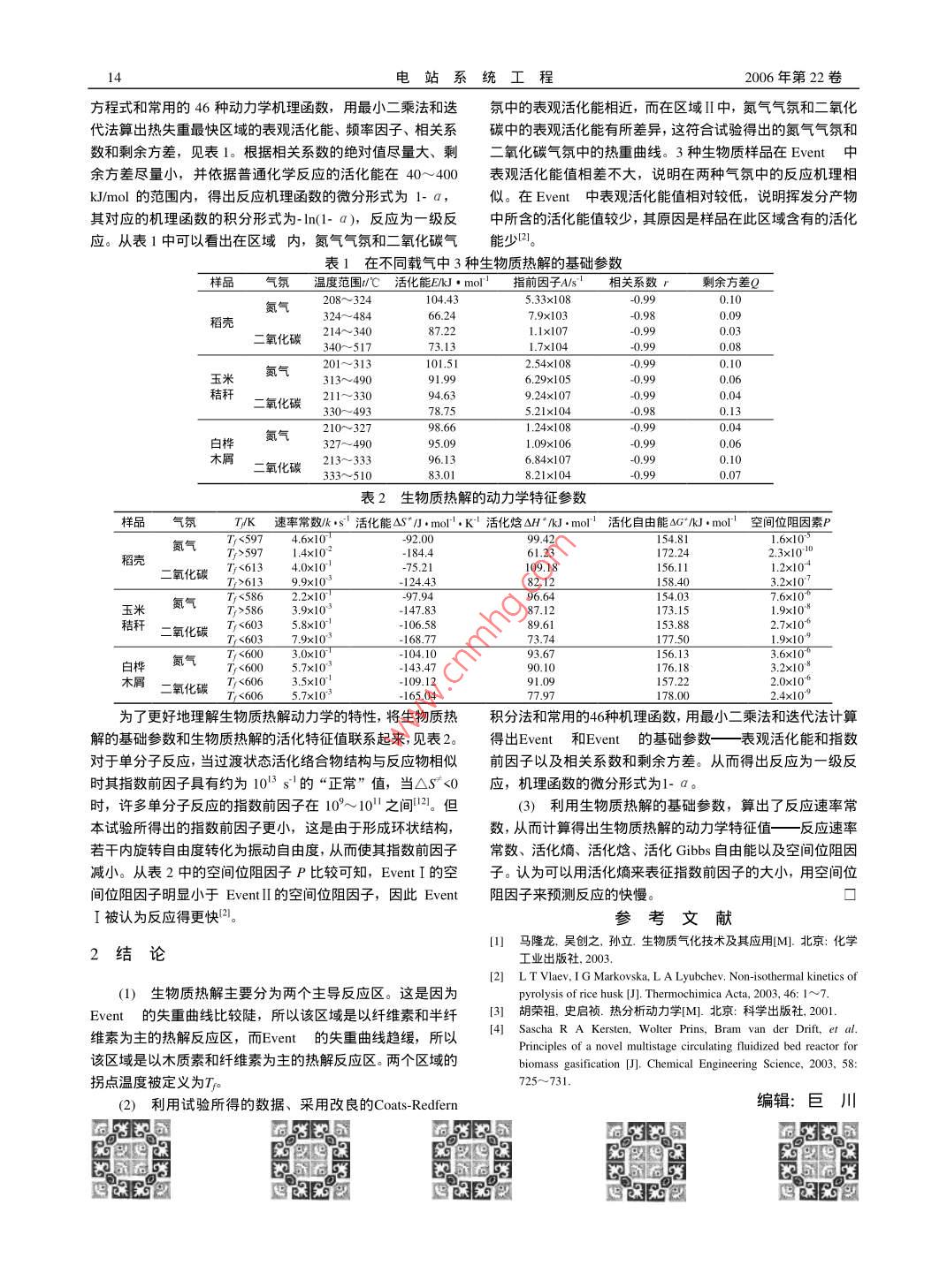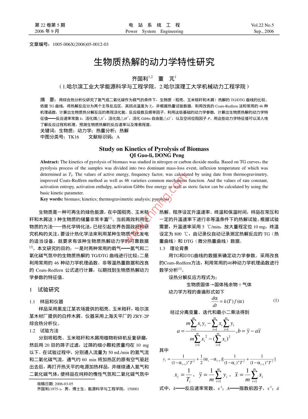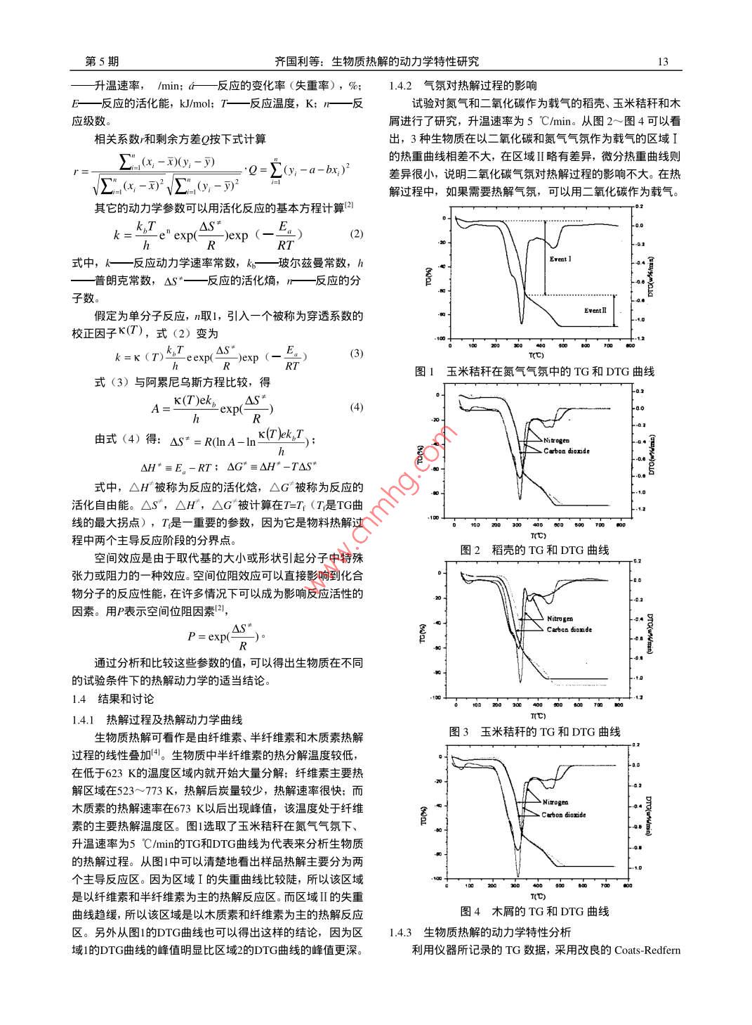 第22卷第5期電站系統(tǒng)工程2006年9月wer System EngineeringSep.2006文章編號(hào):1005-006X(200605-0012-03生物質(zhì)熱解的動(dòng)力學(xué)特性研究齊國(guó)利2董芃(1哈爾濱工業(yè)大學(xué)能源科學(xué)與工程學(xué)院,2.哈爾濱理工大學(xué)機(jī)械動(dòng)力工程學(xué)院)摘要:用綜合熱分析儀研究了氮?dú)饣蚨趸甲鳛檩d氣的條件下,生物質(zhì)(稻殼、玉米秸稈和木屑)熱解的 TG/DTG曲線的比較。依據(jù)TG曲線,將熱解反應(yīng)分為兩個(gè)主導(dǎo)反應(yīng)區(qū),其拐點(diǎn)溫度為T,并根據(jù)熱重試驗(yàn)數(shù)據(jù),利用改良的 Coats-Redferr法和常用的46種機(jī)理函數(shù),計(jì)算岀生物質(zhì)熱分解反應(yīng)的表觀活化能、反應(yīng)級(jí)數(shù)及頻率因子。利用這些基礎(chǔ)的動(dòng)力學(xué)參數(shù),計(jì)算出生物質(zhì)熱解的動(dòng)力學(xué)特征值—一反應(yīng)速率常數(shù)k,活化熵△S,活化焓△H,活化Gibs自由能△G,以及空間位阻因子P。用這些動(dòng)力學(xué)特征值可以深入地了解反應(yīng)過(guò)程和機(jī)理,預(yù)測(cè)生物質(zhì)熱解的反應(yīng)速率以及難易程度關(guān)鍵詞:生物質(zhì);動(dòng)力學(xué);熱重分析;熱解中圖分類號(hào):TK16文獻(xiàn)標(biāo)識(shí)碼:AStudy on Kinetics of Pyrolysis of BiomassQI Guo-li, DONG PengAbstract: The kinetics of pyrolysis of biomass was studied in nitrogen or carbon dioxide media. Based on TG curves, thepyrolysis process of the samples was divided into two dominant mass-loss event, inflexion temperature of which wasdetermined as T. The values of active energy, frequency factor, was calculated by using date from thermogravimetry,improved Coats-Redfern method as well as 46 varieties common mechanism function. And the values of rate constant.activation entropy, activation enthalpy, activation Gibbs free energy as well as steric factor can be calculated by using thebasic kinetic parameterKey words: biomass; kinetics; thermogravimetric analysis; pyrolysis生物質(zhì)是一種可再生的綠色能源,在中國(guó)稻殼、玉米秸熱解。程序設(shè)定升溫速率、終溫和保溫時(shí)間,樣品在常壓和稈和木屑這3種生物質(zhì)的儲(chǔ)量非常豐富。當(dāng)前高效利用生定的升溫速率下進(jìn)行非等溫條件下的熱解試驗(yàn)。根據(jù)試驗(yàn)物質(zhì)的方法熱化學(xué)轉(zhuǎn)化法,已經(jīng)引起世界各國(guó)政府和研需要,升溫速率采用5℃/min,放大量程定位10mg,終溫究機(jī)構(gòu)的關(guān)注。要設(shè)計(jì)熱化學(xué)法來(lái)利用某種生物質(zhì)氣化發(fā)電設(shè)定為800℃,由記錄儀自動(dòng)記錄測(cè)定熱解反應(yīng)的TG(熱的適當(dāng)設(shè)備,就要求有該種生物質(zhì)熱解動(dòng)力學(xué)的可靠數(shù)據(jù)重曲線)和DTG(微分熱重曲線)數(shù)據(jù)。本文研究的目的:一是對(duì)兩種常用的載氣一一氮?dú)夂投?.3理論背景氧化碳?xì)夥罩械纳镔|(zhì)熱解的TG/DTG曲線進(jìn)行比較;二是用TG和DTG曲線的數(shù)據(jù)來(lái)確定動(dòng)力學(xué)參數(shù)。采用改良利用常用的46種動(dòng)力學(xué)機(jī)理函數(shù)、非等溫?zé)嶂財(cái)?shù)據(jù)和改良的 Coats -Redfern方法,利用常用的46種動(dòng)力學(xué)機(jī)理函數(shù)進(jìn)行的 Coats-Redfern公式進(jìn)行計(jì)算,以期找到生物質(zhì)熱解動(dòng)力數(shù)學(xué)分析B。學(xué)參數(shù)的特征值設(shè)熱分解反應(yīng)方程式為生物質(zhì)固體→固體殘余物+氣體1試驗(yàn)研究動(dòng)力學(xué)方程的普遍形式如下1.1樣品和儀器=k()f()(1)樣品采用黑龍江某農(nóng)場(chǎng)提供的稻殼、玉米秸稈,哈爾濱經(jīng)過(guò)分離變量、迭代和最小二乘法得到某木材廠提供的白樺木屑。儀器采用上海天平廠的ZRY2P綜合熱分析儀。m∑xy-∑x∑12試驗(yàn)方法-,b=y-ar分別將稻殼、玉米秸稈和木屑用植物粉碎機(jī)反復(fù)研磨,∑x2-②∑x然后用20目的篩子過(guò)濾,過(guò)篩的細(xì)小顆粒質(zhì)量均在10mg其中以下。在試驗(yàn)過(guò)程中,分別通入流量為50mL/min的氮?dú)饬骱投趸細(xì)饬?通氣約60min將加熱區(qū)的原有空氣驅(qū)趕(1-x-1)(1-ax)"72(1-∝11)"T2出去后,再打開熱天平的電源加熱樣品,并繼續(xù)通入氮?dú)夂投趸細(xì)怏w,使樣品在純粹的惰性氣氛和二氧化碳?xì)夥罩衴i∑x齊國(guó)利(1975-),男,博士生。能源科學(xué)與工程學(xué)院,150001式中,k—反應(yīng)速率常數(shù),s2;A—指數(shù)前因子,sl;a第5期齊國(guó)利等:生物質(zhì)熱解的動(dòng)力學(xué)特性研究13——升溫速率,/min;a反應(yīng)的變化率(失重率),%;1.4.2氣氛對(duì)熱解過(guò)程的影響E——反應(yīng)的活化能,kJ/mol;T—反應(yīng)溫度,K;n一反試驗(yàn)對(duì)氮?dú)夂投趸甲鳛檩d氣的稻殼、玉米秸稈和木應(yīng)級(jí)數(shù)。屑進(jìn)行了研究,升溫速率為5℃/min。從圖2~圖4可以看相關(guān)系數(shù)和剩余方差Q按下式計(jì)算出,3種生物質(zhì)在以二氧化碳和氮?dú)鈿夥兆鳛檩d氣的區(qū)域I(x2-x)(y2的熱重曲線相差不大,在區(qū)域Ⅱ略有差異,微分熱重曲線則Q=∑(y,-a-bx)2差異很小,說(shuō)明二氧化碳?xì)夥諏?duì)熱解過(guò)程的影響不大。在熱解過(guò)程中,如果需要熱解氣氛,可以用二氧化碳作為載氣其它的動(dòng)力學(xué)參數(shù)可以用活化反應(yīng)的基本方程計(jì)算k Te"exp()expERT式中反應(yīng)動(dòng)力學(xué)速率常數(shù),k—破爾茲曼常數(shù),h