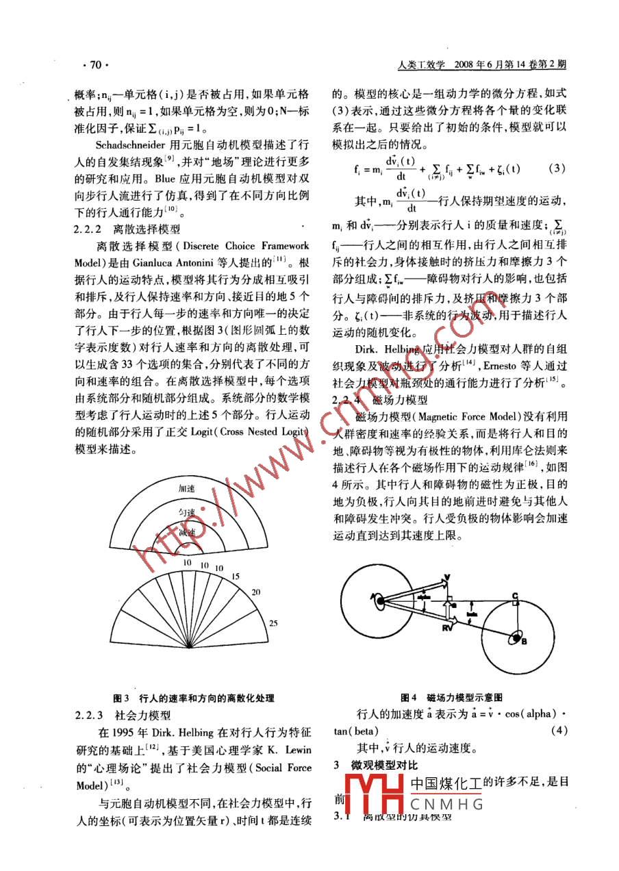 人類工效學2008年6月第14卷第2期文章編號:1006-8309(2008)02006805行人動力學的研究進展龔曉嵐,魏中華(北京工業(yè)大學北京市交通工程重點實驗室,北京10002)摘要:行人動力學的研究對設計和優(yōu)化步行交通設施提高人群的疏散效率有著重要的意義。文章對國內(nèi)外行人動力學的研究現(xiàn)狀進行了綜述,對比了宏觀與微觀兩種行人動力學描述方法,并對不同類型的微觀模型進行了比較。最后對行人動力學研究的發(fā)展趨勢進行了展望。關鍵詞:行人動力學;宏觀模型;微觀模型中圖分類號:X928;U49文獻標識碼:A引言2國外的研究狀況近年來,隨著經(jīng)濟和文化的發(fā)展,人群聚集活2.1宏觀模型動越來越多地出現(xiàn)在各種公共場所。據(jù)不完全統(tǒng)從20世紀80年代起,越來越多的研究者致計,全世界每年都有數(shù)千人在聚集活動時發(fā)生的力于行人動力學的理論研究。通過觀測對行人運突發(fā)事件中喪生。因此,聚集人群的安仝問題備動的規(guī)律和特性進行分析,提出了很多理論模型。受關注。在早期的數(shù)學模型中,以描述行人運動的宏觀模人群聚集的風險是由多種因素共冋組成的,型為主,有排隊模型、轉換矩陣模型、隨機模型涉及到場所類型、空間結構、組織管理人群類型、等23。在宏觀模型中,人群被視為一個整體,其人群運動特征、安全措施等各方面。其中,人群在運動被視為類似于氣體或液體的流動,很多研究場所中的行為特征是影響人群聚集風險的重要因者提出了不同的行人流量-密度-速度關系,素。人在公共場所中的行為受到社會、道德、法如圖1所示律、環(huán)境、習慣、身體狀況、心理、教育、文化、性格在許多的研究中,都用線性關系來描述速度等各種因素的影響既具有某種規(guī)律性、又帶有很與密度的關系, AlGadhi等人基于人群運動的速度大的不確定性。行人動力學是研究正常及緊急情密度線性關系用動態(tài)的方法描述了行人流的速況下,公共場所中行人運動特征及人群管理的科度變化2,如式(1)所示:學,研究成果可以為設計和優(yōu)化步行設施,提高空u,.;=u1-△tT[u向的使用效率,提高突發(fā)事件中人群的疏散效率式中,u一行人的速度,t一時刻,T—反應時及開發(fā)計算機行人仿真軟作提供依據(jù),為大型人間,△t時間步長,u(k1,k2)一相向運動的兩隊群聚集活動中的人群管理和人群疏散提供理論指人流的相對速度。該模型成功地描述了麥加朝圣活動中行人的早在上個世紀30年代國外就出現(xiàn)了研究行雙向運動狀況人交通流的組織機構1。到上世紀80年代行人行人運動的氣態(tài)動力學方程與粒子守恒Bo動力學的理論研究成果越發(fā)豐富,對行人動運的 Itzmann方程非常相似,但它還考慮了行人的目的描述開始從宏觀模型轉向了微觀模型,建立了一和行人間的相互影響。R.L. Hughes采用連續(xù)介些有代表性的微觀模型。而在我國,行人動力學質(zhì)理論研究大量人群的運動特征,并根據(jù) Navier的研究還處于起步階段Stokes方程進一步推導出行人流動的控制方基金項目:家科技支撐計劃課題(2006BAC01A01-3)中國煤化工作者簡介:龔曉嵐(1979-),女,貴州畢節(jié)人,博士研究生CNMH話)010-6379690(電子信箱)starrygong@emails.bjut.edu.cn人類工效學208年6月第14卷第2期觀模型的研究引起了廣泛的關注,其中有代表性的微觀模型有:元胞自動機模型、離散選擇模型、社會力模型和磁場力模型。2.2.1元胞自動機模型元胞自動機模型( Cellular Automata model)是空間與時間都離散物理參量只取有限數(shù)值集的物理系統(tǒng)的理想化模型6。元胞自動機演化規(guī)則是局部的,對指定單元格的狀態(tài)進行更新時,只需知道其鄰近的單元格的狀態(tài)。圖2所示為二維元胞自動機常見的兩種方格單元組成,其中的每個單元格有兩種狀態(tài):為空或被占用。在每個時密度(P/m)間步長上,根據(jù)行人在上一個時間步長的狀態(tài)及與其鄰近單元格的狀態(tài)對行人的位置進行更新。建立行人轉移到其某個鄰域或保留在原單元格的概率模型,再通過蒙特卡羅法確定毎個行人的行為密度(P/m)圖2兩種典型的運動質(zhì)點元胞自動機模型是目前行人動力學研究中的熱點,有很多研究者相繼對這種建模方法及其應用都進行了研究。 KeBel的模型只考慮了最短路徑方向?qū)π腥说挠绊?以偏向強度E(0≤E≤1)描述行人對指向其目的地方向的選擇權重,從而構造轉移概率方程。在 Schadschneider的模型000.51.0L.520流量Pmx中,引入了地場的概念。地場分為靜態(tài)和動態(tài)兩種。動態(tài)的地場D是行人行走后留下的虛擬的軌跡。用動態(tài)地場表示人群中行人的相互吸引WeidmannSarkar作用,如果有多個行人在一個單元格上通過,則該Tanariboon圖1不同的流量-密度一速度關系單元格的動態(tài)地場就會增大,在一定時間內(nèi)動態(tài)但是,由于行人個體間的相互作用如躲避碰地場會逐漸消散;而靜態(tài)的地場S是不隨時間的撞和控制速度的變化等,人群是不遵守動量守恒變化而改變的也不會因為行人的通行而變化,它和能量守恒的,而且在空間中行人也不會像流體用于描述一些有比較有吸引力的設施如緊急出那樣均勻分布因此人群運動的很多特點是不能口目的地等。同時,行人間的相互排斥勢能儲用流體描述的。然而宏觀模型卻忽略了上述行人在整體的靜態(tài)地場中通過靜