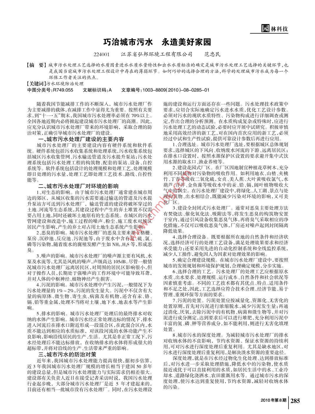 園林科技巧治城市污水永 造美好家園224001江蘇省弘邦環(huán)境工程有限公司范忠民[摘要] 城市污水處理工藝選擇的水質(zhì)因素進(jìn)水水質(zhì)水量特性和出水水質(zhì)標(biāo)準(zhǔn)的確定是城市污水處理工藝選擇的關(guān)鍵環(huán)節(jié),也是我國(guó)當(dāng)前城市污水處理工程設(shè)計(jì)中存在的薄弱環(huán)節(jié)。如何巧妙的選擇合理的方法,科學(xué)的處理城市污水成為每一個(gè)環(huán)保工作者關(guān)注的熱點(diǎn)。[關(guān)鍵詞]污水環(huán)境防治處理中圖分類號(hào):R749.055文獻(xiàn)標(biāo)識(shí)碼:A文 章編號(hào): 1003- -8809( 2010)-08- -0285 -01隨著我國(guó)節(jié)能減排工作的不斷深入,城市污水處理廠作施的建設(shè)和運(yùn)行方面還存在一- 些問(wèn)題。污水處理技術(shù)政策中為主要減排的載體,在減排工作中顯得尤為重要。按照有關(guān)要要求,應(yīng)切合實(shí)際地確定污水進(jìn)水水質(zhì),優(yōu)化工藝設(shè)計(jì)參數(shù)。求,到“十一五”期末,我國(guó)城市污水處理率必須在70%以上。必須對(duì)污水的現(xiàn)狀水質(zhì)特性、污染物構(gòu)成進(jìn)行詳細(xì)調(diào)查或測(cè)全國(guó)各地近期內(nèi)必將掀起建設(shè)城市污水處理廠的高潮。因此,定,作出合理的分析預(yù)測(cè)。在水質(zhì)構(gòu)成復(fù)雜或特殊時(shí),應(yīng)進(jìn)行應(yīng)充分認(rèn)識(shí)城市污水處理廠帶來(lái)的環(huán)境影響,采取合理的防污水處理工藝的動(dòng)態(tài)試驗(yàn),必要時(shí)應(yīng)開(kāi)展中試研究。積極審慎治對(duì)策,正確引導(dǎo)城市污水處理廠的建設(shè)。地采用高效經(jīng)濟(jì)的新工藝,對(duì)在國(guó)內(nèi)首次應(yīng)用的新工藝,必須一、城市污水處理廠建設(shè)的主要內(nèi)容經(jīng)過(guò)中試和生產(chǎn)性試驗(yàn),提供可靠設(shè)計(jì)參數(shù)后再進(jìn)行應(yīng)用。城市污水處理廠的主要建設(shè)內(nèi)容有硬件系統(tǒng)和軟件系1、合理選址。城市污水處理廠選址,要根據(jù)城區(qū)總體規(guī)劃統(tǒng)。硬件系統(tǒng)包括污水收集系統(tǒng)和處理系統(tǒng),污水收集系統(tǒng)包要求,選擇城區(qū)的下風(fēng)向、收納廢水河流的下游、遠(yuǎn)離居民區(qū);括城區(qū)污水收集管網(wǎng)、污水輸送管道及污水提升泵站;污水處在排水口設(shè)置時(shí),按照水源保護(hù)區(qū)設(shè)置的要求避開(kāi)集中式飲用水源的取水口、漁業(yè)養(yǎng)殖等。系統(tǒng)等。軟件系統(tǒng)包括設(shè)計(jì)的處理規(guī)模和處理工藝,處理規(guī)模2、建設(shè)花園式廠區(qū)。在廠區(qū)因地制宜種植花草樹(shù)木,充分即日處理的污水量,處理工藝即處理工藝技術(shù)、路線、自控性利用不同植物對(duì)污染物的吸收作用。如利用地衣、山楂、夾桃能等竹、丁青等吸收二氧化硫,女貞、美人蕉、大葉黃吸收氯氣,水二、城市污水處理廠對(duì)環(huán)境的影響葫蘆、浮萍、金魚藻等吸收水中的汞、鉛、鎘,闊葉植物吸收大1、對(duì)生態(tài)的影響。由于城市污水處理r通常建在城市周氣中的飄塵。在污水處理廠建設(shè)中,將綠化、人工湖、景點(diǎn)與處邊的郊區(qū),從城區(qū)收集的污水需要通過(guò)輸送的管道及污水提理構(gòu)筑物、出水相結(jié)合,既能減少污染對(duì)環(huán)境的影響,又可美升泵站方可送到污水處理廠,輸送管道的建設(shè)將破壞穿過(guò)的化廠區(qū)土地、河流等生態(tài)系統(tǒng),其建設(shè)過(guò)程中產(chǎn)生的棄土堆置不僅需3建設(shè)全封閉式污水處理廠。通常對(duì)惡臭主要處理方法要占用土地,同時(shí)還破壞土地原有的生態(tài)系統(tǒng)。在城區(qū)的污水有焚燒法、催化氧化法、吸附法等,將發(fā)生惡臭的構(gòu)筑物安置管網(wǎng)建設(shè)和改造中,施工過(guò)程的噪聲、粉塵、施工廢水對(duì)城區(qū)于室內(nèi),通過(guò)引風(fēng)設(shè)備收集惡臭氣體,再將臭氣采取相應(yīng)的凈居民產(chǎn)生影響,產(chǎn)生的棄土對(duì)占用土地生態(tài)系統(tǒng)產(chǎn)生影響?;?不僅可以吸收惡臭氣體,廠房還對(duì)噪聲起到封閉隔離2惡臭的影響。城市污水處理廠的惡臭主要來(lái)源于格柵、降低效果泵房、沉砂池、反應(yīng)池、污泥池等,由于廢水中含有氮、硫、氯、4、選擇合理設(shè)備。既要根據(jù)所在地的自然條件和經(jīng)濟(jì)狀磷等污染物,隨著廢水的腐殖發(fā)酵產(chǎn)生如NH,H2S等,形成惡況,選擇經(jīng)濟(jì)可行的處理工藝設(shè)備,滿足處理效果要求和經(jīng)濟(jì)承受能力;還要采用先進(jìn)的自動(dòng)化控制系統(tǒng)和全線監(jiān)控系統(tǒng),臭。3噪聲的影響。城市污水處理廠的噪聲源主要有風(fēng)機(jī)水減少人工操作.避免因人為因素對(duì)處理效果的影響。泵及水流等,尤其是風(fēng)機(jī)的噪聲,聲級(jí)高達(dá)105dB。盡管-般情5、確定合理建設(shè)規(guī)模。在城市污水處理廠建設(shè)中,要按照況城市污水處理廠遠(yuǎn)離居民區(qū),對(duì)周圍的居民區(qū)影響很小,但城市的發(fā)展規(guī)劃和環(huán)境保護(hù)規(guī)劃,合理確定規(guī)模,分步實(shí)施對(duì)于操作人員,長(zhǎng)期處于強(qiáng)噪聲的工作環(huán)境中可能導(dǎo)致耳聾,6、選擇合理的工藝。污水