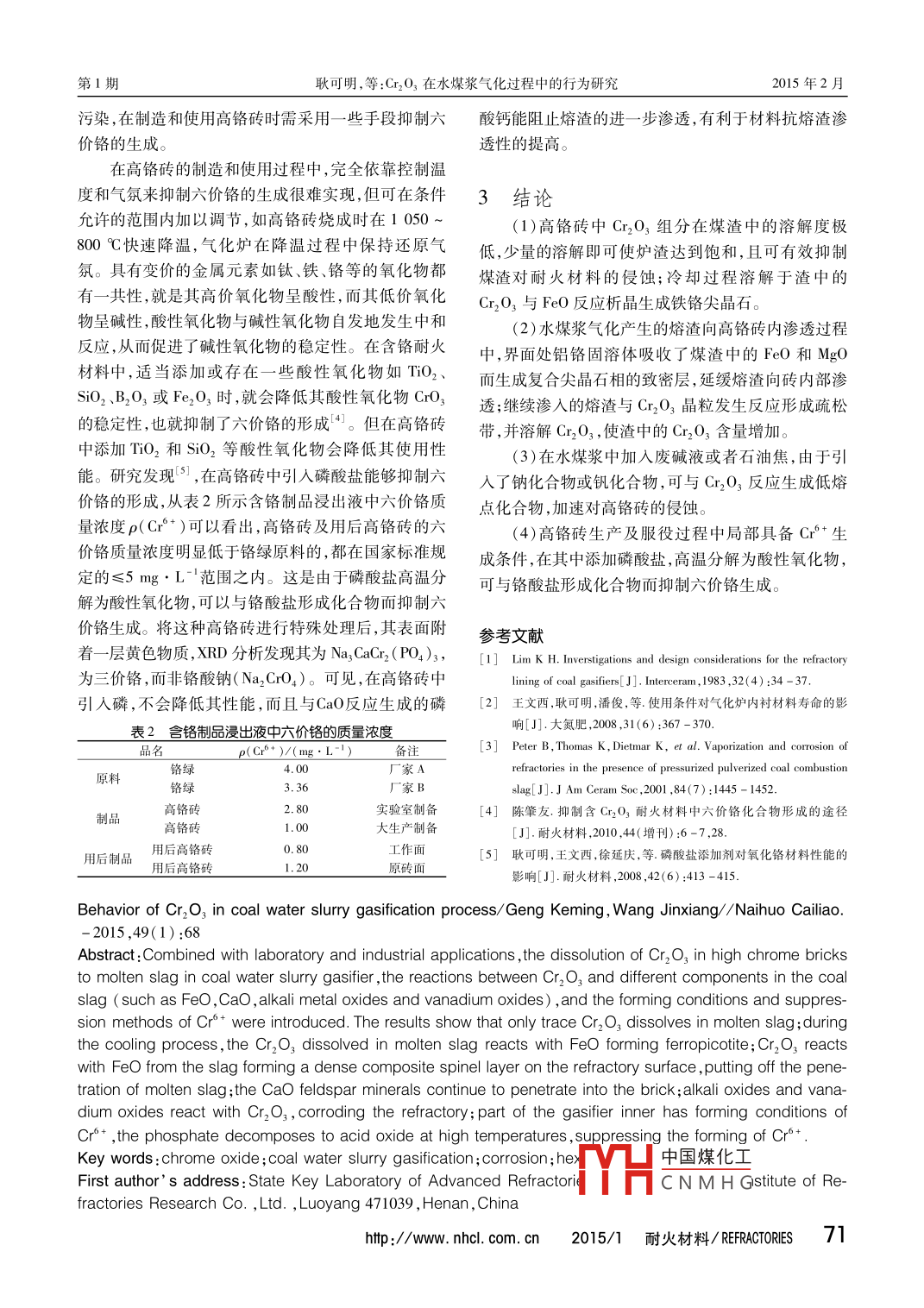 2015年2月68~71第49卷第1期CnO3在水煤漿氣化過(guò)程中的行為耿可明王金相中鋼集因洛陽(yáng)耐火材料研究院有限公司先進(jìn)耐火材料囯家重點(diǎn)實(shí)驗(yàn)室河南洛陽(yáng)471039摘要:結(jié)合實(shí)驗(yàn)室和工業(yè)應(yīng)用,闡述了高鉻磚在水煤漿氣化爐內(nèi)服役過(guò)程中Cr2O3在熔渣中的溶解,Cr2O3與煤渣中不同組分FeO、CaO、堿金屬氧化物、釩氧化物之間的反應(yīng),以及六價(jià)鉻的生成條件和抑制方法。指出:高鉻磚中只有微量〔rO3溶解于熔渣中,高溫下溶解于渣中的Cr2O3在冷卻過(guò)程中與FeO反應(yīng)析晶生成鐵鉻尖晶石;材料中的rO3與熔渣中FeO于耐火材料表面層反應(yīng)生成復(fù)合尖晶石相致密層,延緩熔渣向磚內(nèi)部的滲透,而以CaO為主長(zhǎng)石類化合物繼續(xù)向磚內(nèi)滲透,堿金屬氧化物和釩氧化物與Cr2O3反應(yīng),造成侵蝕;氣化爐內(nèi)局部具備Cr生成條件,磷酸鹽高溫分解為酸性氧化物可抑制六價(jià)鉻生成。關(guān)鍵詞:Cr2O3;水煤漿氣化;侵蝕;六價(jià)鉻中圖分類號(hào):TQ175文獻(xiàn)標(biāo)識(shí)碼:A文章編號(hào):1001-1935(2015)01-0068-04DOl:10.3969/j.isn.l001-1935.2015.01.017煤的氣化是煤與氣化劑作用,進(jìn)行各種物理化學(xué)性渣。Cr2O3與SiO2之間無(wú)化合物生成,最低共熔溫反應(yīng),將煤轉(zhuǎn)化成燃料用煤氣或者合成氣的過(guò)程。其度為1720℃。從Cr2O3與渣中氧化物的二元相圖中,以水煤漿為原料的氣化技術(shù)于②0世紀(jì)80年代中期看,其最低共熔溫度都相當(dāng)高,高鉻磚與煤渣接觸而實(shí)現(xiàn)工業(yè)化,并在全球大面積推廣。我國(guó)于20世紀(jì)90導(dǎo)致的損毀主要是Cr2O3在熔渣中的溶解。年代初期引進(jìn)了美國(guó) Texaco公司的水煤漿加壓氣化技水煤漿氣化爐內(nèi)襯早期使用的是Cr2O3-MgO系術(shù),經(jīng)多年的實(shí)踐與改進(jìn),技術(shù)工藝已經(jīng)非常成熟,并和CnO3-Al2O3-ZO2-SO2系耐火材料,后來(lái)逐步被形成了具有自主知識(shí)產(chǎn)權(quán)的技術(shù)體系。眾多研究和實(shí)C103-A2O3-ZO2系耐火材料取代,而且Cr2O3含量踐經(jīng)驗(yàn)表明,以水煤漿為原料的熱壁型氣化爐內(nèi)襯熱也在向高的方向發(fā)展。目前Cr2O,含量多為85%面材料,宜采用以C2O3為主成分的鉻鋁鋯質(zhì)耐火材90%(),從發(fā)展歷程來(lái)看,始終沒(méi)有離開Cr2O3。料(俗稱高鉻磚)。當(dāng)前,最主要問(wèn)題是爐內(nèi)耐火磚沖1im進(jìn)行煤氣化爐爐襯選材研究時(shí),對(duì)各種氧化物蝕嚴(yán)重,壽命為1-2年,更換費(fèi)用大,增加了生產(chǎn)運(yùn)及其復(fù)合材料在煤灰熔渣中于不同溫度下的最大溶營(yíng)成本。在過(guò)去的20年里,為保護(hù)環(huán)境和身體健解度進(jìn)行過(guò)試驗(yàn),結(jié)果表明,C20在熔渣中的溶解度康,人們一直在努力減少含鉻材料的使用,例如,水最小。圖1(a)為用后高鉻磚本體及其掛渣的SEM照泥回轉(zhuǎn)窯內(nèi)襯材料已基本實(shí)現(xiàn)了無(wú)鉻化。然而,在片??梢钥闯?與熔渣接觸過(guò)程中,Cr2O3晶體向渣中水煤漿氣化爐中,目前仍沒(méi)有合適的材料替代高鉻溶蝕,形成很薄的一層疏松帶,其厚度僅10μm,可見(jiàn)磚。因此,研究Cr2O3在水煤漿氣化爐內(nèi)服役過(guò)程中的行為,可為實(shí)現(xiàn)鉻資源的節(jié)約和環(huán)保使用提供Cr2O3抗煤渣溶蝕性能優(yōu)良。EDS能譜分析熔渣面成分中Cr2O3含量(u)為0.53%,甚至少于ZnO2(見(jiàn)圖參考中細(xì)小白點(diǎn))。ZrO2來(lái)源于高鉻磚中,是為改善其抗熱震性能而少量添加的,而高鉻磚中Cr2O3含量(v)1Cr2O3與渣的反應(yīng)卻達(dá)到86%以上。由此也對(duì)比印證了Cr2O3基耐火1.1Cr2O3在熔渣中的溶解目前,市場(chǎng)上運(yùn)行的水煤漿加壓氣化爐用原料煤材料優(yōu)良的抗煤渣侵蝕性能。的渣含量在10%(v)左右,軟化溫度約1200℃,主中國(guó)煤化工要成分為Si、Al、Fe、Ca、Mg、K、Na、Ti等元素的氧化物HCNMHG及其鹽類,其中SiO2含量()35%~60%,基本為酸收稿日期:2014-06-04編輯:周麗紅68NAIHUOCAILIAC0/耐火材料2015/1htp:/w.nhc.com.cn第1期耿可明,等:Cr2O3在水煤漿氣化過(guò)程中的行為研究2015年2月8%(u),FeO含量42%(v),MgO含量14%(v),屬?gòu)?fù)合尖晶石相,以鉻鐵尖晶石為主。由于Cr2O3需要還原氣氛燒結(jié),而工業(yè)生產(chǎn)高鉻磚時(shí)難以保證還原氣氛,所以,在高鉻磚中加入一定量的A2O3細(xì)粉,使得燒結(jié)過(guò)程中形成鋁鉻固溶體而促進(jìn)燒結(jié)。實(shí)際高鉻磚中主要物相為富鉻(Cr,AI)2O4固溶體,固溶體由外至內(nèi)Al2O3呈遞減趨勢(shì)。水煤漿氣化爐煤渣中鐵氧化物的含量在5%~15%(v),氣化爐內(nèi)主要?dú)怏w(a)高鉻磚本體及其掛渣層成分為CO、H2,屬還原氣氛,在這種氣氛下(操作過(guò)程),鐵的氧化物以Fe2+形式存在2,煤渣中的MgO含量約2%(v),復(fù)合尖晶石相由界面處鋁鉻固溶體吸收煤渣中的FeO和MgO而生成,其中的Al2O3主要來(lái)源于鋁鉻固溶體,而非煤渣,因?yàn)椴煌恢妹涸蠥l2O3含量沒(méi)有明顯波動(dòng),見(jiàn)表1。1o0 um wD-9.5 mm Mag=100 X Photo No =5929 LIRR-EVo18EHT=20.00 kV Signal A=CZ BSD Date: 10 Nov 2011(b)掛渣層圖1用后高鉻磚的SEM照片圖1(b)為高鉻磚掛渣層的SEM照片,能譜分析其中白色針狀物的組成()為:Cr2O317%,A12O35%,FeO76%,應(yīng)為富鐵的鐵鉻尖晶石和鐵鋁尖晶石的復(fù)合物,主要以鐵鉻尖晶石為主。此尖晶石相應(yīng)該是高溫
