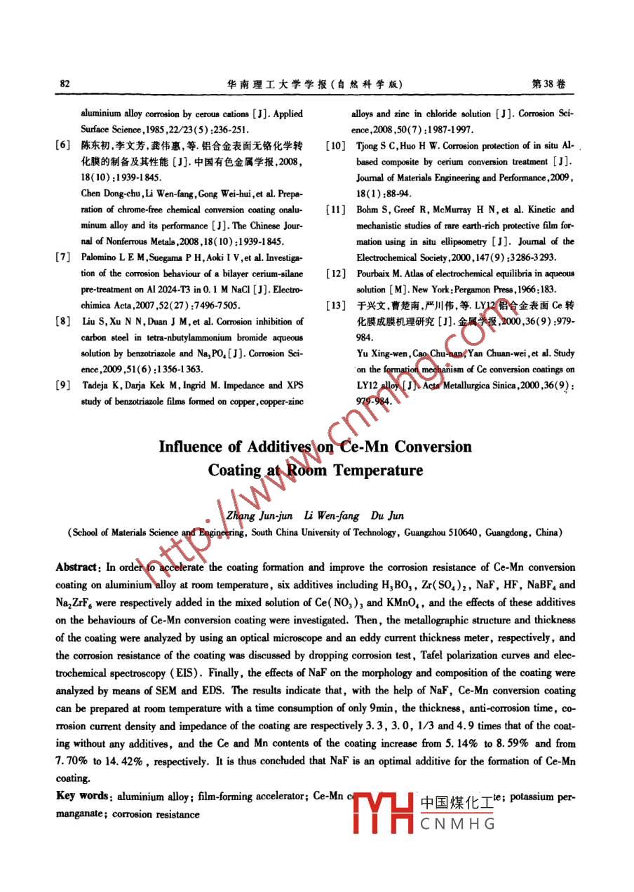 華南理工大學(xué)學(xué)報(bào)(自然科學(xué)版)第38卷第4期Jourmal of South China University of TechnologyVol. 38 No. 42010年4月(Natural Science Edition)April 2010文章編號(hào): 100-5656(0)04-076.07常溫時(shí)添加劑對(duì)Ce-Mn轉(zhuǎn)化膜的影響*張軍軍李文芳'杜軍(華南理工大學(xué)材料科學(xué)與工程學(xué)院,廣東廣州510640)摘要: 為了提高常溫下Ce-Mn轉(zhuǎn)化膜在鋁合金表面的成膜速度和耐腐蝕性能,在室溫、pH =2的Ce( NO,);和KMnO,的混合溶液中分別添加H,BO,、Zr( SO4 )2、NaF、HF、.NaBF.和Na2ZrF。6種添加劑,研究添加劑對(duì)Ce-Mn轉(zhuǎn)化膜的影響.通過(guò)光學(xué)顯微鏡、渦流測(cè)厚儀、點(diǎn)滴腐蝕法、Tafel極化曲線和交流阻抗等研究了膜的金相組織、厚度及耐腐蝕性能等;同時(shí),通過(guò)SEM和EDS研究了氟化鈉對(duì)膜的形貌和成分的影響.結(jié)果表明:氟化鈉是較佳的常溫成膜促進(jìn)劑,常溫下9min就能成膜,相對(duì)于無(wú)添加劑的Ce-Mn轉(zhuǎn)化膜,膜厚增加2.3倍,耐點(diǎn)滴腐蝕時(shí)間延長(zhǎng)2.0倍,腐蝕電流密度降低至原來(lái)的1/3,膜電阻提高3.9倍:添加NaF后膜的鈰含量從5. 14%提高到8.59%,錳含董從7. 70%提高到14. 42%.關(guān)鍵詞:鋁合金;成膜促進(jìn)劑; Ce-Mn轉(zhuǎn)化膜;硝酸鈰;高錳酸鉀;耐蝕性能中圖分類號(hào): TG174. 45doi :10.3969/j. issn. 1000-565X. 2010.04.015鋁合金材料是工業(yè)中使用量?jī)H次于鋼鐵的金屬高、浸泡時(shí)間較長(zhǎng)等不足.為了滿足工業(yè)生產(chǎn)的需要.材料.在自然環(huán)境中,尤其是有CI存在的情況下,常 溫下快速成膜是必須解決的問(wèn)題.筆者所在研究組鋁合金極易發(fā)生點(diǎn)腐蝕、縫隙腐蝕、應(yīng)力腐蝕和腐蝕在以Ce(NO3)3和KMnO,為主鹽的稀土轉(zhuǎn)化液中嘗疲勞等形式的破壞(".因此,非常有必要對(duì)鋁合金進(jìn)試加人添加劑作為成膜促進(jìn)劑,使Ce-Mn轉(zhuǎn)化膜能行耐腐蝕防護(hù)處理.目前最常用的鋁合金表面防護(hù)方在常溫下快速成膜.文中采用單因素實(shí)驗(yàn)研究添加劑法有陽(yáng)極氧化法和化學(xué)轉(zhuǎn)化膜法[2] ,化學(xué)轉(zhuǎn)化膜法中對(duì)膜厚生長(zhǎng)與耐腐蝕性能的影響.通過(guò)電化學(xué)方法、應(yīng)用最多的是鉻酸鹽轉(zhuǎn)化法.由于六價(jià)鉻對(duì)人體和環(huán)掃描電鏡與能譜分析等方法對(duì)轉(zhuǎn)化膜的耐腐蝕性境有很大的毒害作用,歐盟已通過(guò)RoHS和WEEE法能、微觀形貌、組成成分進(jìn)行研究,分析成膜添加劑規(guī)限制六價(jià)鉻的使用3).因此很多學(xué)者研究了不同成對(duì)轉(zhuǎn)化膜膜厚和耐腐蝕性能的改善作用.分的表面轉(zhuǎn)化膜來(lái)取代六價(jià)鉻41 ,其中三價(jià)鈰的轉(zhuǎn)化1實(shí)驗(yàn)方法膜被公認(rèn)為是最有希望替代鉻酸鹽轉(zhuǎn)化法的方法之一[5).筆者所在研究組首先開(kāi)發(fā)了以Ce(NO,),和1.1前處理KMnO4為主鹽的稀土轉(zhuǎn)化膜工藝(6 ,該工藝具有處鋁合金試樣用180、360、600、800和1000*水磨理工藝簡(jiǎn)單、對(duì)環(huán)境無(wú)污染、耐蝕性較強(qiáng)等特點(diǎn),具有砂紙逐級(jí)打磨,然后經(jīng)除油、堿腐蝕、出光、活化處一定開(kāi) 發(fā)潛力和應(yīng)用前景,但是存在處理液溫度較理,每道工序間用蒸餾水清洗3次.收稿日期: 2009-08-07中國(guó)煤化工。*基金項(xiàng)目:粵港關(guān)鍵領(lǐng)域重點(diǎn)突破(佛山專項(xiàng))專項(xiàng)基金資助項(xiàng)目(20MYHCNMHG.業(yè)共性技術(shù))基金資助項(xiàng)目(2009A08025002)作者簡(jiǎn)介:張軍軍( 1976-) ,男,博士生,主要從事材料表面工程的研究. E-mail: zjhsen@ 163. comt通訊作者:李文芳(1964-) ,男,教授,博士生導(dǎo)師,主要從事材料表面工程的研究. E-mail: mewli@ seut. edu. en第4期張軍軍等:常溫時(shí)添加劑對(duì)Ce-Mn轉(zhuǎn)化膜的影響1.2 成膜工藝表1添加劑對(duì)轉(zhuǎn)化膜生 長(zhǎng)速度的影響室溫下,將Ce-Mn轉(zhuǎn)化液(轉(zhuǎn)化液中Ce( NO,),Table 1 Effect of diflerent additives on the growing rate of coating鋁合金表面顏色濃度為10g/L, KMnO。濃度為2g/L)用0.1 mol/L的添加劑9 min12 min15 minNaOH和0. 1 moV/L的HNO3溶液調(diào)節(jié)pH值至2.0;無(wú)添加劑無(wú)淡黃黃色分別往Ce-Mn轉(zhuǎn)化夜中添加H,BO3、Zr(SO.)2、H,BO, .點(diǎn)狀黃斑淡黃色淡黃色NaF.HF、NaBF.和Na,ZrFg作為成膜添加劑,添加Zr(SO,)z點(diǎn)狀黃斑局部黃色黃色量分別為0. 375 mmol/L、0. 25 mmolVL.1. 5 mmo/L、NaF金黃黃褐色 探褐色HF局部淡黃淡黃1. 5 mmol/L、0.375 mmoVL和0. 25 mmo/L;每種添加劑的反應(yīng)時(shí)間分別為3.6 9、12和15 min.以上化NiaBF&局部淡黃 黃色金黃深褐色 探褐色NezZrF6學(xué)藥品均為市售化學(xué)純.1.3 轉(zhuǎn)化膜的測(cè)試與表征表1表明,在足夠長(zhǎng)的時(shí)間內(nèi)無(wú)論是否加人添采用德國(guó)PHYNIX公司Sufx-FNB型渦流測(cè)厚加劑,鋁合金表面均有膜生成;且由表1所示結(jié)果儀測(cè)量膜厚,實(shí)驗(yàn)時(shí)在試樣正面和反面分別取5個(gè)可見(jiàn),NaF和NaBF能加快膜的生長(zhǎng)速度,促進(jìn)膜的生成.點(diǎn)測(cè)量膜厚,然后取平均值做為膜厚.采用點(diǎn)滴腐蝕法與電化學(xué)方法研究Ce Mn轉(zhuǎn)化2.2添加劑對(duì)Ce-Mn轉(zhuǎn)化膜膜厚和金相組膜的耐腐蝕性能.點(diǎn)滴溶液成分為:濃鹽酸25 mL、重織的影響鉻酸鉀3g、蒸餾水75 mL;分別在試樣兩面各取3個(gè)在不同的成膜添加劑作