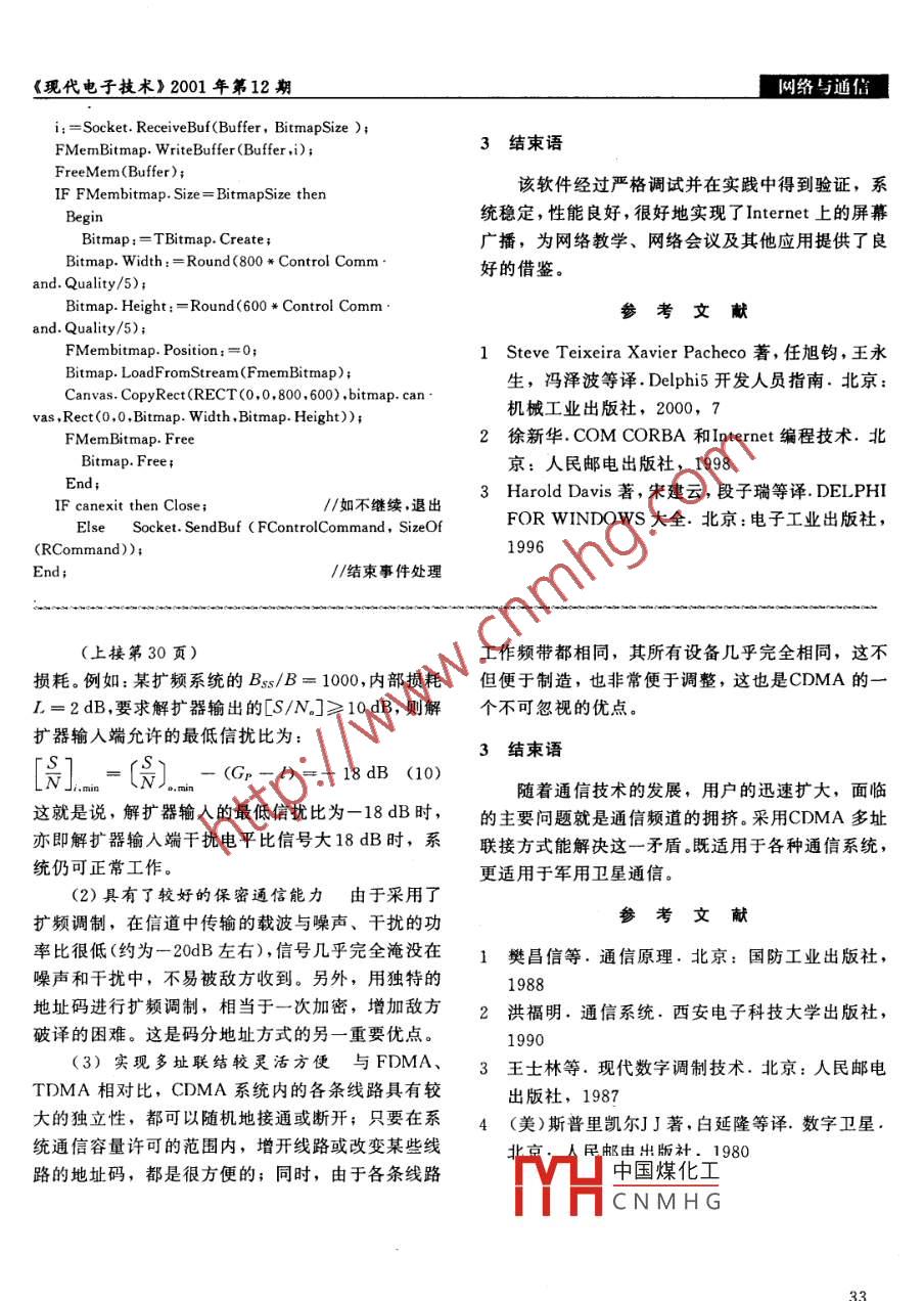 《現代電子技術》2001年第12期網絡與通信碼分多址方案分析李廷軍曹建平徐宇如李春勝李幸(海軍航空工程學院電子工程系煙臺264001)摘要闡明了碼分多址聯接方式的基本原理●給出了碼分多址聯接方式的方案,并對碼分多址聯接方式的很強的的抗干擾能力,較好的保密性,靈活的實行多址聯結等主要特點進行了分析和討論。關鍵詞碼分多址 擴頻相關在現代通信中已被廣泛應用的多址聯接方式相關處理,把地址碼相一致的信號還原為窄帶信號選有:頻分多址聯接方式(FDMA)和時分多址聯接出,而把地址碼不同的其它非需要信號仍保持或擴展方式(TDMA)。這里所要討論的碼分多址聯接方式為寬帶信號濾去。這就是CDMA最基本的原理。用一(CDMA)和他們相比,雖然在通信的有效性方面顯句話來說,就是借不同地址碼擴頻調制寬帶傳輸,用得不足,但在抗干擾性、保密性和多址聯接的靈活相應地址碼相關窄帶識別。采用碼分多址體制通信系性等方面則領先一籌。統原理示意圖,如圖1所示。1基本原理二進制信碼十基帶單元+信息調制+擴頻調制H發(fā)射機碼分多址聯接方式在原理.上和個↑▼FDMA, TDMA截然不同。它不像后者載波發(fā)生器| 地址碼發(fā)生器信道那樣簡單地依靠對信道的某一有用參量(工作頻率或工作時間)進行互不重迭的分割來4基帶單元H信息解調擴頻解調t接收機|4實現各通信點之間的多址互連。恰恰相| 載波發(fā)生器地址碼發(fā)生器同步單元反,它允許各發(fā)送端要發(fā)的信號均可占用同一頻帶、同一時間,像數字信號基帶傳輸中碼分多路復用(CDM)那樣,巧妙圖1碼分多址體制通信系統原理示意圖地借助于具有相關良好特性的不同碼序列對各通信點所發(fā)的各信號進行擴展頻譜的處理,經要實現碼分多址,基本條件是:信道傳輸后,在各接收端則用相應的地址碼分別進行(1) 要有數量足夠多、相關特性足夠好的周期參考文獻究所1 Next - Generation Modems. Gilbert Held, 19995侯波亨.VHDL硬件描述語言與數字邏輯電路設計2李貴山,戚德虎. PCI局部總線開發(fā)者指南6 Xilinx Foundation Series 3. li Help Content,3喬長閣,邊計年,薛宏熙. VHDI.簡明教程http: //www. xilinx. com4 VHDI,語言100例詳解。北京理工大學ASIC研.中國煤化工作者簡介寧春陽 女, 現在正在攻讀西安電子科技大學通信工程.MYHC N M H G數字通信方面的科研工作,目前的研究方向是數字通信與信號處理。張輝西安電子科技大學通信工程學院教授。29碼分多址方案分析.性地址碼,保證各發(fā)送端所要發(fā)送的各個載波都可一頻帶,只是不能共用同一地址碼;分配到互不相同的地址碼,這是進行“碼分”的基(2)各信號都利用各自的地址碼進行擴頻傳輸;礎。地質碼的自相關性與互相關性通常用自相關函(3)接收時利用地址碼的相關性和窄帶濾波器數與互相關函數來描述。它們的定義分別為:區(qū)分不同信號。為此,CDMA在通信的有效性、設備的經濟性R,(r)=|. a;(t) ●a;(t + r)dt(1)等方面付出了一-定的代價,但在通信的可靠性、靈R,(r) =(Ta;(t)●a;(t + r)dt(2)活性等方面卻換取了一系列意義重大的優(yōu)點:式中:a;(t),a;(t)分別表示碼集內任意兩個不同的(1)具有很強的抗干擾能力這 是CDMA方式一個最突出的優(yōu)點。對FDMA、TDMA來說,抗二進制地址碼序列,其值域為{1, . - 1};T為地址碼周期的時間寬度,若一周期中包含干擾能力差則是它們共同的一大缺點。CDMA區(qū)分信號與干擾的能力直接表現在解擴器輸出的信號干有M位碼元,每個碼元寬度為0,則T = M0;擾功率比相對于輸人端的改善程度。通常,就把解τ為相對時延,若兩序列保持幀同步,則τ= 0;擴器輸出端與輸人端的信號千擾功率比之值定義為若保持位同步,則τ= KO,(K = 0,1,2,.)。在r="處理增益”(記為Gp ),作為表征- -條擴頻通信線KO并取0= 1的條件下,式(1), (2)可簡化為:路所具有的分辨信號與干擾能力的強弱的一個重要R(r)=M一M2(3)參數,即:Ri(r)=M;一M2(4)(S/N)。_ S。/N。式中:M,和M;分別為相乘的兩序列間在一周期內Gp=.(S7N);= S;/N(5)相對應的各碼元取值相同與不同的位數。式中: (S/N)。為解擴器輸出端的信號噪聲功率比;(2)必須用各個地址碼分別對各個待發(fā)信號進(S/N);為解擴器輸人端的信號噪聲功率比;行擴頻處理,使傳輸的需占頻帶極大地展寬(一般S.,N。分別表示解擴器輸出端的信號和干擾應達幾百倍以上)。這一步,把不同地址碼分別與不功率;同待發(fā)信號的頻譜擴展結合起來,為各個接收端的S,N;分別表示解擴器輸人端的信號和干擾功區(qū)分信號完成了實質性的準備。在地址碼符合要求率。的條件下,傳輸頻帶擴展得愈寬,則信號的功率密.若信號通過解擴器沒有損耗,即S。=S,則度愈小,相關處理后能通過窄帶濾波器的非需要成Gp = N:/N。分的功率就愈小,愈有利于對信號的區(qū)分。若解擴前信號沒有被擴展的帶寬為Bss,解擴后信(3)在各個接收端,必須利用一個與要接收的號需占帶寬為B,且干擾的功率譜密度在解擴前后那個載波中所含的地址碼完全一致的本地地址碼??山瓶醋骶鶆蚍植紩r,則:對收到的所有信號進行相關處理或相關檢測,把地N。≈(N;/Bss)●B(7)址碼之間相關性的不同轉化為信號頻譜需占頻帶寬所以:窄的差別,然后用窄帶濾波器從中選出需要的信號。gp≈Bss/B(8)這是完成碼分多址的最重要環(huán)節(jié),它把前面準備好用分貝表示則為:了的識別不同信號的可能性轉變成現實性。[G,]≈