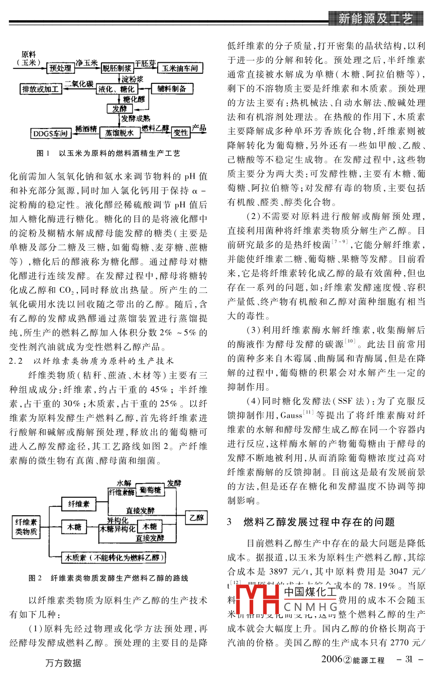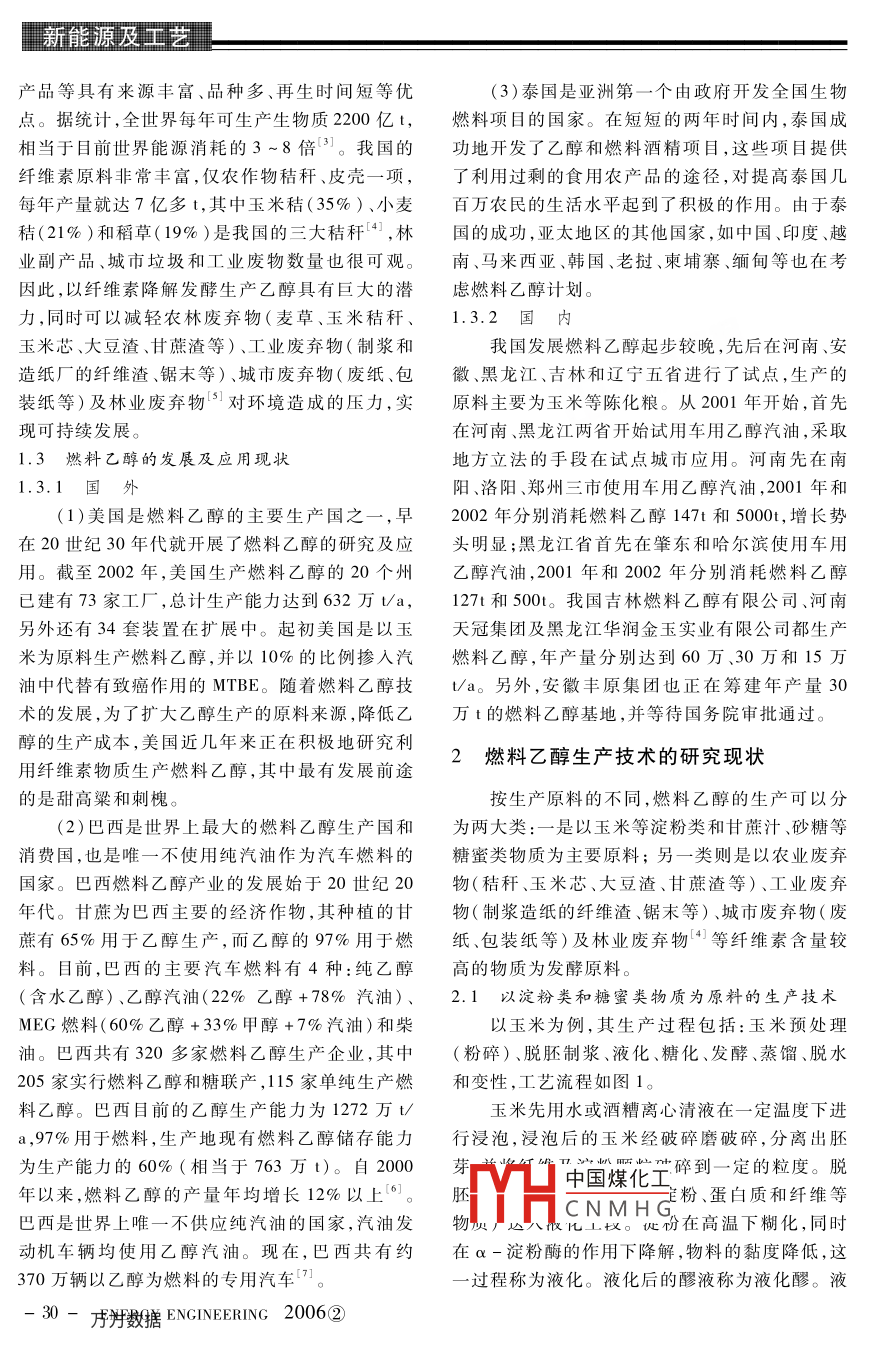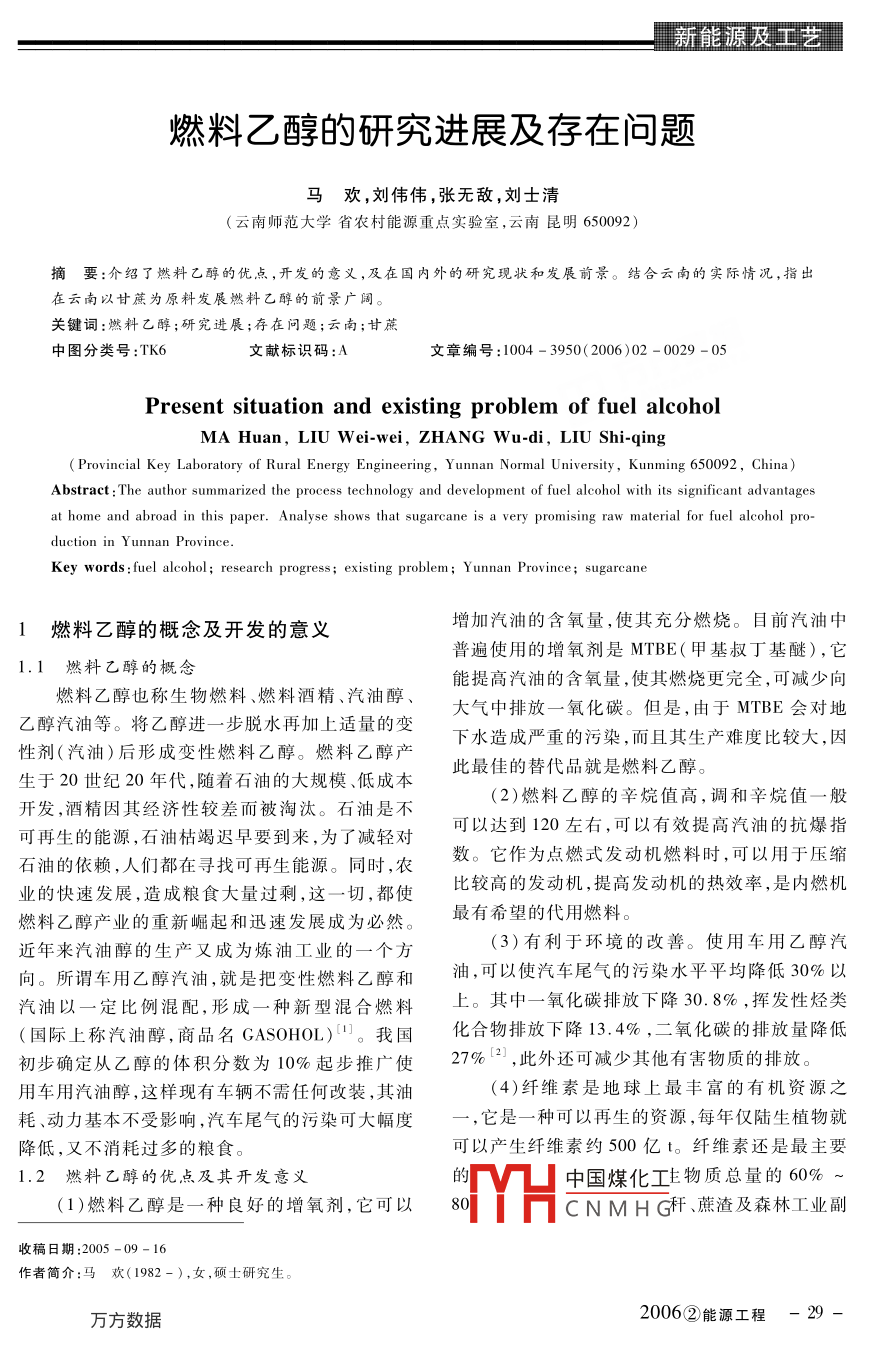 新能源及工藝燃料乙醇的研究進(jìn)展及存在問題馬歡,劉偉偉,張無(wú)敵,劉士清(云南師范大學(xué)省農(nóng)村能源重點(diǎn)實(shí)驗(yàn)室,云南昆明650092)摘要:介紹了燃料乙醇的優(yōu)點(diǎn),開發(fā)的意義,及在國(guó)內(nèi)外的研究現(xiàn)狀和發(fā)展前景。結(jié)合云南的實(shí)際情況,指出在云南以甘蔗為原料發(fā)展燃料乙醇的前景廣闊。關(guān)鍵詞:燃料乙醇;研究進(jìn)展;存在問題;云南;甘蔗中圖分類號(hào):TK6文獻(xiàn)標(biāo)識(shí)碼:A文章編號(hào):1004-3950(2006)02-0029-05Present situation and existing problem of fuel alcoholMA Huan, LIu wei-wei, ZHANG Wu-di, liu Shi-qirProvincial Key Laboratory of Rural Energy Engineering, Yunnan Normal University, Kunming 650092, China)Abstract The author summarized the process technology and development of fuel alcohol with its significant advantagesat home and abroad in this paper. Analyse shows that sugarcane is a very promising raw material for fuel alcohol prduction in Yn provinceKey words: fuel alcohol; research progress; existing problem; Yunnan Province; sugarcane1燃料乙醇的概念及開發(fā)的意義增加汽油的含氧量,使其充分燃燒。目前汽油中普遍使用的增氧劑是MTBE(甲基叔丁基醚),它1.Ⅰ燃料乙醇的概念能提高汽油的含氧量,使其燃燒更完全,可減少向燃料乙醇也稱生物燃料、燃料酒精、汽油醇乙醇汽油等。將乙醇進(jìn)一步脫水再加上適量的交大氣中排放一氧化碳。但是,由于MTBE會(huì)對(duì)地性劑(汽油)后形成變性燃料乙醇。燃料乙醇產(chǎn)下水造成嚴(yán)重的污染,而且其生產(chǎn)難度比較大,因生于20世紀(jì)20年代,隨著石油的大規(guī)模、低成本此最佳的替代品就是燃料乙醇。開發(fā),酒精因其經(jīng)濟(jì)性較差而被淘汰。石油是不(2)燃料乙醇的辛烷值高,調(diào)和辛烷值一般可再生的能源,石油枯竭遲早要到來(lái),為了減輕對(duì)可以達(dá)到120左右,可以有效提高汽油的抗爆指石油的依賴,人們都在尋找可再生能源。同時(shí),農(nóng)數(shù)。它作為點(diǎn)燃式發(fā)動(dòng)機(jī)燃料時(shí),可以用于壓縮業(yè)的快速發(fā)展,造成糧食大量過剩,這一切,都使比較高的發(fā)動(dòng)機(jī),提高發(fā)動(dòng)機(jī)的熱效率,是內(nèi)燃機(jī)燃料乙醇產(chǎn)業(yè)的重新崛起和迅速發(fā)展成為必然。最有希望的代用燃料。近年來(lái)汽油醇的生產(chǎn)又成為煉油工業(yè)的一個(gè)方(3)有利于環(huán)境的改善。使用車用乙醇汽向。所謂車用乙醇汽油,就是把變性燃料乙醇和油,可以使汽車尾氣的污染水平平均降低30%以汽油以一定比例混配,形成一種新型混合燃料上。其中一氧化碳排放下降30.8%,揮發(fā)性烴類(國(guó)際上稱汽油醇,商品名 GASOHOI)。我國(guó)化合物排放下降13.4%,二氧化碳的排放量降低初步確定從乙醇的體積分?jǐn)?shù)為10%起步推廣使27%2,此外還可減少其他有害物質(zhì)的排放。用車用汽油醇,這樣現(xiàn)有車輛不需任何改裝,其油(4)纖維素是地球上最豐富的有機(jī)資源之耗、動(dòng)力基本不受影響,汽車尾氣的污染可大幅度它是一種可以再生的資源,每年僅陸生植物就降低,又不消耗過多的糧食??梢援a(chǎn)生纖維素約500億t。纖維素還是最主要1.2燃料乙醇的優(yōu)點(diǎn)及其開發(fā)意(1)燃料乙醇是一種良好的增氧劑,它可以80oH中國(guó)煤化工物質(zhì)總量的60%CNMHG稈、蔗渣及森林工業(yè)副收稿日期:2005-09-16作者簡(jiǎn)介:馬歡(1982-),女,碩土研究生。2006②能源工程「新能源及掃藝產(chǎn)品等具有來(lái)源豐富、品種多、再生時(shí)間短等優(yōu)(3)泰國(guó)是亞洲第一個(gè)由政府開發(fā)全國(guó)生物點(diǎn)。據(jù)統(tǒng)計(jì),全世界每年可生產(chǎn)生物質(zhì)200億t,燃料項(xiàng)目的國(guó)家。在短短的兩年時(shí)間內(nèi),泰國(guó)成相當(dāng)于目前世界能源消耗的3~8倍③。我國(guó)的功地開發(fā)了乙醇和燃料酒精項(xiàng)目,這些項(xiàng)目提供纖維素原料非常豐富,僅農(nóng)作物秸稈、皮殼一項(xiàng),了利用過剩的食用農(nóng)產(chǎn)品的途徑,對(duì)提高泰國(guó)幾每年產(chǎn)量就達(dá)7億多t,其中玉米秸(35%)、小麥百萬(wàn)農(nóng)民的生活水平起到了積極的作用。由于泰秸(21%)和稻草(19%)是我國(guó)的三大秸稈,林國(guó)的成功,亞太地區(qū)的其他國(guó)家,如中國(guó)、印度、越業(yè)副產(chǎn)品、城市垃圾和工業(yè)廢物數(shù)量也很可觀。南、馬來(lái)西亞、韓國(guó)、老撾、柬埔寨、緬甸等也在考因此,以纖維素降解發(fā)酵生產(chǎn)乙醇具有巨大的潛慮燃料乙醇計(jì)劃。力,同時(shí)可以減輕農(nóng)林廢棄物(麥草、玉米秸稈、1.3.2國(guó)內(nèi)玉米芯、大豆渣、甘蔗渣等)、工業(yè)廢棄物(制漿和我國(guó)發(fā)展燃料乙醇起步較晚,先后在河南、安造紙廠的纖維渣、鋸末等)、城市廢棄物(廢紙、包徽、黑龍江、吉林和遼寧五省進(jìn)行了試點(diǎn),生產(chǎn)的裝紙等)及林業(yè)廢棄物3對(duì)環(huán)境造成的壓力,實(shí)原料主要為玉米等陳化糧。從2001年開始,首先現(xiàn)可持續(xù)發(fā)展。在河南、黑龍江兩省開始試用車用乙醇汽油,采取1.3燃料乙醇的發(fā)展及應(yīng)用現(xiàn)狀地方立法的手段在試點(diǎn)城市應(yīng)用。河南先在南陽(yáng)、洛陽(yáng)、鄭州三市使用車用乙醇汽油,2001年(1)美國(guó)是燃料乙