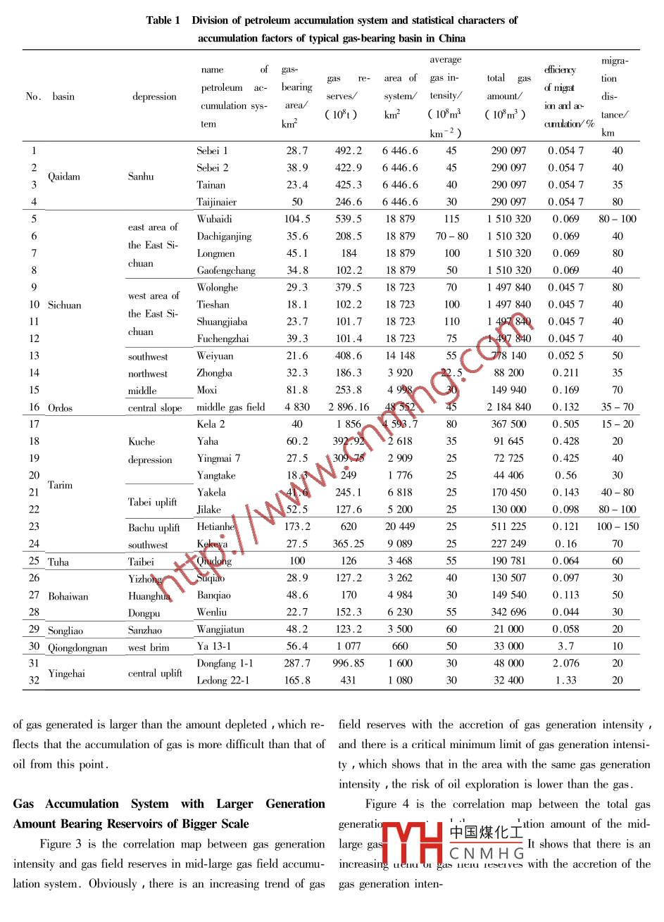 Journal of China University of Geosciences, Vol. 13, No. 4, P. 306-312, December 2002ⅠSSNl002-0705Printed in ChinaDivision of Gas Accumulation System andypical Petroliferous Basins of China* S inLaws Controlling Distribution of Natural GJiang Zhenxue Pang Xiongqi Jin Zhijun Chen dongxiaBasin reservoir Research Center, University of Petroleum BeKey Laboratory of Hydrocarbon Accumulation, Ministry of Education Beijing 102249ABSTRACT Considering the existing problems of the petroleum system this paper brings forward the concept of natural gas accumulation system and presents the dividing principles. Then detailed statistics on theaccumulation factors of the 32 typical natural gas accumulation systems in China and studies on the laws controlling distribution of gas are collected. The research shows that the petroleum accumulation system is thebasic unit controlling petroleum generation, migration and accumulation. generating intensity generatingamount, accumulating efficiency and migration distance plays an important role in the distribution of naturagas. Through analysis on results of resources evaluation, discovered reserves and residurves, potentialareas in middle-scaled petroliferous basins in China are forecasted in this paper. Ordos, Sichuan Tarim andQaidam basins are found out to be the main basins developing and enriching gas accumulation systemsKEY WORDS: petroliferous basins in China gas accumulation system petroleum system, laws controllinggas, potential areaBASIC CONCEPTS AND DIVISION PRINCIPLES on structing exploration( He and Zhao, 2000; Zhang, 1999)PETROLEUM ACCUMULATION SYSTEMWe define petroleum accumulation system as the organicBasic Concept on Petroleum Accumulation Systemcombination of one or several suits of source rocks with the eThe petroleum system( Magoon and Dow, 1994; Ma- volving petroleum accumulation plays being formed during thegoon, 1992, 1990; Demaison and Huizinga, 1991)empha- formation of the basin. Although both of them adopt means ofsizes on the distribution and evolution of source rocks. a system analysis the biggest difference between them is therocks if it is mainly view of analyzing problems. Adopting theories of systemfocused on the formation distribution and evolution of the Zhou, 1988; Zang, 1985 ), and according to the formationsource rock. Most basins in China are superimposed basins, and evolution of trap petroleum accumulation system'which it is difficult to divide petroleum system. Moreover, tematically analyzes petroleum accumulation laws based oninvestigations of the laws of petroleum distribution in the sys- formation, distribution and evolution of source rockstem are insufficient currently which is a disadvantage to in-a petroleum system may contain one or more petroleumaccumulation plays i a petroleum accumulation play may beThis paper is supported financially by National Key Basic Research Project located between two petroleum depressions and belong to two(973 y Formation and Distribution of Oil and Gas in Typical Superimposed BasintroleH中國煤化工 t difficulties to the appliar"Plan Project QuantitativeModels of Petroleum Accumulation in Major Fields(960007y'CN Ging petroleum accumulation plays as the nuclear factor in the systematic analysis ofManuscript received Augustpetroleum accumulation, the difficulties canManuscript accepted September 20, 2002Meanwhile it is much more practical, for system analyconducted closely with trap which is the nucleus of explo-ration. If there is one suit of source rock in the petroleum ac- system is firstly with the help of the paleo-tectonic maps ofcumulation system petroleum accumulation system is the sub- the basin comprising oil and gas fields, the migration diredunit of the petroleum system. If a petroleum accumulation sys- tion and accumulation zones can be identified based on thetem is located between two source rocks this petroleum accu- distribution of potential source rocks according to the principlemulation system comprises some parts of the two petroleum of division groove ;secondly petroleum accumulation systemsystems( Fig. 1). Thus a close relation between petroleum in each oilfield can be divided into combination of develop-accumulation system and petroleum system is expected. The ment and evolution of tectonic unit and/or traps( jiang etformer is the development of the latter while the latter is a ba- al. 1999)sis when analyzing petroleum accumulation systemDIVISION OF PETROLEUM ACCUMULATION SYSfrar nures tosk area ITEM AND STATISTICAL CHARACTERISTICS OFACCUMULATION FACTORS OF TYPICAL GASupBEARING BASINS IN CHINAsource rockleaWe divide the petroleum accumulation systems of themain petroliferous basins in China based on principles forego-eration amounts, the efficiency of migration and accumulationand migration distance for every petroleum accumulation system are calculated the detailed data are given in Table 1etroleum system-HestmmulatiorsystemCONTROLLING OF ACCUMULATION FACTORS ONFigure 1. Comparison of petroleum accumulation sysGAS ACCUMULATION SYSTEM IN PETROLIFERtem and petroleum systemOUS BASINS OF CHINAGas accumulation system is the basic unit constrainingPrinciples and Methodologies of Dividing Petroleum Acration, migration and accumulation and plays an im-cumulation Systemportant controlling role on the gas distributionBecause of the complication of geological process it isdifficult to establish the division criteria of the petroleum acGas Accumulation System with Higher Gas Generationcumulation system. Whether the criteria are over detailedIntensity Bearing More Gas Fieldsover simple or not it may bring inconveniences to the opera-Intensity of gas generation is plotted against the maxi-tor, Jin( 1997)summed up common principles as the followmum gas field reserves of gas accumulation systems in midings( CNPC, 1997 .Nine Five year plan projecf Quaniti- large gas fields Fig 2 ). It is observed that there is an in-tative Models of petroleu Accumulation in Major Fieldscreasing t