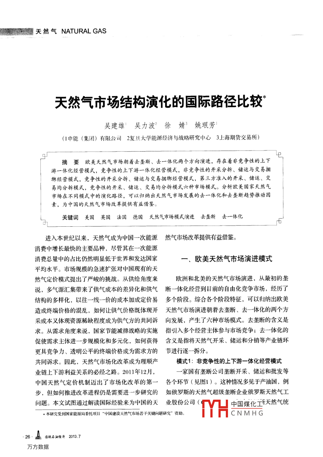 天然氣 NATURAL GAS天然氣市場(chǎng)結(jié)構(gòu)演化的國(guó)際路徑比較吳建雄′吳力波徐婧3姚珉芳(1中能(集閉)有限公司2復(fù)旦大學(xué)能源經(jīng)濟(jì)與戰(zhàn)略研究中心3上海期貨交易所)摘要?dú)W美天然氣市場(chǎng)朝著去壟斷、去一體化兩個(gè)方向演進(jìn),存在著非競(jìng)爭(zhēng)性的上下游一體化經(jīng)營(yíng)模式,競(jìng)爭(zhēng)性的上下游一體化經(jīng)營(yíng)模式,非竟?fàn)幮缘拈_(kāi)采分拆、儲(chǔ)運(yùn)與交易捆綁經(jīng)營(yíng)模式,竟?fàn)幮缘拈_(kāi)采分拆、儲(chǔ)運(yùn)與交易捆綁經(jīng)營(yíng)模式,笫三方準(zhǔn)入的開(kāi)采、儲(chǔ)運(yùn)、交易均分拆模式,競(jìng)爭(zhēng)性的開(kāi)采、儲(chǔ)運(yùn)、交易均分拆模式六種市場(chǎng)模式。分析歐美國(guó)家天然氣市場(chǎng)在不同模式中的演化路徑,可以歸納出天然氣市場(chǎng)發(fā)展的去一體化和去壟斷趨勢(shì)推動(dòng)因素,為中國(guó)的天然氣市場(chǎng)改革提供有益借鑒關(guān)鍵詞美國(guó)英國(guó)法國(guó)徳國(guó)天然氣市場(chǎng)模式演進(jìn)去壟斷去一體化進(jìn)入本世紀(jì)以來(lái),天然氣成為中國(guó)一次能源然氣市場(chǎng)改革提供有益借鑒。消費(fèi)中增長(zhǎng)最快的主要品種,盡管其在一次能源消費(fèi)總量中的占比仍然明顯低于世界和發(fā)達(dá)國(guó)家歐美天然氣市場(chǎng)演進(jìn)模式平均水平。市場(chǎng)規(guī)模的急速擴(kuò)張對(duì)中國(guó)現(xiàn)有的天然氣定價(jià)模式提出了嚴(yán)峻的挑戰(zhàn)。從供給角度來(lái)歐洲和北美的天然氣市場(chǎng)演進(jìn),從最初的壟說(shuō),多氣源匯集帶來(lái)了供氣成本的差異化和供氣斷一體化經(jīng)營(yíng)到目前的自由化競(jìng)爭(zhēng)市場(chǎng),經(jīng)歷了結(jié)構(gòu)的多樣化,以往一線一價(jià)的成本加成定價(jià)易多個(gè)階段。綜合各個(gè)階段特征,可以歸納出歐美造成終端價(jià)格的混亂,如何讓供氣價(jià)格既體現(xiàn)開(kāi)天然氣市場(chǎng)演進(jìn)朝著去壟斷、去一體化的兩個(gè)方采成本又體現(xiàn)資源稀缺程度成為供氣方的共同訴向發(fā)展,產(chǎn)生了六種市場(chǎng)模式。去壟斷的含義是求。從需求角度來(lái)說(shuō),國(guó)家節(jié)能減排戰(zhàn)略的實(shí)施指引入多個(gè)經(jīng)營(yíng)主體參與市場(chǎng)競(jìng)爭(zhēng);去一體化的促使需求主體進(jìn)一步規(guī)?;投嘣?如何獲得含義是指將天然氣開(kāi)采、儲(chǔ)運(yùn)和分銷等產(chǎn)業(yè)鏈環(huán)更具競(jìng)爭(zhēng)力、透明公平的終端價(jià)格成為需求方的節(jié)進(jìn)行逐一拆分共同訴求。因此,天然氣市場(chǎng)化改革成為理順產(chǎn)模式1:非競(jìng)爭(zhēng)性的上下游一體化經(jīng)營(yíng)模式業(yè)鏈上下游利益關(guān)系的必經(jīng)之路。2011年12月家國(guó)有壟斷公司壟斷開(kāi)采、儲(chǔ)運(yùn)和批發(fā)等中國(guó)天然氣定價(jià)機(jī)制邁出了市場(chǎng)化改革的第一各個(gè)環(huán)節(jié)(見(jiàn)圖1)。這種情況多見(jiàn)于產(chǎn)油國(guó),例步,但如何推進(jìn)改革進(jìn)程仍是需要進(jìn)一步研究的如俄羅斯的天然氣超級(jí)壟斷企業(yè)俄羅斯天然氣工問(wèn)題。本文試圖通過(guò)解讀國(guó)際經(jīng)驗(yàn)來(lái)為中國(guó)的天業(yè)股份公司(中國(guó)煤化工天然氣統(tǒng)夲研究受到國(guó)家能源局委托項(xiàng)目“中囯建設(shè)天然氣市場(chǎng)若干關(guān)鍵問(wèn)題研究”資助CNMHG國(guó)酥石油經(jīng)濟(jì)2013.7NATURAL GAS天然氣一運(yùn)輸主干線以及油氣出口專營(yíng)權(quán),2011年其天國(guó)有/私營(yíng)然氣產(chǎn)量占全國(guó)總產(chǎn)量的83%(儲(chǔ)運(yùn)、交易)門(mén)踏價(jià)格「天然氣分銷商門(mén)站價(jià)格議價(jià)大工業(yè)用戶國(guó)有/私營(yíng)國(guó)有壟斷公司天然氣分銷商上游生產(chǎn)商(儲(chǔ)運(yùn)、交易)(開(kāi)采、儲(chǔ)運(yùn)、交易)大工業(yè)用戶圖1天然氣市場(chǎng)模式1圖4天然氣市場(chǎng)模式4模式2:競(jìng)爭(zhēng)性的上下游一體化經(jīng)營(yíng)模式模式5:第三方準(zhǔn)入的開(kāi)采、儲(chǔ)運(yùn)、交易均分多家公司既從事天然氣的開(kāi)采和進(jìn)口業(yè)務(wù),拆模式又擁有自己的長(zhǎng)輸管網(wǎng),屬于集開(kāi)采、進(jìn)口、儲(chǔ)國(guó)有壟斷的管網(wǎng)實(shí)行管線第三方準(zhǔn)入,即允運(yùn)及批發(fā)業(yè)務(wù)于一身的上下游一體化公司,公司許分銷商從上游生產(chǎn)商處自行購(gòu)氣,并使用管之間通過(guò)管道鋪設(shè)爭(zhēng)奪門(mén)站市場(chǎng),又被國(guó)際能源網(wǎng)進(jìn)行運(yùn)輸。另外,產(chǎn)生了承運(yùn)的獨(dú)立交易商署(EA)定義為“管網(wǎng)間競(jìng)爭(zhēng)”模式( Pipeline-( Trader或 Shipper)這一市場(chǎng)參與主體,他們從line Competition)(見(jiàn)圖2)。氣田購(gòu)氣,向管網(wǎng)所有者購(gòu)買(mǎi)管輸權(quán),最后通過(guò)向分銷商出售天然氣而獲利。分銷商既可以從獨(dú)(開(kāi)采、儲(chǔ)運(yùn)和交易)門(mén)站價(jià)格「天然氣分銷商立交易商處購(gòu)氣,也可以直接從生產(chǎn)商處購(gòu)氣;有/私營(yíng)公可(開(kāi)采、儲(chǔ)運(yùn)和交易)→大工業(yè)用戶同時(shí)管網(wǎng)所有者自身