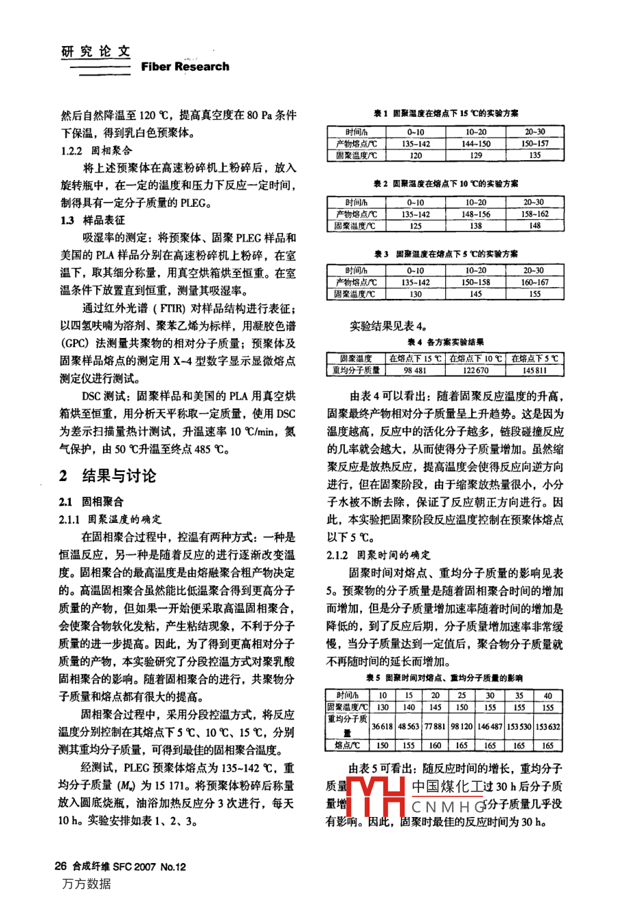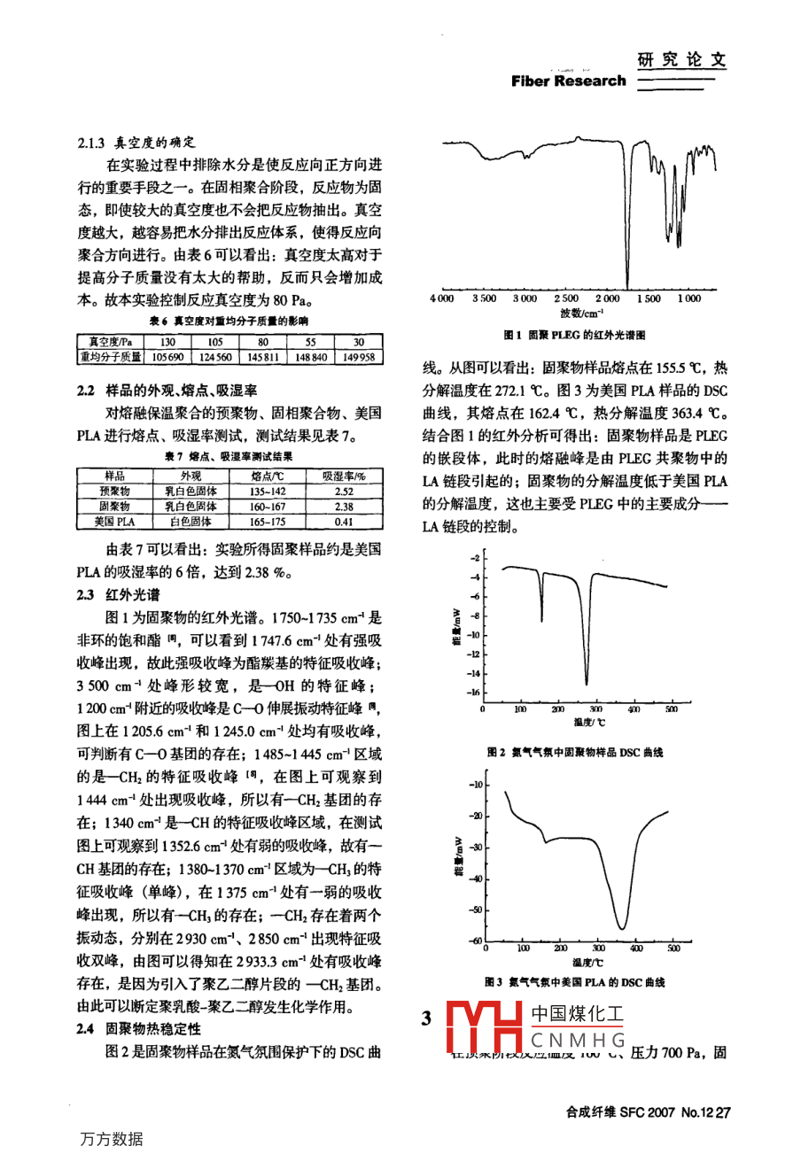 研究論文Fiber Research乳酸與聚乙二醇熔融聚合及表征徐霞',張滿林',王紹斌',楊敏鴿",陳立成2(1.西安工程大學(xué),紡織與材料學(xué)院,陜西西安710048;2.西安工程大學(xué),環(huán)境與化學(xué)工程學(xué)院,陜西西安710048)摘"要: 以I-乳酸與聚乙二醇為原料,熔融共聚,再固相聚合得到聚乳酸-聚亡二醇典聚物(PLEC)2?; 用凝膠滲透色譜(GPC)、 紅外光譜(FTR)、熔點(diǎn)測試、差示掃描量熱法(Sc)、吸濕率測試等手段對(duì)其進(jìn)行表征,發(fā)現(xiàn)相同條件下,聚乳酸聚乙二醇共聚物吸濕率高于聚乳酸。關(guān)鍵詞:聚乳酸-聚乙二醇;熔融共聚;圉相聚合中圖分類號(hào): TQ342.。的wr.文獻(xiàn)標(biāo)識(shí)碼: A. srer文章編號(hào): 1001-7054 (2007) 12- 0025-04聚乳酸(PLA) 是-一種生物降解高分子,具有是將L~乳酸與聚乙二醇熔融保溫聚合,再經(jīng)固相聚很好的生物降解性、相容性和可吸收性,最終的降合得到較高分子量的PLEG。解產(chǎn)物是二氧化碳和水,不會(huì)對(duì)環(huán)境造成污染n,1實(shí)驗(yàn)部分因此人們對(duì)聚乳酸在工農(nóng)業(yè)領(lǐng)域、生物醫(yī)藥領(lǐng)域、食品包裝領(lǐng)域的應(yīng)用展開了廣泛的研究四。但是聚1.1原料與儀器乳酸中有大量的酯鍵,為疏水性物質(zhì),降低了它的L~乳酸:工業(yè)品,江西武藏野生物化工有限生物相容性。為改善PLA的親水性,一種有效的公司;聚乙二醇2000:分析純,天津市科密歐化方法是在PLA主鏈中引入親水性的基團(tuán)或鏈段。學(xué)試劑開發(fā)中心;聚乳酸:美國CARCIL-DOW聚乙二醇(PEG)具有良好的生物相容性和親水性,公司;催化劑為自制納米級(jí)錫粉。在PLA分子鏈中引入PEG鏈段得到聚乳酸~聚乙二RE-85Z型旋轉(zhuǎn)蒸發(fā)器:上海青浦滬西儀器醇共聚物(PLEG) 是改善PLA親水性能的一種比廠; WMZK-01型溫度指示控制儀:上海華辰醫(yī)用較好的方法周。目前,PLEC主要通過丙交酯與環(huán)儀表有限公司; X-4 型數(shù)字顯示顯微熔點(diǎn)測定儀:氧乙烷、PEG開環(huán)共聚合成,但丙交酯的純化需要北京泰克儀器有限公司; DZF6050 真空烘箱:上海耗費(fèi)大量有機(jī)溶劑重結(jié)晶,導(dǎo)致PLEG的合成成本精宏實(shí)驗(yàn)設(shè)備有限公司; FTRS700 型紅外光譜儀:高昂。因此,隨著乳酸直接熔融聚合法H合成各日本ShiMadZu公司; egilent 1100 型凝膠色譜儀:種聚乳酸類生物降解材料的不斷深入,可以采用乳美國; Sapphire DSC差示掃描量熱計(jì):美國PE。酸、PEG直接合成PLEG,以降低其合成成本(5網(wǎng)。1.2樣品制備汪朝陽等在165 C、70 Pa壓力下,以氧化亞錫或氯1.2.1 L-乳酸與聚乙二醇熔融保溫聚合化亞錫為催化劑,熔融聚合制得了PLEG切。本文將L~乳酸在- -定壓強(qiáng)、溫度下進(jìn)行濃縮除水。將聚乙二醇加入到除水濃縮過的乳酸中進(jìn)-步縮收稿日期: 2007-09-044 修回日期: 207-11-01金項(xiàng)目:陜西省自然科學(xué)基金項(xiàng)目((項(xiàng)目編號(hào): 2007B18)。 中國聚,其中聚乙二醇占1/10的比例。將濃縮過的乳紡織工業(yè)協(xié)會(huì)指導(dǎo)性項(xiàng)目(項(xiàng)目端號(hào): 207000陜西省教育廳專酸和中國煤化工自制納米級(jí)錫粉項(xiàng)科研計(jì)劃項(xiàng)目((項(xiàng)目 編號(hào): 07]JK247)。催化|YHCN M H G,開動(dòng)真空泵,作者簡介:徐霞(1982-).山東省泰安市人,碩士研究生,研究方向?yàn)榧徔棽牧系拈_發(fā)。慢慢將真空度調(diào)到700Pa,在此條件下聚合8~12 h,合成纖維SFC 2007 No.12 25研究論文Fiber Research然后自然降溫至120 C,提高真空度在80 Pa條件表1固聚溫度在熔點(diǎn)下15 C的實(shí)驗(yàn)方案下保溫,得到乳白色預(yù)聚體。時(shí)間h0-1010-2020-30產(chǎn)物熔點(diǎn)心135-142144-150150-1571.2.2固相聚合固聚溫度心C12029135將上述預(yù)聚體在高速粉碎機(jī)上粉碎后,放入,旋轉(zhuǎn)瓶中,在一定的溫度和壓力下反應(yīng)一定時(shí)間,表2固聚溫度在熔點(diǎn)下10 C的實(shí)驗(yàn)方案制得具有一-定分子質(zhì)量的PLEG。產(chǎn)物熔點(diǎn)/C148-156158-1621.3樣品表征固聚溫度心25_138_148吸濕率的測定:將預(yù)聚體、固聚PLEG樣品和美國的PLA樣品分別在高速粉碎機(jī)上粉碎,在室表3固聚溫度在熔點(diǎn)下5 C的實(shí)驗(yàn)方案溫下,取其細(xì)分稱量,用真空烘箱烘至恒重。在室150-158160-167溫條件下放置直到恒重,測量其吸濕率。3045155通過紅外光譜( FTIR)對(duì)樣品結(jié)構(gòu)進(jìn)行表征;以四氫呋喃為溶劑、聚苯乙烯為標(biāo)樣,用凝膠色譜實(shí)驗(yàn)結(jié)果見表4。(GPC)法測量共聚物的相對(duì)分子質(zhì)量;預(yù)聚體及表4各方案實(shí)驗(yàn)結(jié)果固聚樣品熔點(diǎn)的測定用X-4型數(shù)字顯示顯微熔點(diǎn)C固欒溫度 _工在熔點(diǎn)下1I5C在熔點(diǎn)下10C「在熔點(diǎn)下5T重均分子質(zhì)量 .98 481122670145811測定儀進(jìn)行測試。DSC測試:固聚樣品和美國的PLA用真空烘由表4可以看出:隨著固聚反應(yīng)溫度的升高,箱烘至恒重,用分析天平稱取- -定質(zhì)量,使用DSC固聚最終產(chǎn)物相對(duì)分子質(zhì)量呈上升趨勢。這是因?yàn)闉椴钍緬呙枇繜嵊?jì)測試,升溫速率10 C/min,氮溫度越高,反應(yīng)中的活化分子越多,鏈段碰撞反應(yīng)氣保護(hù),由50 C升溫至終點(diǎn)485 C。的幾率就會(huì)越大,從而使得分子質(zhì)量增加。雖然縮聚反應(yīng)是放熱反應(yīng),提高溫度會(huì)使得反應(yīng)向逆方向2