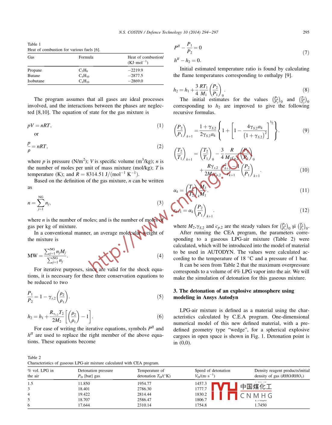 Available online at www.sciencedirect.comDefenceTechnology①ScienceDirectCrossMarkEL SEVIERDefence Technology 10 (2014) 294- -297www.elsevier.com/locate/dtNumerical simulation of detonation of an explosive atmosphere of liquefiedpetroleum gas in a confined spaceNiculae Serban COSTINMilitary Technical Academy, Sector 5, 050141 Bucharest, RomaniaReceived 15 January 2014; revised 21 February 2014; accepted 20 June 2014Available online 22 July 2014AbstractThe detonation of an explosive atmosphere from liquefied petroleum gas disseminated in air in a confined space is studied using numericalmodeling with software product ANSYS AUTODYN.Copyright o 2014, China Ordnance Society. Production and hosting by EIsevier B.V. All rights reserved.Keywords: Liquefied petroleum gas; Overpressure; Confined space; Explosion limit1. Introduction2. The calculation of the characteristics of LPG-airmixture using CEA programthose petroleum products which are made up of mixed vari-CEA program enables the calculation of the characteristicsables of gaseous hydrocarbons (methane, ethane, butane) andof Chapman-Jouguet detonation. Several reports from Zackambient conditions, which are in a state of vapor, but can beand Gordon (1960 and 1968) were intended to compare theeasily liquefied. In Romania, liquefied petroleum gas, namely, .results for the two ways of calculation of chemical equllib-petroleum product, is composed of mixture of butane (min.rium. It came to the conclusion that it comes down to the same90%) and propane (max. 9%) [1].number of equations. However, in the case of free energyThe characteristics of LPG are defined in SR 66:2007,minimization method each chemical species can be treatedcontaining mainly max. 12% C3 and min. 87% C4, and theindependently without having to specify a set of special ef-vapor pressure is max. 7.5 bar [1].fects, as it is required in the case of the equilibrium constantsA mixture of 8% propane and 92% butane was chosen formethod [2,3].numerical simulation in the paper. This mixture of fuel, mixedThus, the program that uses free energy minimizationwith air, will form an explosive atmosphere. The temperaturesmethod for the calculation of equilibrium composition. Thof self-ignition and explosion limits for LPG components aremethod used to obtain the parameters of engine knockingpresented in Table 1Chapman- -Jouguet is described by Zack and Gordon. There10 kg of LPG (LPG vapor) which will be subject to theare three stages in the procedure. The first stage consists indetonation is used to study normal and reflected overpressuresestimating the initial detonation pressure and temperature. Thein a confined spacesecond stage is to use a recurrent formula for improving theparameters obtained in the first stage. During the third stagethe correct valuesare obtained using a ierative New-E-mail address: niculae.costin@ yahoo.com (N.S. COSTIN).ton-Raphson proc中國(guó)煤化工Peer review under responsibility of China Ordnance Society.YHCNMH Ghtp:/:.o.o.o/10.016/./.14./6.008 .2214-9147/Copyright◎2014, China Ordnance Society. Production and hosting by Elsevier B.V. All rights reserved.N.S. COSTIN/ Defence Teclmology 10 (2014) 294- -297295Table 1pl1_ P1=0Heat of combustion for various fuels [6].P(7GasFormulaHeat of combustion/(KJ mol ')h"-1h2=0.PropaneC3HgInitial estimated temperature ratio is found by calculatingButaneC4Ho-2877.5the flame temperatures corresponding to enthalpy [9].IsobutaneC.Hno- 2869.0h2= hy :t 3RTi(84MThe program assumes that all gases are ideal processesThe initial estimates for the values (號(hào))o and (號(hào))o .involved, and the interactions between the phases are neglec-corresponding to h2 are improved to give the followingted [8,10]. The equation of state for the gas mixture isrecursive formulas.pV = nRT,1). 1+ Ys.24r5s,2Qk _(9or().-2rs;2QXk(1+ rs2)5 = nRT,2)3R()。where p is pressure (N/m2); V is specific volume (m3/kg); n is(),=()。-4 MrCp,2the number of moles per unit of mass mixture (mol/kg); T isRyY.2 寶一1(10)temperature (K); and R = 8314.51 J/(mol-' K- ).2MICp.2 In+1 (P+)k+1Based on the definition of the gas mixture, n can be written(會(huì))急(11)1=2”,(3)rt+1=an(中)where n is the number of moles; and is the number of moles ofgas per kg of mixture.where M2,Ys.2 and Cp2 are the steady values for (號(hào))。si (語(yǔ))o.In a conventional manner, an average molecular weight ofAfter running the CEA program, the parameters corre-the mixture issponding to a gaseous LPG-air mixture (Table 2) werecalculated, which will be introduced into the model of materialEji n;M;to be used in AUTODYN. The values were calculated ac-MW=4)2mηjcording to the temperature of 18 °C and a pressure of 1 bar.It can be seen from Table 2 that the maximum overpressureFor iterative purposes, since are valid for the shock equa-corresponds to a volume of 4% LPG vapor into the air. We willtions, it is necessary for these three conservation equations tomake the simulation of detonation for this gaseous mixture.be reduced to two3. The detonation of an explosive atmosphere usingP2i=1-ra2(()5)modeling in Ansys AutodynLPG-air mixture is defined as a material using the char-Rr,T2h2=h+2M2|(2)-1|6)acteristics calculated by C.E.A program. One- dimensionalnumerical model of this new defined material, with a pre-For ease of writing the iterative equations, symbols pl anddefined geometry type“wedge", for a spherical explosivehl" are used to replace the right member of the above equa-cargoes in open space is shown in Fig. 1. Detonation point isions. These equations becomein (0,0).Table 2Characteristics of gaseous LPG-air mixture calculated with CEA program.%vol.LPGinDetonation pressureTemperature ofSpeed of detonationDensity reagent products/initialthe airPD [bar] gasdetonation T/(°K)V/(m.sdensity of gas (RHO/RHO).511.8501954.771457.3| 中國(guó)煤化工18.4012786.301777.719.4222814.441830.2MHCNMHG18.7072586.471806.717.6442310.141754.81.745096N.S. COSTIN/ Defence Technology 10 (20
