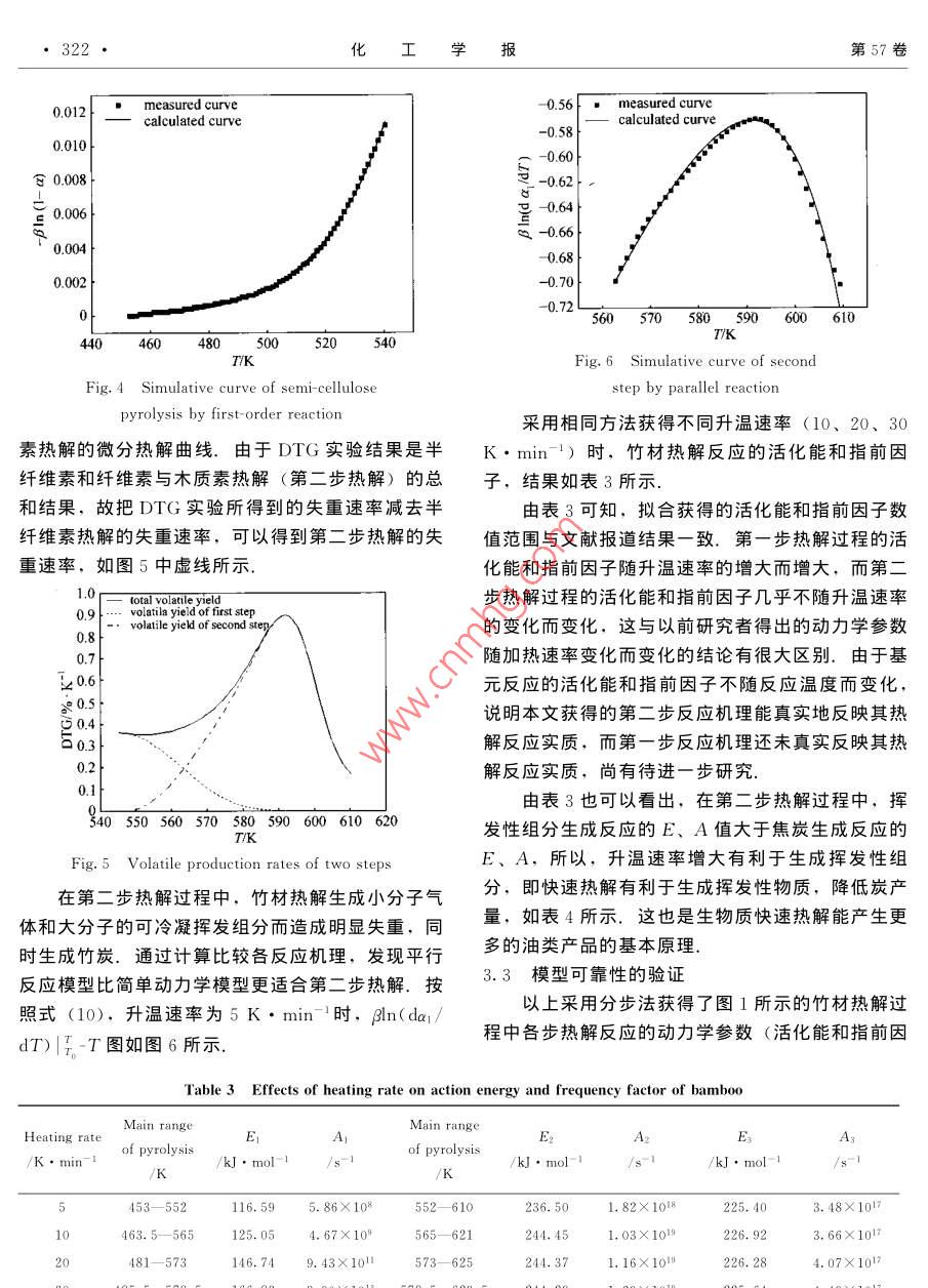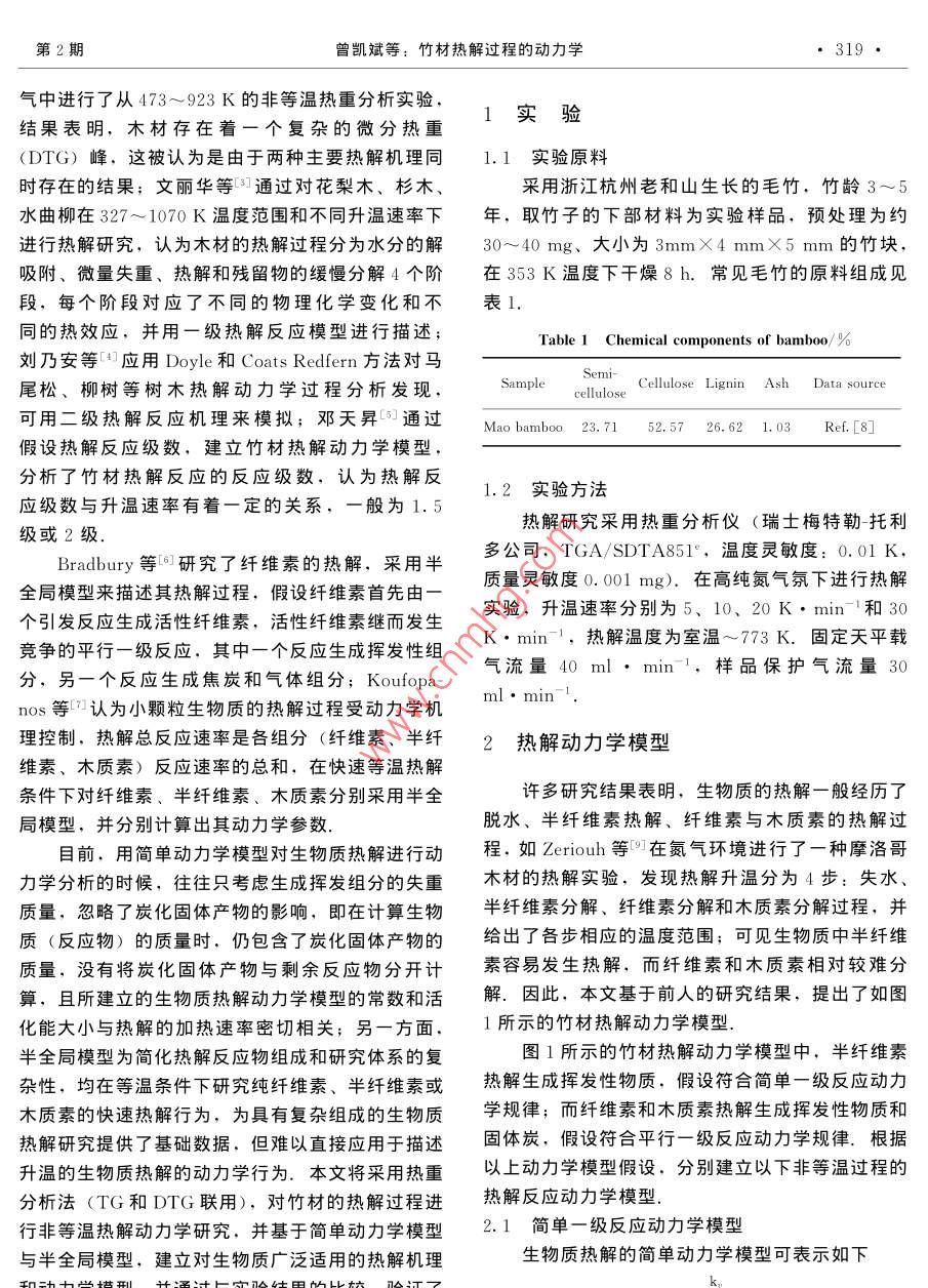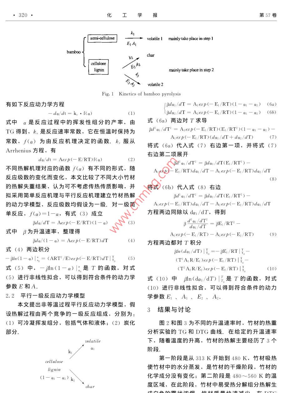 第57卷第2期化工學(xué)報(bào)Vol. 57 No. 22060年2月JoumalofChemnilhndusryandngineing(china)Fdbrury200研究論文竹材熱解過程的動(dòng)力學(xué)曾凱斌,蔣斌波,陳紀(jì)忠浙江大學(xué)化學(xué)工程與生物工程學(xué)系,浙江杭州310027)摘要:在不同升溫速率(5、10、20、30K·min-)下,對(duì)竹材進(jìn)行TG、DTG分析.試樣從313~650K的升溫過程經(jīng)歷了水分析出、第一步熱解和第二步熱解過程.用 Levenberg-Marquardt方法對(duì)非等溫動(dòng)力學(xué)過程進(jìn)行數(shù)據(jù)擬合,結(jié)果表明,半纖維素在較低溫度下熱解,僅生成揮發(fā)性組分,表現(xiàn)為第一步熱解,可以用簡單一級(jí)反應(yīng)描述;纖維素和木質(zhì)素在較高溫度下熱解,表現(xiàn)為第二步熱解,是競(jìng)爭(zhēng)的平行一級(jí)反應(yīng),產(chǎn)物分別是揮發(fā)性組分和竹炭.第一熱解過程與熱解升溫速率有關(guān),而第二熱解過程與升溫速率無關(guān)關(guān)鍵詞:竹材;熱解;動(dòng)力學(xué);生物質(zhì);可再生資源中圖分類號(hào):TQ351.2文獻(xiàn)標(biāo)識(shí)碼:A文章編號(hào):0438-1157(2006)02-0318-06Kiof bbmboo pyrolysis( De partment of Chemical and Biochemical Engineering, Zhejiang University, Hangzhou 310027. Zhejiang, ChineAbstract Bamboo materials were pyrolyzed in TGA equipment (TGA/SDTA851) at heating rate of 5of bamboo consisted of three steps: pre- pyrolysis of water evaporation, first step pyrolysis and second steppyrolysis. The kinetics of bamboo pyrolysis was analyzed based on the Levenberg-Marquardt method. Thefirst step of bamboo pyrolysis could be considered as the pyrolysis of semi-cellulose to volatile matter onlyand well described by a first-order reaction model. The second step of bamboo pyrolysis could beconsidered as the pyrolysis of cellulose and lignin to volatile matter and char, and well described by aparallel first-order reaction model. The first step of bamboo pyrolysis was dependent on heat-up ratewhile the second step of bamboo pyrolysis was independent of heat-up rate.Key words: bambooS; kinetics: biomass; renewable resources熱解氣體,造成大量有價(jià)值的揮發(fā)性有機(jī)物的浪費(fèi)和環(huán)境污染.竹材熱解產(chǎn)物的組分繁多,并受到其中國享有“竹子王國”的美譽(yù),我國竹林面熱解動(dòng)力學(xué)的制約.深入認(rèn)識(shí)竹材熱解的動(dòng)力學(xué)規(guī)積約400萬公頃,其中經(jīng)濟(jì)利用價(jià)值較高的毛竹林律,是竹材高效利用的理論基礎(chǔ)和關(guān)鍵面積約250萬公頃,占世界毛竹總量的90%以生物質(zhì)熱解的失重動(dòng)力學(xué)模型是國內(nèi)外學(xué)者研上.竹材熱解是竹材利用的有效方法,可以生產(chǎn)究的熱點(diǎn),常用的模型有簡單的一級(jí)或二級(jí)熱解反經(jīng)濟(jì)價(jià)值高的竹炭和竹醋液.然而,我國竹炭生產(chǎn)應(yīng)動(dòng)力學(xué)模型和半全局模型( semi-global主要是采用土窯的傳統(tǒng)技術(shù),效率低,甚至不回收 mechanism).Wu等對(duì)各種樹種的樹干樣品在氮2005-02-21收到初稿.2005-07-20收到修改稿Received date: 2005-02-21聯(lián)系人:陳紀(jì)忠第2期曾凱斌等:竹材熱解過程的動(dòng)力學(xué)319氣中進(jìn)行了從473~923K的非等溫?zé)嶂胤治鰧?shí)驗(yàn),結(jié)果表明,木材存在著一個(gè)復(fù)雜的微分熱重1實(shí)驗(yàn)(DIG)峰,這被認(rèn)為是由于兩種主要熱解機(jī)理同1.1實(shí)驗(yàn)原料時(shí)存在的結(jié)果;文麗華等通過對(duì)花梨木、杉木采用浙江杭州老和山生長的毛竹,竹齡3~5水曲柳在327~1070K溫度范圍和不同升溫速率下年,取竹子的下部材料為實(shí)驗(yàn)樣品,預(yù)處理為約進(jìn)行熱解研究,認(rèn)為木材的熱解過程分為水分的解30~40mg、大小為3mm×4mm×5mm的竹塊,吸附、微量失重、熱解和殘留物的緩慢分解4個(gè)階在353K溫度下干燥8h.常見毛竹的原料組成見段,每個(gè)階段對(duì)應(yīng)了不同的物理化學(xué)變化和不表同的熱效應(yīng),并用一級(jí)熱解反應(yīng)模型進(jìn)行描述;Table 1 Chemical components of bamboo/%劉乃安等應(yīng)用 Doyle和 Coats redfern方法對(duì)馬尾松、柳樹等樹木熱解動(dòng)力學(xué)過程分析發(fā)現(xiàn), Sample cellulose Cellulose Lignin Ash Data sourd可用二級(jí)熱解反應(yīng)機(jī)理來模擬;鄧天昇通過M0am713.12.621.03R[8假設(shè)熱解反應(yīng)級(jí)數(shù),建立竹材熱解動(dòng)力學(xué)模型分析了竹材熱解反應(yīng)的反應(yīng)級(jí)數(shù),認(rèn)為熱解反1.2實(shí)驗(yàn)方法應(yīng)級(jí)數(shù)與升溫速率有著一定的關(guān)系,一般為1.5級(jí)或2級(jí)熱解研究采用熱重分析儀(瑞土梅特勒-托利Bradbury等研究了纖維素的熱解,采用半多公司, TGA/SDTA851°,溫度靈敏度:0.01K,全局模型來描述其熱解過程,假設(shè)纖維素首先由質(zhì)量靈敏度0.001mg).在高純氮?dú)夥障逻M(jìn)行熱解個(gè)引發(fā)反應(yīng)生成活性纖維素,活性纖維素繼而發(fā)生實(shí)驗(yàn),升溫速率分別為5、10、20K·min和30竟?fàn)幍钠叫幸患?jí)反應(yīng),其中一個(gè)反應(yīng)生成揮發(fā)性組K·min-1,熱解溫度為室溫~773K.固定天平載分,另一個(gè)反應(yīng)生成焦炭和氣體組分; Koufopa氣流量40ml·min-1,樣品保護(hù)氣流量30nos等認(rèn)為小顆粒生物質(zhì)的熱解過程受動(dòng)力學(xué)機(jī)理控制,熱解總反應(yīng)速率是各組分(纖維素、半纖2熱解動(dòng)力學(xué)模型維素、木質(zhì)素)反應(yīng)速率的總和,在快速等溫?zé)峤鈼l