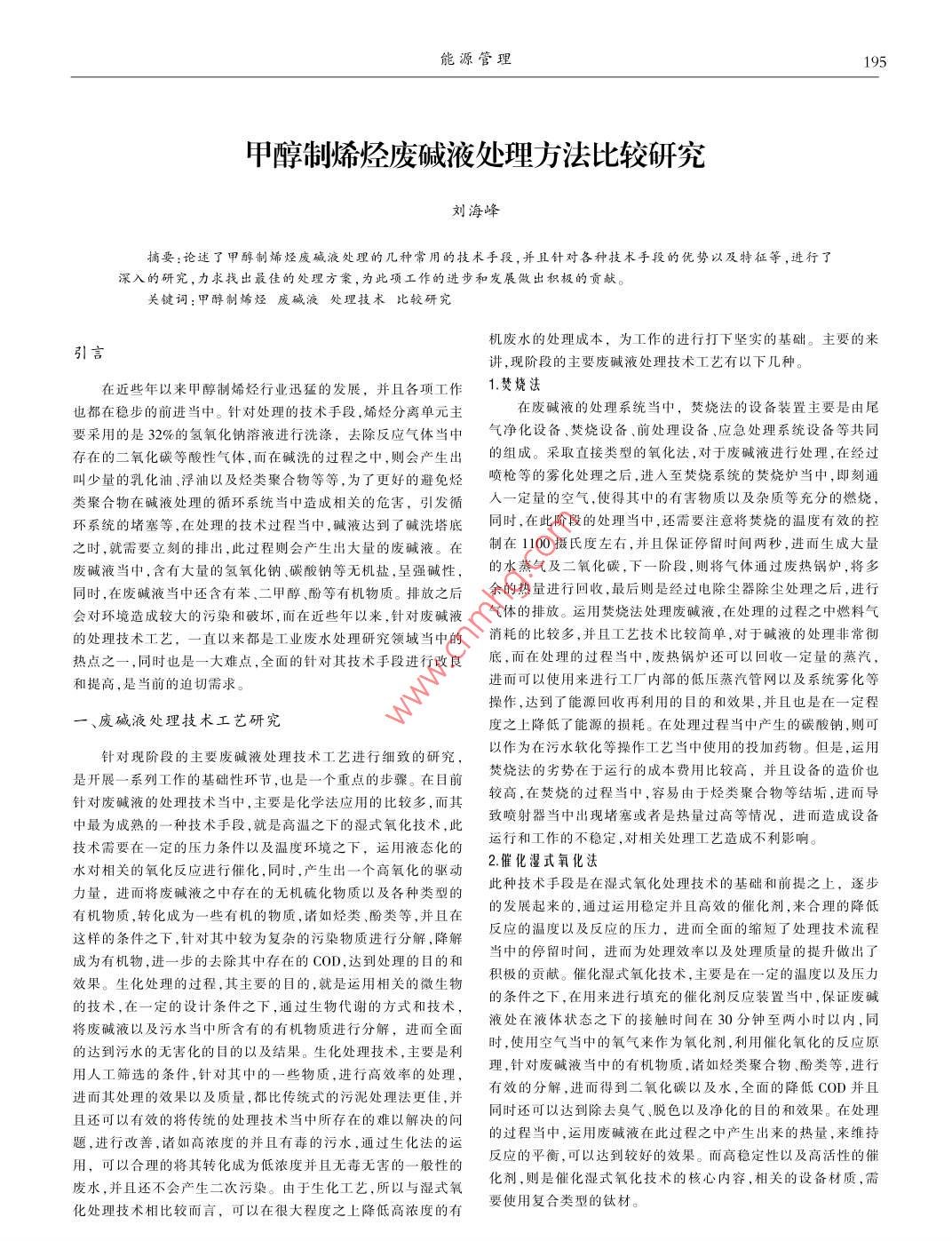 能源管理195甲醇制烯烴廢堿液處理方法比較研究劉海峰摘要:論述了甲醇制烯烴廢堿液處理的幾種常用的技術(shù)手段,并且針對各種技術(shù)手段的優(yōu)勢以及特征等,進(jìn)行了深入的研究,力求找出最佳的處理方案,為此項(xiàng)工作的進(jìn)步和發(fā)展做出積極的貢獻(xiàn)。關(guān)鍵詞:甲醇制烯烴廢堿液處理技術(shù)比較研究機(jī)廢水的處理成本,為工作的進(jìn)行打下堅(jiān)實(shí)的基礎(chǔ)。主要的來引言講,現(xiàn)階段的主要廢堿液處理技術(shù)工藝有以下幾種。在近些年以來甲醇制烯烴行業(yè)迅猛的發(fā)展,并且各項(xiàng)工作1.焚燒法也都在穩(wěn)步的前進(jìn)當(dāng)中。針對處理的技術(shù)手段烯烴分離單元主在廢堿液的處理系統(tǒng)當(dāng)中,焚燒法的設(shè)備裝置主要是由尾要采用的是32%的氫氧化鈉溶液進(jìn)行洗滌,去除反應(yīng)氣體當(dāng)中氣凈化設(shè)備、焚燒設(shè)備、前處理設(shè)備、應(yīng)急處理系統(tǒng)設(shè)備等共同存在的=氧化碳等酸性氣體,而在堿洗的過程之中,則會產(chǎn)生出的組成。 采取直接類型的氧化法,對于廢堿液進(jìn)行處理,在經(jīng)過叫少量的乳化油浮油以及烴類聚合物等等,為了更好的避免烴噴 槍等的霧化處理之后,進(jìn)人至焚燒系統(tǒng)的焚燒爐當(dāng)中,即刻通類聚合物在堿液處理的循環(huán)系統(tǒng)當(dāng)中造成相關(guān)的危害,引發(fā)循人 一定量的空氣,使得其中的有害物質(zhì)以及雜質(zhì)等充分的燃燒,環(huán)系統(tǒng)的堵塞等.在處理的技術(shù)過程當(dāng)中,堿液達(dá)到了堿洗塔底同時(shí),在此階段的處理當(dāng)中,還需要注意將焚燒的溫度有效的控之時(shí),就需要立刻的排出,此過程則會產(chǎn)生出大量的廢堿液。在制在1100攝氏度左右,并且保證停留時(shí)間兩秒,進(jìn)而生成大量廢堿液當(dāng)中,含有大量的氫氧化鈉碳酸鈉等無機(jī)鹽,呈強(qiáng)堿性,的水蒸氣及二氧化碳,下一階段,則將氣體通過廢熱鍋爐,將多同時(shí),在廢堿液當(dāng)中還含有苯、二甲醇酚等有機(jī)物質(zhì)。排放之后余的熱量進(jìn)行回收,最后則是經(jīng)過電除塵器除塵處理之后,進(jìn)行會對環(huán)境造成較大的污染和破壞,而在近些年以來,針對廢堿液氣體的排放。運(yùn)用焚燒法處理廢堿液,在處理的過程之中燃料氣的處理技術(shù)工藝,-直以來都是工業(yè)廢水處理研究領(lǐng)城當(dāng)中的消耗的 比較多,并且工藝技術(shù)比較簡單,對于堿液的處理非常徹?zé)狳c(diǎn)之一,同時(shí)也是一大難點(diǎn), 全面的針對其技術(shù)手段進(jìn)行改良底 ,而在處理的過程當(dāng)中,廢熱鍋爐還可以回收一定量的蒸汽,和提高,是當(dāng)前的迫切需求。進(jìn)而可以使用來進(jìn)行工廠內(nèi)部的低壓蒸汽管網(wǎng)以及系統(tǒng)霧化等操作,達(dá)到了能源回收再利用的目的和效果,并且也是在一定程.一、廢堿液處理技術(shù)工藝研究度之上降低了能源的損耗。在處理過程當(dāng)中產(chǎn)生的碳酸鈉,則可針對現(xiàn)階段的主要廢堿液處理技術(shù)工藝進(jìn)行細(xì)致的研究,以作為在污水軟化等操作工藝當(dāng)中使用的投加藥物。但是,運(yùn)用是開展一系列工作的基礎(chǔ)性環(huán)節(jié),也是一個(gè)重點(diǎn)的步驟。 在目前焚燒法的劣勢在于運(yùn)行的成本費(fèi)用比較高,并且設(shè)備的造價(jià)也針對廢堿液的處理技術(shù)當(dāng)中,主要是化學(xué)法應(yīng)用的比較多,而其較高,在焚燒的過程當(dāng)中,容易由于烴類聚合物等結(jié)垢,進(jìn)而導(dǎo)中最為成熟的-種技術(shù)手段,就是高溫之下的濕式氧化技術(shù),此致噴射器當(dāng)中出現(xiàn)堵塞或者是熱量過高等情況,進(jìn)而造成設(shè)備技術(shù)需要在一定的壓力條件以及溫度環(huán)境之下,運(yùn)用液態(tài)化的運(yùn)行和工作的不穩(wěn)定,對相關(guān)處理工藝造成不利影響。水對相關(guān)的氧化反應(yīng)進(jìn)行催化,同時(shí),產(chǎn)生出一個(gè)高氧化的驅(qū)動2.催化濕式氧化法力量,進(jìn)而將廢堿液之中存在的無機(jī)硫化物質(zhì)以及各種類型的此種技術(shù)手段是在濕式氧化處理技術(shù)的基礎(chǔ)和前提之上,逐步有機(jī)物質(zhì),轉(zhuǎn)化成為-.些有機(jī)的物質(zhì),諸如烴類、酚類等,并且在的發(fā)展起來的,通過運(yùn)用穩(wěn)定并且高效的催化劑,來合理的降低這樣的條件之下,針對其中較為復(fù)雜的污染物質(zhì)進(jìn)行分解,降解反應(yīng)的溫度以及反應(yīng)的壓力,進(jìn)而全面的縮短了處理技術(shù)流程成為有機(jī)物,進(jìn)一步的去除其中存在的COD,達(dá)到處理的目的和當(dāng)中的停留時(shí)間,進(jìn)而為處理效率以及處理質(zhì)量的提升做出了效果。生化處理的過程,其主要的目的,就是運(yùn)用相關(guān)的微生物積極的貢獻(xiàn)。催化濕式氧化技術(shù),主要是在一定的溫度以及壓力的技術(shù),在一定的設(shè)計(jì)條件之下,通過生物代謝的方式和技術(shù),的條件之下,在用來進(jìn)行填充的催化劑反應(yīng)裝置當(dāng)中,保i證廢堿將廢堿液以及污水當(dāng)中所含有的有機(jī)物質(zhì)進(jìn)行分解,進(jìn)而全面液處在液體狀態(tài)之下的接觸時(shí)間在30分鐘至兩小時(shí)以內(nèi),同的達(dá)到