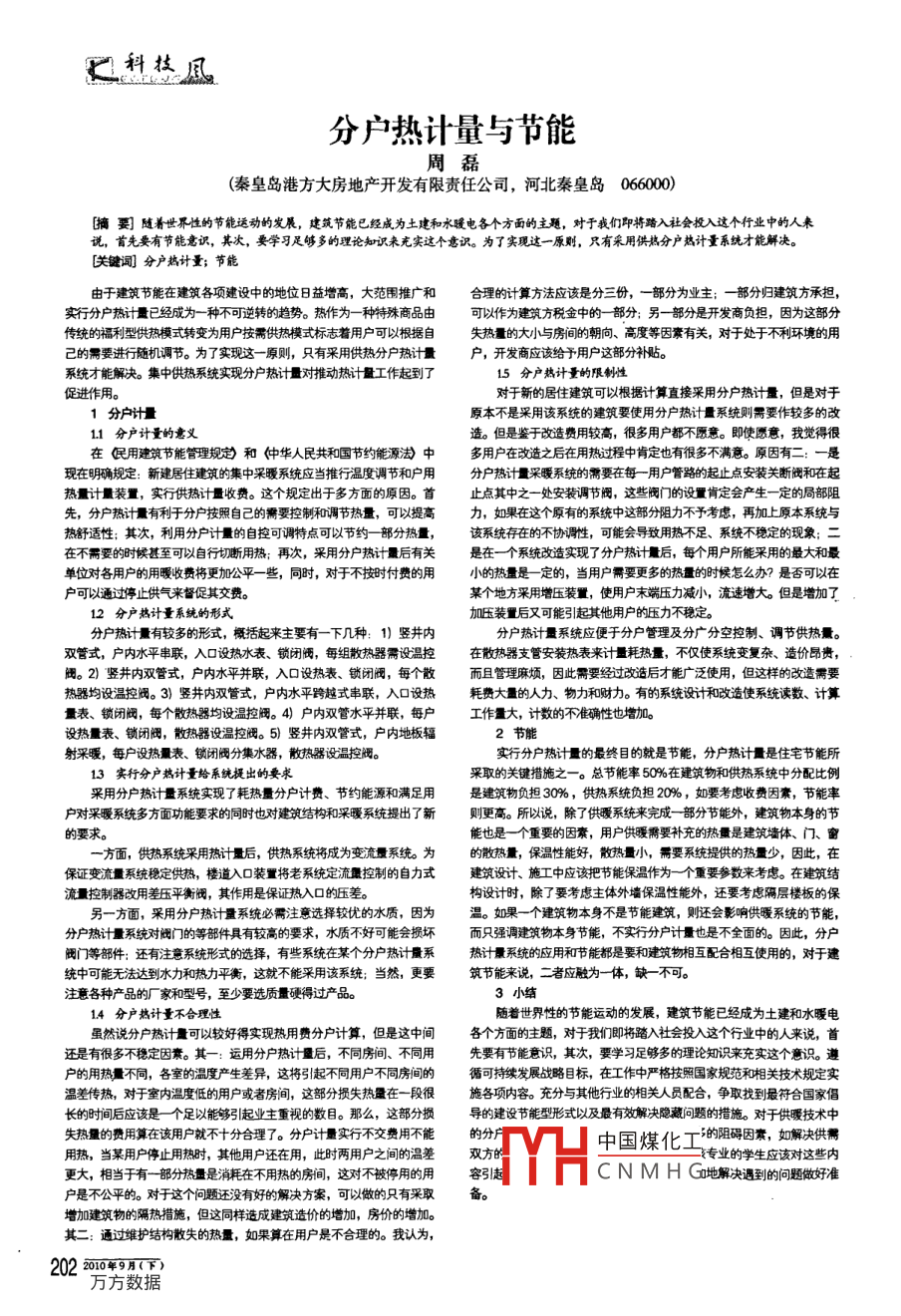料技分戶熱計(jì)量與節(jié)能周磊(秦皇島港方大房地產(chǎn)開(kāi)發(fā)有限責(zé)任公司,河北秦皇島066000鏑要]隨著世界性的節(jié)能運(yùn)動(dòng)的發(fā)展,建筑節(jié)能已經(jīng)成為土建和水暖電各個(gè)方面的主題,對(duì)于我們即將踏入社會(huì)投入這個(gè)行業(yè)中的人來(lái)說(shuō),首先要有節(jié)能意識(shí),其次,要學(xué)習(xí)足夠多的理論知識(shí)來(lái)充實(shí)這個(gè)意識(shí)。為了實(shí)現(xiàn)這一原則,只有采用供熱分戶熱計(jì)量系統(tǒng)才能解決。[關(guān)鍵詞]分戶熱計(jì)量;節(jié)能由于建筑節(jié)能在建筑各項(xiàng)建設(shè)中的地位日益增高,大范圍推廣和合理的計(jì)算方法應(yīng)該是分三份,一部分為業(yè)主;一部分歸建筑方承擔(dān),實(shí)行分戶熱計(jì)量已經(jīng)成為一種不可逆轉(zhuǎn)的趨勢(shì)。熱作為一種特殊商品由可以作為建筑方稅金中的一部分;另一部分是開(kāi)發(fā)商負(fù)擔(dān),因?yàn)檫@部分傳統(tǒng)的福利型供熱模式轉(zhuǎn)變?yōu)橛脩舭葱韫崮J綐?biāo)志著用戶可以根據(jù)自失熱量的大小與房間的朝向、高度等因素有關(guān),對(duì)于處于不利環(huán)境的用己的需要進(jìn)行隨機(jī)調(diào)節(jié)。為了實(shí)現(xiàn)這一原則,只有采用供熱分戶熱計(jì)量戶,開(kāi)發(fā)商應(yīng)該給予用戶這部分補(bǔ)貼。系統(tǒng)才能解決。集中供熱系統(tǒng)實(shí)現(xiàn)分戶熱計(jì)量對(duì)推動(dòng)熱計(jì)量工作起到了15分戶熱計(jì)量的限制性促進(jìn)作用。對(duì)于新的居住建筑可以根據(jù)計(jì)算直接采用分戶熱計(jì)量,1分戶計(jì)量原本不是采用該系統(tǒng)的建筑要使用分戶熱計(jì)量系統(tǒng)則需要作分造。但是鑒于改造費(fèi)用較高,很多用戶都不愿意。即使愿意,在用建筑節(jié)能管理規(guī)定和仲華人民共和國(guó)節(jié)約能源法中多用戶在改造之后在用熱過(guò)程中肯定也有很多不滿意。原因有二:一是現(xiàn)在明確規(guī)定:新建居住建筑的集中采暖系統(tǒng)應(yīng)當(dāng)推行溫度調(diào)節(jié)和戶用分戶熱計(jì)量采暖系統(tǒng)的需要在每一用戶管路的起止點(diǎn)安裝關(guān)斷閥和在起熱量計(jì)量裝置,實(shí)行供熱計(jì)量收費(fèi)。這個(gè)規(guī)定出于多方面的原因。首止點(diǎn)其中之一處安裝調(diào)節(jié)閥,這些閥門的設(shè)置肯定會(huì)產(chǎn)生一定的局部阻先,分戶熱計(jì)量有利于分戶技照自己的需要控制和調(diào)節(jié)熱量,可以提高力,如果在這個(gè)原有的系統(tǒng)中這部分阻力不予考慮,再加上原本系統(tǒng)與熱舒適性;其次,利用分戶計(jì)量的自控可調(diào)特點(diǎn)可以節(jié)約部分熱量,該系統(tǒng)存在的不協(xié)調(diào)性,可能會(huì)導(dǎo)致用熱不足、系統(tǒng)不穩(wěn)定的現(xiàn)象;二在不需要的時(shí)候甚至可以自行切斷用熱;再次,采用分戶熱計(jì)量后有關(guān)是在一個(gè)系統(tǒng)改造實(shí)現(xiàn)了分戶熱計(jì)量后,每個(gè)用戶所能采用的最大和最單位對(duì)各用戶的用暖收費(fèi)將更加公平一些,同時(shí),對(duì)于不技時(shí)付費(fèi)的用小的熱量是一定的,當(dāng)用戶需要更多的熱量的時(shí)候怎么辦?是否可以在戶可以通過(guò)停止供氣來(lái)督促其交費(fèi)某個(gè)地方采用增壓裝置,使用戶末端壓力減小,流速增大。但是增加了12分戶熱計(jì)量系統(tǒng)的形式加壓裝置后又可能引起其他用戶的壓力不穩(wěn)定。分戶熱計(jì)量有較多的形式,概括起來(lái)主要有一下幾種:1)豎井分戶熱計(jì)量系統(tǒng)應(yīng)便于分戶管理及分廣分空控制、調(diào)節(jié)供熱量管式,戶內(nèi)水平串聯(lián),入口設(shè)熱水表、鎖閉閥,每組散熱器需設(shè)溫控在散熱器支管安裝熱表來(lái)計(jì)量耗熱量,不僅使系統(tǒng)變復(fù)雜、造價(jià)昂貴,閥。2)豎井內(nèi)雙管式,戶內(nèi)水平并聯(lián),入口設(shè)熱表、鎖閉閥,每個(gè)散而且管理麻煩,因此需要經(jīng)過(guò)改造后才能廣泛使用,但這樣的改造需要熱器均設(shè)溫控閥。3)豎井內(nèi)雙管式,戶內(nèi)水平跨越式串聯(lián),入口設(shè)熱耗費(fèi)大量的人力、物力和財(cái)力。有的系統(tǒng)設(shè)計(jì)和改造使系統(tǒng)讀數(shù)、計(jì)算量表、鎖閉閥,每個(gè)散熱器均設(shè)溫控閥。4)戶內(nèi)雙管水平并聯(lián),每戶工作量大,計(jì)數(shù)的不準(zhǔn)確性也增加。設(shè)熱量表、鎖閉閥,散熱器設(shè)溫控閥。5)豎井內(nèi)雙管式,戶內(nèi)地板輻2節(jié)能射采暖,每戶設(shè)熱量表、鎖閉閥分集水器,散熱器設(shè)溫控閥。實(shí)行分戶熱計(jì)量的最終目的就是節(jié)能,分戶熱計(jì)量是住宅節(jié)能所13實(shí)行分戶熱計(jì)量給系統(tǒng)提出的要求采取的關(guān)鍵措施之一??偣?jié)能率50%在建筑物和供熱系統(tǒng)中分配比例采用分戶熱計(jì)系統(tǒng)實(shí)現(xiàn)了耗熱量分戶計(jì)費(fèi)、節(jié)約能源和滿足用是建筑物負(fù)拒30%,供熱系統(tǒng)負(fù)擔(dān)20%,如要考慮收費(fèi)因素,節(jié)能率戶對(duì)采暖系統(tǒng)多方面功能要求的同時(shí)也對(duì)建筑結(jié)構(gòu)和采暖系統(tǒng)提出了新則更高。所以說(shuō),除了供暖系統(tǒng)來(lái)完成一部分節(jié)能外,建筑