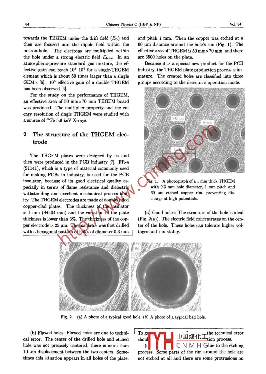 cPc(HEP&NP),2010,34(1):8387Chinese Physics Cvol.34,No.1,Jan.2010Experimental study on the performance of asingle-THGEM gas detectorAN Zheng-Hua(安正華)21) LU Jun- Guang(呂軍光) WANG Zhi-Gang(王志剛)2 CAI Xiao(蔡嘯)DONG Ming-Yi(董明義)2 FANG Jian(方建)} Hu Tao(胡濤)}LUQi-Wen(呂綺雯)23NING Fei-Peng(寧飛鵬}3SUNL-Jun(孫麗君) suN Xi-Lei(孫希磊)2WANG Xiao-Dong(王曉東)3 XUE Zhen(薛鎮(zhèn))14 YU Bo-Xiang(俞伯祥)ZHANG Ai-Wu(章愛武)2 ZHOU L(周莉)} ZHENG Yang-Heng(鄭陽恒)21 Institute of High Energy Physics, CAS, Beijing 100049, China2 Graduate University of Chinese Academy of Sciences, Beijing 100049,China3 Shanxi University, Taiyuan 030006, ChinaUniversity of Science and Technology of China, Hefei 230026, ChinaAbstract A kind of thick GEM-like gaseous electron multiplier(THEM), which is mechanically an expansionof the GEM with its various dimensions being enlarged, is studied. The leak current of THGEM plates ismeasured. The effective gain and energy resolution of a single THGEM are studied with a source of SFe,andhe effective gain of the single THGEM versus the electric field strength in the induction region is investigatedThe results show that the leak current of THGEM plates is less than 200 pA. In an atmospheric-pressurestandard gas mixture, 8x10 effective gain and about 32% energy resolution can be reached for the single-THGEM detectorKey words gas electron multipliers, hole multiplier, effective gain, energy resolutionPAcs29.40.-n,29.40.C8,29.40Gx1 Introductionand 70 um holes arranged in a triangular pattern with140 Hm between centers. Generally the configura-Hole multipliers, because they are especially at- tion of the micron holes of GEM is double-conical.tractive, have been the subject of numerous studies THGEM is fabricated with a standard printed-circuitand widely applied in the field of particle physics ex- board(PCB )technique. The electrode of THGEMperiments. The famous and extensively studied hole made by drilling millimetric holes in a 0.5-2 mm thickmultiplier is the gas electron multiplier (GEm)1. Cu-plated G-10 PCB around each hole chemicallyWhat we describe here is a thick GEM-like gaseous etched the rim by about 0.1 mm [4 This similari-electron multiplier(THGEM)(2 which is mechani- ty of structure and difference in the dimension scalescally an expansion of GEM, operating at atmospheric give a similar operation principle and different experpressure. THGEM's structure is similar to that of iment results in THGEM and GEMGEM, but it has a geometrical dimension expansionThe THGEM operation principle is similar to thatIn comparison with a standard GEM, the spatial res- of standard GEM. Upon application of a high volt-olution of THGEM (sub-millimeter)is not as good as age difference across the electrodes of THGEM,aGEM's(a few tens of microns)[3, but THGEM is strong electric field(Ehole) is established within themore robust, cheaper and can reach higher gain than holes. Calculating the strength of the electric field ofGEMTHGEM by MAXWELL 2D 5], the Hole within theMost of the GEMs used are of a standard design: hole can reach a maximum of 25 kv/cm. Electrons50 um thick kapton foil with 5 um copper electrodedinami- he drift region drift中國煤化工Received 19 January 2009, Revised 10 February 2009CNMHGSupported by National Natural Science Foundation of China(10675146, 10775151, 10775181)1Email: anzh@ihep.accn@2009 Chinese Physical Society and the Institute of High Energy Physics of the Chinese Academy of Sciences and the Instituteof Modern Physics of the Chinese Academy of Sciences and IOP Publishing LtdC(HEP NP)ol.34towards the THGEM under the drift field(Ep)and and pitch 1 mm. Then the copper was etched at athen are focused into the dipole field within the 60 um distance around the hole's rim(Fig. 1).Themicron-hole. The electrons are multiplied within effective area of THGEM is 50 mmx70 mm, and therethe hole under a strong electric field Hole. In an are 3500 holes on the plateatmospheric-pressure standard gas mixture, the ef-Because it is a special new product for the PCBfective gain can reach 10-10 for a single-THGEM industry, the THGEM plate production process is im-GEMs 6]. 10@ effective gain of a double THGEM groups according to the detector's operata ng gelement which is about 50 times larger than a single mature. The created holes are classified into threFor the study on the performance of THGEMn effective area of 50 mmx70 mm ThGeM boardwas produced. The multiplier property and the energy resolution of single THGEM were studied witha source of 56Fe 5.9 ke V X-rays2 The structure of the Them elec-The THGEM plates were designed by us andthen were produced in the PCB industry 7. FR-4(S1141), which is a type of material commonly usedfor making PCBs in industry, is used for the PCBinsulator, because of its good electrical quality es-Fig. 1. A photograph of a 1 mm thick THGEMpecially in terms of fame resistance and dielectricwith 0.3 mm hole diameter, 1 mm pitch andwithstanding and excellent mechanical process abil-60 Hm etched copper rim, preventing dis-ity. The THGEM electrodes are made of double-sidedtarge at high potentialscopper-clad plates. The thickness of the insulatoris 1 mm(=0.04 mm) and the variation of the plate(a) Good holes: The structure of the hole is idealthickness is lower than 3%. The thickness of the cop(Fig. 2(a)). The electric field concentrates on the cen-per electrode is 25 um. The insulator was first drilled ter of the hole. These holes can tolerate higher volwith a hexagonal pattern of holes of diameter 0.3 mmI tages and run stablyabLE natFig. 2.(a)a photo of a typical good hole;(b)a photo of a typical bad hole(b)Flawed holes: Flawed holes are due to techni- Tocal error. The center of the drilled hole and etched shotL中國煤化 Itie tence errohole was not precisely centered, there is more thanC MH Due to the etching10 um displacement between the two centers. Some- process. Some parts of the rim around the ho