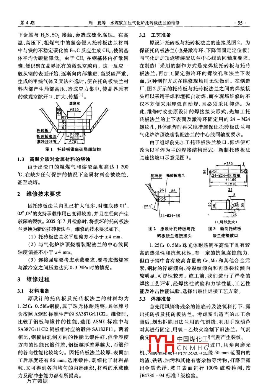 Aug.2006化肥設(shè)計(jì)第44卷第4期●54●Chemical Fertilizer Design2006年8月水煤漿加壓氣化爐托磚板法蘭的維修周夏,李祥華,孫新華,黃敏,謝春暉(山東華魯恒升化工股份有限公司,山東德州253024)摘要: 從高溫爐渣及粗煤氣的沖蝕、高溫粗煤氣的腐蝕、高溫介質(zhì)對(duì)金屬材料的燒蝕等方面分析了水煤漿加壓氣化爐托磚板法蘭損毀的原因;介紹了新更換的托磚板法蘭的技術(shù)要求、維修過(guò)程和改進(jìn)措施。關(guān)鍵詞:水煤漿加壓氣化爐;托磚板法蘭;雛修中圖分類(lèi)號(hào): TQ 055. 81文獻(xiàn)標(biāo)識(shí)碼: B文章編號(hào):1004 - 8901 (2006)04 - 0054 -03Maintenance of Refractory Support Flange in Water Coal Slurry Pressurized GasifierZHOU Xia, u Xiang-hua, SUN Xin-hua, HUA Min, XIE Chun-hui( Shandong Hualu Hengsheng Chemical Enginering Stock Company Lld. ,Dezhou Shandong 253024 China)Abstract: The damaged ceause of the refraclory support flange of the water coal slurry pressurized gasifier was analyzed from aspects of erosion of hightemperature sludge of gasifier and crude coal gas, corrosion of high temperature crude coal gas and buming through ect. of metal material from high tem-perature medium; technical requirements, maintenance process and improvement measure were introduced for the newly replaced refractrory supportflange.Key words: water coal slumy pressurized gasifer; refractory support flange; maintenance山東華魯恒升化工股份有限公司水煤漿加壓1損毀原因分析氣化裝置為國(guó)內(nèi)首套國(guó)產(chǎn)化裝置,于2004年10月開(kāi)始試車(chē)投用。2005年4月上旬,1臺(tái)氣化爐在累經(jīng)分析,造成托磚板法蘭損毀的原因是:①高計(jì)運(yùn)行2964h后因托磚板溫度超過(guò)280C而故障溫爐渣及粗煤氣的沖蝕;②粗煤氣對(duì)金屬材料造成停車(chē),進(jìn)爐檢查發(fā)現(xiàn)損毀后的渣口磚由原φ520mm的高溫腐蝕;③高溫介質(zhì)對(duì)金屬材料的燒蝕。~φ720mm的臺(tái)階孔被沖蝕成約φ900mm的非規(guī)1.1高溫爐渣及 粗煤氣的沖蝕則直孔,托磚板法蘭內(nèi)徑也由原來(lái)的φ781mm被沖托磚板錐底磚局部結(jié)構(gòu)見(jiàn)圖1。在渣口磚完好蝕成約φ900mm,法蘭上有徑向深約50mm的2道或未遭受?chē)?yán)重?fù)p毀時(shí),出燃燒室的爐渣主要在氣化裂紋,激冷環(huán)環(huán)管上發(fā)現(xiàn)有縱向裂紋和數(shù)個(gè)斜向上爐中心軸線(xiàn)附近φ520 ~ φ608 mm的范圍內(nèi)落下,一的孔洞,下降簡(jiǎn)嚴(yán)重鼓包,有裂縫。因當(dāng)時(shí)沒(méi)有托般不會(huì)與托磚板法蘭直接接觸。但在錐底01"、磚板法蘭備件,檢修時(shí)僅更換了錐底磚、激冷環(huán)和02*、03"爐渣口磚損毀后,高溫、高速的粗煤氣攜帶下降筒。2005年7月初該臺(tái)氣化爐又一次故障停著熔融態(tài)爐渣對(duì)托磚板法蘭產(chǎn)生嚴(yán)重的沖刷、剪切車(chē),經(jīng)檢查發(fā)現(xiàn):渣口磚內(nèi)孔被沖蝕成φ780mm左作用,使托磚板法蘭內(nèi)孔處材料表層轉(zhuǎn)化為表面變右;托磚板法蘭從內(nèi)孔沿徑向的裂紋擴(kuò)展至70 ~ 80形能,從而形成對(duì)托磚板法蘭的沖蝕。mm;激冷環(huán)環(huán)管上有裂紋、翻邊;下降筒有嚴(yán)重變形1.2高溫粗煤氣的腐 蝕和裂縫。這次檢修除了更換激冷環(huán)環(huán)管和下降簡(jiǎn)在氣化爐燃燒室生成的粗煤氣中除含有Co,外,還對(duì)托磚板法蘭進(jìn)行了更換。H2,CO2和H20等主要成分外,還含有H2S,SO2等托磚板及托磚板法蘭不僅承載燃燒室耐火襯微量成分進(jìn)入激冷室前溫度高達(dá)1200C,壓力為里質(zhì)量,同時(shí)通過(guò)與其相連的激冷環(huán)承載下降簡(jiǎn)、5.8中國(guó)煤化工料在高溫氧化性介上升簡(jiǎn)質(zhì)量。托磚板法蘭的損壞與否,將直接影響質(zhì)(CMHCNMHG成氧化腐蝕。高溫氣化爐的正常使用。筆者僅就托磚板法蘭損毀的作者簡(jiǎn)介:周夏(1968年- ),男,山東陵縣人, 1990年畢業(yè)于山東工原因,以及更換托磚板法蘭的技術(shù)要求、維修過(guò)程業(yè)大學(xué)機(jī)械制造與設(shè)備專(zhuān)業(yè),高級(jí)工程師,從事水煤漿氣化設(shè)備技和改進(jìn)措施作如下介紹。術(shù)管理工作。第4期周夏等水煤漿加壓氣化爐托磚板法蘭的維修55●下金屬與H2S,SO2接觸,會(huì)造成硫化腐蝕。在高3.2工藝準(zhǔn)備溫高壓下,粗煤氣中的氫會(huì)侵人托磚板法蘭材料原設(shè)計(jì)托磚板與托磚板法蘭的連接見(jiàn)圖2。為中與鐵的不穩(wěn)定碳化物Fe3C反應(yīng)生成CH, ,使鋼基保證托磚板法蘭(也是激冷環(huán)、下降筒固定定位板)體平均含碳量降低。由于CH,在鋼基體內(nèi)擴(kuò)散困與氣化爐爐頂燒嘴裝配法蘭中心線(xiàn)的同軸度要求,難,便積聚在晶界原有的微觀(guān)空隙內(nèi)。這一反應(yīng)一在制造廠(chǎng)采用的制作方式是先焊接托磚板與托磚般從鋼的表面開(kāi)始,逐漸向內(nèi)部推進(jìn),當(dāng)脫碳嚴(yán)重,板法蘭,再加工固定激冷環(huán)的螺紋孔和法蘭下表生成的甲烷氣體又無(wú)法外逸時(shí),便在托磚板法蘭材面,這種制作方式在維修現(xiàn)場(chǎng)則無(wú)法做到。在制造料內(nèi)部產(chǎn)生局部高壓,造成應(yīng)力集中,使晶界原有廠(chǎng),圖2所示的托磚板與托磚板法蘭之間的焊接接的微觀(guān)空隙開(kāi)口、擴(kuò)大、傳播。頭可以采用平焊和埋弧自動(dòng)焊,而在現(xiàn)場(chǎng)維修時(shí)不燃燒室僅不方便采用埋弧自動(dòng)焊,且必須采
