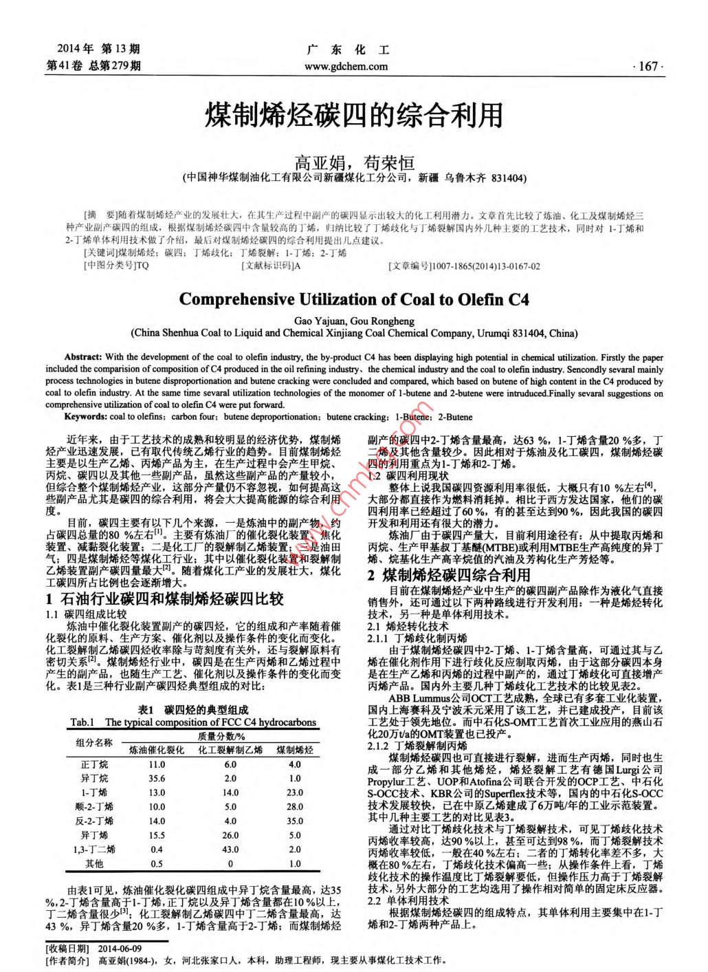 廣東化工2014年第13期.168.www.gdchem.com第41卷總第279期表2 丁烯歧化工藝技術(shù)比較Tab.2_ Comparision of butene disproportionation technologies項目/工藝ABB Lummus公司OCT法國IFP公 司Meta-4中石化S-OMT技術(shù)大連化物所丁烯、2-乙烯丁烯、1-乙烯丁烯和乙烯催化劑鎢系錸基過渡金屬氧化物負載型MgMoMCM22分子篩反應(yīng)器固定床移動床固定床.反應(yīng)溫度/C150-40020-5030060~70反應(yīng)壓力MPa1~3.01.0轉(zhuǎn)化率/%85~92 .987.760-90丙烯選擇性%91-9795~-989890-95工藝成熟,即可低溫反應(yīng),對雜集成丁烯歧化、特點處于實驗室探索階段單獨使用也可聯(lián)用質(zhì)敏感,未工業(yè)化臨氫異構(gòu)化及分離工藝表3丁烯裂解工藝技術(shù)比較Tab.3 Comparision of butylene cracking technologies德國Lurgi公司Propylur工藝UOP公司的OCP工藝中石化S-OCC技術(shù)原料C4~C7烯烴C4~C8烯烴C4餾分催化劑.ZSM-5沸石分子篩高性能ZSM-5420- 490500-600530-5500.1~0.20.1~0.558丙烯收率/%40-45362.2.1 1-丁烯1丁 烯可作為生產(chǎn)HDPE及LLDPE時的共聚單體。在煤制烯烴3建議中的乙烯用于生產(chǎn)HDPE或LLDPE時, 1-丁烯則是一種不可缺少的原料,大多數(shù)公司的1-丁烯產(chǎn)量較小,僅能滿足自身需求,外銷越多,因此充分利用這部分對提高能漏能源完合利用度,量較小,因此,利用煤制烯烴的碳四生產(chǎn)1-丁烯可以減少對外依賴度少對石油進口依賴有積極的作用。進行地區(qū)統(tǒng)籌具各規(guī)模從碳四中分離出1-丁烯產(chǎn)品,可采用如下工藝:首先對碳四(2)煤制烯烴碳四的綜合利用要進進行加氫,使碳四中的丁二烯與氫氣反應(yīng)生成1-丁烯,然后運用效應(yīng),以提高經(jīng)濟效益,如180萬噸/年甲醇制烯烴廠年產(chǎn)碳四約9醚化技術(shù)進行分離。由于在碳四中含有異丁烯,而異丁烯與1-丁萬噸,在煤制烯烴集中區(qū)域要合理規(guī)劃利用路線,避免產(chǎn)品重復(fù)烯沸點只相差0.6 C,相對揮發(fā)度僅相差0.022,用常規(guī)的蒸餾方引起的不當(dāng)競爭。(3)煤制烯烴碳四的綜合利用要根據(jù)企業(yè)自身的具體情況來法很難分離,因此一般采用化學(xué)分離法,即醚化技術(shù),使異丁烯選擇,若生產(chǎn)HDPE或LLDPE產(chǎn)品,需要1-丁烯共聚單體,則可將和甲醇反應(yīng)生成MTBE,脫除了異丁烯的碳四再采用超細精餾技碳四分離生產(chǎn)1-丁烯產(chǎn)品,以減少對外依存度:若不生產(chǎn)以上兩術(shù)進行精制,進而得到純度較高的1-丁烯產(chǎn)品。另外1丁烯水合法可以生產(chǎn)仲丁醇,進而生產(chǎn)甲乙酮,甲乙種聚乙烯產(chǎn)品,廠區(qū)位置偏遠,液體產(chǎn)品運輸不方便,可考慮洞是一種優(yōu)良的有機溶劑和重要的有機精細合成原料。除此外1-采用烯烴轉(zhuǎn)化技術(shù),將丁烯轉(zhuǎn)化為丙烯,進而生產(chǎn)聚丙烯產(chǎn)品。(4)企業(yè)在一定規(guī)模基礎(chǔ)上可將碳四綜合利用路線做長,以提丁烯還可以通過氧化生產(chǎn)環(huán)氧丁烷,氧化脫氫制丁二烯等。高其抗市場風(fēng)險能力,進而保證總體經(jīng)濟效益。2.2.22-丁烯由于煤制烯烴碳四中2- 丁烯約是1-丁烯的3倍,若所需1-丁烯量較大,可采用異構(gòu)化技術(shù)將2-丁烯轉(zhuǎn)化為1-丁烯,比較成熟的參考文獻工藝有Lummus公司開發(fā)的CPT技術(shù)和中石化.上海石油化工研究[1]白頤.我國C4烴和芳烴及其下游產(chǎn)品發(fā)展機會分析[],化學(xué)工業(yè),院開發(fā)的碳四異構(gòu)化技術(shù)。發(fā)時做工化技反應(yīng)生成2-丙基庚醇, 2-丙基庚醇是生2009. 27(); 1-2.丁烯也可與合成氣[2]李濤,柏基業(yè),姚小利.碳四烴的綜合利用研究[0].石油化工,鄰苯二甲酸二(2-丙基庚)酯(DPHP)的主要原料。DPHP是一種增塑2009. 38(11): 1245-1252.劑,用于取代因安全性問題正在慢慢淘汰的鄰苯二甲酸二辛酯[3]封娜,姚日遠,徐忠娟.催化裂化C4烴分離化工應(yīng)用進展及開發(fā)設(shè)想(DOP)增塑劑。DPHP增塑劑將重點應(yīng)用于電線電纜塑料領(lǐng)域,由[]廣東化工,2010. 37(3); 42-44.于DPHP增塑劑的廣泛應(yīng)用,作為生產(chǎn)DPHP增塑劑原料的2-丙烯[4]王湛,劉慶華煉油廠碳四資源的生產(chǎn)與發(fā)展前景[J].煉油與化工, 2010,庚醇需求量也將增加。2-丙基庚醇生產(chǎn)工藝為,碳四烯烴與C0和5: 9-11.H2進行羰基合成生成戊醛,戊醛在氫氧化鈉的催化下縮合進一步生成2-丙基3-丁基丙烯醛,然后加氫精制生成2-丙烯庚醇。主要工(本文文獻格式:高亞娟,茍榮恒.煤制烯烴碳四的綜合利用[J].廣藝技術(shù)有BASF羰基合成技術(shù)和DOWDAVY聯(lián)合公司的低壓羰基東化工,2014, 41 (13): 167-168)合成技術(shù)。另外2-丁 烯也可間接烷基化生產(chǎn)烷基化汽油、在過渡絡(luò)合物催化劑作用下與合成氣制備2-甲基丁醇、二聚制辛烯、與醋酸在酸性催化劑作用下制仲丁酯以及采用水合法生產(chǎn)仲丁醇等。