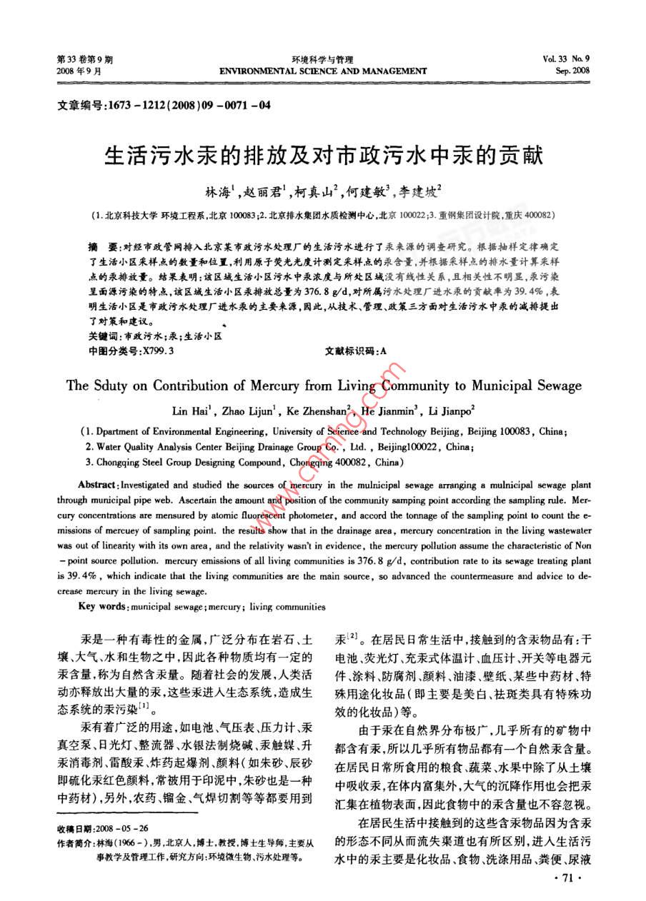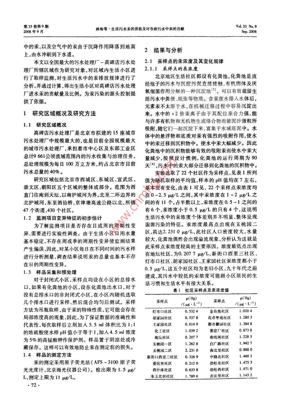 第33卷第9期境科學(xué)與管理Vol 332008年9月ENVIRONMENTAL SCIENCE AND MANAGEMENT文章編號:1673-1212(2008)09-0071-04生活污水汞的排放及對市政污水中汞的貢獻(xiàn)林海,趙麗君!,柯真山2,何建敏3,李建坡2(1.北京科技大學(xué)環(huán)境工程系,北京100083;2北京排水集團水質(zhì)檢測中心,北京100023.重鋼集團設(shè)計院,重慶400082)摘要:對經(jīng)市政管網(wǎng)排入北京苿市政污水處理廠的生活污水進(jìn)行了汞來源的調(diào)查研究。根據(jù)抽樣定律確定了生活小區(qū)釆樣點的數(shù)量和位置,利用原子熒光光度計測定采樣點的汞含量,并根據(jù)采樣點的排水量計算采樣點的汞排放量。結(jié)果表明:該區(qū)域生活小區(qū)污水中汞濃度與所處區(qū)域沒有線性關(guān)系,且相關(guān)性不明顯,汞污染呈面源污染的特點,該區(qū)域生活小區(qū)汞排放總量為376.8gd,對所屬污水處理廠進(jìn)水汞的貢獻(xiàn)率為39.4%,表明生活小區(qū)是市政污水處理廠進(jìn)水汞的主要來源,因此,從技術(shù)、管理、政策三方面對生活污水中汞的減排提出了對策和建議。關(guān)鍵詞:市政污水;汞;生活小區(qū)中圖分類號:X799.3文獻(xiàn)標(biāo)識碼:AThe Sduty on Contribution of Mercury from Living Community to Municipal SewageLin Hai, Zhao Lijun, Ke Zhenshan, He Jianmin, Li Jianpo(1. Dpartment of Environmental Engineering, University of Science and Technology Beijing, Beijing 100083, China;2. Water Quality Analysis Center Beijing Drainage Group Co, Ltd, Beijingl00022, China;3. Chongqing Steel GroAbstract: Investigated and studied the sources of mercury in the municipal sewage arranging a mulnicthrough municipal pipe web. Ascertain the amount and position of the community samping point according the sampling rule. Mer-cury concentrations are mensured by atomic fuorescent photometer, and accord the tonnage of the sampling point to count the e-missions of mercuey of sampling point. the results show that in the drainage area, mercury concentration in the living wastewaterwas out of linearity with its own area, and the relativity wasn't in evidence, the mercury pollution assume the characteristic of Nonpoint source pollution. mercury emissions of all living communities is 376. 8 g/d, contribution rate to its sewage treating plantis 39. 4%, which indicate that the living communities are the main source, so advanced the countermeasure and advice to de-crease mercury in the living sewageKey words: municipal sewage; mercury; living communities汞是一種有毒性的金屬,廣泛分布在巖石、土汞2。在居民日常生活中,接觸到的含汞物品有:干壤、大氣、水和生物之中,因此各種物質(zhì)均有一定的電池?zé)晒鉄?、充汞式體溫計、血壓計、開關(guān)等電器元汞含量,稱為自然含汞量。隨著社會的發(fā)展,人類活件、涂料、防腐劑、顏料、油漆、壁紙、某些中藥材、特動亦釋放出大量的汞,這些汞進(jìn)入生態(tài)系統(tǒng),造成生殊用途化妝品(即主要是美白、祛斑類具有特殊功態(tài)系統(tǒng)的汞污染1。效的化妝品)等汞有著廣泛的用途,如電池氣壓表、壓力計、汞由于汞在自然界分布極廣,幾乎所有的礦物中真空泵、日光燈整流器、水銀法制燒堿、汞觸媒、升都含有汞,所以幾乎所有物品都有一個自然汞含量。汞消毒劑雷酸汞、炸藥起爆劑、顏料(如朱砂、辰砂在居民日常所食用的糧食蔬菜、水果中除了從土壤即硫化汞紅色顏料常被用于印泥中朱砂也是一種中吸收汞在體內(nèi)富集外,大氣的沉降作用也會把汞中藥材),另外農(nóng)藥鎦金、氣焊切割等等都要用到匯集在植物表面因此食物中的汞含量也不容忽視。收稿日期:2008-05-26在居民生活中接觸到的這些含汞物品因為含汞作者簡介:林海(1%6-),男,北京人,博土,教授,博土生導(dǎo)師,主要從的形態(tài)不同從而流失渠道也有所區(qū)別,進(jìn)入生活污事教學(xué)及管理工作,研究方向:環(huán)境微生物污水處理等。水中的汞主要是化妝品、食物洗滌用品糞便、尿液第3卷第9期2008年9月林海等·生活污水汞的排放及對市政污水中汞的貢獻(xiàn)VoL 33 No 9中的汞以及空氣中的汞由于沉降作用降落到地面2結(jié)果與分析上,由水沖刷到下水道。本文以全國最大的污水處理廠-高碑店污水處2.1采樣點的汞濃度及其變化規(guī)律理廠所轄區(qū)域作為研究對象對區(qū)域內(nèi)生活小區(qū)進(jìn)2.1.1采樣點的汞濃度行了取樣監(jiān)測,對生活污水中的汞排放規(guī)律進(jìn)行了北京地區(qū)生活社區(qū)都設(shè)有化糞池,化糞池是流分析,并通過計算,得出生活小區(qū)對高碑店污水處理經(jīng)池子的污水與沉淀污泥直接接觸有機固體及厭廠進(jìn)水汞的貢獻(xiàn)量及比例。為汞污染的源頭控制提氧細(xì)菌作用分解的一種沉淀池。可以有效截留生供了依據(jù)。活污水中糞便、紙張等物質(zhì)。含汞廢水排入水體后,元素汞不太溶于水,在機械遷移過程中容易沉淀出研究區(qū)域概況及研究方法來。水中的+2價汞離子由于其配位親合力強,能1.1研究區(qū)域概況與許多有機物和無機物生成絡(luò)合物而被泥沙微粒高碑店污水處理廠是北京市擬建的15座城市假圖它們面米列水用中由水污水處理廠中規(guī)模最大的,也是目前全國規(guī)模最大中的汞遷移到沉積物中。使水中汞大幅減少。因此的城市污水處理廠承擔(dān)著市中心區(qū)及東部工業(yè)區(qū)化糞池中的沉積物能夠有效的吸附汞而使水中汞大總計96公頃流域范圍內(nèi)的污水