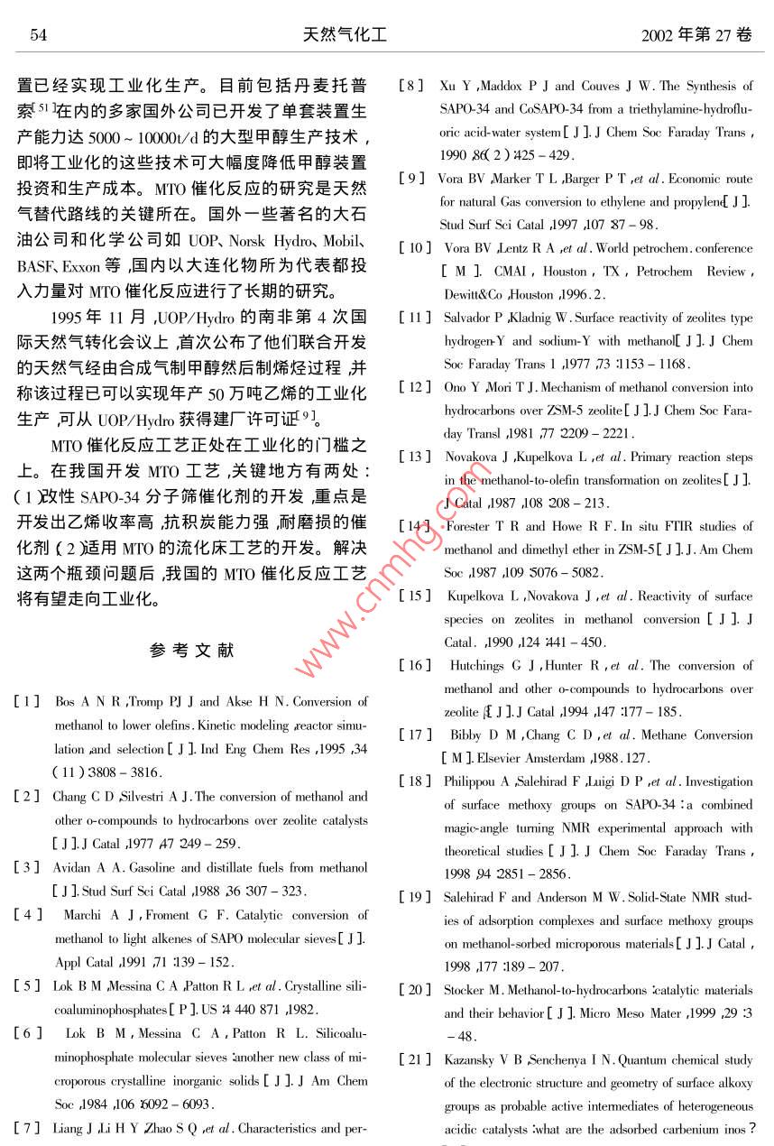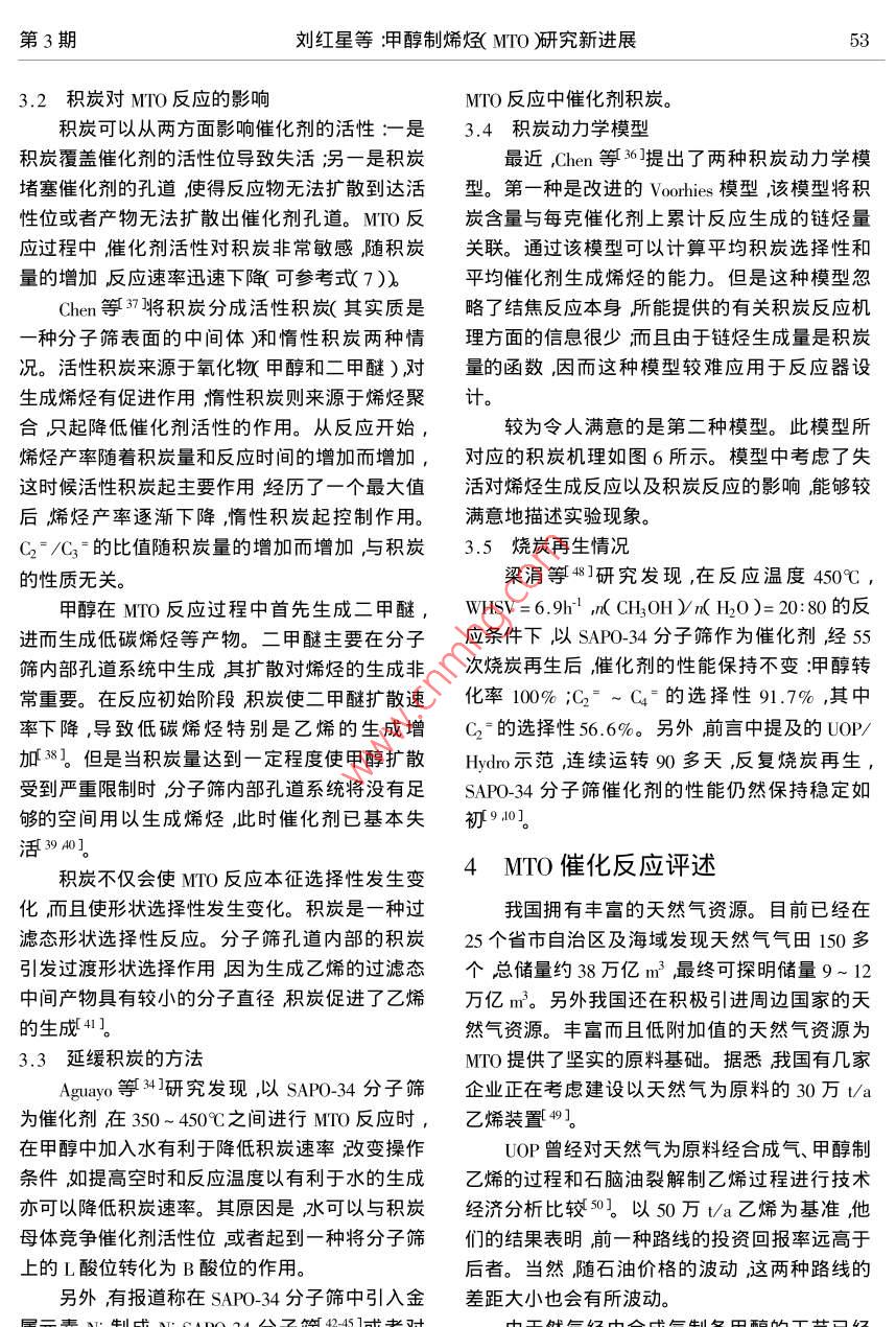 50天然氣化工2002年第27卷CHsOHz0HCHzOH, AISi~HzOCH3AISi 、SCHOCHCH3OHCH3-CHsOHsi圖1 SAP0-34 分子篩上表面甲氧基的形成過(guò)程1415]Fig. 1 Formation of surface methoxy1 groups on the SAPO-34 14.15]cHsotype ItypeIT圖2 SAP0-34 分子篩上的兩種甲氧基Fig.2 Two types of methoxy groups on SAPO-34. 1.2 生成第一個(gè)C-C鍵和Rake機(jī)理等20]。以O(shè)xium ylide機(jī)理為例:甲.甲氧基生成后,如何生成第- -個(gè)C-C鍵眾氧基中一個(gè)C-H質(zhì)子化生成C-H+與甲醇分說(shuō)紛紜相關(guān)機(jī)理有20余種之多。但基本上可子中- OH作用形成氫鍵然后生成乙基氧C ]進(jìn)以歸為以下幾類(lèi):0xium ylide機(jī)理、Carbene機(jī)理、而生成第一個(gè)C- C鍵,詳細(xì)過(guò)程如圖3所示。Carbocationic機(jī)理、自由基機(jī)理、Carbon pool 機(jī)理HO,HCHz+H2C-CH2+H2O圖3表面 甲氧基和甲醇作用生成第一個(gè)C- C鍵的過(guò)程21]Fig.3 Formation of the first C- C bond via a concerted reaction of thesurface methoxy group with a methanol molecule 21]1.3 C3、C4的生成過(guò)程沒(méi)有Cs以上的產(chǎn)物。C3、C4 的生成有以下5種SAPO-34分子篩催化MTO反應(yīng)時(shí)產(chǎn)物分布路線:較簡(jiǎn)單,以C2~C4特別是乙烯、丙烯為主幾乎路線122232]:51劉紅星等:甲醇制烯烴( MITO研究新進(jìn)展第3期+methylated SAP-34etheneHydride abstrctionbeta-elimonatopmn/alkanealkene路線21241:methylated SAP0-34 + methanolvi ako alkene/ alkane路線3-25]:CH2CH3CHzCH2CHzCH3H一+ CH:CH=CHCH+C=C一一toE三Al~sAI'~SAI~Si路線42627]:CH3CHCH2 Prpeatin H/9C(CH)2absorbedpbaseAl-siA1-deompxstion==..oomopstion = ==releasedbydroxil+HxC=CH-CH3+HCCH=CH-CHs Besousproducts+H:C=CH2+HzO+H2O路線s( Carbon pol機(jī)理S38-31:CzH4C3H6CHOH一