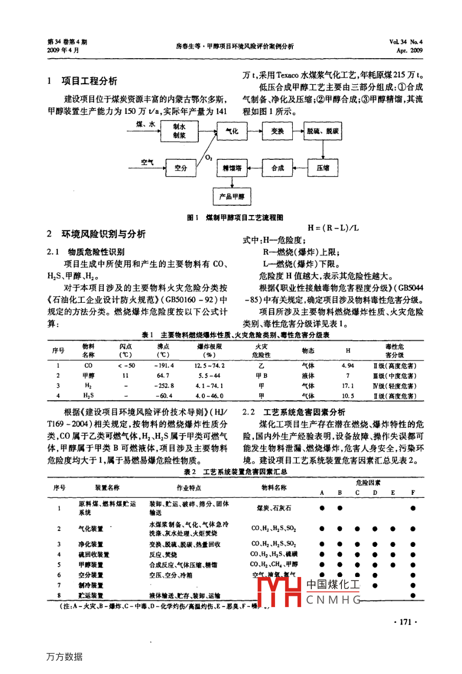 第34卷第4期環(huán)境科學與管理Vol 34 Na 4200年4月ENVTRONMENTAL SCTENCE AND MANAGEMENTAp.2009文章編號:1674-61392009)04-0171-04甲醇項目環(huán)境風險評價案例分析房春生,孟赫,李巍2,王菊(1.吉林大學環(huán)境科學系,吉林長春130012;2北京師范大學環(huán)境學院,北京100875)摘要:以苿年產150萬t煤化工甲醇項目為案例,詳分析甲磚項目環(huán)境風險評價,包括項目工程分析、物質環(huán)境風險識別、重大危險源辨識、事故環(huán)境風險預測分析與評價、環(huán)境風險防范措施及應急預案,其中事故源強(儲罐泄漏量及泄露燕發(fā)量)核算和風險預測分析為環(huán)境風險評價的重點與難點。對甲醇儲罐泄露環(huán)境風險進行識別、預測與評價,并分析項目存在的潛在事故隱患與環(huán)境鳳險,并在此基礎之上提出甲醇儲罐泄露事故環(huán)境風險防范措施及應急預案。關鍵詞:環(huán)境風險評價;識別;預測;防范措施中圍分類號:X820.4文獻標識碼:BCase Study on the Environmental Risk Assessment in Methanol ProjectFang Chunsheng, Meng He, Li Wei, Wang Ju(1. Department of Environmental Science, Jilin University, Changchun 130012, China:2. College of Environment, Beijing Normal University, Beijing 100875, China)Abstract: The environmental risk assessment in Coal Chemical Industry(CCI)project was evaluated by the 1, 500, 000ethanol project, including the project engineering analysis, materials environmental risk identification, major hazard identifica-tion, environmental risk prediction analysis and assessment of accidents, environmental risk precautionary measures and contin-gency preparatory plan. The accounting of accident source and environmental risk prediction were the chief focus and difficulty.Considering the identification, prediction and assessment of leak environmental riskthe analysis of theproject potential accidents and environmental risk, the potential accident risk the environmental risk precautionary measures andcontingency preparatory plan of storage tank leak accidents in methanol project was proposedKey wordsenvironmental risk; identification; prediction; countermeasures環(huán)境風險評價( Environmental Risk Assessment)環(huán)境風險評價的目的是分析和預測建設項目存是利用現有獲得的知識和資料,依賴有關基礎學科在的潛在危險有害因素,建設項目建設和運行期間(如環(huán)境毒理學、生態(tài)毒理學、環(huán)境化學、生態(tài)學等)可能發(fā)生的突發(fā)性事件或事故(一般不包括人為破的最新研究成果借助數學方法和計算機工具來認壞及自然災害),引起有毒有害和易燃易爆等物質識和鑒別環(huán)境風險的危險類別、出現條件、對人和周泄漏,所造成的人身安全與環(huán)境影響和損害程度提圍環(huán)境產生的危害后果及程度,并計算危害出現的出合理可行的防范應急與減緩措施,以使建設項目可能性的過程其作為環(huán)境影響評價領域的一個新事故率、損失和環(huán)境影響達到可接受水平。由于課題,已經成為可能發(fā)生事故危險的建設項目環(huán)境風險事故本身的不確定性,項目的環(huán)境風險定量分影響評價中重要而不可缺少的組成部分13。析難度很大。本文以某150萬t煤制甲醇項目為例,分析甲醇項目環(huán)境風險評價。通過對甲醇項目收稿日期:2008-11-20環(huán)境風險及其周圍敏感因素的識別與分析,分析項基金項目:國家重點基礎研究發(fā)展計劃(973)資助項日,編號:目存在的潛在事故隱患及其對周圍環(huán)境可能產生的2005CB422207作者簡介:房春生(1971-)男副教授博士從事環(huán)境規(guī)劃與評價風險中國煤化工食略的合理性和CNMHG建立應急體系通訊聯系人:王菊提供CHa第34卷第4期VoL 34 Na. 42009年4月房春生等·甲醇項目環(huán)境風險評價案例分析項目工程分析萬t,采用 Texaco水煤漿氣化工藝,年耗原煤215萬t低壓合成甲醇工藝主要由三部分組成:①合成建設項目位于煤炭資源豐富的內蒙古鄂爾多斯,氣制備、凈化及壓縮;②甲醇合成;③甲醇精餾,其流甲醇裝置生產能力為150萬va,實際年產量為141程如圖1所示。煤、水制水制漿氣化變換脫硫、脫碳空分精餾塔合成壓縮產品甲醇1煤制甲醇項目工藝流程圖2環(huán)境風險識別與分析H=(R-L)幾L式中:H一危險度2.1物質危險性識別R—燃燒(爆炸)上限;項目生成中所使用和產生的主要物料有COL一燃燒(爆炸)下限。H2S、甲醇、H2危險度H值越大,表示其危險性越大對于本項目涉及的主要物料火災危險分類按根據《職業(yè)性接觸毒物危害程度分級》(GB5044《石油化工企業(yè)設計防火規(guī)范》(GB50160-92)中-85)中有關規(guī)定確定項目涉及物料毒性危害分級。規(guī)定的方法分類。燃燒爆炸危險度按以下公式計項目所涉及主要物料燃燒爆炸性質、火災危險算類別、毒性危害分級詳見表1。表1主要物料燃燒爆炸性質、火災危險類別、毒性危害分級表序號物料爆炸極限火災毒性危名稱191.4125-74.24.94Ⅱ級(高度危害)甲醇液體7252.8Ⅳ級(輕度危害)60.44.0-46.010.5Ⅱ級(高度危害根據《建設項目環(huán)境風險評價技術導則》(H2.2工藝系統(tǒng)危害因素分析T169-204)相關規(guī)定,按物料的燃燒爆炸性質分煤化工項目生產存在潛在燃燒爆炸特性的危類,CO屬于乙類可燃氣體,H2、H2S屬于甲類可燃氣險,國內外生產經驗表明,設備故障操作失誤都可體,甲醇屬于甲類B可燃液體,項目涉及主要物料能發(fā)生物料泄漏、燃燒爆炸,危害人身安全,污染環(huán)危險度均大于1,屬于易燃易爆危險性物