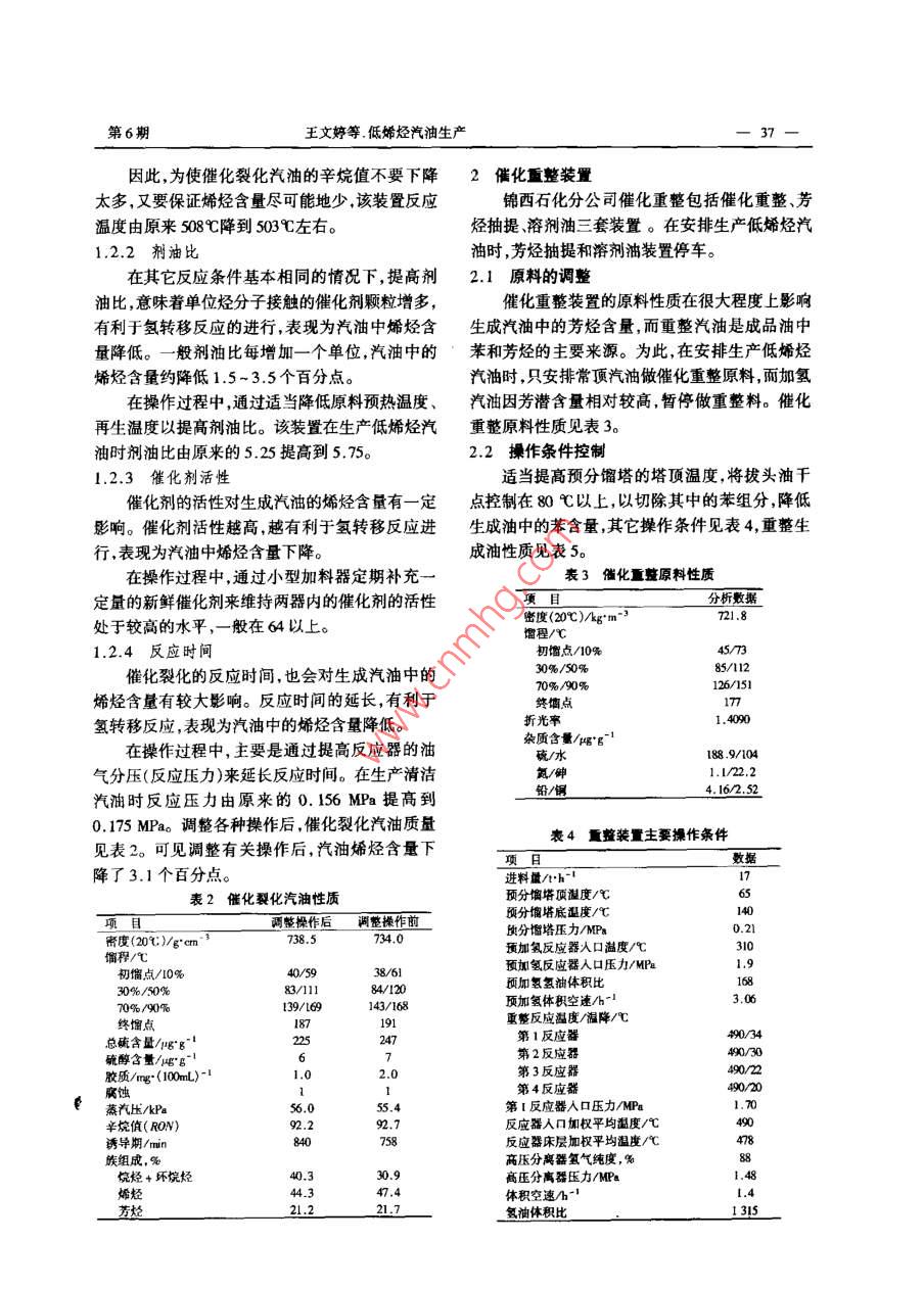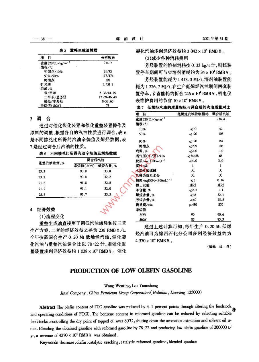 煉油設(shè)計(jì)2001年6月PETROLEUM REFINERY ENCINERING第31卷第6期低烯烴汽油生產(chǎn)王文婷劉元圣中國(guó)石油錦西石化分公司(遼寧省葫蘆島市125000)摘要:中國(guó)石油錦西石化分公司通過(guò)調(diào)整催化裂化裝置的原料和操作條件使催化裂化汽油中的燔烴含量降低了3.1個(gè)百分點(diǎn);對(duì)于催化重整裝置,通過(guò)選擇合適原料.將拔頭油干點(diǎn)控制在80C以上,以及停開(kāi)芳烴抽提和溶劑油裝置等措施,降低了重整禮袖的苯含最。將由此得到的催化裂化汽油和催化重整汽油按78:22的比例調(diào)合,生產(chǎn)出了低烯烴汽油0.2 Mu/a,效益達(dá)4 370 RMB¥/ao主題詞:降低烯烴催化裂化 催化整油調(diào)合汽油通過(guò)調(diào)整原料和裝置操作,將催化裂化汽油量和轉(zhuǎn)化率,而且對(duì)生成汽油中的烯烴含量影響與催化重整生成油以- -定比例進(jìn)行調(diào)合,實(shí)現(xiàn)了很大。在通常催化裂化反應(yīng)條件下,氫轉(zhuǎn)移反應(yīng)低烯烴汽油的生產(chǎn)。該方案簡(jiǎn)便易行,經(jīng)濟(jì)效益速度比裂化反應(yīng)速度慢,提高反應(yīng)溫度有利于裂較好?;磻?yīng)速度的提高,即氫轉(zhuǎn)移和裂化反應(yīng)速度之比下降.表現(xiàn)為抑制氫轉(zhuǎn)移反應(yīng)的進(jìn)行,有利于烯1催化裂化裝置烴的存在。另外,氫轉(zhuǎn)移反應(yīng)為放熱反應(yīng),而裂化中國(guó)石油錦西石化分公司I套催化裂化裝置反應(yīng)為吸熱反應(yīng)。從熱力學(xué)角度考慮,提高反應(yīng)是前置燒焦罐催化裂化裝置,由中國(guó)石化集團(tuán)北溫度對(duì)氫轉(zhuǎn)移反應(yīng)不利。因此,為降低汽油中的京設(shè)計(jì)院設(shè)計(jì),加工量為0. 80 MVa,設(shè)計(jì)原料主烯烴含量,必須適當(dāng)降低反應(yīng)溫度。據(jù)資料介紹,要以遼河減壓蠟油為主,采用蘭州煉油化工總廠反應(yīng)溫度每降低5.5C ,汽油中的烯烴含量約降催化劑廠生產(chǎn)的LCS-7B催化劑。低1%。但提高反應(yīng)溫度對(duì)汽油辛烷值的提高有考慮目前實(shí)際情況,通過(guò)相關(guān)裝置原料和操利,一般反應(yīng)溫度每提高I0C ,汽油辛烷值約提作條件的調(diào)整來(lái)改普汽油質(zhì)量,不考慮換催化劑。高1~1.5個(gè)單位。1.1 原料油的調(diào)整表1催化裂化原料油性質(zhì)催化裂化原料性質(zhì)對(duì)生成汽油中的烯烴含量密度(20C )/kg* m" !917.6總氮含量/mg"g-' 1.65影響較大。-般來(lái)說(shuō),對(duì)于基本相同的操作條件,餾程/賊氟含量/mg'g-' 0.47原料的Cp值越高,其裂化產(chǎn)品中烯烴含量越高;初餾點(diǎn)358 折光率1. . 495010%390| 苯胺點(diǎn)/C原料的CA值越高,則其裂化產(chǎn)品中的芳烴含量30%414| 運(yùn)動(dòng)粘度/m?.s-1越高;而CN值高的原料可以提供足夠的供氫分50%441 50年42.64子,有利于氫轉(zhuǎn)移反應(yīng)的進(jìn)行。綜上所述,選擇中300七餾出,%70%462|殘?zhí)?%100C質(zhì)中間基原料可以生產(chǎn)出烯烴和芳烴含量都適中350C愉出,%8.5 金屬含 最/r%'g-'的催化裂化汽油。凝點(diǎn)/C33F10.9因此,在生產(chǎn)清潔汽油的過(guò)程中,宜盡可能地內(nèi)點(diǎn)/心1680.7安排遼河減壓蠟油,減少大慶減壓蠟油的摻煉比酸度/mgKOH(100mL)-1 2.82 Ni1.14總碗含量/mg"50.2053| V0.54例,為生產(chǎn)低烯烴汽油提供原料保證。催化裂化原料油性質(zhì)見(jiàn)表1。收稿日期2000- 0I - 12;修改稿收到日期:2001 -03 -23。1.2 操作條件的控制作者簡(jiǎn)介:王文婷,1991年畢業(yè)于石袖大學(xué)(華東)煉制系石1.2.1反應(yīng)溫度油加工專業(yè),一直從事生產(chǎn)管理工作,現(xiàn)為錦西石化分公司反應(yīng)溫度不僅影響催化裂化的產(chǎn)品分布、質(zhì)煉油一廠副廠長(zhǎng)。第6期王文婷等.低烯烴汽油生產(chǎn)因此,為使催化裂化汽油的辛烷值不要下降2催化重整裝置太多,又要保證烯烴含量盡可能地少,該裝置反應(yīng)錦西石化分公司催化重整包括催化重整、芳溫度由原來(lái)508C降到503C左右。烴抽提、溶劑油三套裝置。在安排生產(chǎn)低烯烴汽1.2.2劑 油比油時(shí),芳烴抽提和溶劑油裝置停車(chē)。在其它反應(yīng)條件基本相同的情況下,提高劑2.1原料的調(diào)整油比,意味著單位烴分子接觸的催化劑顆粒增多,催化重整裝置的原料性質(zhì)在很大程度上影響有利于氫轉(zhuǎn)移反應(yīng)的進(jìn)行,表現(xiàn)為汽油中烯烴含生成汽油 中的芳烴含量,而重整汽油是成品油中量降低。一般劑油比每增加一一個(gè)單位,汽油中的苯和芳烴的主要來(lái)源。為此,在安排生產(chǎn)低烯烴烯烴含量約降低1.5-3.5個(gè)百分點(diǎn)。汽油時(shí),只安排常頂汽油做催化重整原料,而加氫在操作過(guò)程中,通過(guò)適當(dāng)降低原料預(yù)熱溫度、汽油因芳潛 含量相對(duì)較高,暫停做重整料。催化再生溫度以提高劑油比。該裝置在生產(chǎn)低烯烴汽重整原料性質(zhì)見(jiàn)表3。油時(shí)劑油比由原來(lái)的5. 25提高到5.75。2.2操作條件控制1.2.3 催化劑活性適當(dāng)提高預(yù)分餾塔的塔頂溫度,將拔頭油干催化劑的活性對(duì)生成汽油的烯烴含量有-定點(diǎn)控制在80 C以上,以切除其中的苯組分,降低影響。催化劑活性越高,越有利于氫轉(zhuǎn)移反應(yīng)進(jìn)生成油中的苯含量,其它操作條件見(jiàn)表4,重整生行,表現(xiàn)為汽油中烯烴含量下降。成油性質(zhì)見(jiàn)表5。在操作過(g