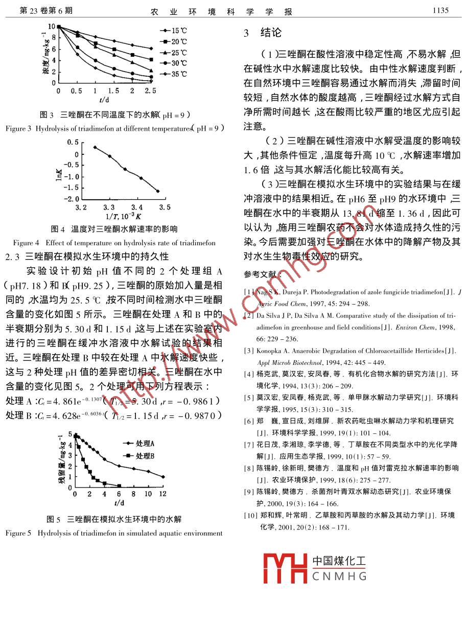 農(nóng)業(yè)環(huán)境科學(xué)學(xué)報(bào)2004,23(6):1133-1135Journal of Agro-Environment Science三唑酮水解動(dòng)力學(xué)研究劉毅華,楊仁斌,肖曲,郭正元湖南農(nóng)業(yè)大學(xué)農(nóng)業(yè)環(huán)境保護(hù)研究所,湖南長(zhǎng)沙410128)摘要深用氣相色譜儀分析方法研究了三唑酮在不同pH和溫度條件下的水解動(dòng)力學(xué)情況。實(shí)驗(yàn)表明三唑酮在酸性條件下比較穩(wěn)定,不易水解,而在堿性條件下水解速度較快。溫度升高有利于三唑酮的水解反應(yīng),水解活化能為70.47k·ml-‘,溫度效應(yīng)系數(shù)為2.6。三唑酮在模擬水生環(huán)境中的實(shí)驗(yàn)結(jié)果與在緩沖溶液體系中的結(jié)果相近在pH7.8和pH9.25的水中三唑酮的降解半衰期分別為5.30d和1.15d關(guān)鍵詞三唑酮;水解;pH;溫度效應(yīng)中圖分類號(hào)ⅹ839.2文獻(xiàn)標(biāo)識(shí)碼:A文章編號(hào):1672-2043(2004)06-1133-03Hydrolysis Dynamics of Triadimefon in Aquatic EnvironmentLIU Yi-hua, YANG Ren-bin, XIAO Qu, GUO Zheng-yuan(Institute of Agro-Environmental Protection, Hunan Agricultural University, Changsha 410128, China)Abstract: The first-order hydrolysis kinetics of triadimefon was investigated as a function of ph and temperature. The degradationrate was measured through GC. The pH rate profiles for hydrolysis of triadimefon were obtained at 298 K and the pH value ranged 59. The results showed that the ph was a critical factor determining the degradation rate of triadimefon in aqueous solutions. Tri-limefon was stable in acid water and its hydrolysis easily took place in basic water. In addition, the higher temperature was helpfulfor the hydrolysis process in the range of 288 K to 308 K in basic water. The activation energy of hydrolysis for triadimefon was 70. 47kJ'mol-'and the temperature coefficient was 2. 6. The degradation of triadimefon in simulated aquatic environment was similar tothat in buffer solution. The half-lives of triadimefon degradation in simulated aquatic environment were 5. 30 d at pH 7. 18 and1.15 d at pH9.2:Keywords: triadimefon; hydrolysis; pH; effect of temperature三唑酮商品名為 Blyton,通用名為 Triadimefon,見(jiàn)報(bào)道。本文研究了三唑酮在不同p和不同溫度條化學(xué)名稱為1〔4-氯苯氧基)33-二甲基-1(12A-件下的水解特點(diǎn),為評(píng)價(jià)三唑酮在生態(tài)環(huán)境中的安全三唑-1-基)2-丁酮分子式為 CLhIsCIN3O2。三唑酮性提供科學(xué)依據(jù)是一種高效、低毒、低殘留、持效期長(zhǎng)、內(nèi)吸性強(qiáng)的廣譜性三唑類殺菌劑適于防治麥類、玉米、高梁、果樹(shù)、1實(shí)驗(yàn)部分蔬菜等作物上銹病和白粉病在國(guó)內(nèi)外一直得到廣泛1.1儀器應(yīng)用。為了全面了解三唑酮在環(huán)境中的滯留、遷移、轉(zhuǎn)美國(guó)產(chǎn)HP-6890型氣相色譜議(帶μECD檢測(cè)化等情況,正確評(píng)價(jià)其環(huán)境安全性,研究三唑酮在水器和化學(xué)工作站),HY-2AS型水浴恒溫振蕩器環(huán)境中的行為和歸宿是十分必要的。目前有關(guān)該農(nóng)藥pHS-2型酸度計(jì)便攜式高壓滅菌鍋。在環(huán)境中降解的研究報(bào)道甚少2,關(guān)于其水解尚未1.2中國(guó)煤化工CNMHG.5%,農(nóng)業(yè)部農(nóng)藥檢定所提供)其他化學(xué)試劑均為分析純?cè)噭?二次重蒸收稿日期:2004基金項(xiàng)目農(nóng)業(yè)部基金項(xiàng)目(NC-2002-734)水,緩沖溶液(pH5~p⑨)按文獻(xiàn)[3]的方法制得。作者簡(jiǎn)介劉毅華(1981—)女湖南永州人碩士研究生主要1.3氣相色譜操作條件研鴉方搪填污染物檢測(cè)與治理色譜柱HP-5(30.0m×360m×0.25μm),進(jìn)813(@yahoo.com.cn劉毅華等三唑酮水解動(dòng)力學(xué)研究2004年12月樣口溫度300℃流動(dòng)相N24.0mL·min-爐溫175表1三唑酮在不同緩沖液中的降解動(dòng)力學(xué)參數(shù)(25℃)℃,檢測(cè)器溫度280℃,進(jìn)樣量1μL,三唑酮保留時(shí) Table 1 Hydrolysis kinetics paarameters of traidbuffer間為7.7minolutions with different pH values(25C)1.4實(shí)驗(yàn)設(shè)計(jì)3-5dH值一水解動(dòng)力學(xué)方程水解速率常數(shù)半衰期相關(guān)系數(shù)1.4.Ⅰ三唑酮在不同緩沖溶液中的穩(wěn)定性分別取82mg:kg-三唑酮溶液1mL于100mL5C=9.9841e-0020.0024288.81-0.97950.050213.810.9959棕色容量瓶?jī)?nèi)加入pH值為5、6、7、8和9的緩沖溶7C=9.9227e-0120.12130.9944液至刻度將容量瓶置于25℃的恒溫器中按一定的8C=9.9185e-03200.3266時(shí)間間隔取樣測(cè)定水中三唑酮的含量。每次取水樣10C=9.9064e-0.50.51110.9850mL平行取樣2次。水樣用20mL石油醚萃取2次萃取液經(jīng)無(wú)水硫酸鈉干燥脫水后,濃縮至5mL,GC法測(cè)定三唑酮含量。實(shí)驗(yàn)所用玻璃器皿使用前均用蒸汽消毒器高溫高壓滅菌30min整個(gè)試驗(yàn)必須防止光照并保持實(shí)驗(yàn)24681012容器的密閉性,以避免光解、揮發(fā)及氧化作用對(duì)水解的影響。圖1三唑酮在不同緩沖液中的水解(25℃)1.4.2三唑酮水解的溫度效應(yīng)Figure 1 Hydrolysis ofbuffer solutions(25℃)分別取82mg:kg-三唑酮溶液1mL于100mL0.6棕色容量瓶?jī)?nèi)加入pH9的緩沖溶液至刻度置于15℃、20℃、25℃、30℃、35℃的恒溫器中進(jìn)行水解以下操作同1.4.1項(xiàng)1.4.3三唑酮在模擬水生環(huán)境中的降解6模擬水生環(huán)境的裝置為玻璃鋼制成的30cm×30m×20cm的水槽,槽中養(yǎng)殖有水草和藻,水樣取自圖2三唑酮水解反應(yīng)速率常數(shù)與pH值的關(guān)系瀏陽(yáng)河湖南農(nóng)業(yè)大學(xué)段。往槽中加入一定數(sh