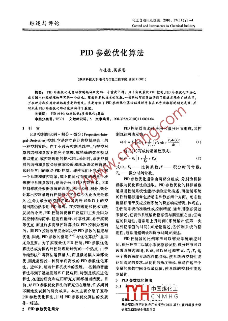 化工自動化及儀表,2010, 37(1);1 -4綜述與評論Control and Instruments in Chemical IndustryPID參數(shù)優(yōu)化算法何佳佳,侯再恩(陜西科技大學電氣與信息工程學院,西安71021)摘要: PI參教優(yōu)化是 自動控制領(lǐng)域研究的一個重要問題。為了實現(xiàn)最優(yōu)PID控制,PID參教優(yōu)化算法巳成為國內(nèi)外控制理論研究的一個熱點。隨著計算機技術(shù)的發(fā)展,一些新的智能算法得到了迅速發(fā)展和廣泛應用,.并在理論和應用方面都有重要的意義。主要介紹了PID參敏優(yōu)化算法以及近年來在此方面取得的研究成果,并對未來PID參數(shù)優(yōu)化的研究方向作了展望。關(guān)鍵詞: PID 控制;動態(tài)性能;參數(shù)優(yōu)化;算法中圈分類號: TP301文獻標識碼:A 文章編號: 1003020120100010PID控制器由比例、積分和微分環(huán)節(jié)組成,其控1引言PID控制即比例-積分-微分( Proportion-Inte-制規(guī)律可表示為:gal-Deivative)控制,它是建立在經(jīng)典控制理論上的() =K[()+卡[(cu+oud()]-種控制策略。在工業(yè)過程控制系統(tǒng)中,當被控對將式(1)寫成傳遞函數(shù)形式:象的結(jié)構(gòu)和參數(shù)不能完全掌握,或精確的數(shù)學模型難以建立,或控制理論的技術(shù)難以采用時,系統(tǒng)控制C(x) =K,[1+亦+叫(2)器的結(jié)構(gòu)和參數(shù)必須依靠經(jīng)驗和現(xiàn)場調(diào)試來確定,式中: K,--比例系數(shù);T-積分時間常 數(shù);這時最常用的就是PID控制。即使我們不完全了解T,- -微分時間常 數(shù)。-個系統(tǒng)和被挖對象,或不能通過有效的測量手段PID參數(shù)優(yōu)化通常由兩部分組成,分別為目標來獲得系統(tǒng)參數(shù)時,也適合采用PID控制技術(shù)。PID函數(shù)與優(yōu)化算法的選取。PID 參數(shù)優(yōu)化的目標函數(shù)控制器就是根據(jù)系統(tǒng)的誤差,利用比例、積分、微分通常是控制系統(tǒng)性能指標的定最描述,而控制系統(tǒng)計算出控制量進行控制的。它是迄今為止歷史最悠的性能指標通常包括動態(tài)和靜態(tài)兩個方面。動態(tài)性久,生命力最強的控制方式,國內(nèi)外95%以上的控能指標用于反應控制系統(tǒng)的瞬態(tài)響應情況,體現(xiàn)在:制回路仍然采用PID結(jié)構(gòu)。在控制理論和技術(shù)飛躍①控制系統(tǒng)的準確性或控制精度,通常用穩(wěn)態(tài)誤差發(fā)展的今天, PID控制器仍被廣泛應用主要是因為來描述,它表示系統(tǒng)輸出穩(wěn)態(tài)值與期望值之差;②晌其控制結(jié)構(gòu)簡單穩(wěn)定性能好、可靠性高、易于實現(xiàn)應的快速性,通常用上升時間(系統(tǒng)輸出值第一次等優(yōu)點,而且許多高級控制都是以PID控制為基礎(chǔ)達到穩(wěn)態(tài)值的時間)來定量描述;③控制系統(tǒng)的穩(wěn)的。而PID控制效果完全取決于PID參數(shù)的整定與定性,通常用超調(diào)量和調(diào)節(jié)時間來描述。優(yōu)化,因此,PID參數(shù)的整定"-1與優(yōu)化算法'I顯得PID控制器的比例環(huán)節(jié)可以縮短系統(tǒng)響應時尤為重要。為了實現(xiàn)最優(yōu)PID控制,PID參數(shù)優(yōu)化間,積分環(huán)節(jié)可以減小系統(tǒng)穩(wěn)態(tài)誤差,微分環(huán)節(jié)可以算法已成為國內(nèi)外控制理論研究的一個熱點,由于改善系統(tǒng)超調(diào)量,因此,可以通過調(diào)整Kp,TI,Tp這單純形法'|等算法運算量大,而且極易陷入局部最三個參數(shù)來改善動態(tài)性能指標,使系統(tǒng)的控制性能優(yōu),因此需要找- -種簡單而高效的PID參數(shù)優(yōu)化算達到給定的要求。從優(yōu)化的角度來說,就是在這三個法。近年來,隨著計算機技術(shù)的發(fā)展,一些新的智能變量的參數(shù)空間尋找最優(yōu)值,使系統(tǒng)的控制性能達算法得到了迅速發(fā)展和廣泛應用,特別是模擬進化到最優(yōu)。算法,在理論研究和應用研究方面都相當活躍。目3 PID參數(shù)優(yōu)化算法前,對PID參數(shù)優(yōu)化算法的研究仍在繼續(xù),許多期刊中國煤化工不斷地發(fā)表新的研究成果。本文主要介紹了五種PID參數(shù)優(yōu)化算法,并對PID參數(shù)優(yōu)化算法的發(fā)展收JTYCHCNMHG作一綜述?;痦椖?陜西省教廳專項號(08]K 237);陜西科技大學2 PID 參數(shù)優(yōu)化簡介研究生創(chuàng)新基金資助項目●2.化工自動化及儀表第37卷遺傳算法(Genetic Algoithm, GA)是一種新發(fā)覓食的螞蟻在自己經(jīng)過的路上留下一定數(shù)量的信息展起來的優(yōu)化算法,它起源于60年代對自然和人工素,信息素一方面會隨著時間的流逝而揮發(fā),另一方自適應系統(tǒng)的研究,是模擬生物在自然環(huán)境中的遺面,當有其他的螞蟻再次經(jīng)過該路徑時會再次留下傳和進化進程而形成的一種自適應全局優(yōu)化慨率搜信息素以加強該處的信息素。在任何一個路口,螞索算法,其基本思想是,將待求解問題轉(zhuǎn)換成由個體蟻會按照概率選擇任意-一個方向前進,在信息索濃組成的演化群體和對該群體進行操作的一-組 遺傳算度較高的方向具有較大的選擇概率。子,經(jīng)歷生成- -評價-選擇- 操作的演化過程 ,反復蟻群算法的基本特點是:①其原理是一種正反進行,直到搜索到最優(yōu)解。饋機制,它通過信息素的累積和更新收斂于最優(yōu)路遺傳算法的基本特點是:①它是對所求參數(shù)對徑;②它是一種通用型隨機優(yōu)化算法,但人