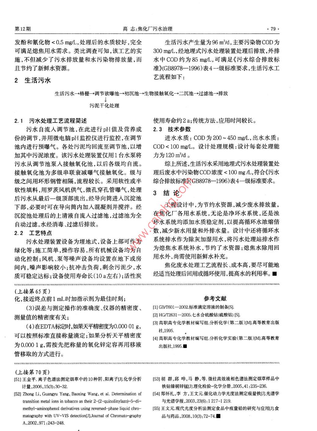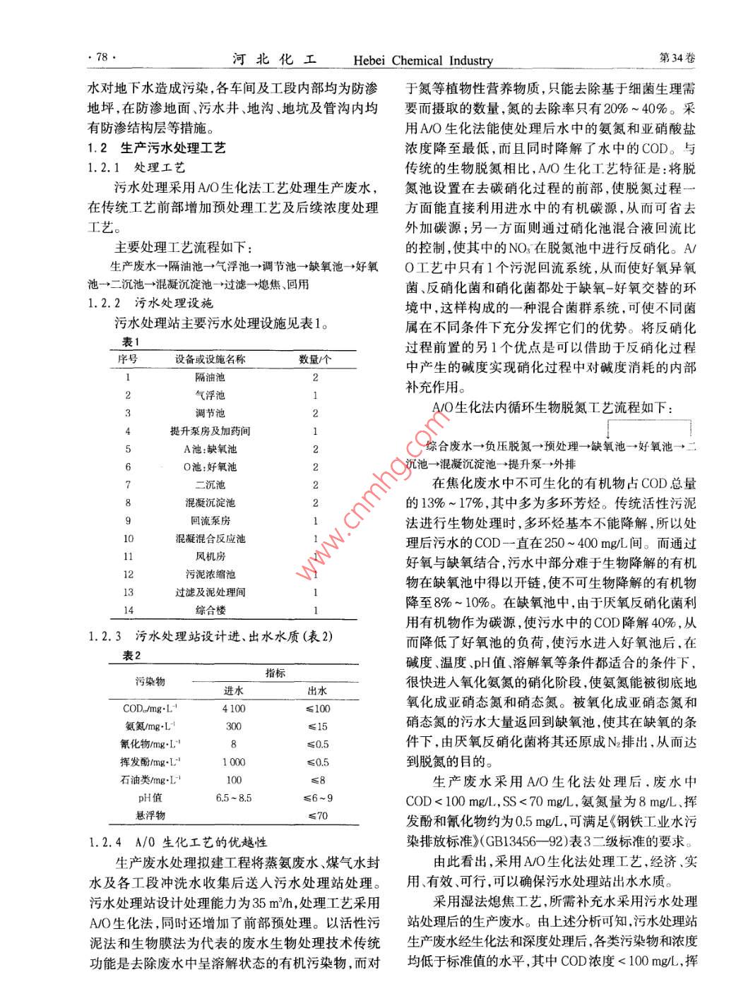 第34卷第12期址xVol 34. No 122011年12月HEBEI HUAGONGDec.2011焦化廠污水治理高志(石家莊市井陘礦區(qū)環(huán)境保護(hù)局,河北石家莊050100)摘要:綜述了焦化廠廢水(生產(chǎn)廢水和生活廢水)的處理方法關(guān)鍵詞:焦化廠;生產(chǎn)廢水;生活污水;處理方法中圖分類號(hào):X784文獻(xiàn)標(biāo)識(shí)碼:B文章編號(hào):1003-5095(2011)11-0077-03Wastewater Treatment of the Coking PlantGAO Zhi(Shijiazhuang City Jingxing Mining Area Environment Protection Bureau, Shijiazhuang 050100, China)Abstract: To summary the treatment methods of the coking plant wastewater, including production wastewater and do-Key words: coking plant; production wastewater domestic wastewater; treatment method在焦化生產(chǎn)工藝流程中,煤氣終冷的直接冷卻為COD、BOD、氰化物、氨、酚、油等,送污水處理站水、粗苯加工的直接蒸汽冷凝分離水、粗苯加工工處理。藝的直接蒸汽冷凝水,焦油精制加工過程的直接蒸(5)各工段沖洗水產(chǎn)生量為36m/,主要污染汽冷凝分離水、洗滌水、車間地坪或設(shè)備清洗水以物為COD、BOD、氰化物、氨、酚、油等,送污水處理及由煤中所含水形成的剩余氨水,被稱為酚氰廢站處理。水,這部分廢水不僅水量大而且成分復(fù)雜,是煉焦(6)篩焦除塵排水經(jīng)沉淀后循環(huán)使用,主要污化學(xué)工業(yè)中具有代表性的污水。染物為SS,不外排。1生產(chǎn)廢水的處理(7)熄焦時(shí)產(chǎn)生的大量熄焦水,主要污染物為SS,排人沉淀池沉淀后復(fù)用。1.1工藝過程中產(chǎn)生的廢水控制(8)設(shè)置事故水池,防止水污染。在煤氣凈化(1)冷卻循環(huán)水排污水排放量為432m/d,其車間設(shè)置了大容積的貯槽及地下放空槽,適應(yīng)事故中,144md回用于除塵灰加濕,剩余部分排水復(fù)用的貯存和調(diào)節(jié)需要,防止事故溢流造成水污染。于熄焦工段,不外排(9)在工段內(nèi)設(shè)置放空槽,收集設(shè)備及管道放(2)蒸汽鍋爐軟化站廢水產(chǎn)生量為12m/d,排空廢液、地坪沖洗水、各分離器及油槽分離水等,統(tǒng)水復(fù)用于熄焦工段,不外排。一送煤氣凈化焦油氨水分離裝置,分離出的廢水送(3)冷鼓工段產(chǎn)生的剩余氨水送蒸氨工段,經(jīng)蒸蒸氨工段進(jìn)一步處理氨后的廢水產(chǎn)生量為516m/d,主要污染物為COD(10)脫硫工段、粗苯蒸餾工段各分離器及油槽BOD3、氰化物、氨、酚、油等,送污水處理站處理。產(chǎn)生的少量分離水及各工段地下水放空液均集中(4)煤氣水封水排水量為72mld,主要污染物后送至機(jī)械化氨水分離槽。此外,為防止產(chǎn)生的污收稿日期:2011-06-16作者簡(jiǎn)介:高志(1982-),女,助工,從事環(huán)境保護(hù)工作,E- mail: lzh:8106@163cm78河北化工lebei Chemical Industry第34卷水對(duì)地下水造成污染,各車間及工段內(nèi)部均為防滲于氮等植物性營養(yǎng)物質(zhì),只能去除基于細(xì)菌生理需地坪,在防滲地面、污水井、地溝、地坑及管溝內(nèi)均要而攝取的數(shù)量,氮的去除率只有20%~40%。采有防滲結(jié)構(gòu)層等措施。用A/O生化法能使處理后水中的氨氮和亞硝酸鹽1.2生產(chǎn)污水處理工藝濃度降至最低,而且同時(shí)降解了水中的COD。與1.2.1處理工藝傳統(tǒng)的生物脫氮相比,AO生化工藝特征是:將脫污水處理采用AO生化法工藝處理生產(chǎn)廢水,氮池設(shè)置在去碳硝化過程的前部,使脫氮過程一在傳統(tǒng)工藝前部增加預(yù)處理工藝及后續(xù)濃度處理方面能直接利用進(jìn)水中的有機(jī)碳源,從而可省去工藝。外加碳源;另一方面則通過硝化池混合液回流比主要處理工藝流程如下的控制,使其中的NO3在脫氮池中進(jìn)行反硝化。生產(chǎn)廢水→隔油池→氣浮池→調(diào)節(jié)池→缺氧池→好氧O工藝中只有1個(gè)污泥回流系統(tǒng),從而使好氧異氧池→二沉池→混凝沉淀池→過濾→熄焦、回用菌、反硝化菌和硝化菌都處于缺氧-好氧交替的環(huán)1.2.2污水處理設(shè)施境中,這樣構(gòu)成的一種混合菌群系統(tǒng),可使不同菌污水處理站主要污水處理設(shè)施見表1。屬在不同條件下充分發(fā)揮它們的優(yōu)勢(shì)。將反硝化表1過程前置的另1個(gè)優(yōu)點(diǎn)是可以借助于反硝化過程設(shè)備或設(shè)施名稱數(shù)量個(gè)中產(chǎn)生的堿度實(shí)現(xiàn)硝化過程中對(duì)堿度消耗的內(nèi)部隔油池2氣浮池補(bǔ)充作用3調(diào)節(jié)池21212222AO生化法內(nèi)循環(huán)生物脫氮工藝流程如下提升泵房及加藥間!1池:缺氧池綜合廢水→負(fù)壓脫氮→預(yù)處理→缺氧池→好氧池56789O池:好氧池沉池→混凝沉淀池一提升泵→外排二沉池在焦化廢水中不可生化的有機(jī)物占COD總量混凝沉淀池的13%~17%,其中多為多環(huán)芳烴。傳統(tǒng)活性污泥回流泵房法進(jìn)行生物處理時(shí),多環(huán)烴基本不能降解,所以處混凝混合反應(yīng)池理后污水的COD一直在250~400mg間。而通過風(fēng)機(jī)房好氧與缺氧結(jié)合,污水中部分難于生物降解的有機(jī)污泥濃縮池物在缺氧池中得以開鏈,使不可生物降解的有機(jī)物過濾及泥處理間綜合樓降至8%~10%。在缺氧池中,由于厭氧反硝化菌利用有機(jī)物作為碳源,使污水中的COD降解40%,從1.2.3污水處理站設(shè)計(jì)進(jìn)、出水水質(zhì)(表2)而降低了好氧池的負(fù)荷,使污水進(jìn)入好氧池后,在表2指標(biāo)堿度、溫度、pH值、溶解氧等條件都適合的條