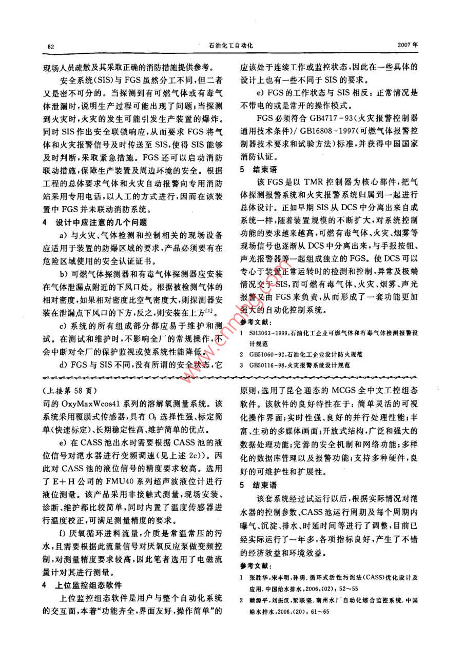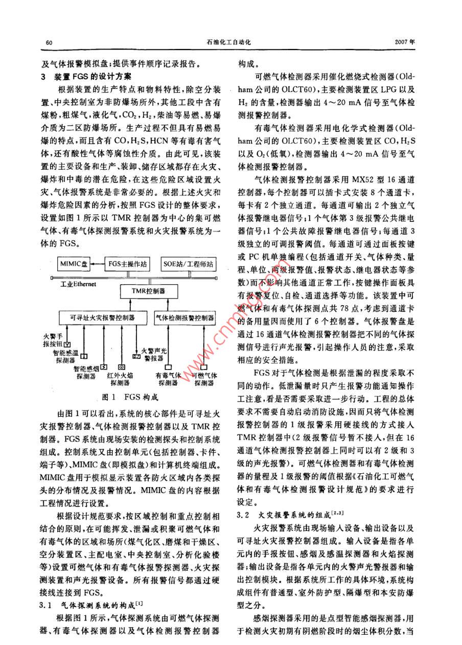 石油化工自動(dòng)化,2007, 5:59控制系統(tǒng)AUTOMATION IN PETRO-CHEMICAL INDUSTRYFGS在煤氣化項(xiàng)目中的應(yīng)用葉威威(中國(guó)石化集團(tuán)寧波工程公司,浙江寧波315103)摘要:災(zāi)和氣體報(bào)警系統(tǒng)(FGS)包括有毒和可燃?xì)怏w探測(cè)和火災(zāi)報(bào)警兩個(gè)方面,它在保證工廠安全生產(chǎn)中起著重要作用.是構(gòu)成石化裝置安全系統(tǒng)的重要組成部分。結(jié)合煤氣化項(xiàng)目詳細(xì)闡述了系統(tǒng)的組成和功能。關(guān)鍵詞:火災(zāi)和氣體報(bào)簀系統(tǒng);控制器;可尋址系統(tǒng);MIMIC盤中團(tuán)分類號(hào): TP277文獻(xiàn)標(biāo)識(shí)碼: B文章編號(hào): 107-73242007)-0055-04The Application of FGS in a Coal Gasification ProjectYe Weiwei(Sinopec Ningbo Engineering Co.,Ningbo, 315103, China)Abstract: Fire and Gas Alarm System (FGS) includes toxic and combustible gas detection and firealarm. It will play a important function to ensure safe production in the factory. It's an important part ofthe safety systerm in petrochemical plant. In accordance with the coal gasification project the constructionand function of FGS are expounded in detail.Keywords: fire and gas alarm system (FGS); controller; addressable system; MIMIC panel石油化工生產(chǎn)裝置屬高溫、高壓、易燃、易爆裝利工藝技術(shù),其技術(shù)含量高,反應(yīng)復(fù)雜,工藝流程較置,生產(chǎn)過程中不可避免地存在著各種易燃易爆氣長(zhǎng)。工程對(duì)生產(chǎn)管理、自動(dòng)化控制水平和安全保護(hù)體和有毒氣體,這些氣體一旦發(fā)生泄露并在周圍環(huán)的要求很高,而火災(zāi)、氣體報(bào)警系統(tǒng)在裝置的安全境中聚集,將可能釀成火災(zāi)、爆炸或人身中毒等惡保護(hù)中起著非常重要的作用。按照工程的總體設(shè)性事故,嚴(yán)重危害人民的生命和財(cái)產(chǎn)安全。因此,計(jì)要求,建立全廠局域網(wǎng),設(shè)置FGS。FGS位于裝必須及時(shí)可靠地對(duì)裝置中氣體的體積分?jǐn)?shù)進(jìn)行檢置的中央控制室內(nèi),同時(shí)沒有火災(zāi)及氣體報(bào)警模測(cè)、監(jiān)控,一旦發(fā)現(xiàn)易燃易爆氣體和有毒氣體體積擬盤。分?jǐn)?shù)過高,以及裝置中可能發(fā)生的火災(zāi),應(yīng)及時(shí)快2FGS的功能要求.速地采取有效的措施,將事故的損失降到最低。出快速檢測(cè)意外事件,對(duì)有毒或可燃?xì)怏w泄漏點(diǎn)于以上安全的考慮,化工生產(chǎn)必須配備可燃?xì)狻⒂屑盎馂?zāi)進(jìn)行監(jiān)測(cè);在確定事件發(fā)生的同時(shí)產(chǎn)生報(bào)毒氣體監(jiān)控系統(tǒng)和火災(zāi)報(bào)警系統(tǒng),最大程度地保障瞥,隔離可燃物或毒氣源,隔離火源,如有可能應(yīng)排生命財(cái)產(chǎn)安全。以往的設(shè)計(jì)方案是把氣體監(jiān)控和.除空氣,使用滅火設(shè)施,保護(hù)鄰近設(shè)施,確保設(shè)備、火災(zāi)監(jiān)控分開設(shè)置,隨著人們對(duì)消防安全越來越重工廠、建筑物、人員以及周圍環(huán)境的安全。為了達(dá)視以及化工裝置的大型化發(fā)展,分開設(shè)置的設(shè)計(jì)方到這個(gè)目的,要求FGS具有如下功能:連續(xù)探測(cè)案已不能滿足生產(chǎn)需求,火災(zāi)和氣體報(bào)警系統(tǒng)并早期發(fā)現(xiàn)可能聚集的可燃或有毒氣體;連續(xù)探測(cè)FGS(Fire & Gas System)因此而生,它將氣體探并早期發(fā)現(xiàn)可能出現(xiàn)的火焰或存在的火災(zāi);設(shè)置聲測(cè)系統(tǒng)和火災(zāi)報(bào)警系統(tǒng)合二為一,進(jìn)行總體設(shè)計(jì)。光報(bào)警信號(hào)裝置,通過不同的聲音和顏色報(bào)警使操FGS獨(dú)立于過程控制系統(tǒng),也獨(dú)立于工藝過程的作人員能區(qū)分不同的危險(xiǎn)類型;傳送相關(guān)的I/O保護(hù)系統(tǒng),但其相互之間又有密不可分的聯(lián)系。現(xiàn)狀態(tài)和儀表設(shè)備報(bào)警及故障信號(hào)到該工程的火災(zāi)就煤氣化工程中的FGS系統(tǒng)的設(shè)計(jì)談?wù)勼w會(huì)。1整個(gè)裝置FGS的整體要求收稿日期: 2007-07-20某工程由空分裝置、磨煤和干燥裝置.煤氣化作者簡(jiǎn)介:葉威威(1980-),男.朔北鄂州人202年畢業(yè)于裝置、中央控制室、分析化驗(yàn)樓以及變配電站等構(gòu)遼寧石油化工大學(xué)自動(dòng)化及過程控制專業(yè),學(xué)士學(xué)位,現(xiàn)工作于中成。裝置采用的是殼牌(Shell)公司的粉煤氣化專石化寧波工程公司電控室,主要從事工程設(shè)計(jì)工作。石油化工自動(dòng)化2007年及氣體報(bào)警模擬盤;提供事件順序記錄報(bào)告。構(gòu)成。3裝置FGS的設(shè)計(jì)方案可燃?xì)怏w檢測(cè)器采用催化燃燒式檢測(cè)器(Old-根據(jù)裝置的生產(chǎn)特點(diǎn)和物料特性,除空分裝, ham公司的OLCT60),主要檢測(cè)裝置區(qū)LPG以及置、中央控制室為非防爆場(chǎng)所外,其他工段中含有H2的含量,檢測(cè)器輸出4~20 mA信號(hào)至氣體檢煤粉,粗煤氣,液化氣,CO2,H2,柴油等易燃、易爆測(cè)報(bào)警控制器。介質(zhì)為二區(qū)防爆場(chǎng)所。生產(chǎn)過程不但具有易燃易有毒氣體檢測(cè)器采用電化學(xué)式檢測(cè)器(Old-爆的特點(diǎn),而且含有CO,H2S,HCN等有毒有害氣ham公司的OLCT60),主要檢測(cè)裝置區(qū)CO,H2S體,還有酸性氣體等腐蝕性介質(zhì)。由此可見,該裝以及O2(低氧),檢測(cè)器輸出4~20 mA信號(hào)至氣置的主要設(shè)備