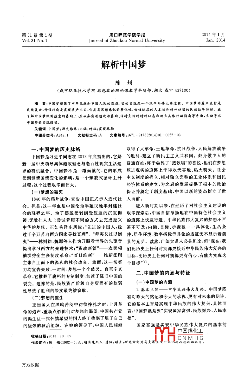 第31卷第1期周口師范學(xué)院學(xué)報2014年1月Vol 31 No. 1Journal of Zhoukou Normal UniversityJan.2014解析中國夢陳娟威寧職業(yè)技術(shù)學(xué)院思想政治理論課教學(xué)科研部,湖北咸寧437100)摘要:中國夢凝聚了中華民族和中國人民的理想,它的實現(xiàn)是一個艱辛而偉大的過程。中國夢的基本主旨是民族復(fù)興,價值指向是實現(xiàn)共產(chǎn)主義,它具有思想意識的整體性、價值追求的人本性和精神歸宿的民族性等特征。在了解中國夢深刻蘊意的基礎(chǔ)上,應(yīng)從夯實思想政治基礎(chǔ)、保持良好的精神狀態(tài)和確立具體行動指南等方面,主動尋求中國夢的實現(xiàn)路徑。關(guān)鍵詞:中國夢;歷史脈絡(luò);內(nèi)涵;特征;實現(xiàn)路徑中圖分類號:A849.1文獻標志碼:A文章編號:1671-9476(2014)01-0027-03中國夢的歷史脈絡(luò)取得了大革命、土地革命、抗日戰(zhàn)爭、人民解放戰(zhàn)爭中國夢是習近平同志在2012年底提出的,它是的勝利建立了新民主主義共和國。翻身做主人的新一屆中央領(lǐng)導(dǎo)集體施政理念與老百姓現(xiàn)實生活追普通百姓,終于嘗到了“把歌唱”的喜悅,他們在夢想求的有機融合。中國夢不是一蹴而就的,它的形成照進現(xiàn)實的道路上干得歡天喜地、熱火朝天。社會受到世情國情變化的影響,是一個螺旋式循環(huán)上升主義制度的確立、相對獨立完整的工業(yè)體系和國民過程,這個過程艱辛而偉大經(jīng)濟體系的建立,為之后的發(fā)展提供了根本的政治(一)夢想的破滅保證并奠定了制度基礎(chǔ),中國以新的姿態(tài)挺立于世1840年的鴉片戰(zhàn)爭,宣告中國正式步入近代社人面前會。但是,這一年也是中國淪為半殖民地半封建社進入新時期以來,在經(jīng)歷了對社會主義建設(shè)的會的恥辱之年。為了擺脫受剝削受壓迫的沉重枷艱辛探索后,中國自信昂揚地在中國特色社會主義鎖,無數(shù)仁人志士嘗試著用不同的方式去完成振興的道路上快速行進。中華民族偉大復(fù)興的夢想不再中華的夢想。正如毛澤東所說,“先進的中國人,經(jīng)遙不可及,內(nèi)涵、日標、步驟被一一具體化,生活條過千辛萬苦向西方國家尋找真理”?!皫熞拈L技以制件、居住環(huán)境數(shù)字指標等具象的表征無不顯示著前夷”—林則徐魏源等人作為開眼看世界的先驅(qū)者景的光明。誠然,廣闊大道未必是坦途但“現(xiàn)在,我提出學(xué)習西方的先進技術(shù);“資政新篇”——農(nóng)民領(lǐng)們比歷史上任何時期都更接近中華民族偉大復(fù)興的袖洪秀全主張制度革命;“百日維新”—維新派則目標,比歷史上任何時期都更有信心、有能力實現(xiàn)這主張自上而下的溫和的社會改良。然而,這一切努個目標1。力均宣告失敗,一時間,夢想一個個破滅。直至辛亥革命,它推翻了腐朽的專制制度,加速了陳舊中國的二、中國夢的內(nèi)涵與特征裂變。遺憾的是,民族資產(chǎn)階級自身所固有的軟弱)中國夢的內(nèi)涵性導(dǎo)致了勝利的果實最終被竊取。1.基本主旨——中華民族偉大復(fù)興。中國夢既(二)夢想的重生有對昨天的銘記和今天的珍視,更有對未來的期許正當國人在黑暗苦悶中彷徨掙扎之時,十月革它的基本主旨是實現(xiàn)中華民族的偉大復(fù)興,具體而命的炮聲,重新點燃他們對夢想的渴望,中國共產(chǎn)黨言,中國夢就是要“實現(xiàn)國家富強、民族振興、人民幸的誕生讓一批懷揣希望的國人終于找到了屬于自己福”。的堅強的政治組織。在她的領(lǐng)導(dǎo)下,中國人民相繼國家富強是實現(xiàn)中華民族偉大復(fù)興的基本前中國煤化工收稿日期:2013-10-09CNMHG作者簡介:陳娟(1982-),女,湖北隨州人,講師,碩士研究方向為馬克思土文國化與心恐冶歌用。周口師范學(xué)院學(xué)報2014年提?!案弧币馕吨Y源充裕、物產(chǎn)豐富,“強”則昭示著個國家的強大,只有“所有人共同享有人生出彩的機國運昌盛、保障得力。它包括經(jīng)濟實力的穩(wěn)固、政局會,共同享有夢想成真的機會,共同享有同祖國和時的穩(wěn)定、社會建設(shè)的完善、生態(tài)文明的健康,同時也代一起成長與進步的機會”,才能在共榮共生中產(chǎn)生包涵文化力量的強勁和精神人格的獨立。民族振興強大的內(nèi)在效應(yīng)。是實現(xiàn)偉大復(fù)興的核心,核心價值觀的確立是其精2.價值追求的人本性。中國夢既有“宏大敘事”神動力,經(jīng)濟振興是基石和物質(zhì)保證,文化振興是重的寬闊情懷,又有“具體而微”的貼心細致。中國夢要內(nèi)容,軍事振興是后盾。人民幸福是實現(xiàn)中國夢尊重人民群眾創(chuàng)造歷史的主體地位。它不是某一個的根本出發(fā)點和落腳點。當下的中國,“幸?!奔词侨嘶蛘吣骋蝗后w的“夢”,而是全體中國人的“夢廣大人民學(xué)有所教勞有所得病有所醫(yī)老有所養(yǎng)、“每個人的思想、言論和行為構(gòu)成了踐行中國夢的重住有所居,一切關(guān)乎老百姓利益的大事小事皆能切要“歷史合力,對中國夢的生成、壯大負有重大責實得以解決,共享改革發(fā)展成果。任”5。只有集所有人的智慧,才能在實現(xiàn)中國夢的2.價值導(dǎo)向—實現(xiàn)共產(chǎn)主義。從歷史前進的征程中凝聚促發(fā)前行的正能量。中國夢將人民的幸角度看,中華民族的偉大復(fù)興和實現(xiàn)共產(chǎn)主