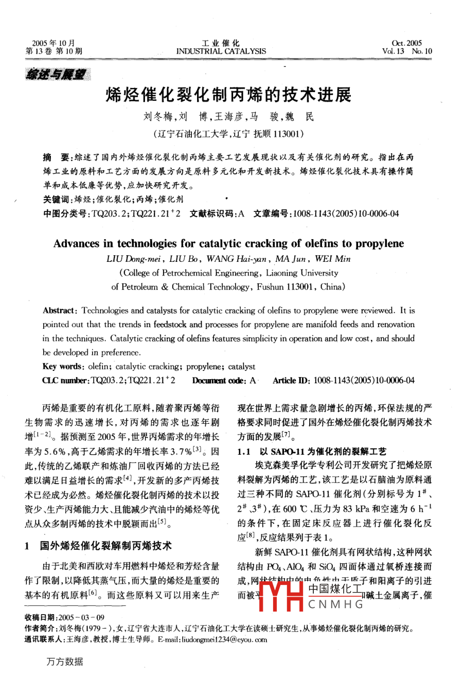2005年10月工業(yè)催化Oct.2005第13卷第10期INDUSTRIAL CATALYSISVo. 13 No 10綜述與展烯烴催化裂化制丙烯的技術(shù)進展劉冬梅,劉博,王海彥,馬駿,魏民(遼寧石油化工大學(xué),遼寧撫順113001)摘要:綜述了國內(nèi)外烯烴催化裂化制丙烯主要工藝發(fā)展現(xiàn)狀以及有關(guān)催化劑的研究。指出在丙烯工業(yè)的原料和工藝方面的發(fā)展方向是原料多元化和開發(fā)新技術(shù)。烯烴催化裂化技術(shù)具有操作簡單和成本低廉等優(yōu)勢,應(yīng)加快研究開發(fā)。關(guān)鍵詞:烯烴;催化裂化;丙烯;催化劑中圖分類號:TQ203.2;TQ221.212文獻標識碼:A文章編號:1008-1143(2005)10000604Advances in technologies for catalytic cracking of olefins to propyleneLIU Dong-mei, LIU Bo, WANG Hai-yan, MA Jun, WEI MinCollege of Petrochemical Engineering, Liaoning Universityof Petroleum Chemical Technology, Fushun 113001, China)Abstract: Technologies and catalysts for catalytic cracking of olefins to propylene were reviewed. It ispointed out that the trends in feedstock and processes for propylene are manifold feeds and renovationin the techniques. Catalytic cracking of olefins features simplicity in operation and low cost, and shouldbe developed in preferenceKey words: olefin; catalytic cracking: propylene; catalystCLC number: TQ203 2: TQ221 21*2 Document code:A Article ID: 1008-1143(2005)10-0006-04丙烯是重要的有機化工原料,隨著聚丙烯等衍現(xiàn)在世界上需求量急劇增長的丙烯,環(huán)保法規(guī)的嚴生物需求的迅速增長,對丙烯的需求也逐年劇格要求同時促進了國外在烯烴催化裂化制丙烯技術(shù)增1-2。據(jù)預(yù)測至205年,世界丙烯需求的年增長方面的發(fā)展。率為5.6%,高于乙烯需求的年增長率3.7%3。因1.1以SAPl為催化劑的裂解工藝此,傳統(tǒng)的乙烯聯(lián)產(chǎn)和煉油廠回收丙烯的方法已經(jīng)埃克森美孚化學(xué)專利公司開發(fā)研究了把烯烴原難以滿足日益增長的需求4,開發(fā)新的多產(chǎn)丙烯技料裂解為丙烯的工藝,該工藝是以石腦油為原料通術(shù)已經(jīng)成為必然。烯烴催化裂化制丙烯的技術(shù)以投過三種不同的 SAPO-11催化劑(分別標號為1#、資少、生產(chǎn)丙烯能力大、且能減少汽油中的烯烴等優(yōu)2#、3#),在600℃、壓力為83kPa和空速為6h1點從眾多制丙烯的技術(shù)中脫穎而出{S的條件下,在固定床反應(yīng)器上進行催化裂化反國外烯烴催化裂解制丙烯技術(shù)應(yīng)8,反應(yīng)結(jié)果列于表1。新鮮SAPO11催化劑具有網(wǎng)狀結(jié)構(gòu),這種網(wǎng)狀由于北美和西歐對車用燃料中烯烴和芳烴含量結(jié)構(gòu)由PO4、AO4和SO4四面體通過氧橋連接而作了限制,以降低其蒸氣壓,而大量的烯烴是重要的成網(wǎng)由角姓:子和陽離子的引進基本的有機原料。而這些原料又可以用來生產(chǎn)而被平中國煤化堿土金屬離子,催CNMHG收稿日期:2005-03-09作者簡介:劉冬梅(1979-),女,遼寧省大連市人,遼寧石油化工大學(xué)在讀碩士研究生,從事烯烴催化裂化制丙烯的研究。通訊聯(lián)系人:王海彥教授博土生導(dǎo)師。 E-mail: liudongmei234@eyou.cm2005年第10期劉冬梅等:烯烴催化裂化制丙烯的技術(shù)進展化劑空間和孔道由晶體結(jié)構(gòu)組成,使SAPO11可以表2FCR-12催化劑上的汽油裂解結(jié)果作為介孔分子篩使用。Table 2 Catalytic cracking results for gasolineover ECR-12 catalyst表ISAP11催化劑上的汽油裂解結(jié)果轉(zhuǎn)化率/%Table 1 Catalytic cracking results for gasoline裂解產(chǎn)物/%over SAPO-11 catalyst乙烯新鮮蒸汽處理蒸汽處理丙烯SAPO-11SAPO11 LasAPo-11丁烯轉(zhuǎn)化率/%低碳烷烴27.512.00.2丙烯選擇性/%裂解產(chǎn)物/%乙烯910.017.013 ATOFINA/UOP烯烴裂解工藝丁烯2.71.52.1繼20世紀90年代中期 ATOFINA的最初研究芳烴之后,UOP和 ATO-FINA在2000年末合作研究開選擇性/%發(fā)了 ATOFINA/UOP的烯烴裂解工藝[0。該工藝乙烯5.5把C4~C8烯烴以高丙烯對乙烯比轉(zhuǎn)變成丙烯和乙丙烯84.0烯。該示范裝置于1998年在比利時的 Antwerp工丁烯業(yè)裝置上投產(chǎn),處理來自運轉(zhuǎn)裝置的工業(yè)原料。此丙烯/乙烯15.225.2工藝采用固定床反應(yīng)器,在500~600℃和0.1~丙烯/丁烯8.58.10.5MPa的壓力下操作。ATOFINA/UOP的烯烴裂解工藝利用專有的沸石催化劑。該催化劑通過高空速和高轉(zhuǎn)化率及高水蒸汽處理SAPO11催化劑是將新鮮SAPO·選擇性下運轉(zhuǎn),使反應(yīng)器尺寸和操作費用降至最小,11催化劑在70℃、空速5h和壓力83kPa條件不需要一種惰性的稀釋劑。裝置示意流程如圖下,用100%的水蒸汽處理16h得到。水蒸汽處理 LaSAPO11催化劑的制備:將新鯡所示。SAPO11催化劑同稀土溶液進行離子交換,把10g的SAPO11溶入100g水中,加入5g的烯烴C脫丙烷塔LaCl2H2O,混合液在100℃下回流4h,然后干燥OCT反應(yīng)段焙燒,交換后的催化劑在760℃、空速為5h1和壓C產(chǎn)物力為83kPa條件下,用100%的水蒸汽處理16ho1.2以ECR-12為催化劑的裂解工藝脫丁烷塔由 Strohmaier等開發(fā)研究的以ECR12為催化C湖產(chǎn)物劑將石腦油轉(zhuǎn)變?yōu)镃2~C4烯烴的工藝是針對近年來,對于低排放燃料的要求,使對輕烯烴在烷基化圖1 ATOFINA/UOP烯烴裂解工藝流程低聚化MIBE和ETBE合成過程中的應(yīng)用大幅度Figure 1 ATOFINA/UOP olefins catalytic增加,另外低價位供應(yīng)輕烯烴,特別是丙烯依然是聚cracking process烯烴,尤其是聚丙烯合成中大量需要發(fā)展起來的。該工藝是在溫度為575℃和空速為600h1的常壓該技術(shù)利用催化裂