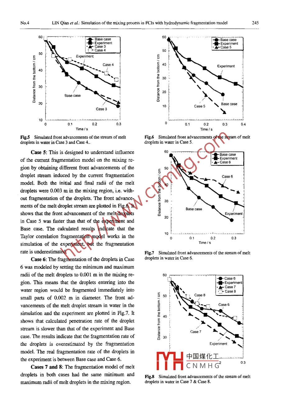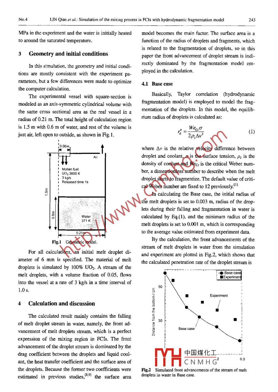 Available online at www.sciencedirect.comNUCLEARScienceDirectSCIENCEANDTECHNIQUESNuclear Science and Techniques, VoL.18, No.4 (2007) 242 246Simulation of the mixing process in FCIs with hydrodynamicfragmentation modelLIN Qian CAO Xuewu(School of Nuclear Science and Engineering, Shanghai Jiaotong Untversit, Shanghai 200240, China)Abstract Fuel Coolant Interactions (FCIs) are important issues in nuclear reactor severe accident analysis. In FCIs,fragmentation model of molten droplets is a key factor to estimate degree of possiblc damage. In this paper, the mix-ing process in FCIs is studied by the simulation of MEXA experiment with hydrodynamic fragmentation model. Theresult shows that hydrodynamic fragmentacion model underestimales the fragmentation rate of high temperature mol-ten droplets under the condition of low Weber numbers. It is concluded that models bascd on thermal fragmentationmechanism should be adopted to analyze the FCI process and its consequence.Key words Severe accident, FCI, Molten fuel droplel, Fragmentation, MIXACLC number TL364+.41IntroductionIn this study, validity of the hydrodynamic frag-mentation model under the condition of low WeberFuel Coolant Interactions (FCIs), numercallynumbers is tested and evaluated through the simulationstudied in recent years, are important issues in nuclearof the MIXA 06 experiment.lol The mixing process inreactor severe accident analysis. In FCIs, the fragmen-FCIs is investigated.tation of high-temperature molten droplets contactingwith low-temperature coolant in the mixing process isDescription of experimentused to estimate degree of possible damage, and is asey factor to determine the ratio of heat transferred toMIXA are simulated experiments of the mixingpower. The development and venification of modelsstudy of FCIs, which were performed at Winfrithfor fundamental processes in FCIs request aTechnology Centre in conjunction with the CHYMESmulti-phase, multi component, and fluid-dynamicscode development and validation effor./ " The proc-computer code. Currently, bydrodynamic fragmenta-ess involves pouring kilograms of thermitically gener-tion models (such as Taylor type correlation, Pilch andated UO2 melts (81% uranium dioxide and 19% mo-Erdman's correlation, etc.)n.2] are employed for FCIslybdenum metal at 3600 K) into a near-saturated waternumerical studies. They are developed based on rela-pool of square section of 0.37m (side)x0.6 m (depth).tive velocity of droplets to coolant liquid. StudiesS.4A droplet former is employed to produce a stream ofshow that, in high Weber number cases, hydrodynamicdroplets with diameter of 6 mm, and a cylindrical skirtmechanism dominates the fragmentation process. Withis used to control the stream to a diameter of 0.12 m.In the MIXA-06 experiment, 3 kg of molten ura-low Weber numbers, however, thermnal fragmentationmechanism may dominate the fragmentation process,5nia were released. The melt droplets pour lasts for awhich is caused by vapor film collapse or surface so-total time of 1.0 s. The vessel is left open to the at-lidification of the melt droplets.中國煤花Iniadl pessureu is0.1*YHCNMHGSupported by National Natural Scieace Foundaio of China (No.50576050)E-mail: stulqgsju.du.cnReceived date: 2007-01-22No.4LIN Qian et al: Simulation of the mixing process in FCIs with hydrodynamic fragmentation model243MPa in the experiment and the water is itilly heatedmodel becomes the main factor. The surface area is ato around the saturated temperature.function of the radius of droplets and fragments, whichis related to the fragmentation of droplets, so in this3Geometry and initial conditionspaper the ftont advancement of droplet stream is indi-In this simulation, the geometry and initial condi-rectly dominated by the fragmentation mode] em-ployed in the calculation.tions are mostly consistent with the experiment parameters, but a few differences were made to optimize4.1 Base casethe computer calculation.Bascally, Tay!or correlation (hydrodynamicThe experimental vessel with square-section ismodeled as an axis-symmetric cylindrical volume withfragmentation model) is employed to model the frag-the same cross sectional area as the real vessel in amentation of the droplets. In this model, the equilib-radius of 0.21 m. The total height of calculation regionrium radius of droplets is calculated as:is 1.5 m with 0.6 m of water, and rest of the volume isWeqσr=(1)just air, left open to outside, as shown in Fig.1.2ρ.Av2where Ov is the relative velocity difference betweenAir .droplet and coolant, σ is the surface tension, Pc is the↓density of coolant and Wecr is the critical Weber num-Molten fuelUO2 3600 Kber, a dimensionless number to describe when the melt3 kg/sdroplet starts to fragmentize. The default value of crnti-Released time 1scal Weber number are fixed to 12 previously!"In calculating the Base case, the initial radius ofthe melt droplets is set to 0.003 m, radius of the drop-lets during their falling and fragmentation in water iscalculated by Eq.(1), and the minimum radius of the371Kmelt droplets is set to 0.001 m, which is corresponding0.21mto the average value estimated from experiment data.By the calculation, the front advancements of theFig.1 Geometric model.stream of melt droplets in water from the simulationFor all calculations, an initial melt droplet diand experiment are plotted in Fig.2, which shows thatameter of 6 mm is specified. The material of meltthe calculated penetration rate of the droplet stream isdroplets is simulated by 100% UO2. A stream of the●Base casemelt droplets, with a volume fraction of 0.05, flows■Expermentinto the vessel ata rate of 3 kg/s in a time interval of50 t1.0s.■Experiment4 Calculation and discussionThe calculated result mainly contains the fllingof melt droplet stream in water, namely, the front ad-Base casevancement of melt droplets stream, which is a perfect善expression of the mixing region in FCIs. The frontadvancement of the droplet stream is dominated