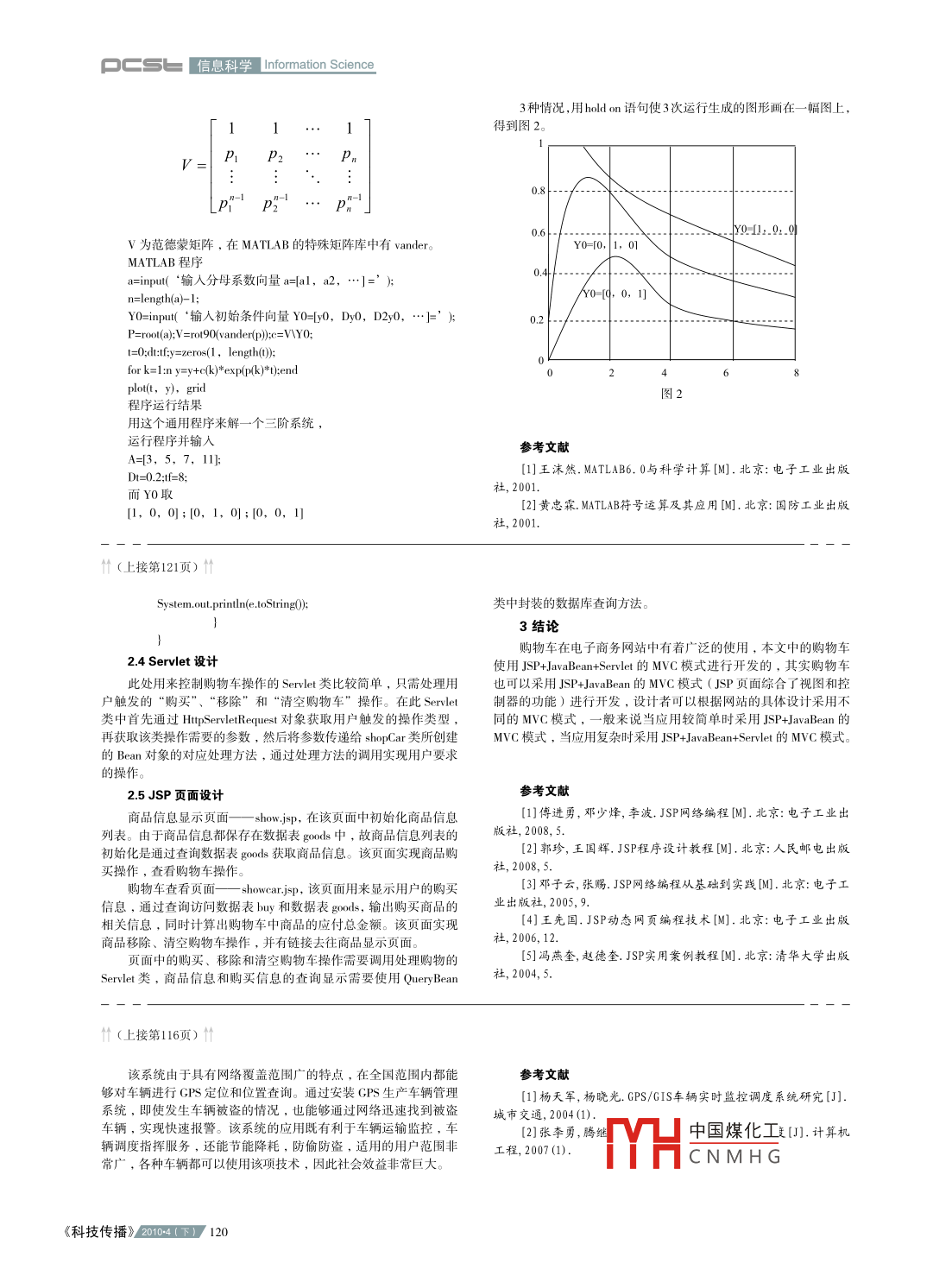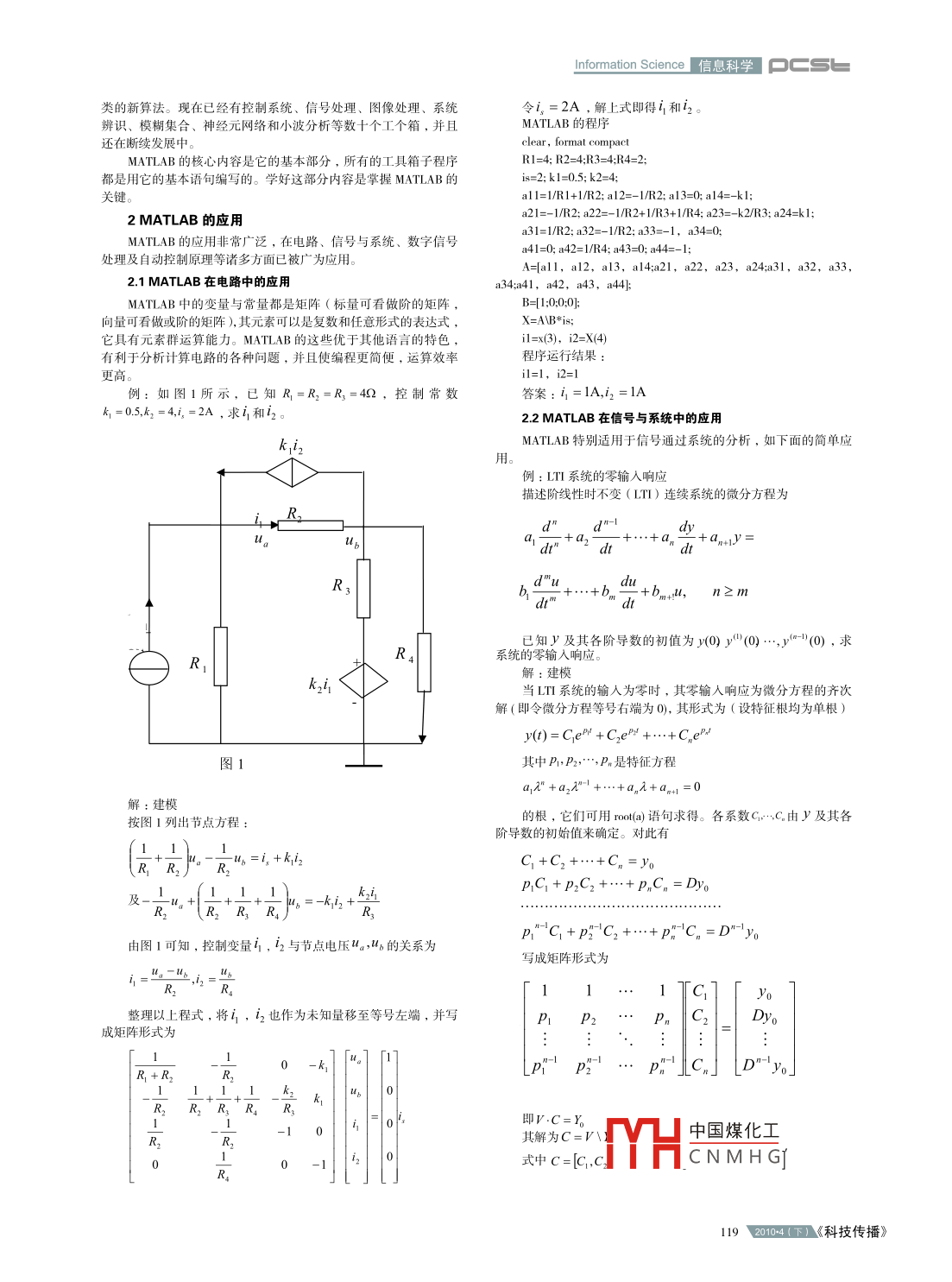 信息科學(xué) nformation ScienceMATLAB的應(yīng)用分析卞春雨哈爾濱師范大學(xué),黑龍江哈爾濱150000摘要 MATLAB Matrix la bora tory,即“矩陣實驗室”)是集數(shù)值計算、符號運(yùn)算及圖形處理等強(qiáng)大功能于一體的科學(xué)計算語言。其編程效率高,擴(kuò)充能力強(qiáng),語勺簡單、易學(xué)易用,是當(dāng)今世界上最優(yōu)秀的數(shù)值計算軟件,也是目前工程界最廣的科學(xué)計算語言。在電路、信號與系統(tǒng)、數(shù)字信號處理及自動控制原理等諸多方面已被廣泛應(yīng)用。本文對 MATLAB的應(yīng)用進(jìn)行了分析關(guān)鍵詞 MATLAB;矩陣;建模中圖分類號TP312文獻(xiàn)標(biāo)識碼A文章編號1674-6708(2010)17-0118-030引言準(zhǔn)的輸入輸出語句,不用“指針”,不需編譯,比其他語言少了很21世紀(jì)將以科學(xué)技術(shù)的高速發(fā)展為特征,中華民族在國際多大家庭的地位將取決于我國的綜合國力,高速度高質(zhì)量地培養(yǎng)12 MATLAB語言的特點千千萬萬的技術(shù)人才,是其中一個十分重要的任務(wù)。要做到這一點2.1起點高就必須努力地吸取世界上一切優(yōu)秀的教育思想、教學(xué)手段,并創(chuàng)造性地應(yīng)用于我們的教學(xué)事業(yè)1)每個變量代表一個矩陣,從 MATLAB名字的來源可知當(dāng)前,計算機(jī)已經(jīng)被成功地應(yīng)用于工程設(shè)計和制造業(yè)中,在它以矩陣運(yùn)算見長,在當(dāng)前的科學(xué)計算中,幾乎無處不用矩陣運(yùn)發(fā)達(dá)國家中其普及率已經(jīng)超過90%,它成倍地提高了勞動生產(chǎn)率這使它的優(yōu)勢得到了充分的體現(xiàn)。在 MATLAB中,每個變量代創(chuàng)造了空前巨大的物質(zhì)文明。它把任何創(chuàng)新思想轉(zhuǎn)化為市場的商表一個矩陣,它可以有個元素品時間縮短了驚人的程度,新產(chǎn)的種類淘汰之快都是20年前無法2)每個元素都看做復(fù)數(shù),這個特點在其他語言中也是不多見想像的。國際互聯(lián)網(wǎng)的廣泛應(yīng)用加快了產(chǎn)業(yè)全球化的進(jìn)程。在這個極具挑戰(zhàn)的時代中,把計算機(jī)充分運(yùn)用到教學(xué)及工程計算過程3)所有運(yùn)算都對矩陣和復(fù)數(shù)有效,包括加、減、乘、除、函中,顯然具有重要的意義數(shù)運(yùn)算等。我們知道,計算尺發(fā)明于1630年,在大學(xué)中計算尺已被使用1.2.2人機(jī)界面適合科技人員了300多年,大約在1970年左右被計算器完全代替?,F(xiàn)在計算器1)語言規(guī)則與筆算式相似。 MATLAB的程序與科技人員的書在大學(xué)里已使用了30年,它被計算機(jī)所代替已是歷史的必然。教寫習(xí)慣相近,因此,易寫易讀,易于在科技人員之間交流學(xué)工具的每一次更新都大大地提高了教育的效率。因此,自覺地2)矩陣行數(shù)列數(shù)無需定義。要輸入一個矩陣,用其他語言時而不是被動地加快計算機(jī)代替計算器的進(jìn)程,將對大學(xué)教學(xué)效率必須先定義矩陣的階數(shù),而 MATLAB則不必有階數(shù)定義語句,輸?shù)奶岣咂鸬街匾淖饔萌藬?shù)據(jù)的行列數(shù)就決定了它的階數(shù)。在我國隨著計算機(jī)價格的不斷下降和國家對教育投入的加大3)鍵入算式立即得結(jié)果,無需編譯。 MATLAB是以解釋方學(xué)校的裝備和學(xué)生個人購買的計算機(jī)也越來越多,因此在幾年之工作的,即它對每條語句解釋后立即執(zhí)行,若有錯誤也立即作出內(nèi),大學(xué)生自由地使用計算機(jī)設(shè)備將能夠?qū)崿F(xiàn)。大學(xué)本科課程中反應(yīng)。便于編程者馬上改正。這些都大大減輕了編程和調(diào)試的工遍使用計算機(jī)的瓶頸將是軟件。即使在目前,擁有計算機(jī)的教作量師和學(xué)生也未必知道如何用計算機(jī)來幫助他們進(jìn)行課程教學(xué),因1.2.3強(qiáng)大而簡易的做圖功能此要從現(xiàn)在起做好準(zhǔn)備。為了把計算機(jī)更好地用于大學(xué)的課程教育和科學(xué)研究,從1)能根據(jù)輸入數(shù)據(jù)自動確定坐標(biāo)繪圖20世紀(jì)80年代開始,出現(xiàn)了多種科學(xué)計算語言,也稱為數(shù)學(xué)軟2)能規(guī)定多種坐標(biāo)系(極坐標(biāo),對數(shù)坐標(biāo)等);件。經(jīng)過10多年的發(fā)展和競爭,已經(jīng)商品化的有 Matlab, Matrix3)能繪制三維人材中的曲線和曲面Maple, Mathmatical, MathCAD等。它們的功能大同小異,又各有千秋4)可設(shè)置不同顏色、線型和視角等就易學(xué)性和普及性而言,首推 MATLAB語言1果數(shù)據(jù)齊全,通常只需要一條命令即可出圖。1 MATLAB語言簡介1.2.4智能化程度高11 MATLAB語言的發(fā)展1)繪圖時自動選擇最佳坐標(biāo)MATLAB是由美國 Mathworks公司于1984年正式推出的,從2)做數(shù)值積分時,自動按精度選擇步長那時到現(xiàn)在已升級到6x版本。隨著版本的升級,內(nèi)容不斷擴(kuò)充,3)自動檢測和顯示程序錯誤的能力強(qiáng),易于調(diào)試功能更加強(qiáng)大。特別是在系統(tǒng)仿真和實時運(yùn)行等方面,有很多新1.2.5功能豐富,可擴(kuò)展性強(qiáng)進(jìn)展,更擴(kuò)大了它的應(yīng)用前景MATLAB軟件包括基本部分和專業(yè)擴(kuò)展兩大部分?;静糠諱ATLAB是一種科學(xué)計算軟件,主要適用于矩陣運(yùn)算及控制包括:矩陣的運(yùn)算和各種變換;代數(shù)和超越方程的求解,數(shù)據(jù)處和信息處理領(lǐng)域的分析設(shè)計,