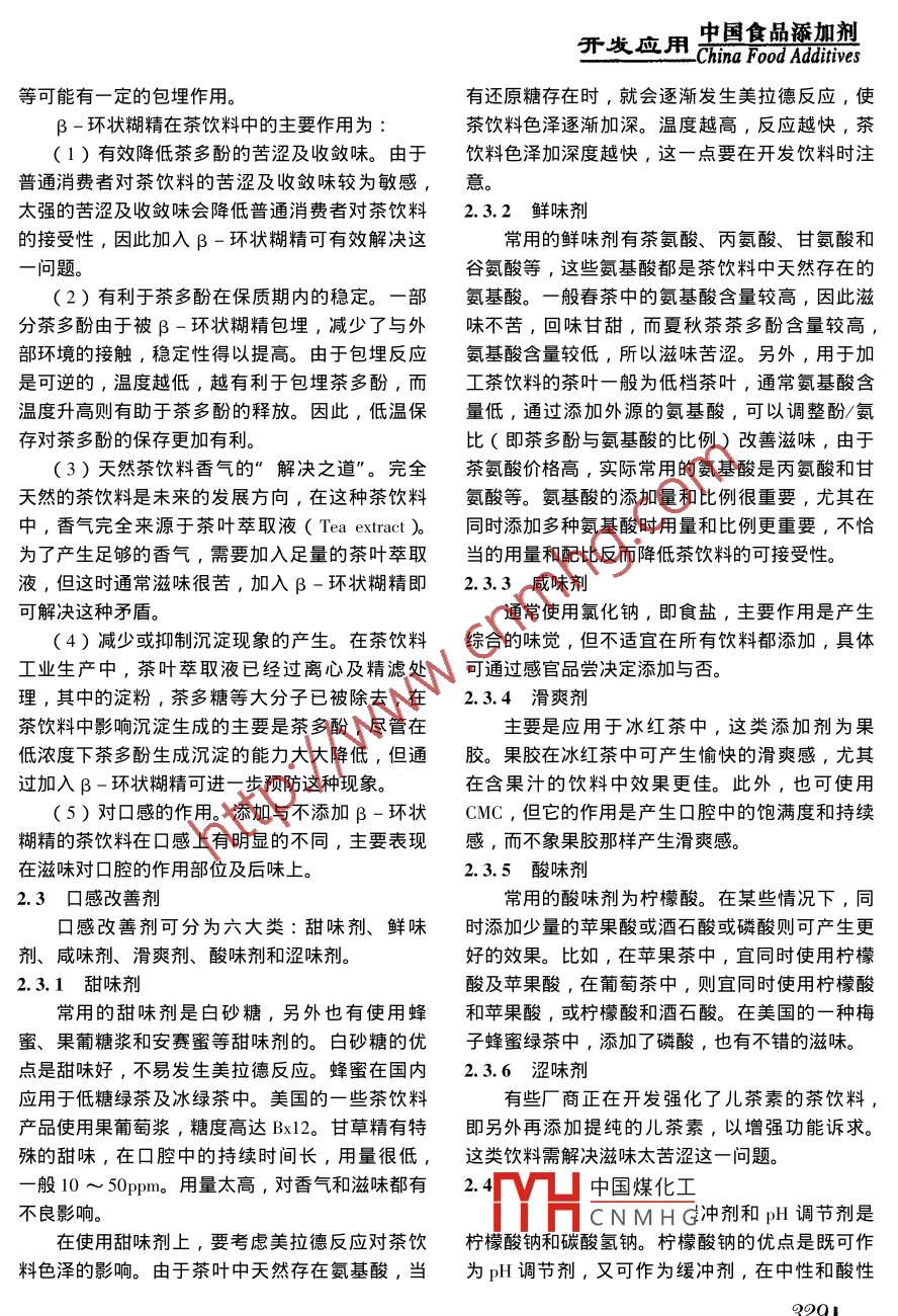 中國食品添加劑開發(fā)應用China Food Additives-茶飲料添加劑的功能和應用梅叢笑(上?;ぱ芯吭?,上海200063 )摘要:介紹了茶飲料中 各種添加劑的功能和應用,以更好地開發(fā)高品質的茶飲料。關鍵詞:茶飲料;添加劑;功能;應用The function and application of tea beverage additivesMEI Cong-xiao( Shanghai Research Instiute of Chemical Industry )Abstract : The function and apication of a variely of food adidives used in tea beverage was itodued deailely 8s0that new tea beverage with premium quality could be developed.Key words : tea beverage ; food aditive ; function ; application他們對改善和提高茶飲料品質具有不同的功能和1前言作用。茶飲料是目前市場上最受歡迎的飲料品種之2.1抗氧化劑一,經過多年的快速發(fā)展,現有品種的市場需求茶飲料中的茶多酚等成分極易氧化而生成其已經基本飽和?,F在市場上的品種主要為冰紅它成分,從而影響了茶飲料的香氣和滋味,因此茶、茉莉花茶、低糖綠茶、烏龍茶(水仙香型)、需加入抗氧化劑以延緩或減少這些成分的氧化。冰綠茶、奶茶等,品種仍然很少, 且市場上賣得在茶飲料中常用的抗氧化劑有抗壞血酸( VC)最好的仍以前四種為主。如果要擴大茶飲料的市抗壞血酸鈉和異抗壞血酸鈉。目前,茶飲料企業(yè)場占有率,除了進-步宣揚茶飲料的健康功能普遍使用的是VC和異抗壞血酸鈉,或二者共同外,開發(fā)新口味的產品也很重要。有些產品的成使用。根據在茶飲料中的使用效果看,異抗壞血功,實際上是先有高品質的產品,然后通過成功酸鈉的抗氧化效果要優(yōu)于VC。在vc的使用上,的營銷推廣來實現的。熟悉和了解茶飲料中各種用量很重要,同時還需要考慮茶飲料在超高溫殺添加劑的功能特性和應用,有利于開發(fā)出高品質菌中的損失,一般用量為0.4~0.6g/L, 用量太的茶飲料新產品。本文將詳細介紹茶飲料中各種低,茶飲料氧化更嚴重。異抗壞血酸鈉的用量一添加劑的功能特性和應用特點,供飲料開發(fā)者參般0.15~0.30g/L。當二者合用時, -般要求合考。用量不得高于0.5g/L。[12]2.2屏 蔽劑2茶飲料添加劑中國煤化工中廣泛使用的滋味屏茶飲料中使用的添加劑可分為抗氧化劑、屏.蔽MHCNMHG葡萄糖分子組成的環(huán)蔽劑、滋味改善劑、色素及護色劑、 乳化劑等,狀結構分子,外部親水性強,內部疏水性強,可有效包埋茶飲料中的茶多酚,對咖啡堿、氨基酸十32分方數據中國食品添加劑開發(fā)應用.China Food Addtives等可能有一定的包埋作用。有還原糖存在時,就會逐漸發(fā)生美拉德反應,佞β -環(huán)狀糊精在茶飲料中的主要作用為:茶飲料色澤逐漸加深。溫度越高,反應越快,茶(1)有效降低茶多酚的苦澀及收斂味。由于飲料色澤加深度越快,這一點要在開發(fā)飲料時注普通消費者對茶飲料的苦澀及收斂味較為敏感,意。太強的苦澀及收斂味會降低普通消費者對茶飲料2.3.2鮮味劑的接受性,因此加入β-環(huán)狀糊精可有效解決這常用的鮮味劑有茶氨酸、丙氨酸、甘氨酸和一問題。谷氨酸等,這些氨基酸都是茶飲料中天然存在的(2)有利于茶多酚在保質期內的穩(wěn)定。一部氨基酸。一 般春茶中的氨基酸含量較高,因此滋分茶多酚由于被β -環(huán)狀糊精包埋,減少了與外味不苦,回味甘甜,而夏秋茶茶多酚含量較高,部環(huán)境的接觸,穩(wěn)定性得以提高。由于包埋反應氨基酸含量較低,所以滋味苦澀。另外,用于加是可逆的,溫度越低,越有利于包埋茶多酚,而工茶飲料的茶葉-般為低檔茶葉,通常氨基酸含溫度升高則有助于茶多酚的釋放。因此,低溫保量低,通過添加外源的氨基酸,可以調整酚/氨存對茶多酚的保存更加有利。比(即茶多酚與氨基酸的比例)改善滋味,由于(3)天然茶飲料香氣的”解決之道”。完全茶氨酸價格高,實際常用的氨基酸是丙氨酸和甘天然的茶飲料是未來的發(fā)展方向,在這種茶飲料氨酸等。氨基酸的添加量和比例很重要, 尤其在中,香氣完全來源于茶葉萃取液( Tea extract )。同時添加多種氨基酸時用量和比例更重要,不恰為了產生足夠的香氣,需要加入足量的茶葉萃取當的用量和配比反而降低茶飲料的可接受性。液,但這時通常滋味很苦,加入β-環(huán)狀糊精即2.3.3咸味劑可解決這種矛盾。通常使用氯化鈉,即食鹽,主要作用是產生( 4)減少或抑制沉淀現象的產生。在茶飲料綜合的味覺,但不適宜在所有飲料都添加,具體工業(yè)生產中,茶葉萃取液已經過離心及精濾處可通過感官品嘗決定添加與否。理,其中的淀粉,茶多糖等大分子已被除去,在2.3.4滑 爽劑茶飲料中影響沉淀生成的主要是茶多酚,盡管在主要是應用于冰紅茶中,這類添加劑為果低濃度下茶多酚生成沉淀的能力大大降低,但通.膠。果膠在冰紅茶中可產生愉快的滑爽感,尤其過加入β -環(huán)狀糊精可進-步預防這種現象。在含果汁的飲料中效果更佳。此外,也可使用(5) 對口感的作用。 添加與不添加β-環(huán)狀CMC,但它的作用是產生口腔中的飽滿度和持續(xù)糊精的茶飲料在口感上有明顯的不同,主要表現感,而不象果膠那樣產生滑爽感。在滋味對口腔的作用部位及后味上。2.3.5酸味劑 .2.3口 感改善劑常用的酸味劑為檸檬酸。在某些情況下,同口感改善劑可分為六大類:甜味劑、鮮味時添加少量的蘋果酸或酒石酸或磷酸則可產生更,劑、咸味劑、滑爽劑、酸味劑和澀味劑。好的效果。比如,在蘋果茶中,宜同時使用檸檬2.3.1甜味劑酸及蘋