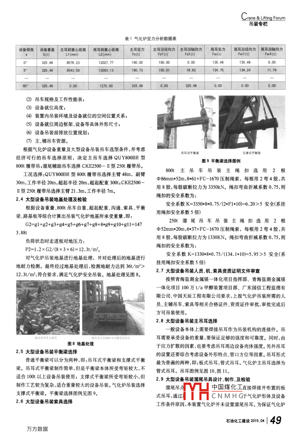 Crane & Liting Forum吊裝專欄大型氣化爐雙機抬吊法吊裝的風險控制劉中培中國化學工程第十一建設有限公司河南開封 475002摘要結合青海鹽湖金屬鎂- -體化項目100萬t/a甲醇裝置-標段氣化爐吊裝,針對本項目氣化爐吊裝所做的各項吊裝風險控制工作,達到氣化爐安全吊裝。其中包括:氣化爐吊裝方案的編制,吊裝方案及吊裝工藝方法的專家論證,氣化爐吊裝地基處理及檢驗,氣化爐吊裝機.索具的選擇,氣化爐吊裝人員.機.索具資質(zhì)審查,氣化爐主、副吊耳的選型及制作等方面論述大型設備吊裝風險控制措施。關鍵詞氣化爐吊裝工藝 拾吊法風險控制中圖分類號TQ082文獻標識碼B文章編號1672- -9323 (2015)04-0047-04隨著我國經(jīng)濟的快速發(fā)展,化工工程建設項目中設備大型吊裝工藝進行吊裝作業(yè)。該抬吊法技術比較成熟,也是最為快捷化發(fā)展趨勢越來越突出;裝置的大型設備工廠化制作和模塊化和技術難度最低的吊裝工藝,同時也是吊裝安全風險較小的方安裝是近幾年設備安裝的主流方向,設備噸位越來越大,吊裝要法之一。求越來越高。立式設備整體吊裝青海鹽湖金屬鎂- -體化項目100 萬t/a甲醇裝置的氣化爐是水煤漿加壓氣化過程的核心設備,具有設備重量大,滑移法抬吊法(322.68t) ,就位高度高(35. 5m) ,就位后高度達到53m,吊裝作業(yè)半徑大等特點,氣化爐吊裝是近幾年化工裝置整體吊裝設備的最為典型的代表之一。 與此同時,設備吊裝的風險相當大。為了解決氣化爐整體順利吊裝,我們針對吊裝的安全性,做了吊裝風險評估,并采取了相關的吊裝安全技術措施。1氣化爐吊裝工藝概述圖1常用立式大型設備吊裝方法匯總整體大型立式設備- -次吊裝方法多種多樣,按照吊裝機具的不同可以分為“吊車法".“門式起重機法”、“桅桿法”;按照吊2大型設備吊裝風險控制措施裝原理可以分為“抬吊法" .“滑移法”、“扳轉(zhuǎn)法"。以上每種吊裝2.1大型設備吊裝方案專家論證方法因吊點的設置,吊裝機具配置、繩索布置形式等因素又分為青海鹽湖金屬鎂- -體化項目 100萬 t/a甲醇裝置- -標段工若干類型。隨著我國大型吊裝機具的現(xiàn)代化和大型化,同時對設程,三臺大型設備氣化爐吊裝,是本項目重中之重。為了保障設備的吊裝安全要求越來越高,扳轉(zhuǎn)法等傳統(tǒng)方法逐漸被淘汰。結備吊裝安全,明確吊裝任務,控制吊裝風險,確保吊裝過程順利合近幾年來行業(yè)內(nèi)的典型吊裝案例,目前經(jīng)常使用的吊裝方法進行,實現(xiàn)安全吊裝,我項目部針對大型設備吊裝方案進行科如圖1所示。學、合理、可行性專家組論證會.專家組針對大型設備吊裝方案由于氣化爐就位在氣化框架35. 5m的基礎上,考慮到吊裝進行科學、合理中國煤化工方案內(nèi)的不足之處,場地的局限性和安裝工期要求等因素,決定采取雙吊車抬吊的及吊裝過程中YHCN M H G注意的相關細節(jié)。經(jīng)過大型設備吊裝方案的專家論證,使氣化爐大型設備吊裝方石油化工建設215.04 | 47.ne & Lifting Forum吊裝專欄板式吊耳模型圖管式吊耳模型圖圖10吊耳模型圖溜尾法蘭托架吊具外硬田富尾法蘭托架吊具成功安全投入使用圖12溜尾法蘭吊具此溜尾法蘭托架吊具,在所有受力點焊接完畢后做無損檢測,經(jīng)過無損檢測合格,并成功安全投入使用。溜尾法蘭吊具圖見圖12。3小結氣化爐管式吊耳設置圖氣化妒管式吊耳整體國青海鹽湖金屬鎂- -體化項目100萬t/a甲醇裝置氣化爐的圖11吊耳圖例成功吊裝,已經(jīng)成為大型設備吊裝- -項經(jīng)典實例,其中,大型設吊裝溜尾系統(tǒng)的安全、穩(wěn)定,我們特設計-套溜尾法蘭托架吊索備吊裝風險控制措施的應用是氣化爐吊裝的成功所在。我們對具機構。對氣化爐吊裝所采取的措施進行了一-歸納、總結,以期對今后該溜尾機構由吊耳耳板部分.箱體部分.底部法蘭托架(凸大型設備吊裝具有指導性的作用。臺部分) .支撐兩翼部分.螺栓連接部分構成。底板法蘭托架和螺參考文獻栓部分將承擔的設備重量通過箱體部分傳遞給與箱體焊接- -體1《大型設備吊裝工程施工工藝標準) SH/T3515- -2003的吊耳板上,而箱體將各個部件組合成-一個穩(wěn)定的整體。支撐兩2化工設備吊耳及工程技術要求)HG/T21574- 2008翼部分作為極端情況下(此情況- -般不會發(fā)生) ,某些部件受損3重型設備吊裝手冊)樊兆馥 著冶金工藝出版社(收稿日期:2014-10-15)失效的備用受力機構。(上接35頁)定合格率分別為98.21%, 10%,焊接RT拍片和管道系統(tǒng)試壓討[J].石油化工建設,2011,5:25- -28./氣密一次合格率分別為97. 89%,98%,分部工程和單位工程驗2代濤安.質(zhì)量管理策劃的精細化[].施工企業(yè)管理,2013,5:44- 46.收合格率均為100%,工程質(zhì)量始終處于受控狀態(tài),實現(xiàn)了工程3王建庭,吳楠.《設備工程監(jiān)理規(guī)范)(GB/T26429- 2010)與 《質(zhì)量管理質(zhì)量控制目標,裝置開車- -次 成功并順利投產(chǎn)。體系要求)(GB/T1900 - 20080相關內(nèi)容的對比分析[I].設備監(jiān)理,2012,4:10-14.1丁靜.天津石化100萬t/a乙烯煉化一體化項目質(zhì)量管理的實踐與探(收稿日期:2014- 07-11)中國煤化工MHCNMHG50 |石油化工建設2015.0