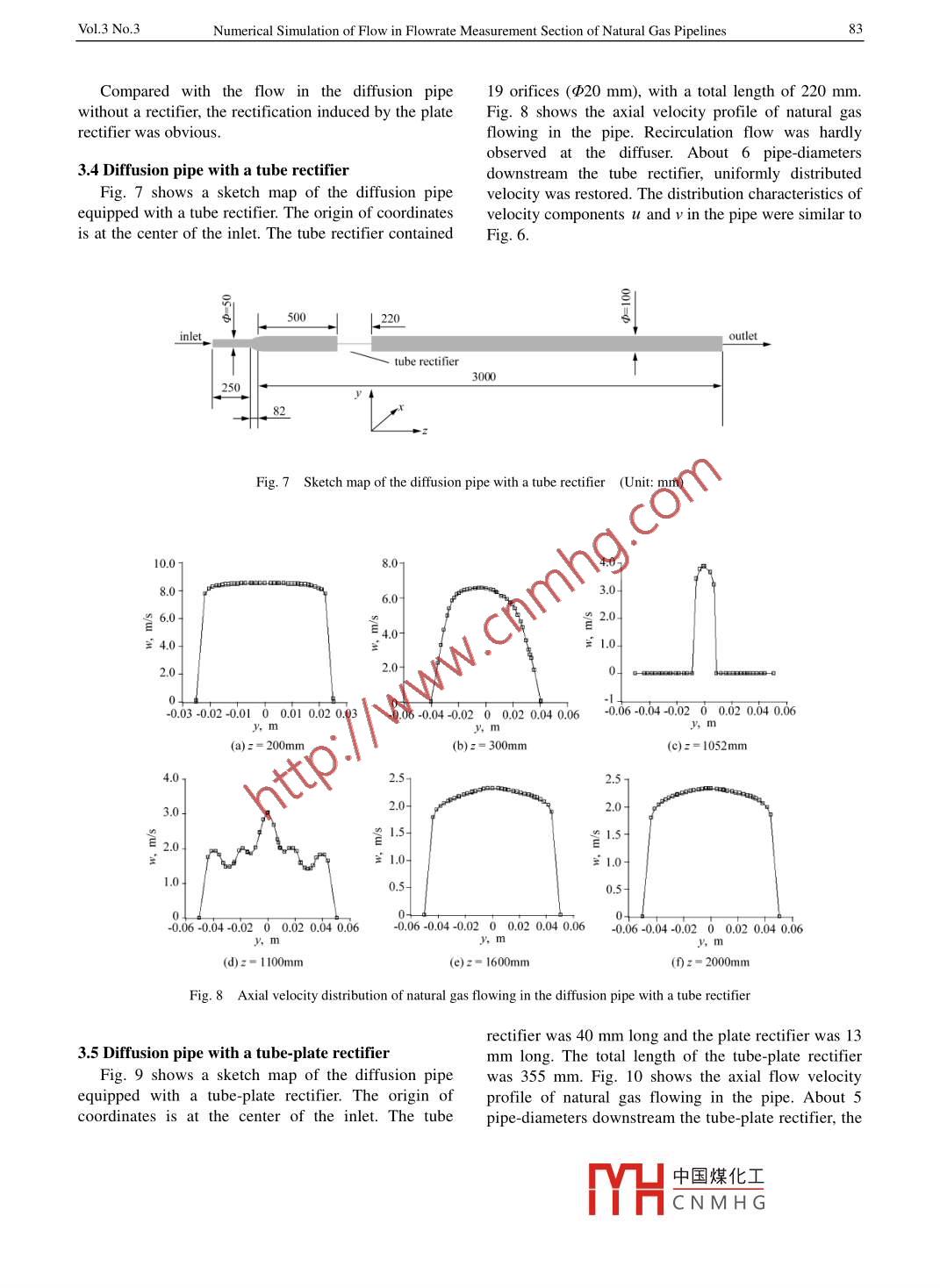 2006Petroleum ScienceVol 3 No. 3Numerical Simulation of flow in Flowrate measurement Section ofNatural Gas PipelinesLi zhenlin and zhang yongxueaculty of mechanical and Electronic Engineering, China University of Petroleum, Beijing 102249, China)Abstract: The orifice-plate flowmeter and ultrasonic flowmeter are used widely for natural gas flowrate measurement,and the measurement accuracy is affected greatly by flow state. Numerical simulation was used to study the flow ofnatural gas in the diffusion pipe, and the length of the irregular flow induced by the diffuser or rectifier was computedSimulation results indicated that the flow in the diffusion pipe was three-dimensional turbulent flow and the steady stateflow was restored at 17 pipe-diameters downstream of the diffuser. The rectifiers equipped in the diffusion pipe showedgood rectification effect. notwithstanding the induced irregular flow, Downstream the rectifier. the flow becamesymmetrical and uniform in a shorter length than the case without a rectifier. For the diffusion pipe equipped with platerectifier, tube rectifier and tube -plate rectifier, the lengths at which uniformly distributed flow was restored were 12, 6and 5 pipe-diameters downstream the rectifier respectively. On the basis of simulation results, the minimum installationlength for flowmeters equipped in the diffusion pipe was determined. This provides a new method for improving naturalgas measurement accuracyKey words: Natural gas measurement, computational fluid dynamics(CFD), rectifier, numerical simulation, diffusionkinematic viscosity was 1.603x10 m/s. The acoustic1 Introductionvelocity in natural gas was 450 m/s. Because theIt is important to measure the flowrate of natural gascorresponding Mach number was much smaller than 0.3,during its production, transportation, and consumptithe flow in the diffusion pipe was assumed to be steadyAccurate and reliable measurement of natural gasand incompressible. Since the measurement accuracyrectly influences the economic benefit of both was the main purpose of the study, the flow in thesuppliers and consumers. Many experiments on natural diffusion pipe could be simplified as steadygas measurement have been performed based on variousflowmeters in recent years. The experimental resultsThe governing equations for steady incompressibleshow that the measurement accuracy of flowmeters is turbulent flow can be written in a unified form, i.e. theaffected by many factors. However, the state of flow in standard k-g turbulent modelthe pipeline, which is caused by the baffle, has greatera(ou)ainfluence than other factors. Except for the volumetricSflowmeter, the flowrate displayed by almost all otherflowmeters is usually calculated with empirical where o is the universal variable; u, is the velocityequations or mathematical models, which are builtcomponent, I is the generalized diffusion coefficientbased on the ideal flow. The measurement accuracy ofWhen o is 1,(u, v, w), k and E, Eq (1)becomesflowmeters is determined mainly on the agreementthe continuity equation, three momentum componentbetween the real flow and the ideal model. In this paper, equations, turbulent kinetic energy equation andthe flow in the measurement section of a diffusion pipe turbulent dissipation rate equation respectivelwith various rectifiers was analyzed with computationalIn this study, CFD Software FLUENT was used tofluid dynamics(CFD)solvegoverning equations. To improve the2. Mathematical modelcomputation stability and precision, the convectionterms of momentum equations were discretized byThe ambient temperature was 22C, and the pressure using the QUICK scheme (Leonard, 1979), and theand average flow velocity of natural gas at the inletconvection terms of k and e equations werethe diffusion pipe0.8 MPa and 8 m/s respectively. discretized by using the second-order upwind schemeThe density of natural gas was 0.68 kg/m, and the The convergence criteria were that the maximum中國(guó)煤化工CNMHGPetroleum Science2006relative errors of the continuity equation u, u, w. k determining the irregular flow region in the diffusionand e equations were less than 10pipe with various rectifiers is a key procedure forThe boundary conditions and governing equations numerical simulationtogether formed an integrated mathematical model foFor several classical baffles. their standardthe above-mentioned. Uniform velocity profile was installation lengths are determined by experiment andassumed at the inlet for simulation. The second experience. For example, for a novel orifice-plateboundary conditions were applied to the outlet velocity. flowmeter, its standard installation length of a confluentThe non-slip boundary conditions were introduced at pipe is 145 pipe-diameters of the straight pipe. Limitedhe turbulent kinetic energy per unit local space is likely to preclude installing the flowmetermass, k and turbulent kinetic energy dissipation rate this far away from the rectifier. Analyzing the flow inper unit mass, e at the inlet boundary were given the pipe with CFD would contribute to determining adirectly by the velocity profile On the solid boundary, shorter installation length and improve the measurementk and e were determined by the standard wall accuracy of flowmeterfunction( Chieng and Launder, 1980). Other boundaryconditions were Neumann boundary conditions3.1 Computational gridFig. 1 shows a sketch map of the diffusion pipe3. Numerical resultsequipped with a plate rectifier. The origin of coordinatesIn order to measure the flowrate accurately in theis at the center of the inlet. Thirty-five orifices, with adiffusion pipe with various rectifiers, the flowmeter diameter of 12 mm, are distributed symmetrically in themust be located at a specific length downstream of the plate rectitier. Computational grids were generated byrectifier, to avoid the irregular flow region where theusing algebralidcross-sections of the diffusion pipe, as shown in Fig. 2plate rectifier3000