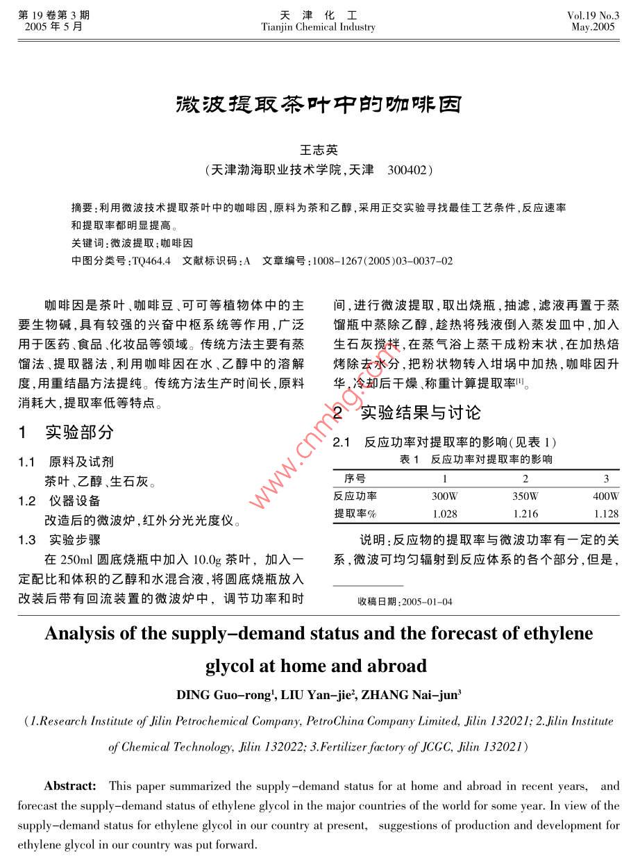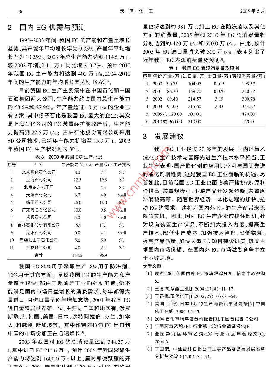 第19卷第3期天津化工Vol 19 No. 32005年5月Tianjin Chemical IndustryMav.2005國內(nèi)外乙二醇的供需分桁與預(yù)測丁國榮1,劉艷杰2,張乃君(1.中國石油吉林石化公司研究院,吉林132021;2.吉林化工學(xué)院,吉林132022;3.吉化股份公司化肥廠,吉林132021)摘要:綜述了近年來國內(nèi)外乙二醇供需狀況,并對今后幾年我國和世界主要國家對乙二醇的需求進行了預(yù)測。針對目前我國EG的供需狀況,提出了我國EG的生產(chǎn)和發(fā)展建議。關(guān)鍵詞:乙二醇;供需:預(yù)測中圖分類號:TQ223.162文獻標(biāo)識碼:C文章編號:1008-1267(2005)03-035-03乙二醇(EG)又稱甘醇、乙撐二醇,工業(yè)上一般2003年世界EG消費量達到14070萬t。從消費結(jié)通過液相環(huán)氧乙烷(EO)水合制得,是一種重要的有構(gòu)上看,EG主要用于生產(chǎn)聚酯和防凍液。2003年機化工原料,最大用途是生產(chǎn)聚酯纖維,其次是防EG總消費量的83.2%用于生產(chǎn)聚酯、114%用于生凍劑,還有一些用作溶劑。產(chǎn)防凍液、5.5%用于其它用途。其中亞洲、北美和西1世界EG的供需與預(yù)測歐地區(qū)的消費量約占世界總消費的60.1%、21.7%和10.9%。預(yù)計2007年世界總EG消費量將達到隨著世界尤其是東亞和中國聚酯生產(chǎn)的快速17830萬t。表2列出2003年世界各地EG消費結(jié)發(fā)展,極大地拉動了世界EG行業(yè)的發(fā)展。特別是中構(gòu)及2007年消費增長預(yù)測國內(nèi)地聚酯的大幅擴充,帶動EG需求的大幅增加表22003年世界各地EG消費結(jié)構(gòu)及預(yù)測萬t/a據(jù)統(tǒng)計,世界EG生產(chǎn)能力已由1992年的8792萬消費領(lǐng)域北美西歐中東日本亞洲地區(qū)其它地區(qū)總計t/a增長到2002年的1645萬t/a,10年增加近780聚酯191.l118.825.742.0581.54401003.1萬t/a。從世界EG生產(chǎn)能力的地區(qū)分布來看,生產(chǎn)防凍劑809288546416.318.8156.5能力主要集中在亞洲、北美和中東地區(qū),2003年分其它32423.25.713.01869.5102,4別占世界總生產(chǎn)能力的33.26%、31.07%和1791%。總計3044170.836.8614616.47231262.1預(yù)測2007年年均441918.91.2487.2世界EG主要消費集中在亞洲、北美和西歐地區(qū),分消費增長率(%)別占世界總消費量的60.1%、21.7%和10.9%。表1列出了近年世界各地區(qū)EG供需狀況及預(yù)測。亞洲是世界EG主要的凈進口地區(qū),2003年進表1近年世界各地區(qū)EG供需狀況及預(yù)測萬a口量達5276萬1,出日1519萬t,凈進囗約376萬由100x年2002年2003年2007年t。中東和北美是世界最大的兩大出囗地區(qū),主要用力需求能力需求能力需求能力需求于供應(yīng)亞洲地區(qū)。科威特生產(chǎn)的40萬t的EG全部亞洲485672265371801.2509484.0754.01081.0用于出口,沙特出口的比例占952%,而加拿大的出中東2942383298.439628504646290800口比例也占826%。預(yù)計今后5年,中東及亞洲是北美563.0275.1553.02853513.1301.55280331.0EG發(fā)展迅速的兩個地區(qū),生產(chǎn)能力年均增長率分南美41.327941.327.541.328741.0380別達到146%和57%。預(yù)計2008年,中東地區(qū)的歐洲215.0184.0217.0190.8221.0201.5228.0253.0總計15991124791377813444156981422.12180017830EG生產(chǎn)能力將超過北美地區(qū),成為世界第二大生1995~2001年世界EG消費年均增長率為6%,產(chǎn)基地,但其產(chǎn)品仍主要用于出口,國內(nèi)消費增長速度較慢。其中1998年消費增長率高達12%,2001年降至最天津化工2005年5月2國內(nèi)EG供需與預(yù)測量也將達到約381萬t,加上EG在防凍液以及其他1995~2003年間,我國EG的產(chǎn)能和產(chǎn)量呈增長方面的消費量,2005年和2010年EG總消費量將分別達到約420萬ta和570.0萬t/a。由此,預(yù)計趨勢,其產(chǎn)能年平均增長率為935%,產(chǎn)量年平均增2005年EG進口量將突破300萬Ua。表4列出了長率為10.25%。2003年總生產(chǎn)能力達到1145萬t近年我國EG表觀消費量及預(yù)測較2002年增加4.1萬t,同比增長3.7%。預(yù)計2010表4我國EG表觀消費量及預(yù)測年我國EG生產(chǎn)能力將達到400萬ta,2004~2010序號年份產(chǎn)量/萬t進口量/萬t出口量/萬t表觀消費量/萬t年間的生產(chǎn)能力的年均增長率達到19.6%1200090.75104.970.015195.57目前我國EG生產(chǎn)主要集中在中國石化和中國2200186.70159.700.020石油集團兩大公司,生產(chǎn)能力約占國內(nèi)總生產(chǎn)能力3200289214.57的68.6%和279%。年產(chǎn)量超過10萬t/a的企業(yè)已4200395.00215602.33344.27有3家,其中揚子石化是我國EG最大的企業(yè);其次5200512003000420.00是上海石化公司的EG裝置經(jīng)擴能改造后,生產(chǎn)能62010約360.00210.00570.0力提高到22.5萬U/a;吉林石化股份有限公司采用SD公司技術(shù),已將年產(chǎn)能力擴增至159萬t0203發(fā)展建議年我國EG生產(chǎn)狀況見表367我國EG工業(yè)經(jīng)過20多年的發(fā)展,國內(nèi)環(huán)氧乙表32003年我國EG生產(chǎn)狀況烷/EG生產(chǎn)技術(shù)與國際先進生產(chǎn)技術(shù)水平相當(dāng),工序號「名生產(chǎn)能力/萬1a1產(chǎn)量/萬1生產(chǎn)技術(shù)業(yè)生產(chǎn)表明國產(chǎn)催化劑的應(yīng)用比率可與國際先進1北京燕化石化公司7.7的催化劑相媲美,這是我國EG工業(yè)面臨的機遇。盡上海石化公司22.519.3管如此,目前我國FG工業(yè)也面臨著嚴(yán)峻挑戰(zhàn):原料北京東方化工廠天津石化公司價格高、裝置規(guī)模小、下游產(chǎn)品開發(fā)起步晚、裝置原揚子石化公司260料消耗高等。隨著世界經(jīng)濟一體化進程的加快,拉6廣東茂名石化公司Shell動EG的需